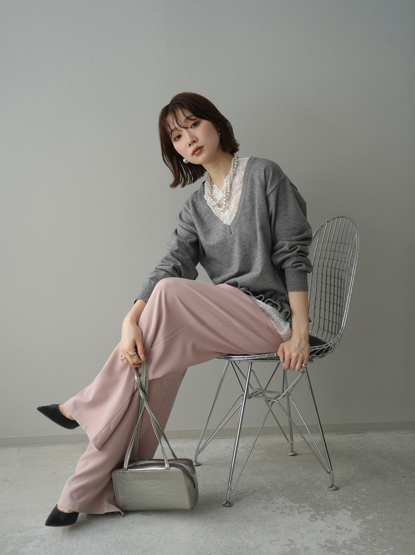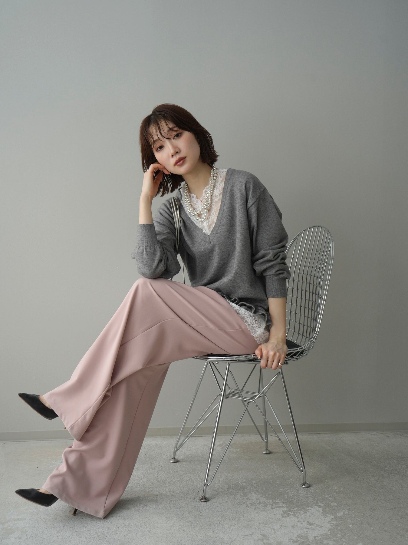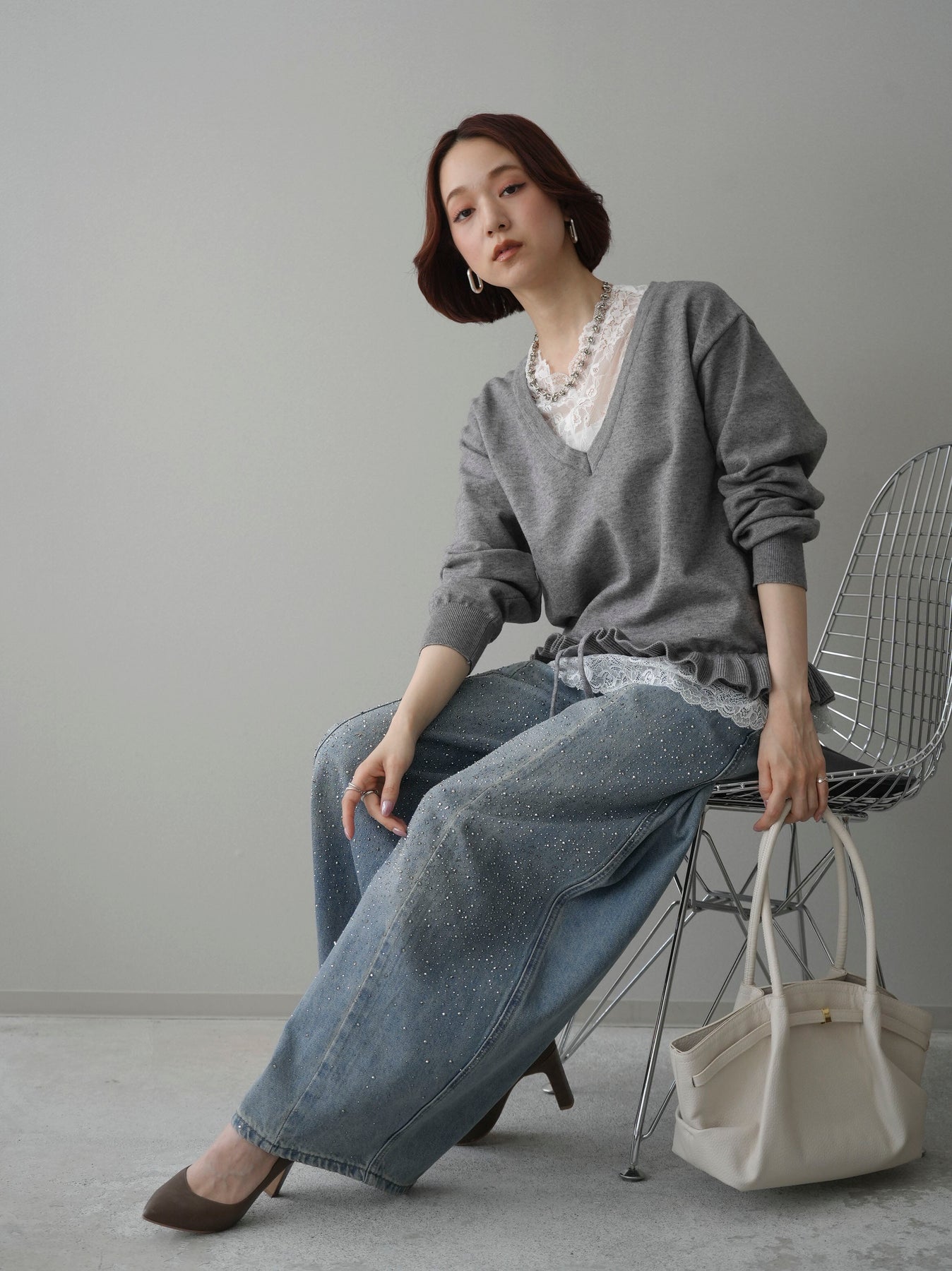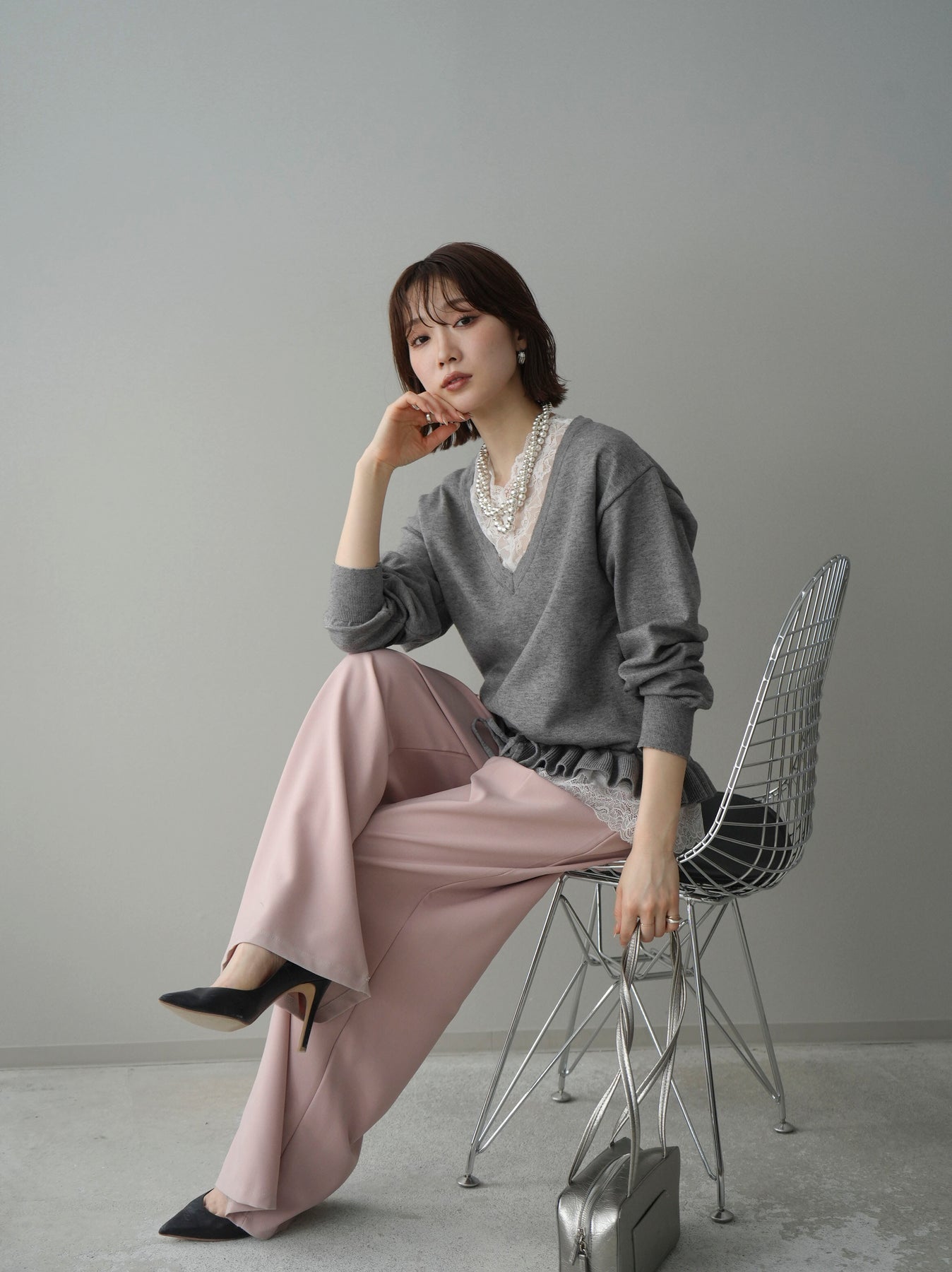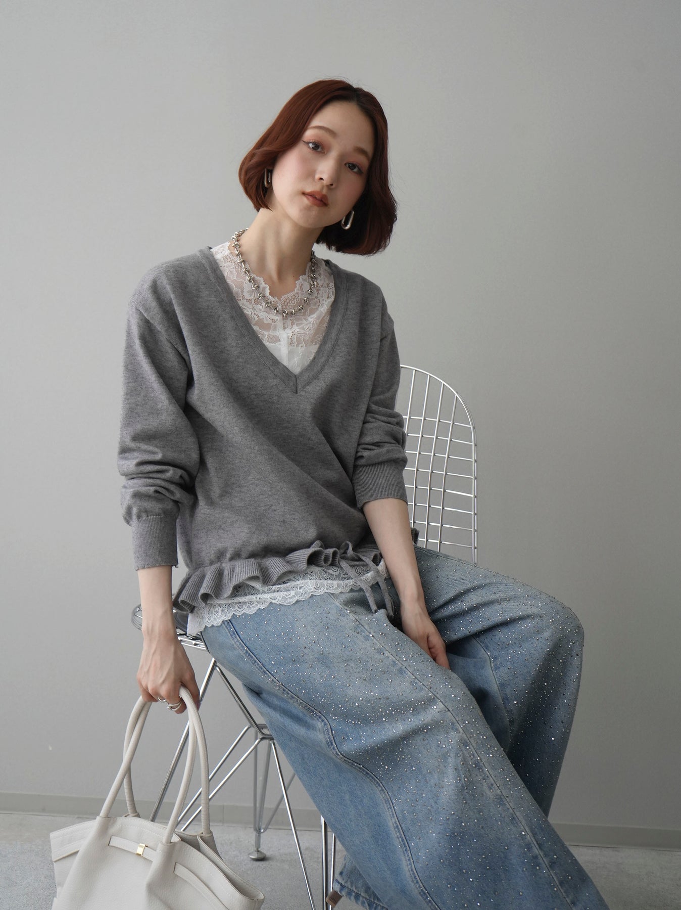 繊細なレースインナーとニットをレイヤードした、女性らしさが引き立つアンサンブル。深めのVネックから覗くレースが顔まわりを華やかに演出し、裾からさりげなく見えるレースデザインがスタイリングに奥行きをプラスします。ニットは程よくゆとりのあるシルエットで抜け感があり、単品使いでも着回しやすい一着。デニムでカジュアルに、スラックスやスカートで上品にと幅広いコーディネートが楽しめます。