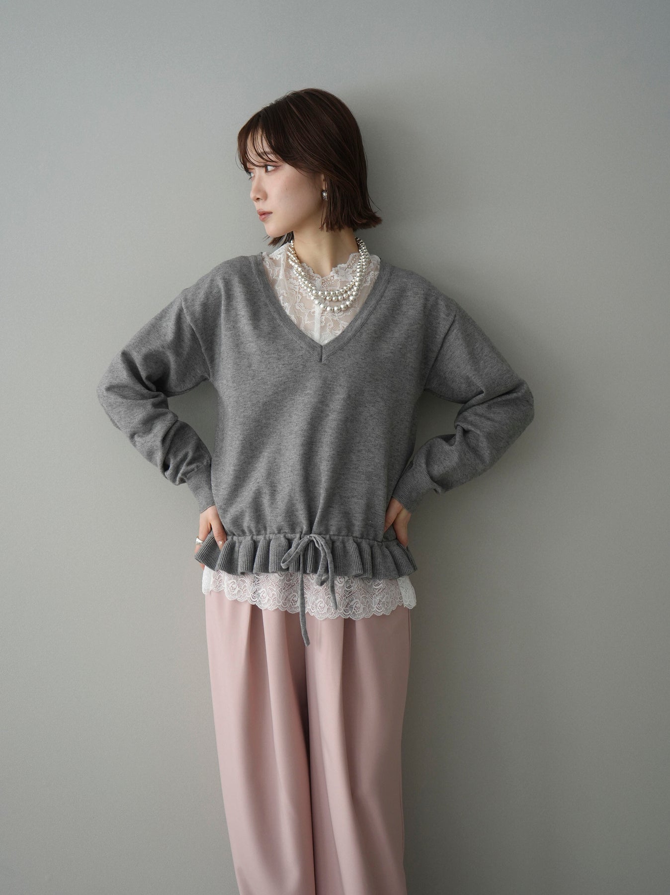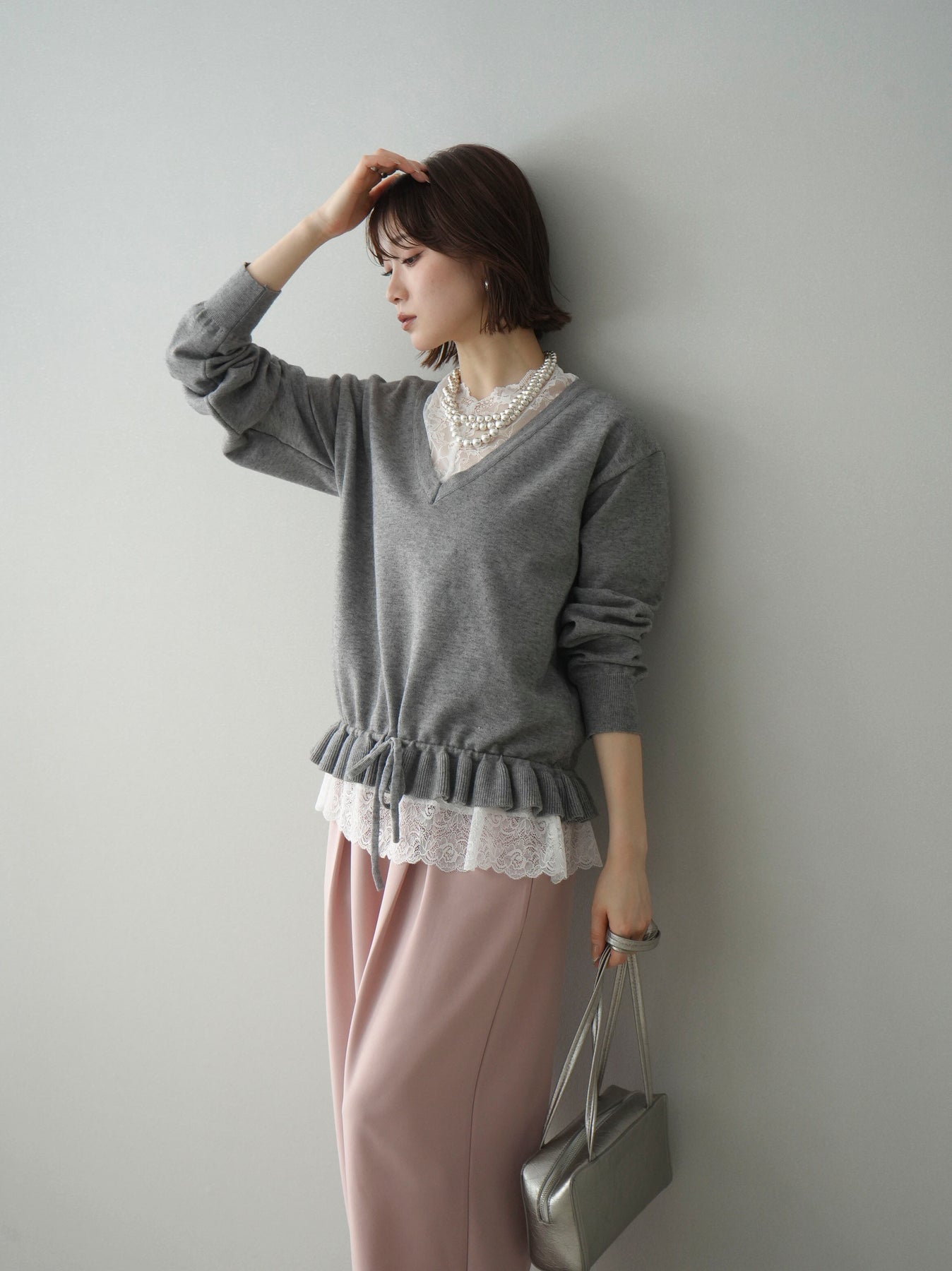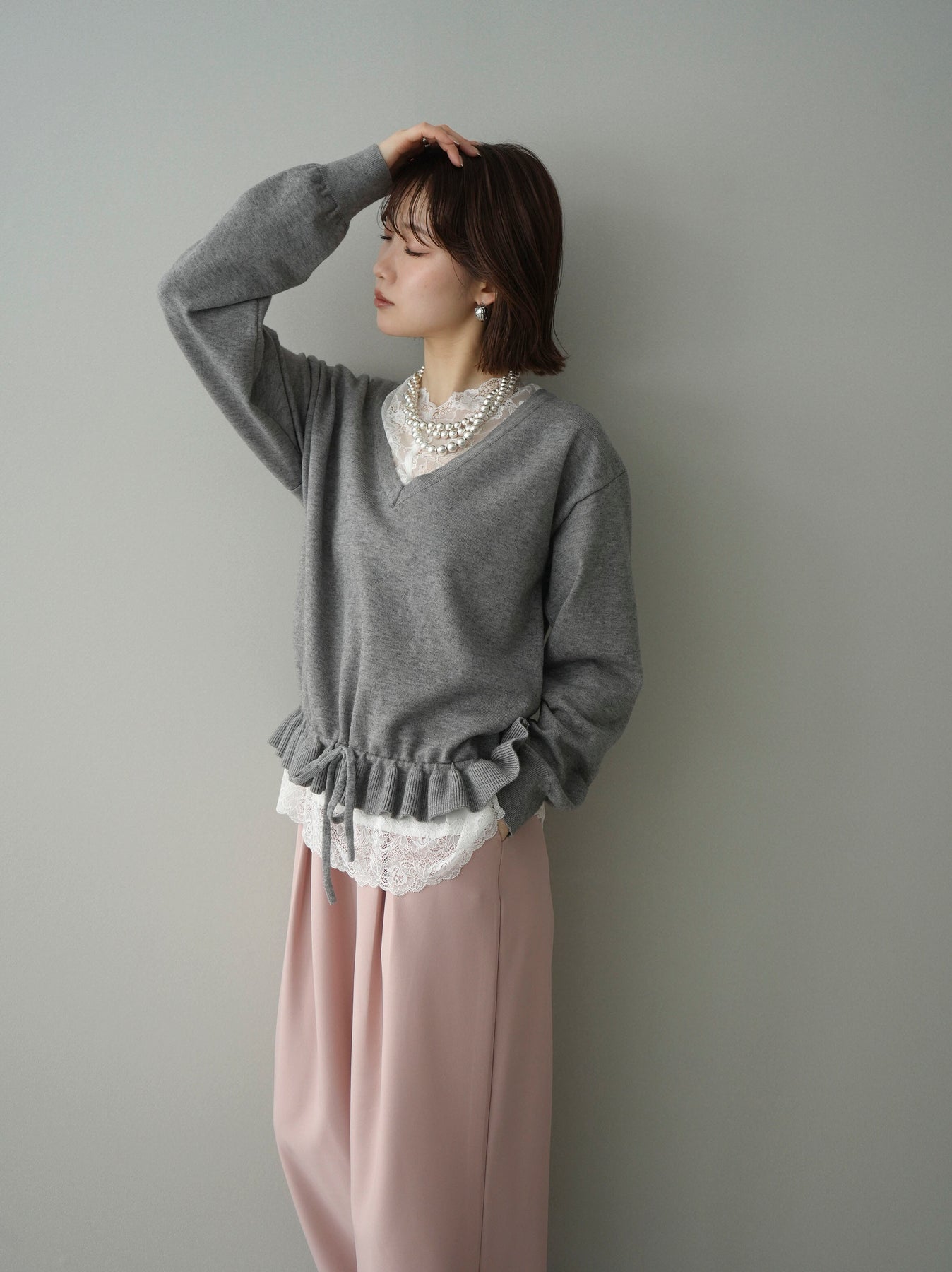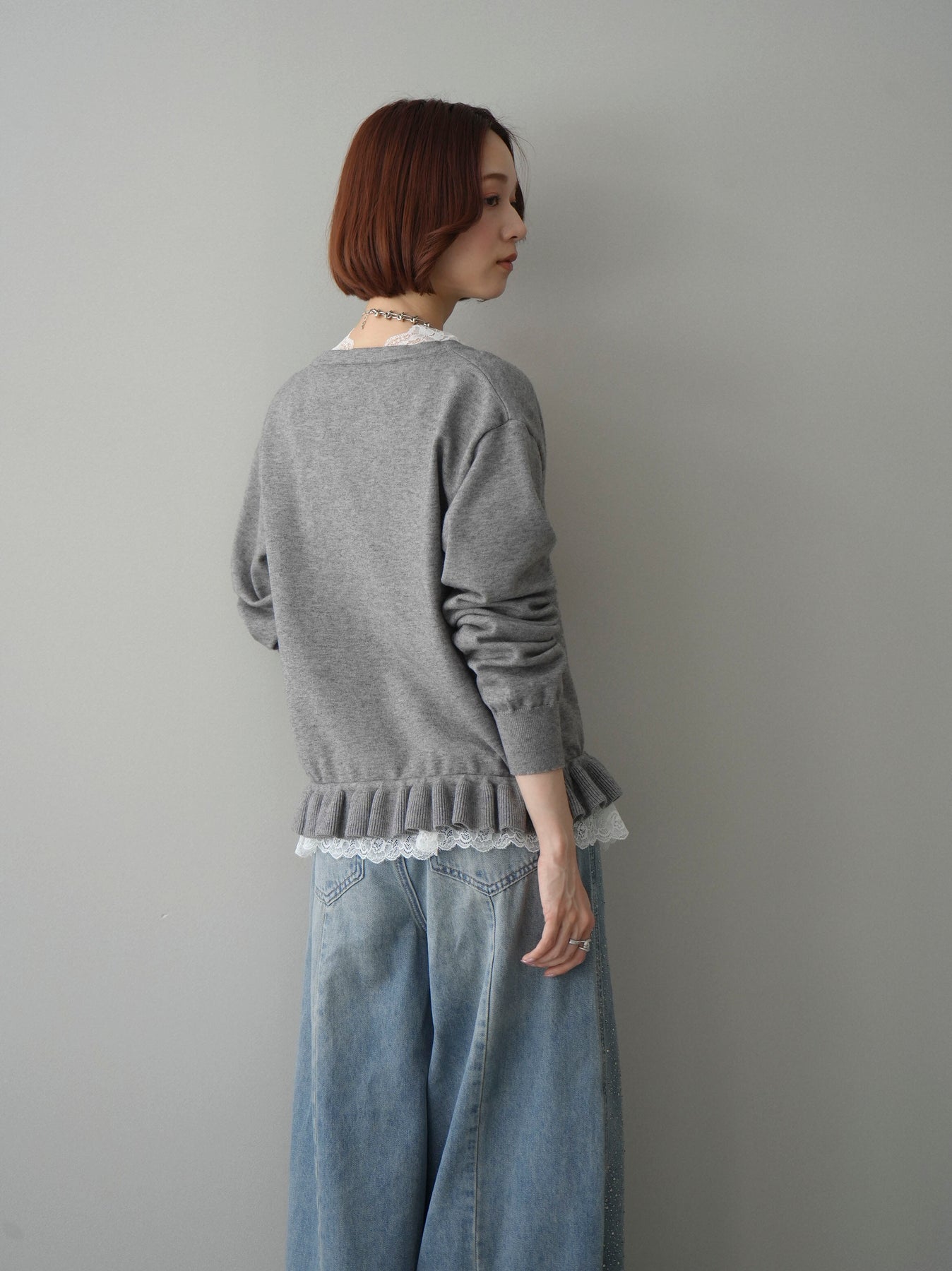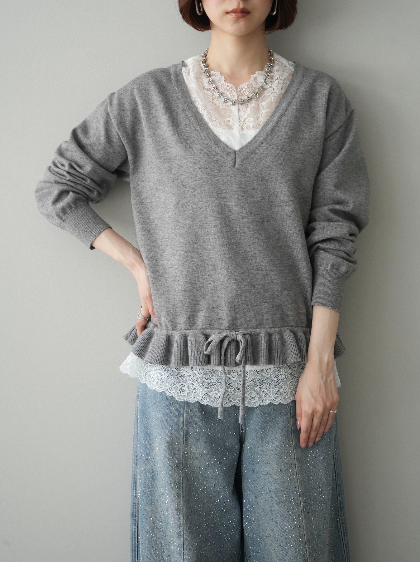 [予約]レーストップ&フリルニットアンサンブル/gray