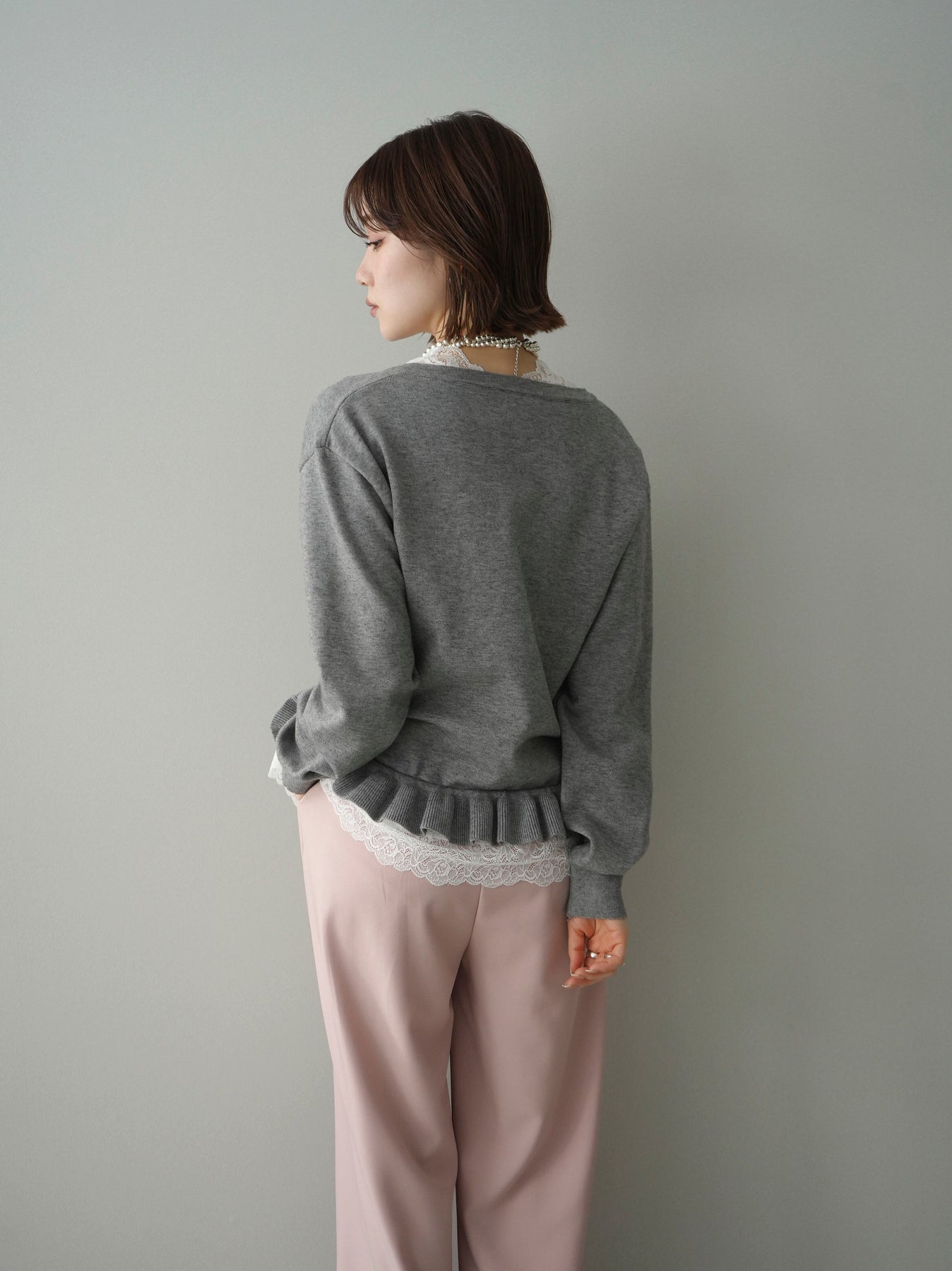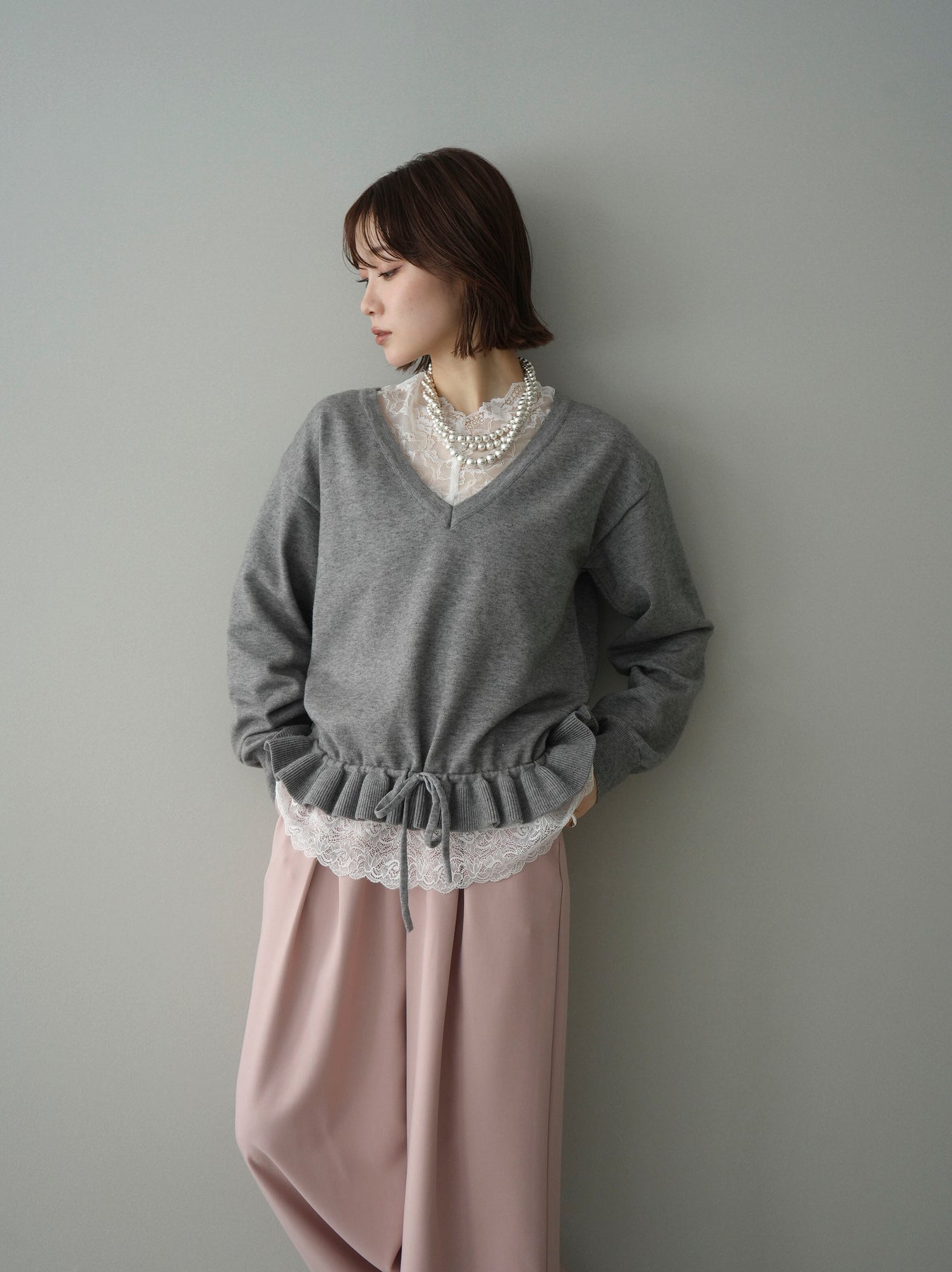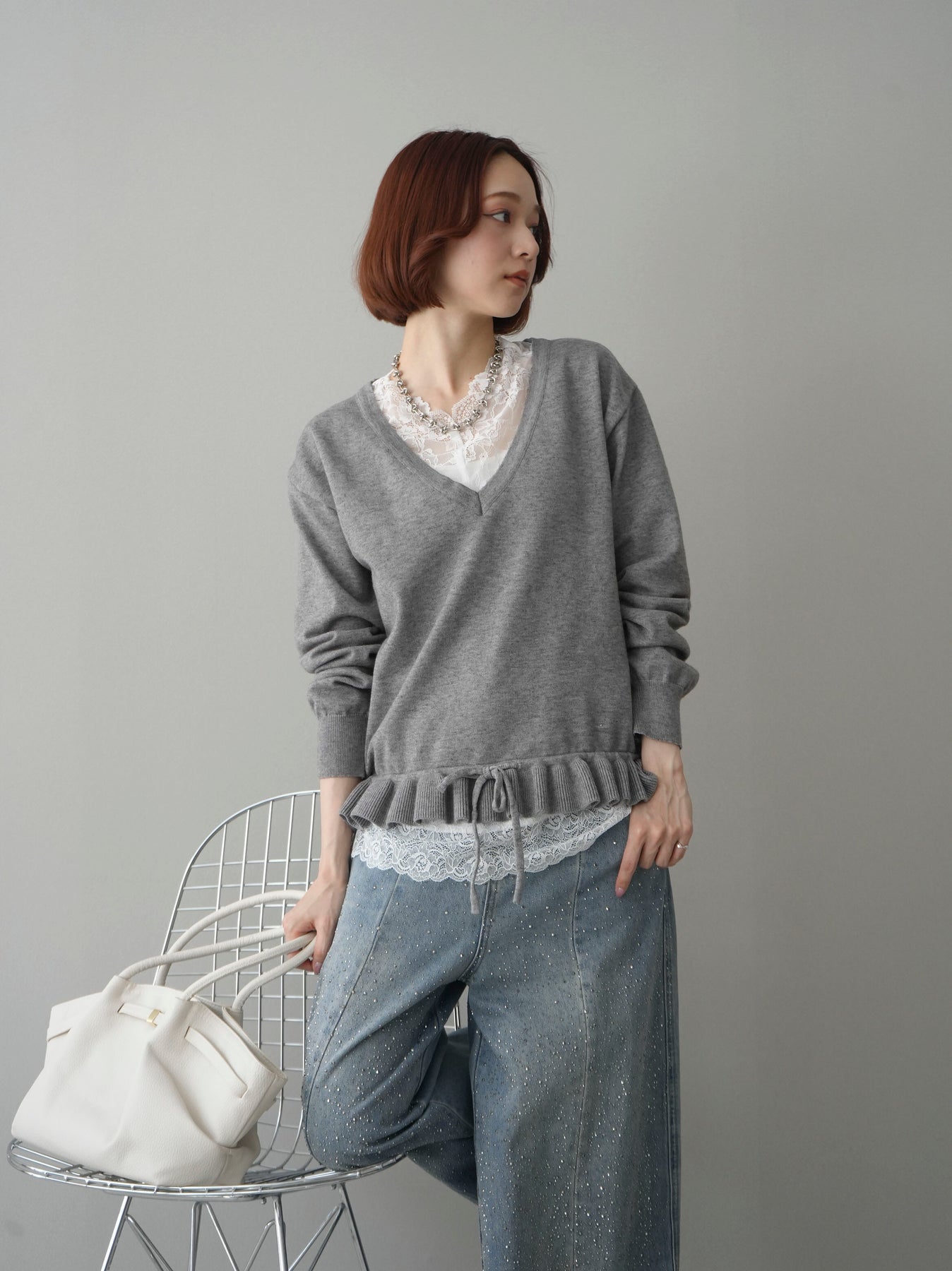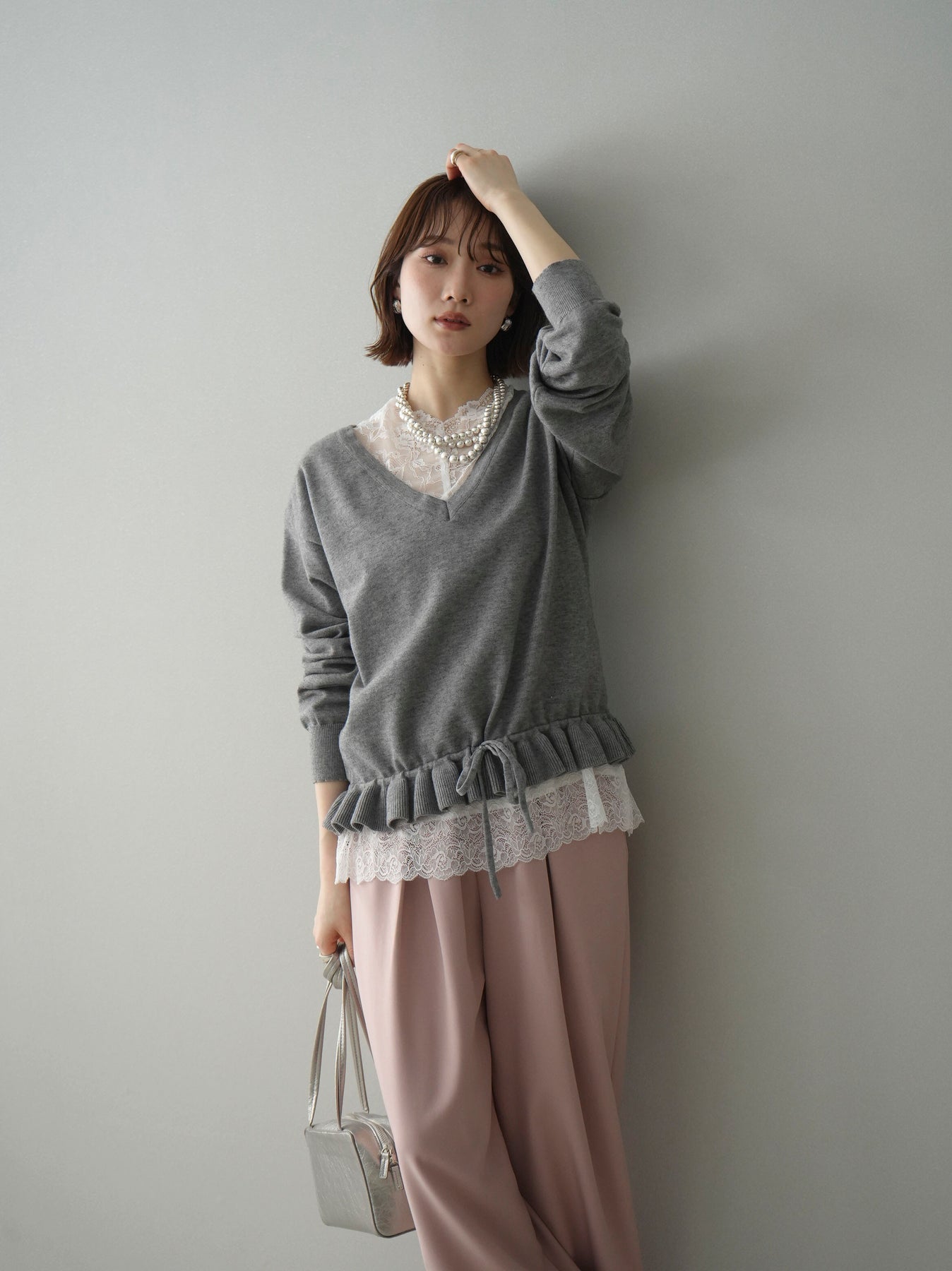 [予約]レーストップ&フリルニットアンサンブル/gray