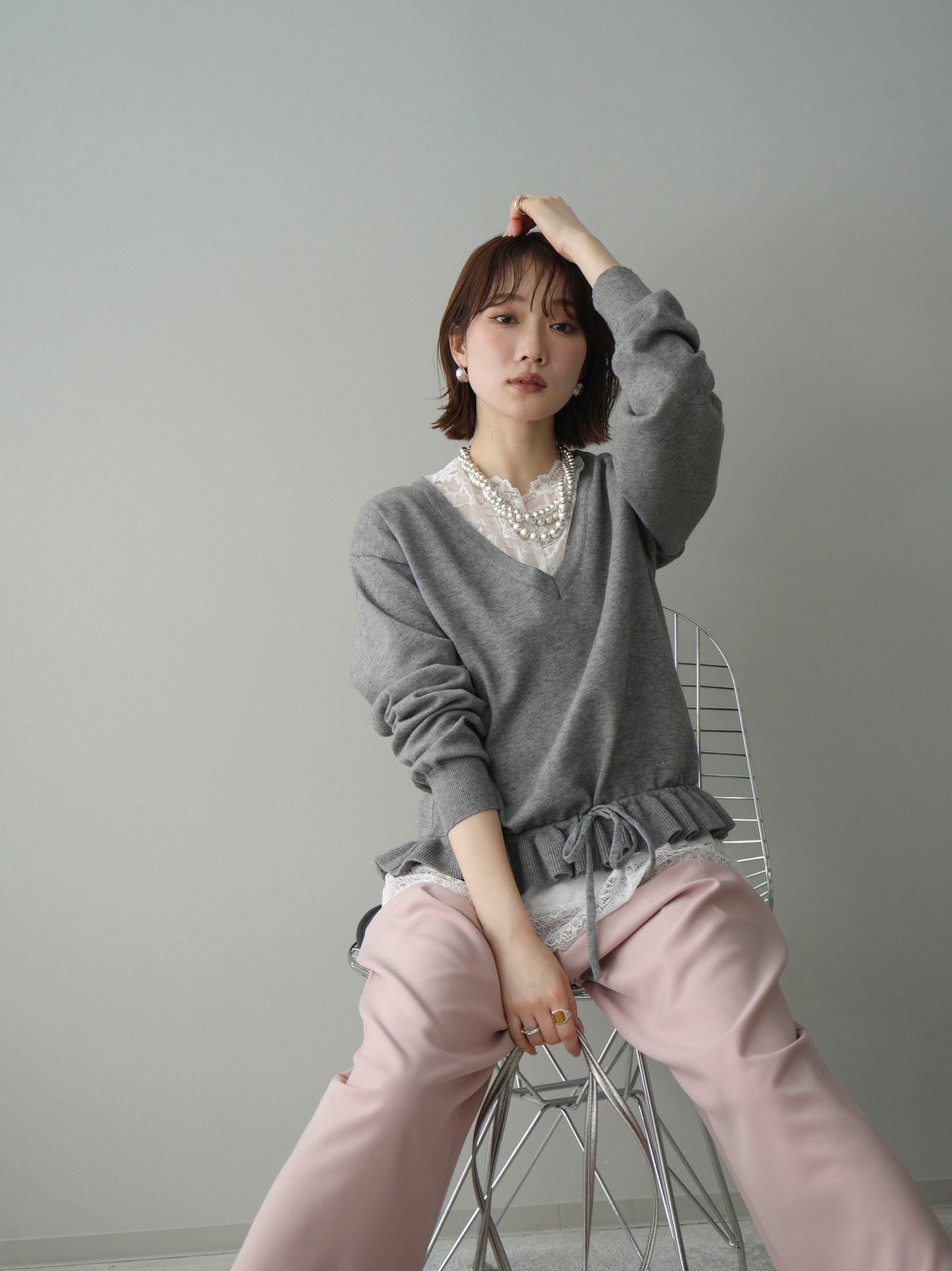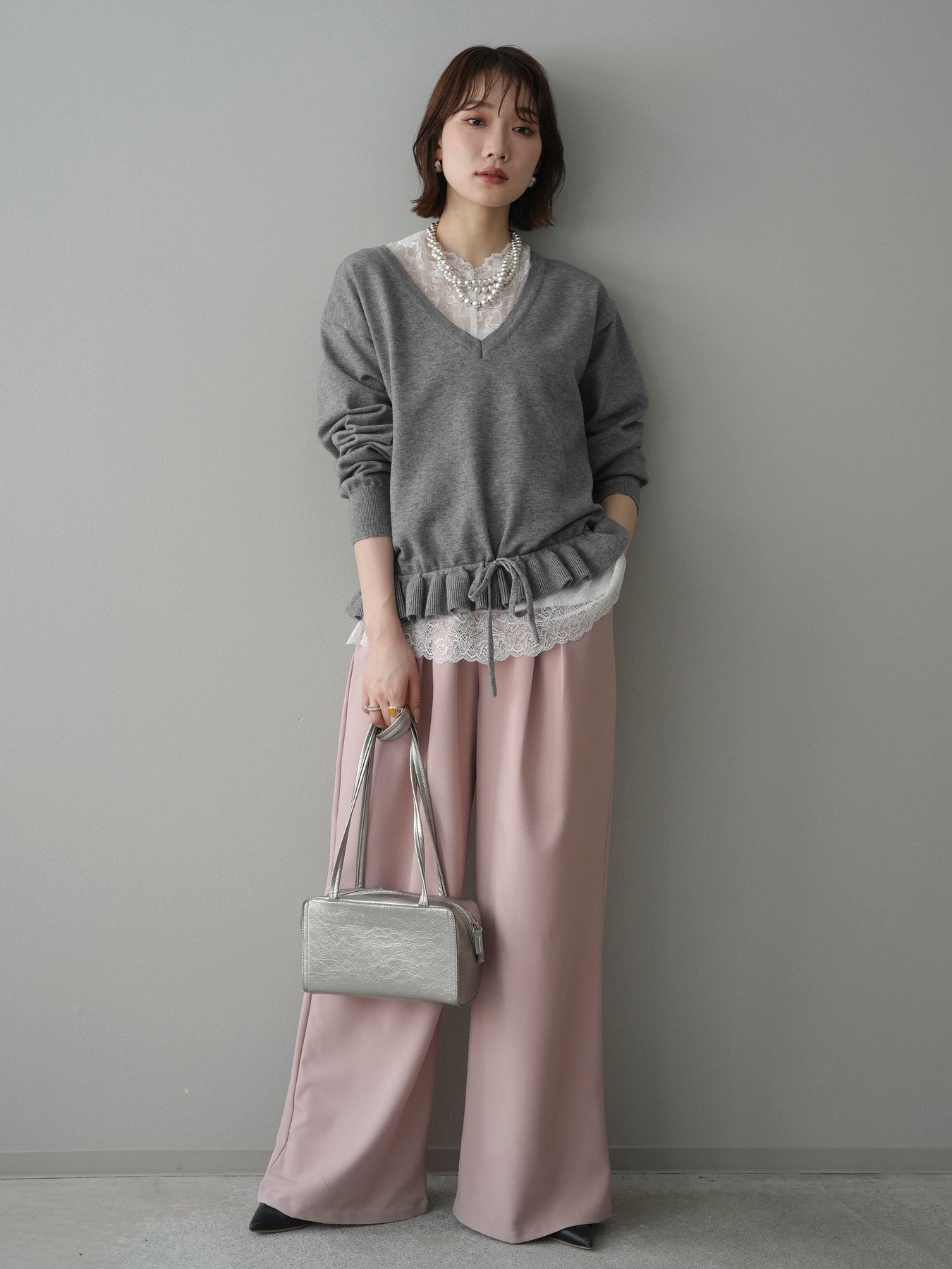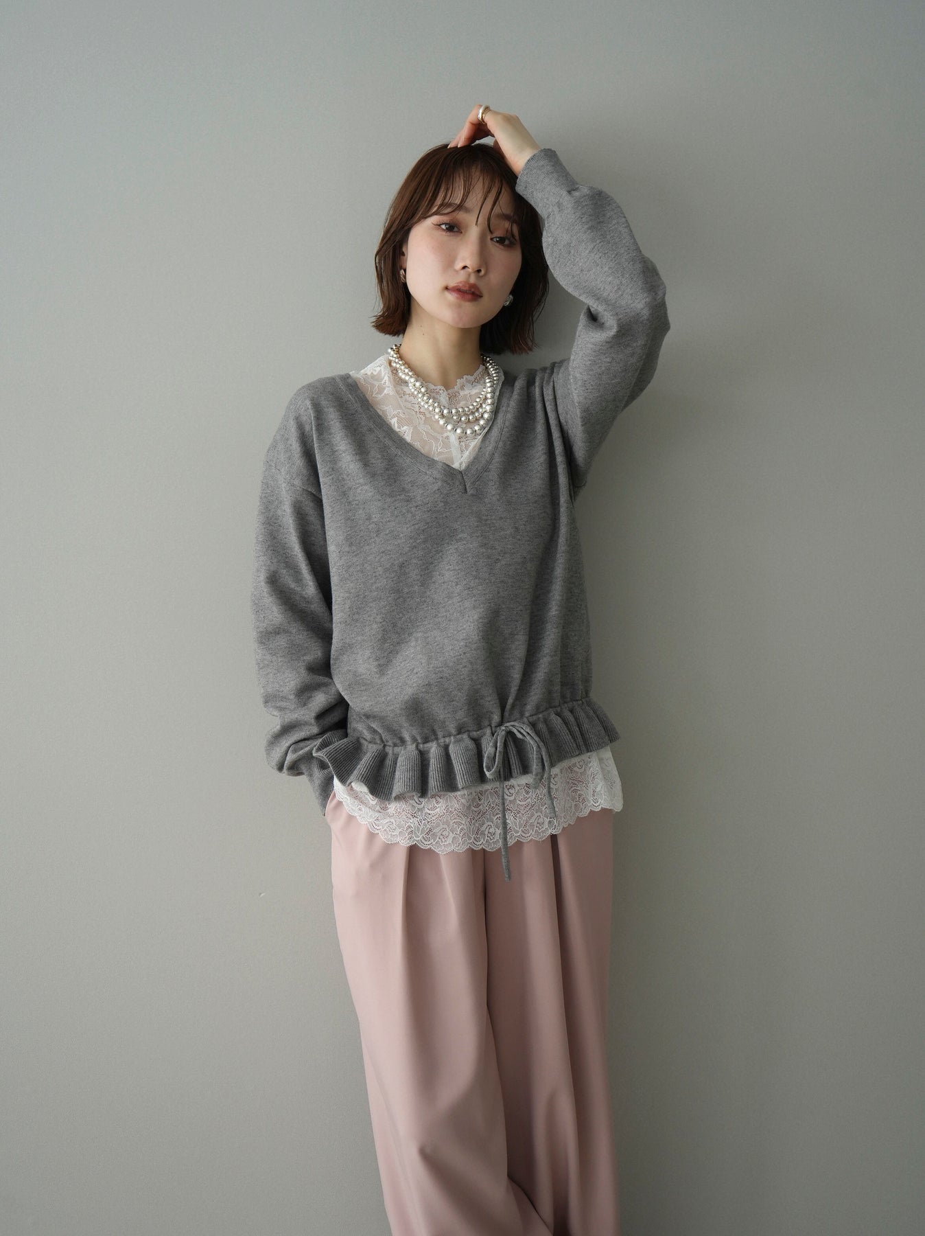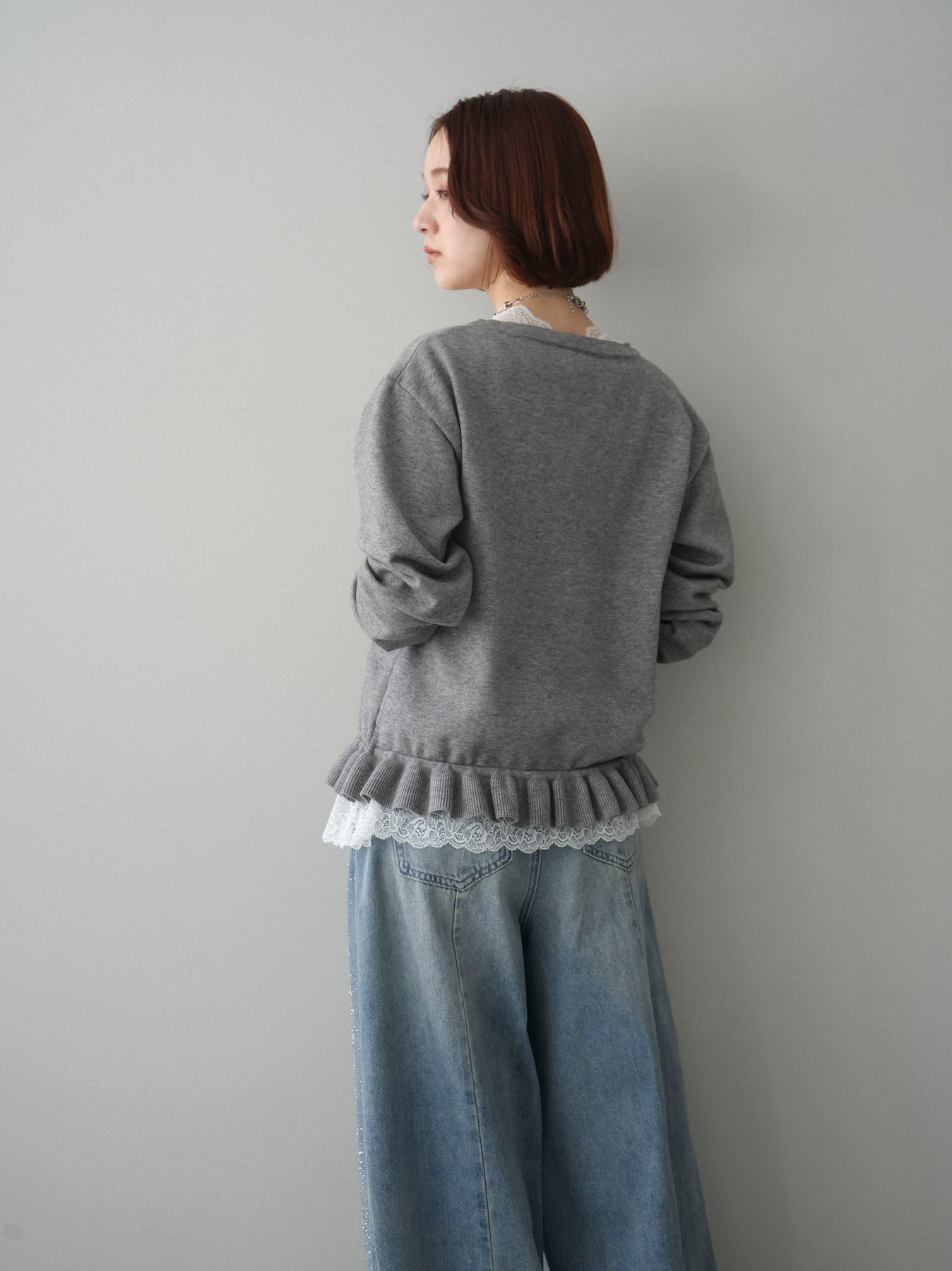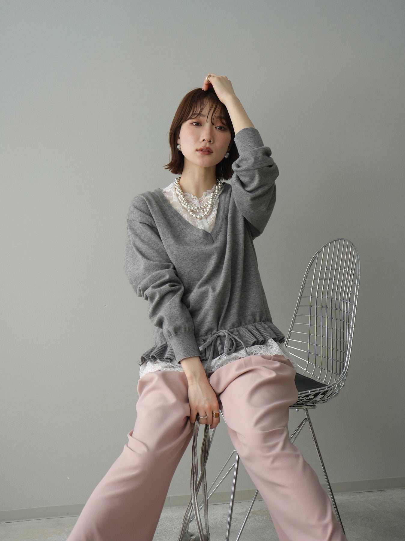 [予約]レーストップ&フリルニットアンサンブル/gray