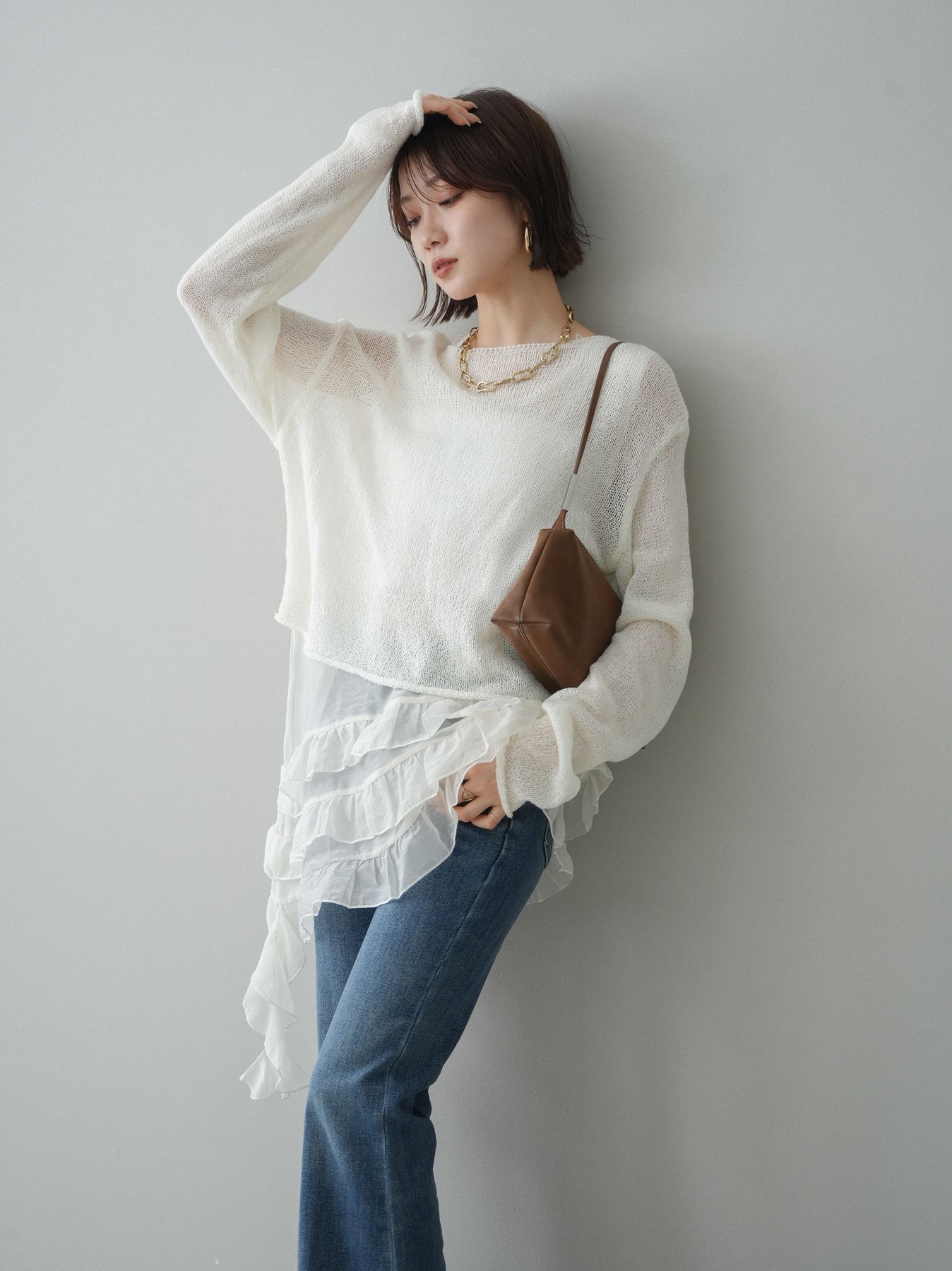 軽やかな透け感が魅力のニットと、ラッフルデザインのオーガンジータンクトップを組み合わせたアンサンブル。ざっくりとした編み地のニットからふんわりと覗くフリルが、コーディネートに立体感と華やかさをプラスします。程よくゆとりのあるシルエットで抜け感がありながらも、重ねることで自然とバランスの取れたスタイルに。動くたびに揺れるオーガンジーのラッフルが女性らしさを引き立て、シンプルなボトムスと合わせるだけで存在感のある着こなしが完成します。それぞれ単品でも使えるため、お手持ちのアイテムとのレイヤードも楽しめる、着回し力の高いセットアイテムです。 ※ボトムス、キャミソール(インナー)以外の商品は一律でインナーは付属していません。