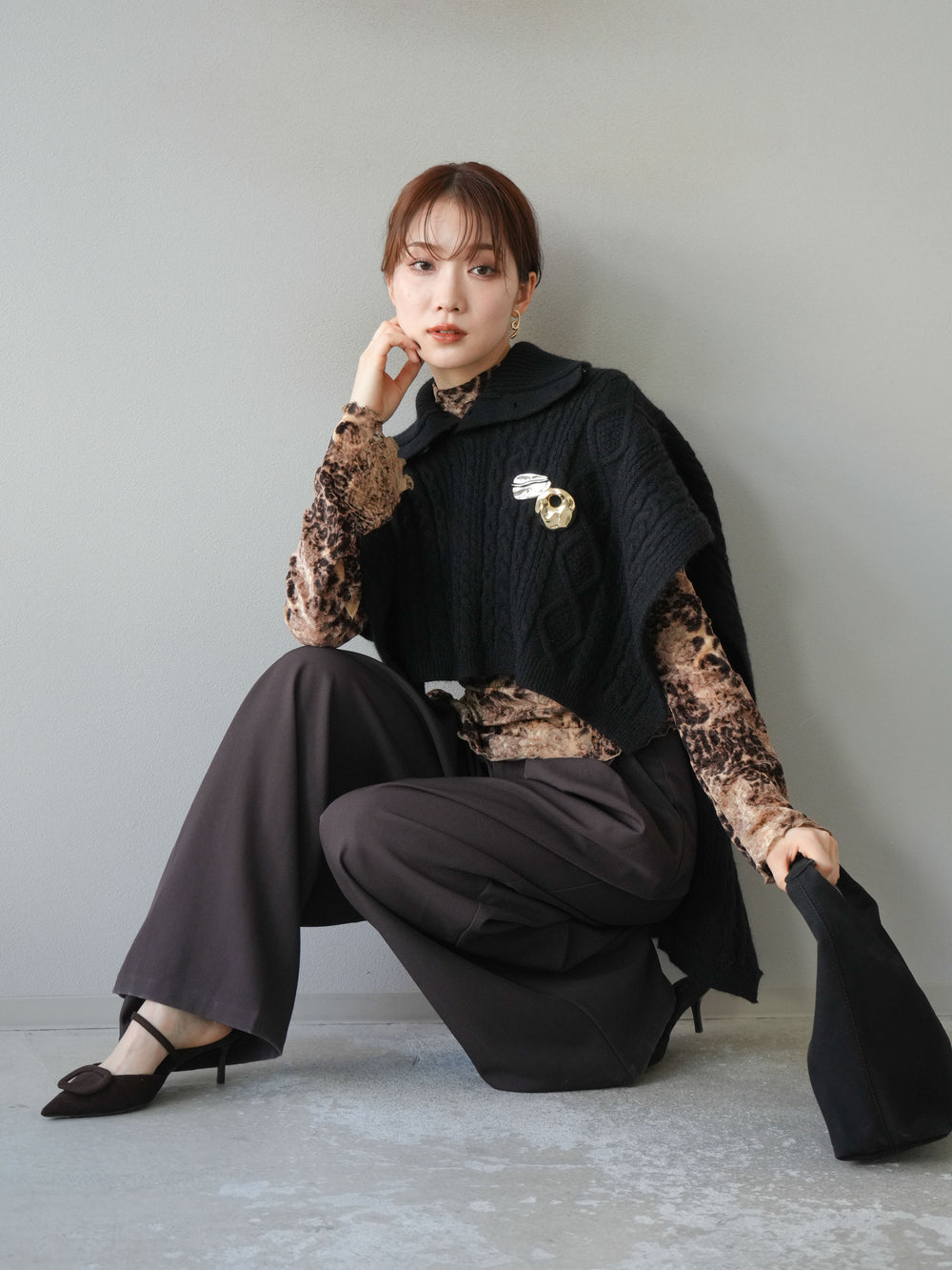 [予約]ネック透かし編みニットプルオーバー/ダークグレー