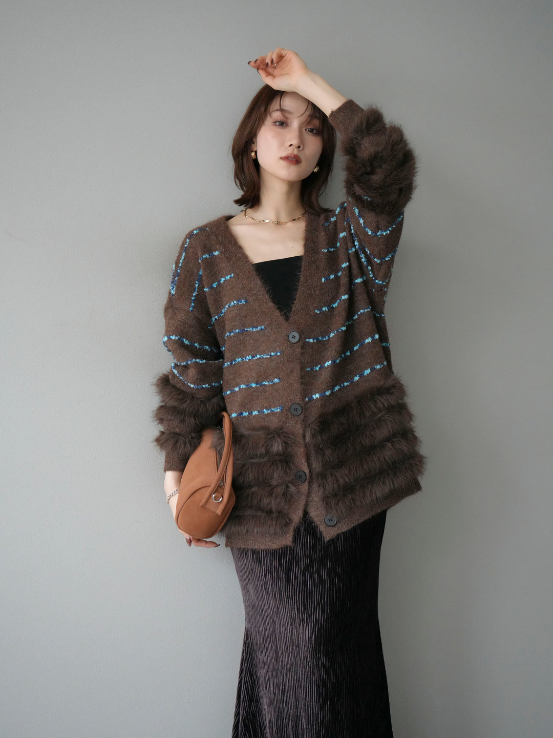 [予約]フェザーライン配色シャギーニットカーディガン/ブラウン