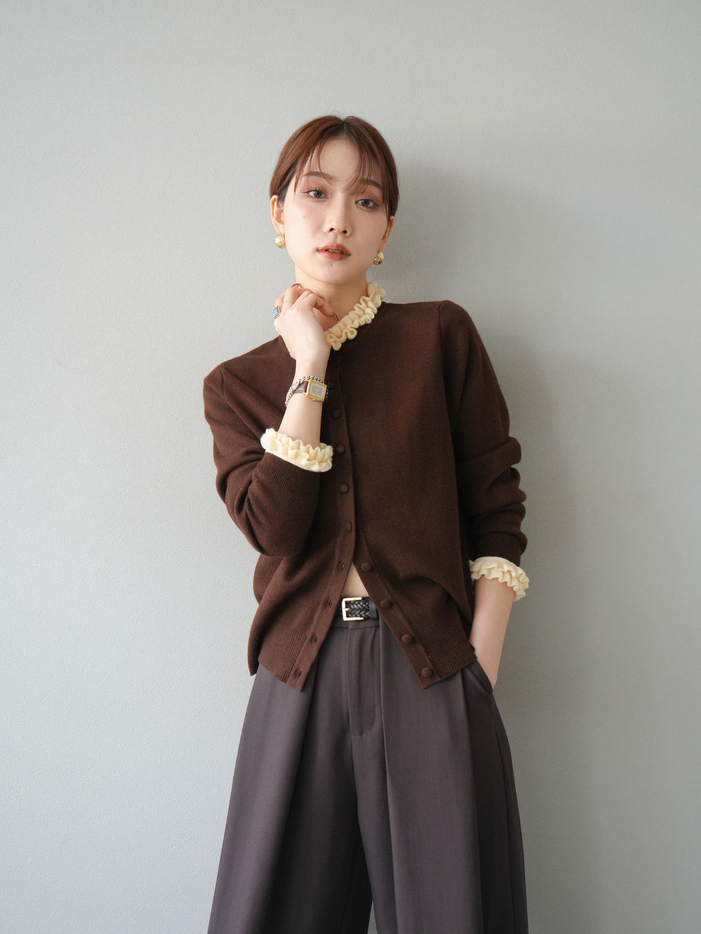[予約]フリルデザインコンパクトニットカーディガン/ブラウン