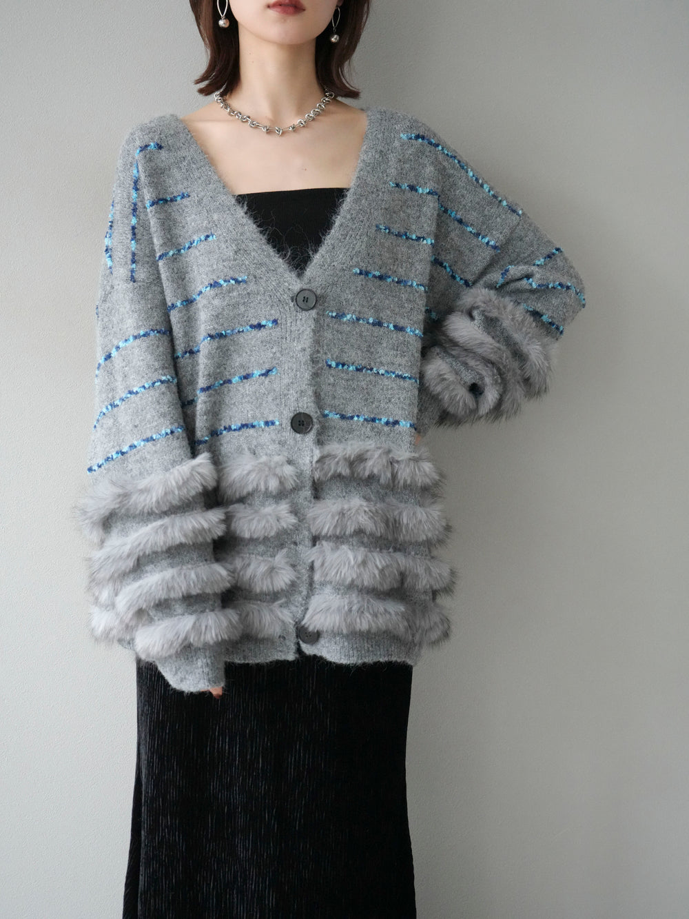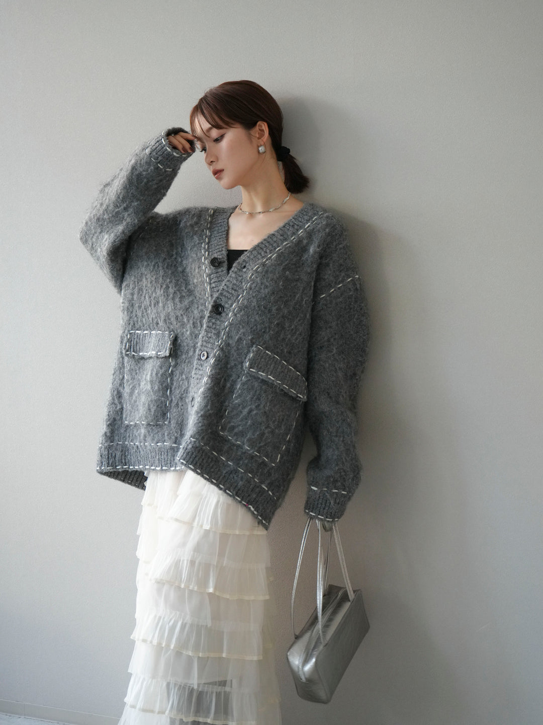 [予約]フェザーライン配色シャギーニットカーディガン/グレー