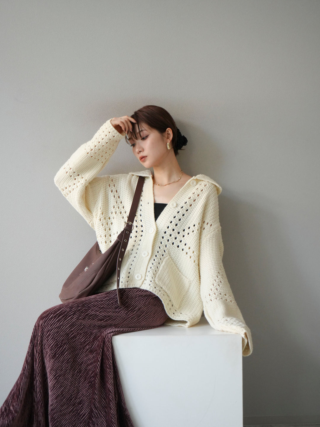 [予約]丸襟透かし編みニットカーディガン/オフ