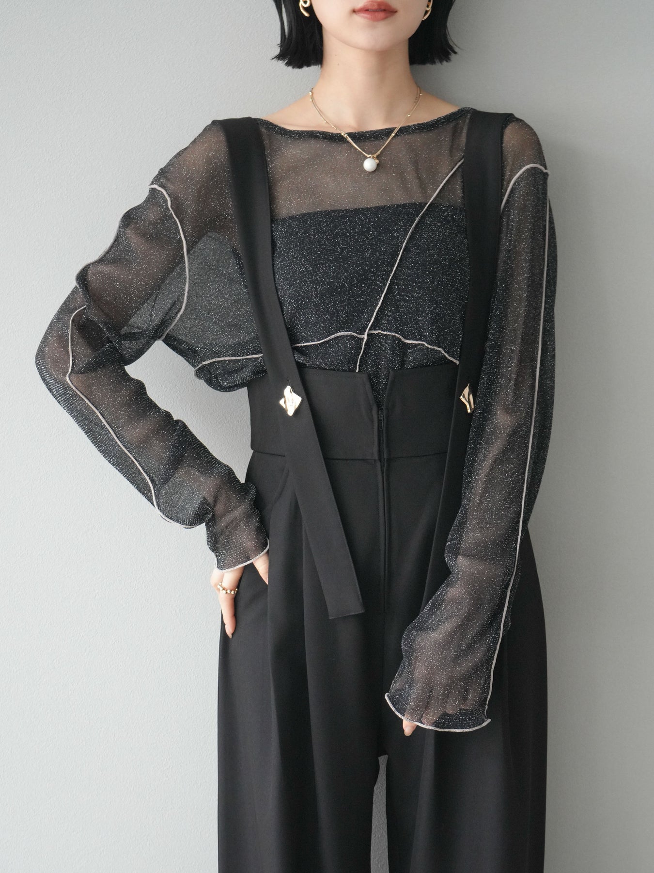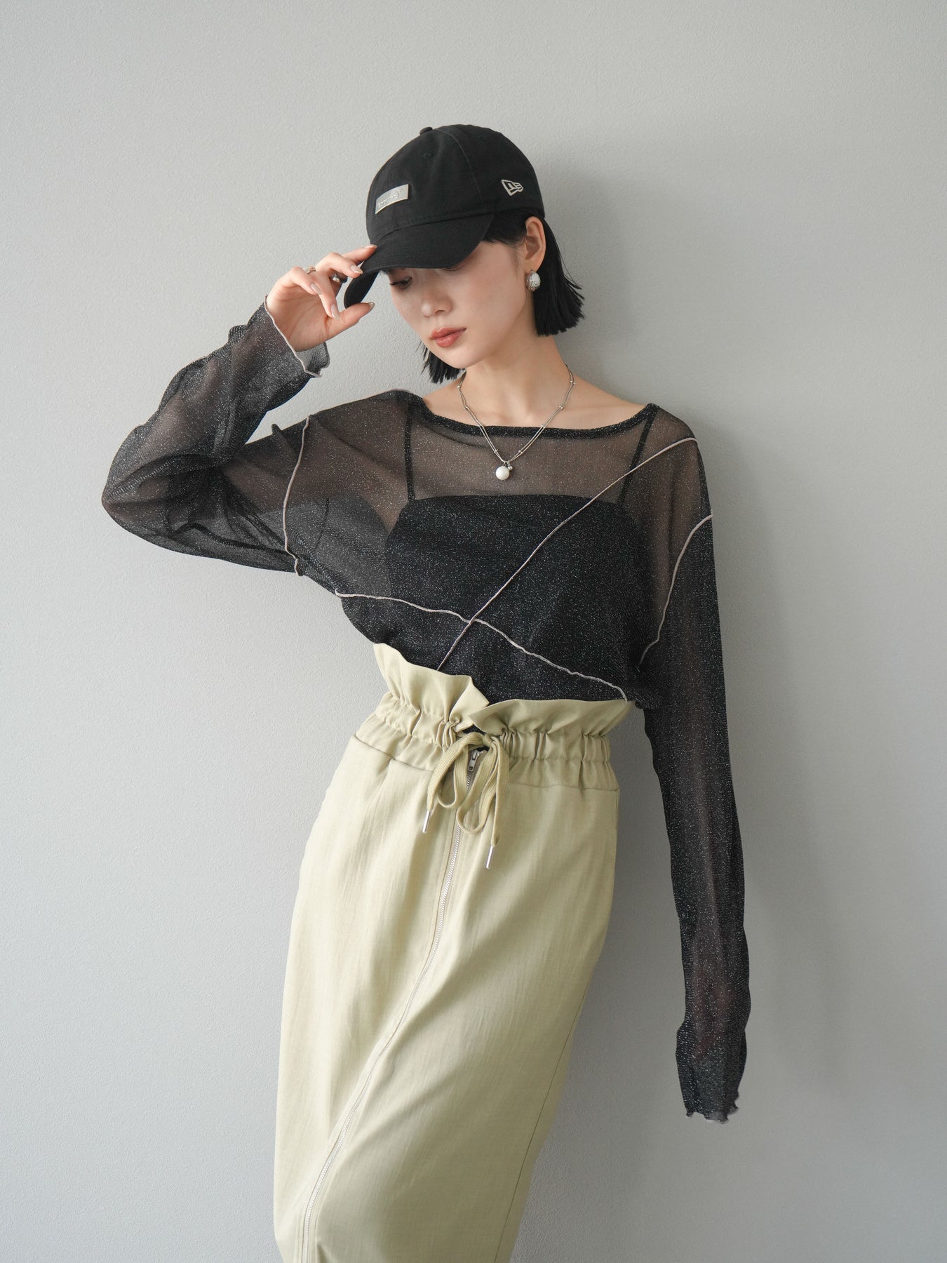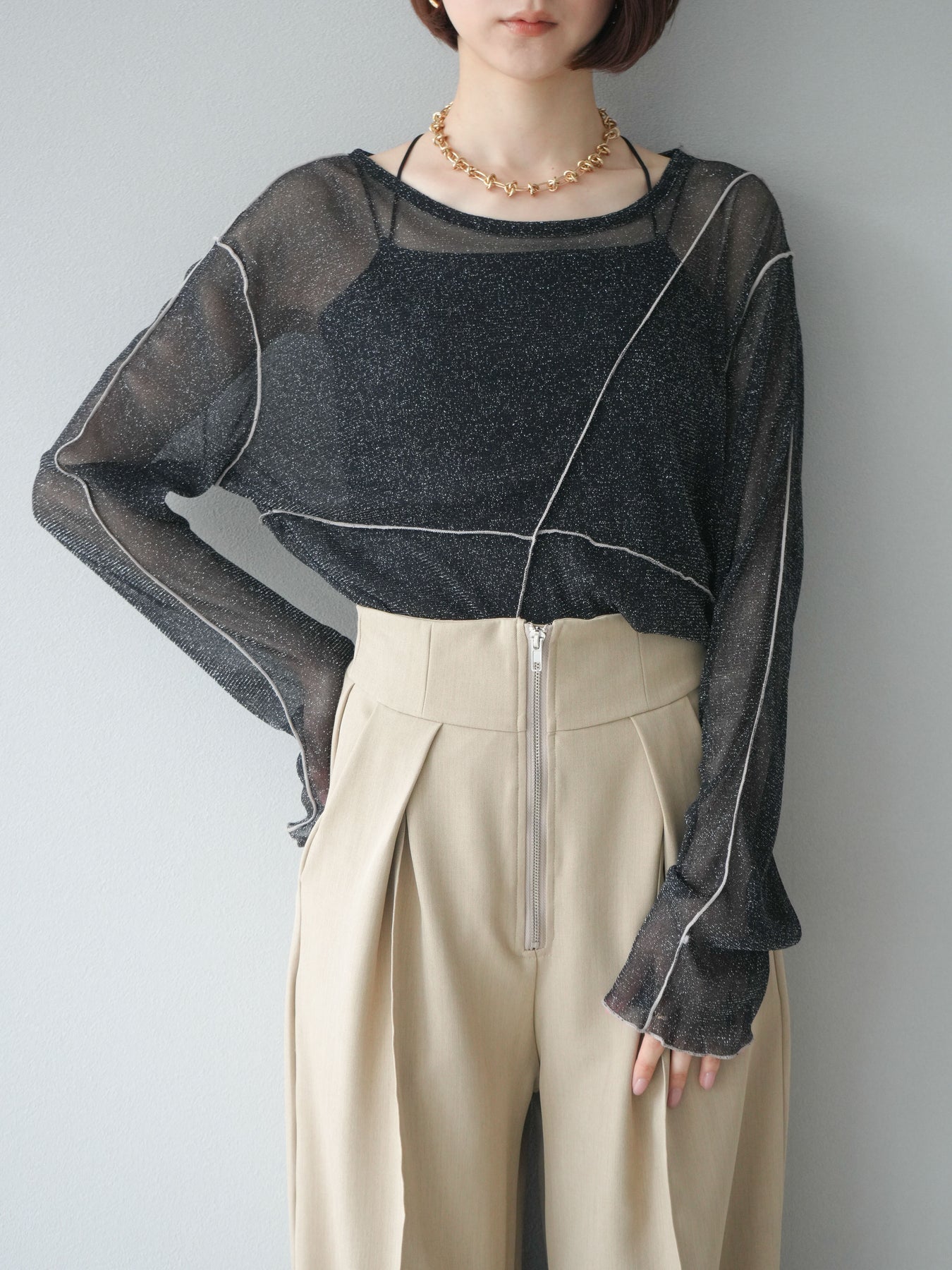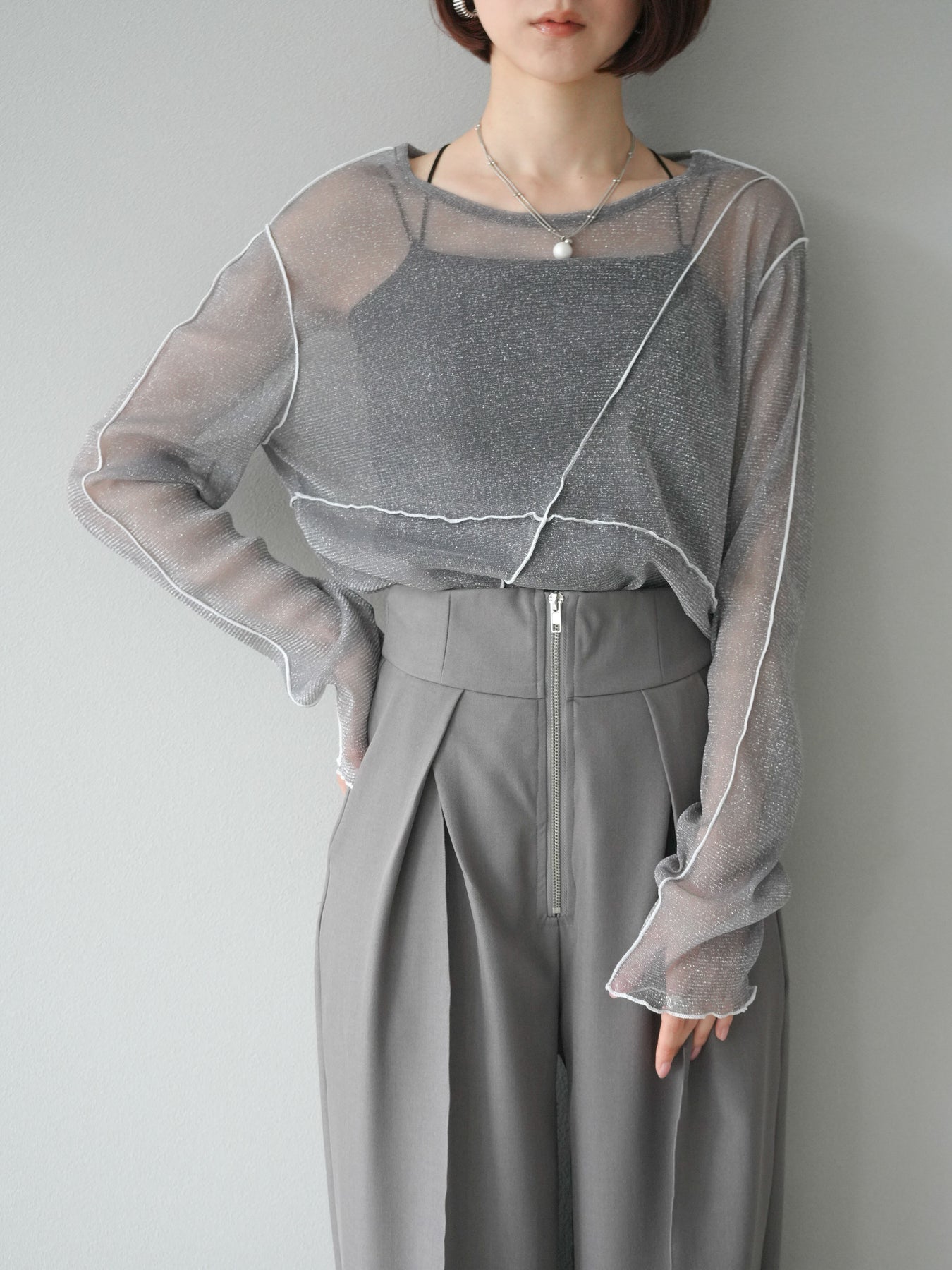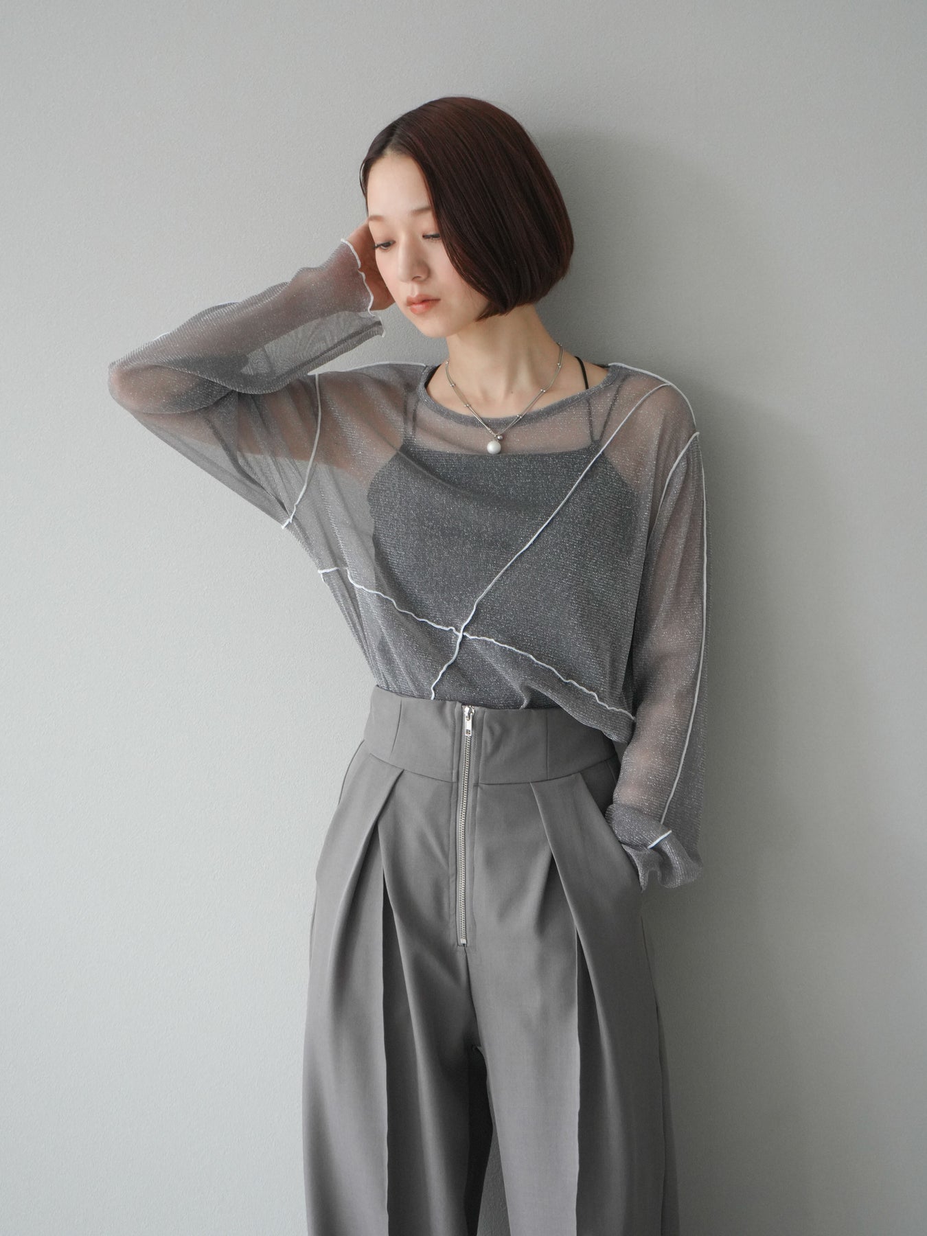 繊細なラメ感が目を惹く、トレンドライクなシアープルオーバー。バイカラーメローのラインがアクセントになり、レイヤードスタイルにも映えるデザインです。柔らかく軽い着心地で、旬の透け感コーデが楽しめる一枚。インナーとの組み合わせ次第で表情が変わり、デイリーから特別なシーンまで幅広く活躍します。 ※ボトムス、キャミソール(インナー)以外の商品は一律でインナーは付属していません