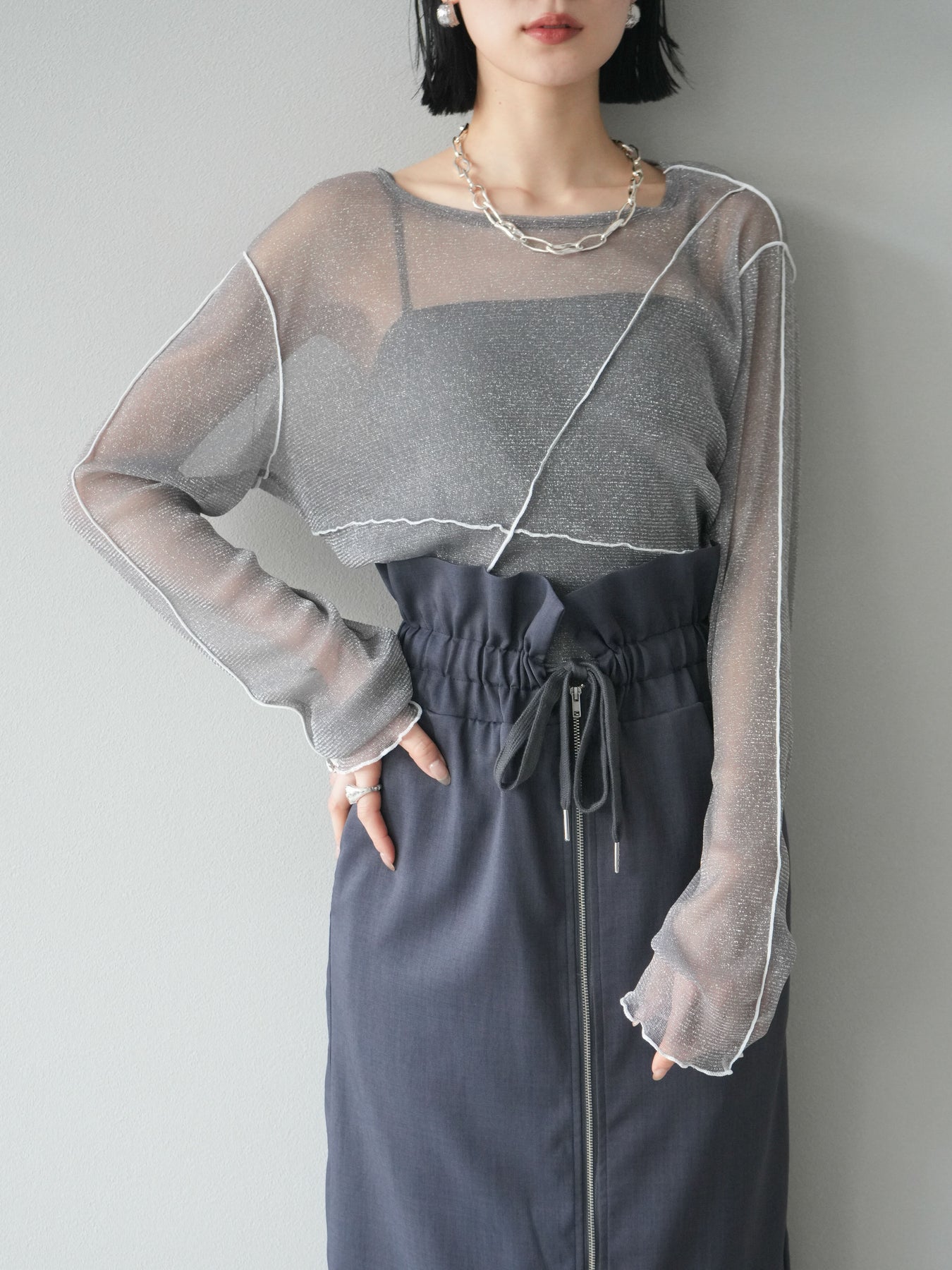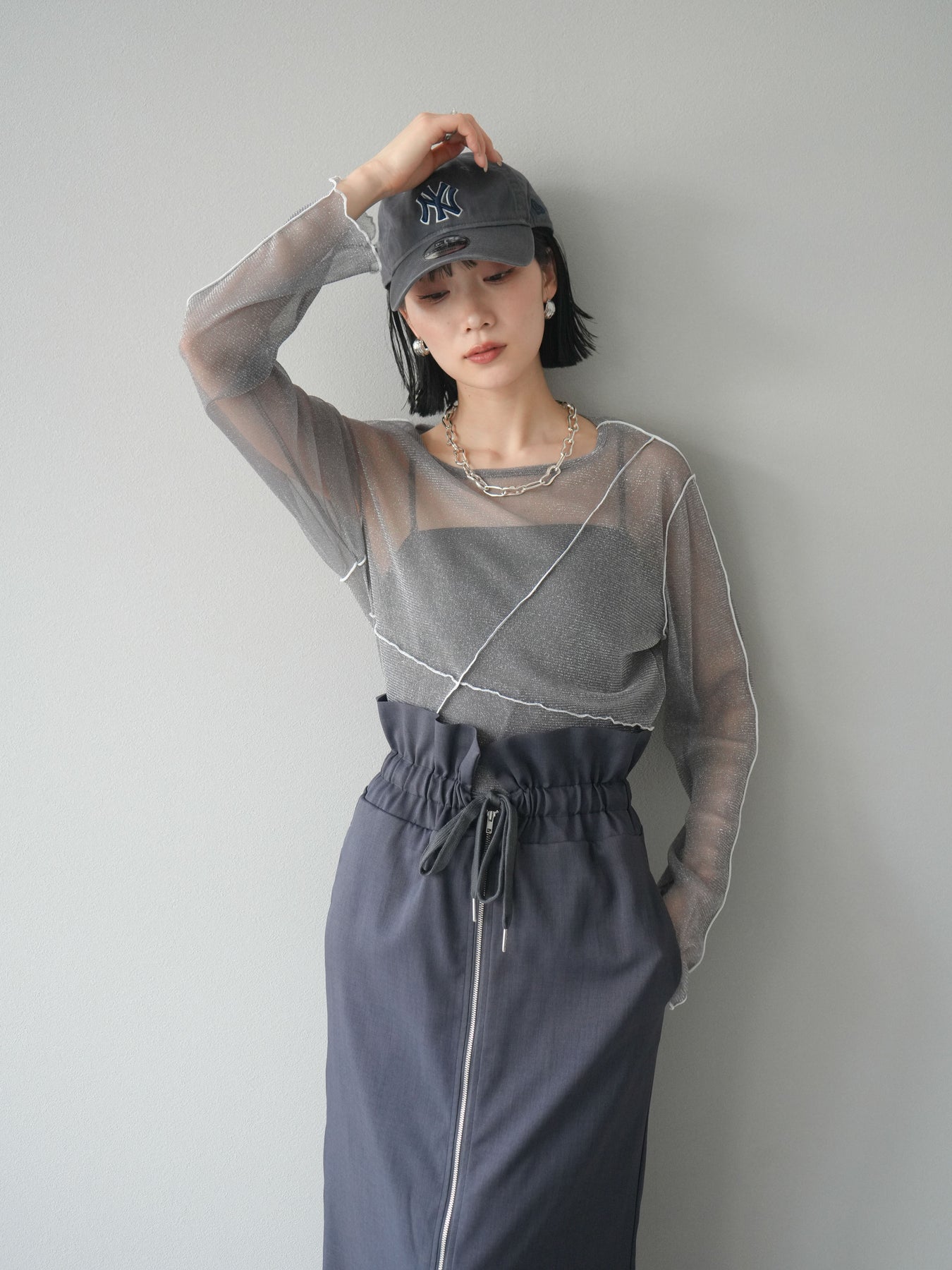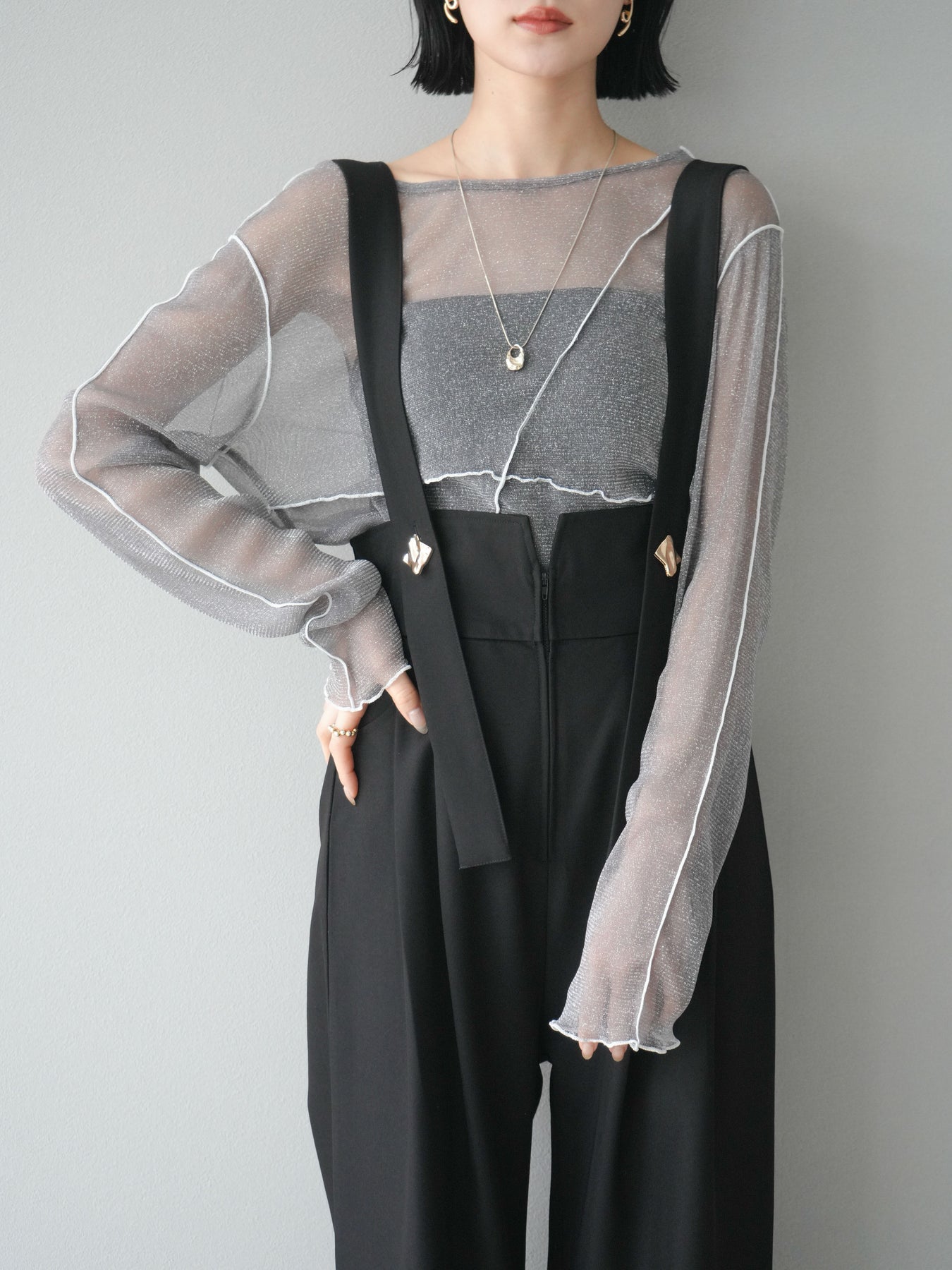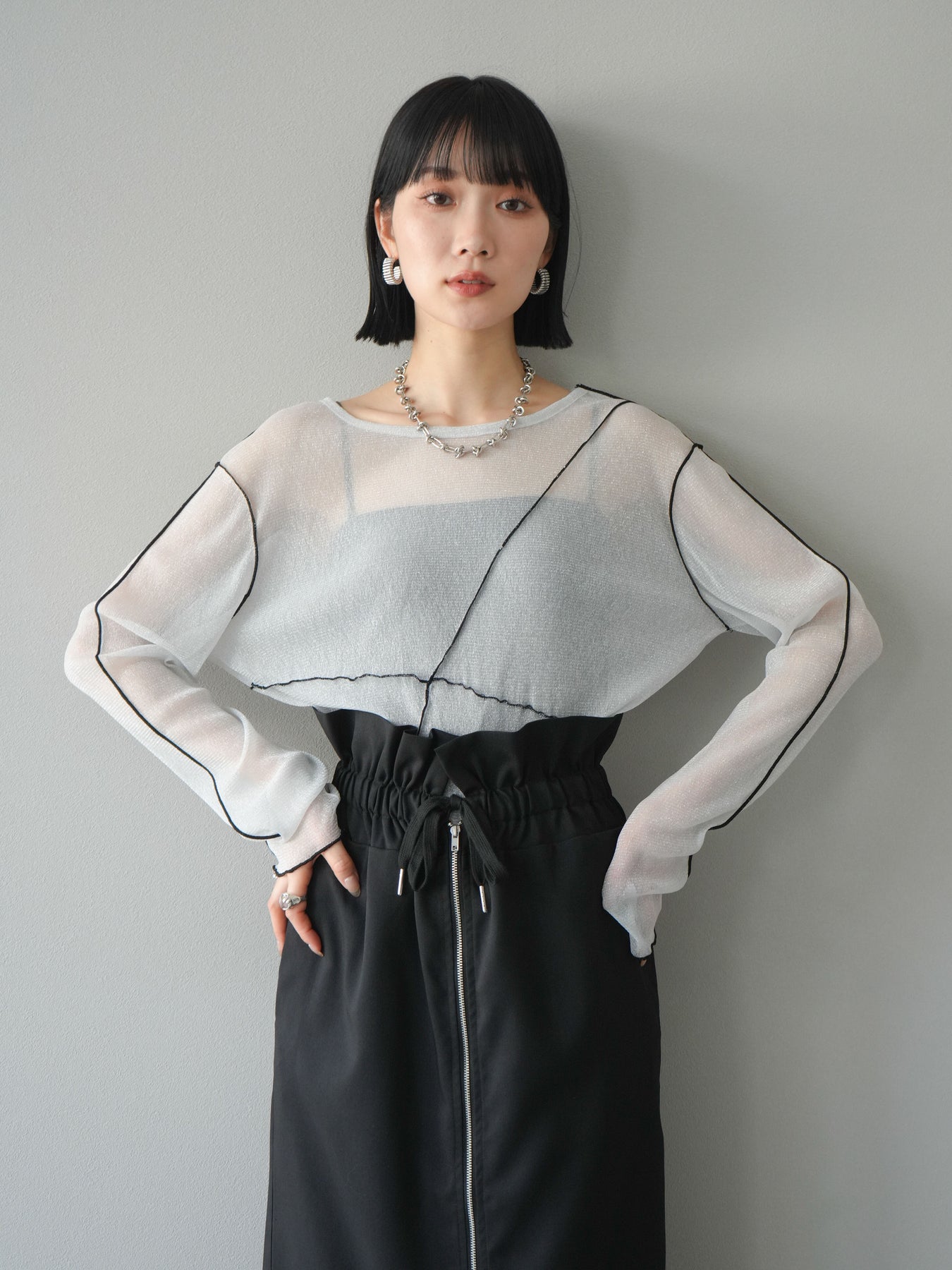 繊細なラメ感が目を惹く、トレンドライクなシアープルオーバー。バイカラーメローのラインがアクセントになり、レイヤードスタイルにも映えるデザインです。柔らかく軽い着心地で、旬の透け感コーデが楽しめる一枚。インナーとの組み合わせ次第で表情が変わり、デイリーから特別なシーンまで幅広く活躍します。 ※ボトムス、キャミソール(インナー)以外の商品は一律でインナーは付属していません