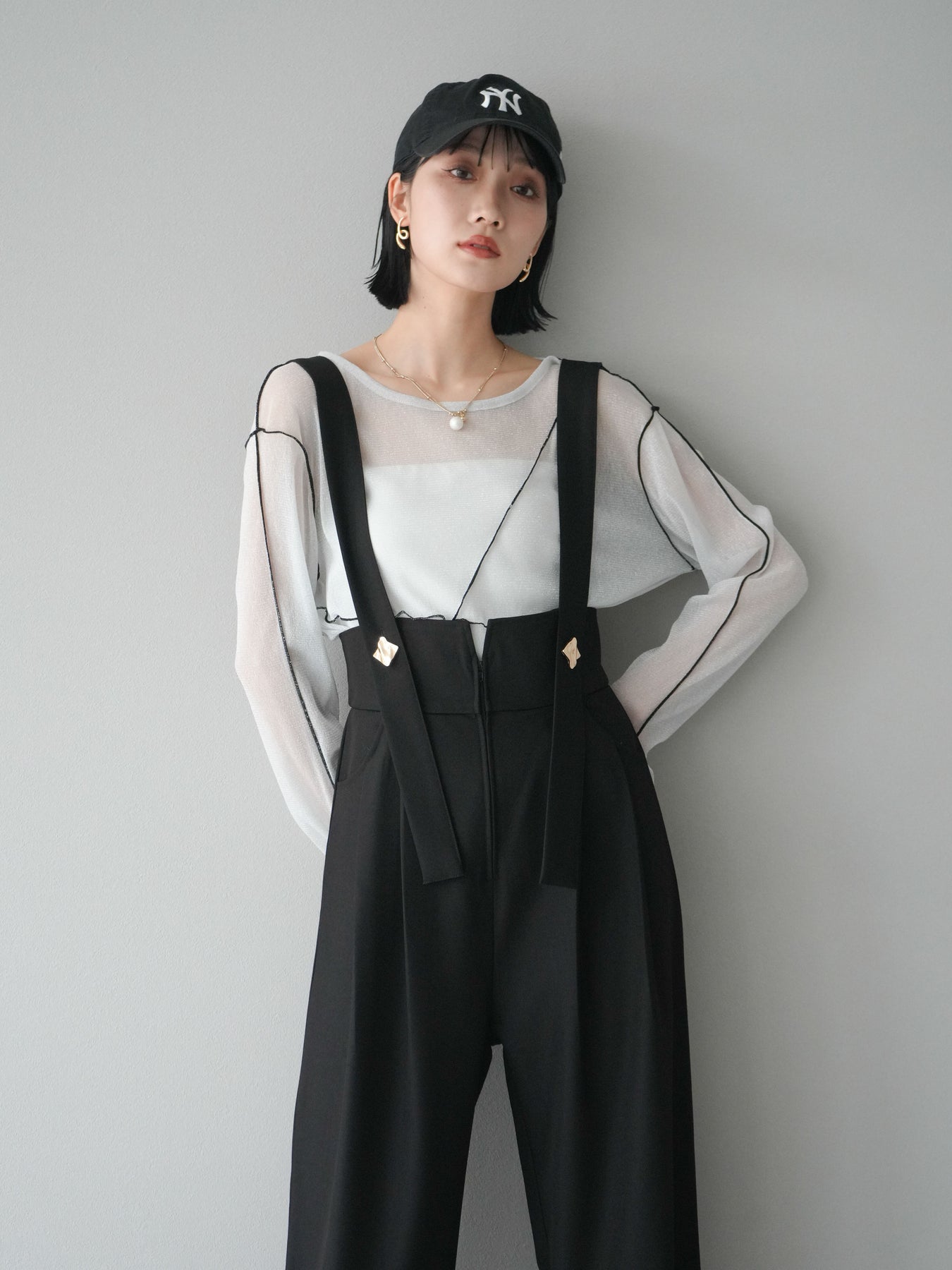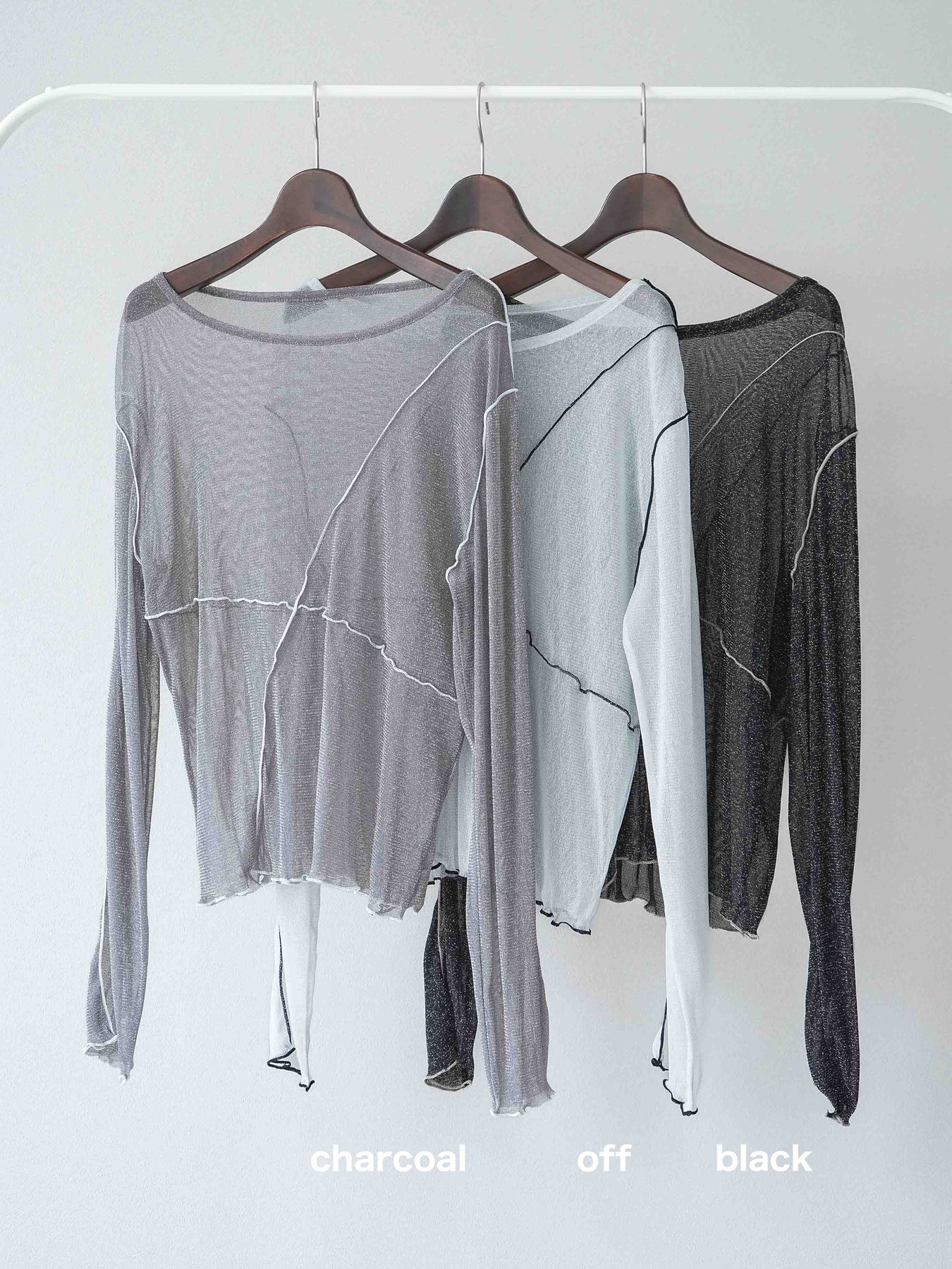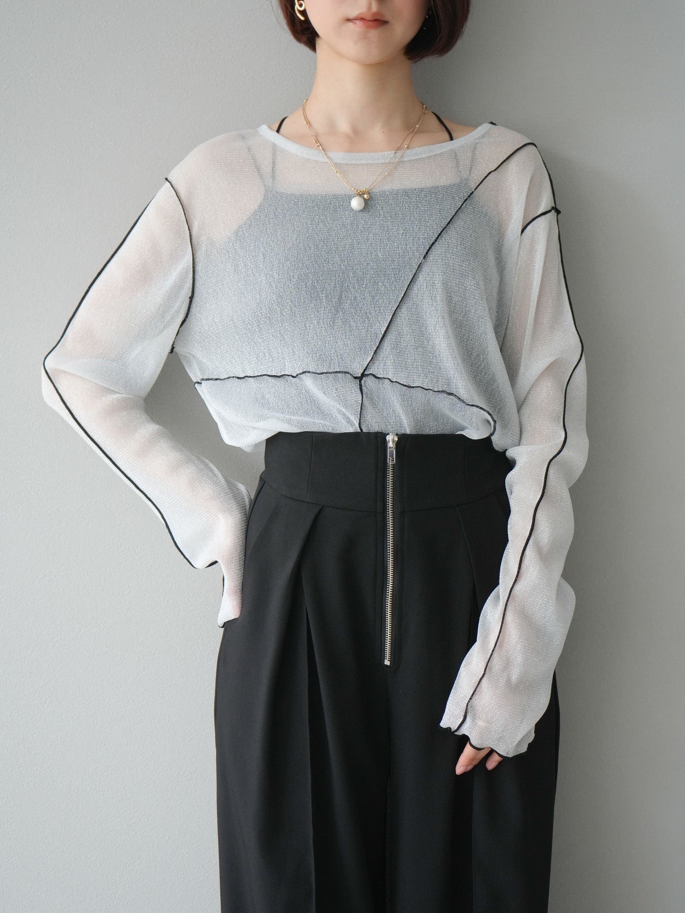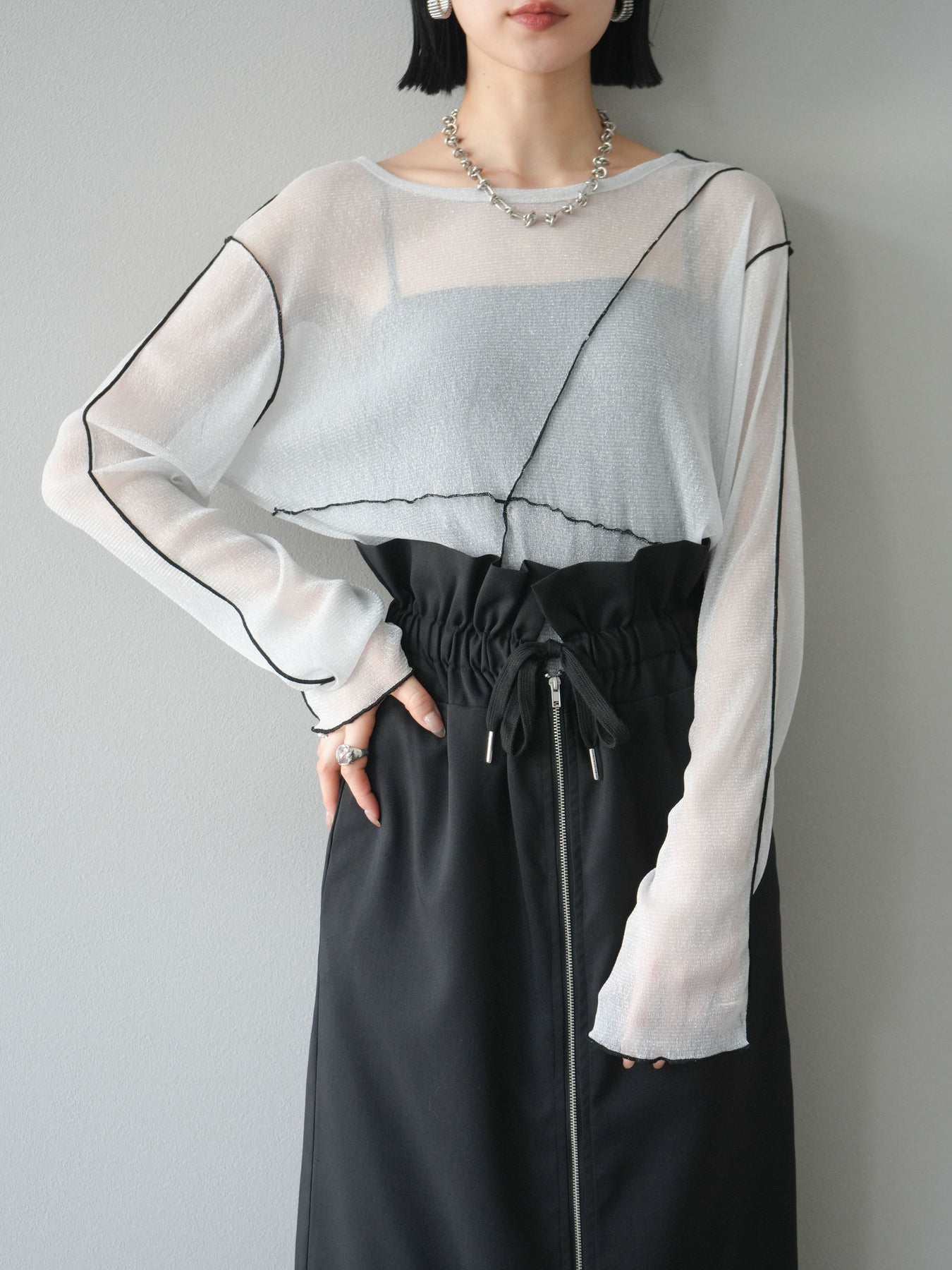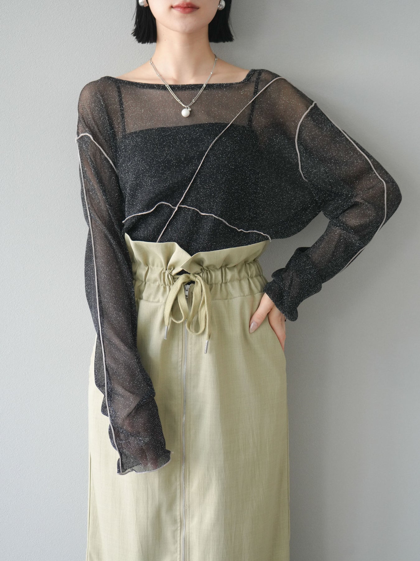 繊細なラメ感が目を惹く、トレンドライクなシアープルオーバー。バイカラーメローのラインがアクセントになり、レイヤードスタイルにも映えるデザインです。柔らかく軽い着心地で、旬の透け感コーデが楽しめる一枚。インナーとの組み合わせ次第で表情が変わり、デイリーから特別なシーンまで幅広く活躍します。 ※ボトムス、キャミソール(インナー)以外の商品は一律でインナーは付属していません