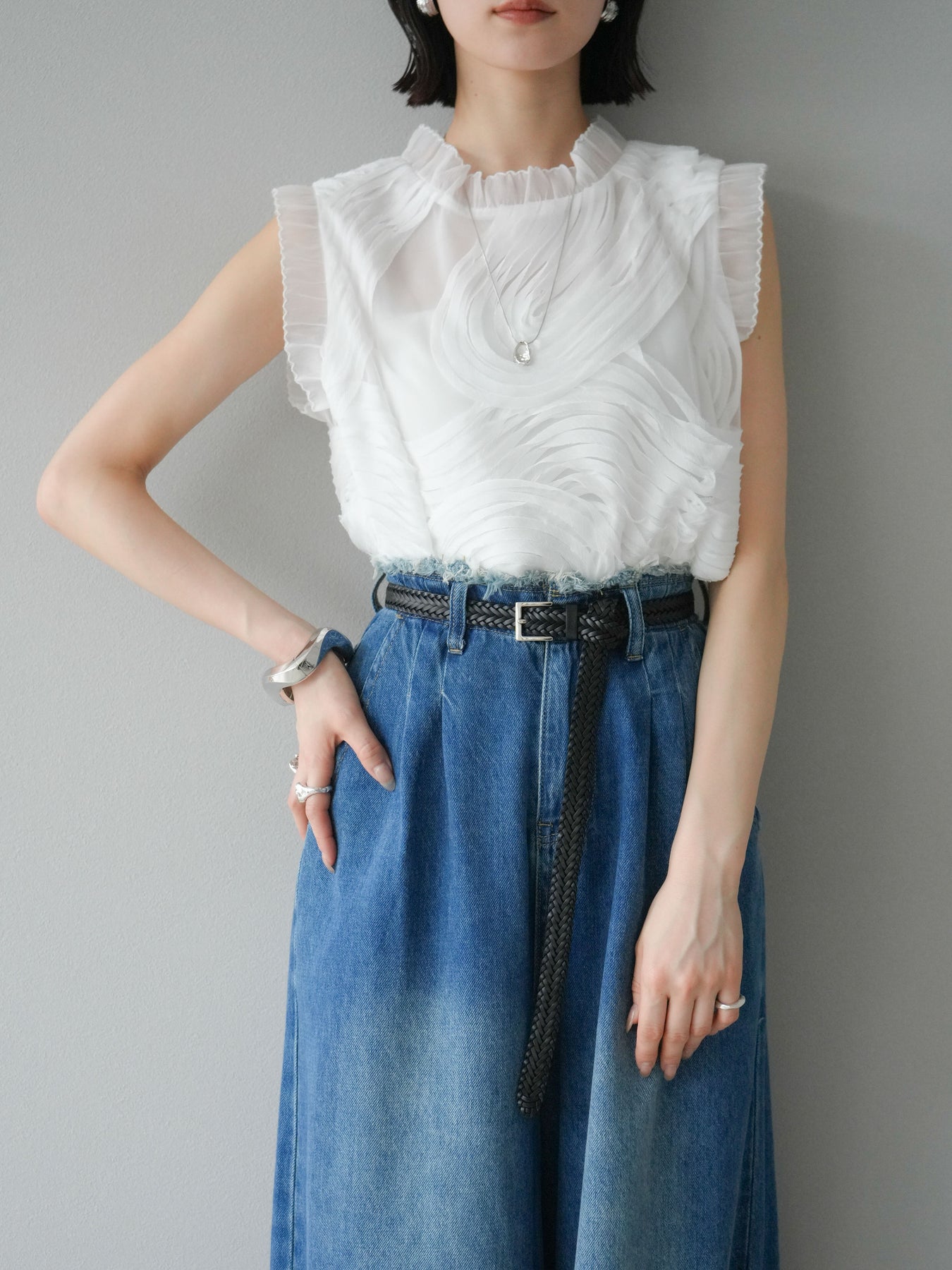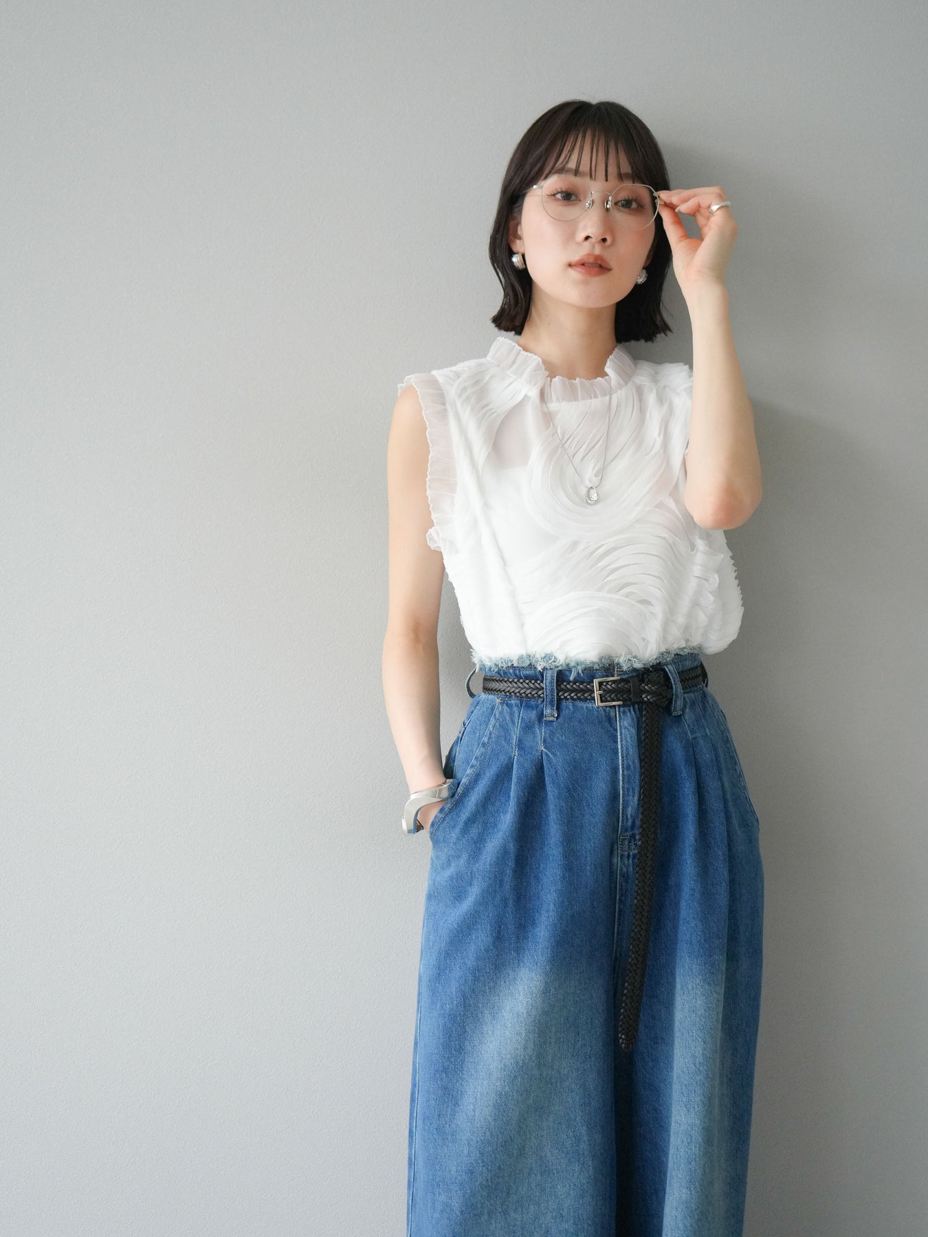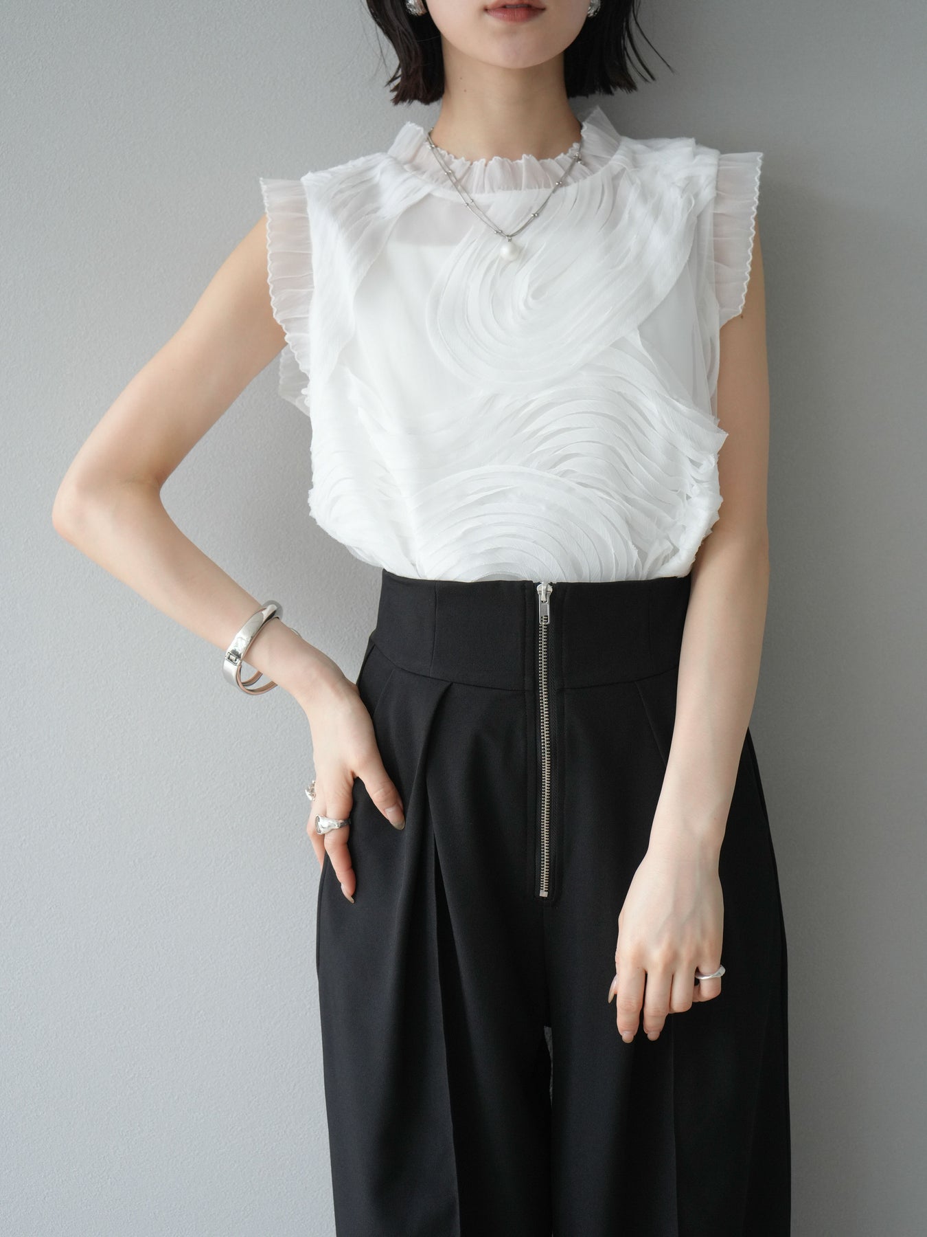 立体感のあるジャガード柄が特徴的なチュール素材のノースリブラウス。柔らかなチュールが女性らしさを引き立て、動きに合わせて美しいシルエットを作り出します。フリル感と繊細なデザインが上品で華やかな印象を与え、特別なシーンにもぴったりです。シンプルながらも華やかさを持ち合わせた一枚です。 ※ボトムス、キャミソール(インナー)以外の商品は一律でインナーは付属していません