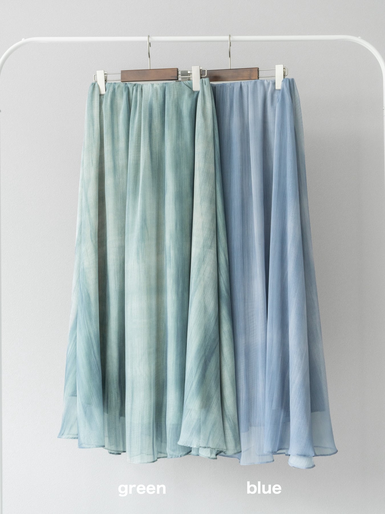 やわらかなシアー素材にニュアンス感のある染め柄を施した、女性らしさ漂うフレアスカート。軽やかな生地が歩くたびにふんわりと揺れ、上品で涼しげな印象を与えてくれます。ウエストはゴム仕様でストレスフリーな履き心地。ボリューム感がありながらも落ち感のある素材で広がりすぎず、大人のフェミニンスタイルにぴったりの一枚です。同素材のトップスとセットアップ風に着こなすのもおすすめ。 ※ボトムス、キャミソール(インナー)以外の商品は一律でインナーは付属していません。