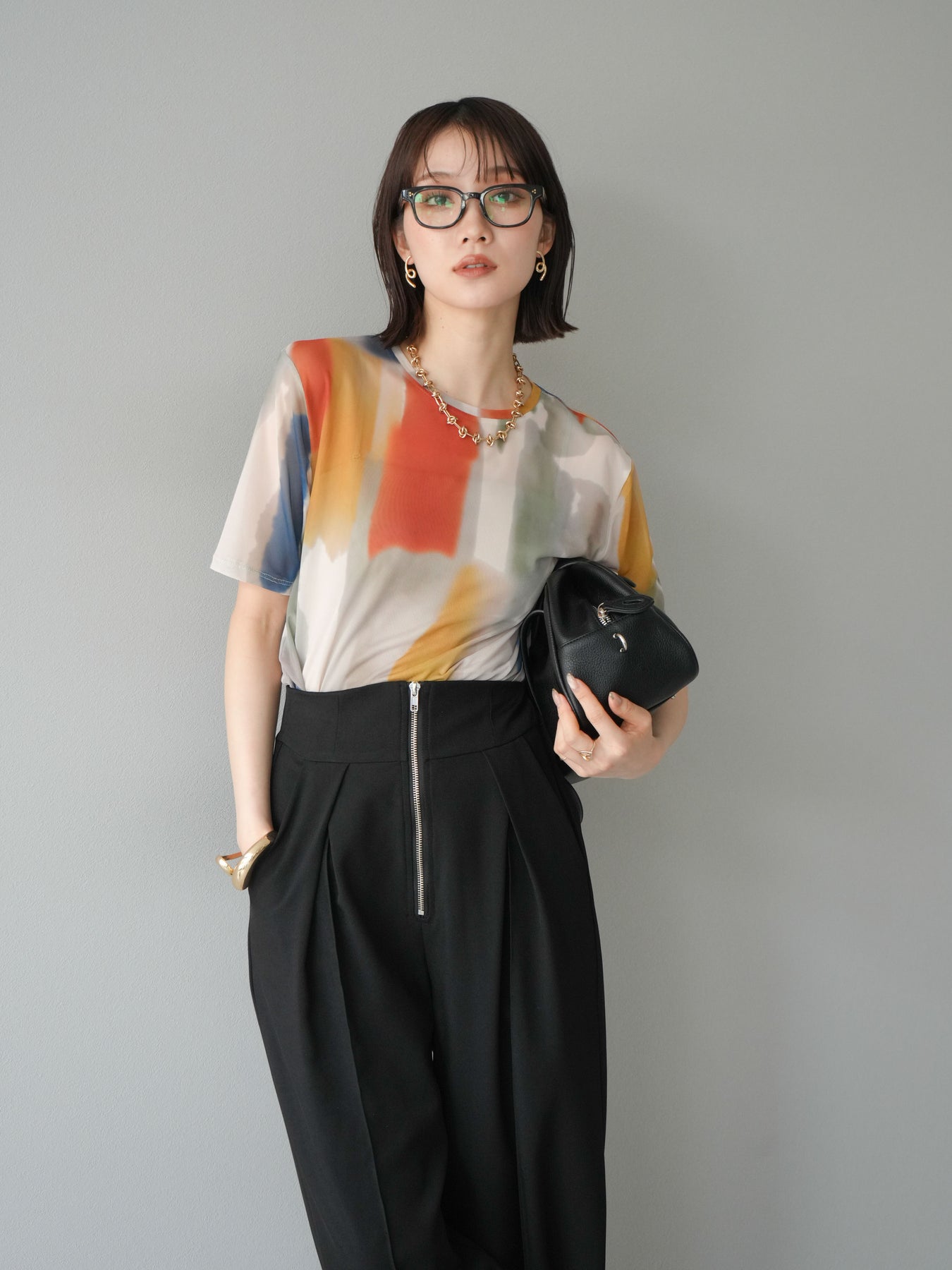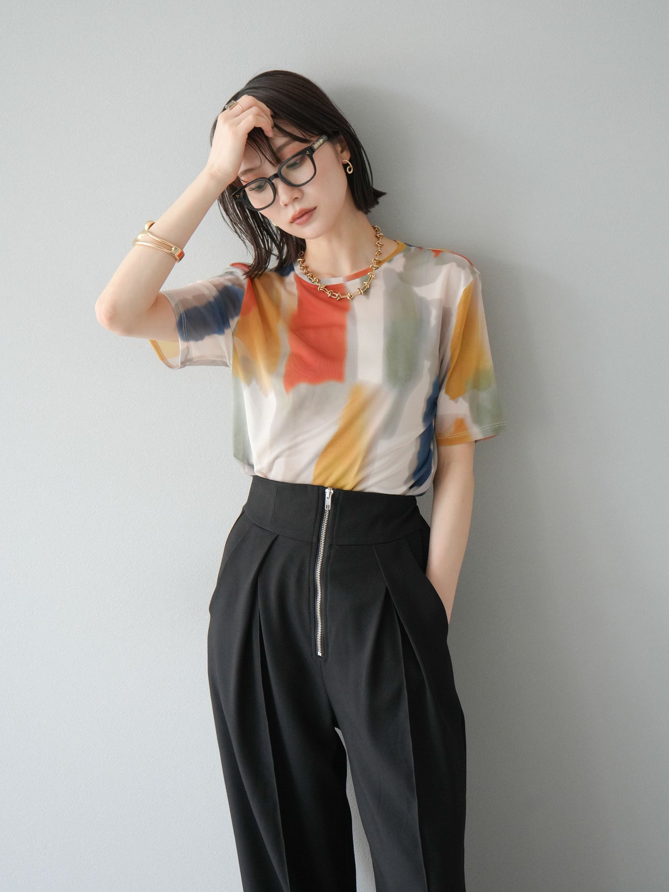 水彩画のような柔らかなタッチで描かれたアートプリントが目を惹く、水彩アートシアーTシャツ。軽やかな透け感のあるシアー素材が、トレンド感と抜け感を演出し、1枚でスタイリングに華やかさをプラスしてくれます。程よくフィットするシルエットで、インナーとのレイヤードも楽しめるアイテム。カジュアルなボトムと合わせても、どこか洗練された印象に仕上がる大人のためのデザインTシャツです。 ※ボトムス、キャミソール(インナー)以外の商品は一律でインナーは付属していません。