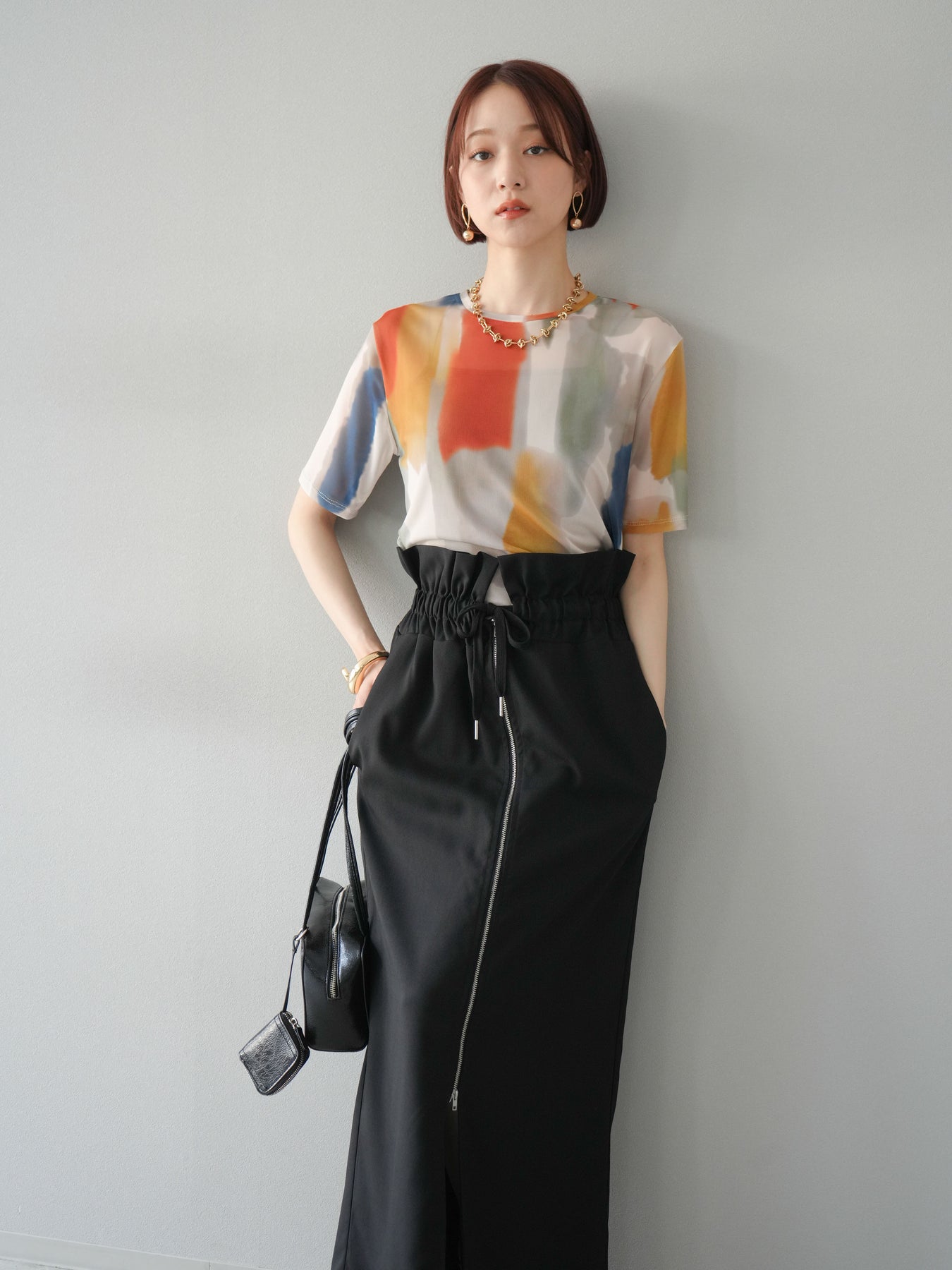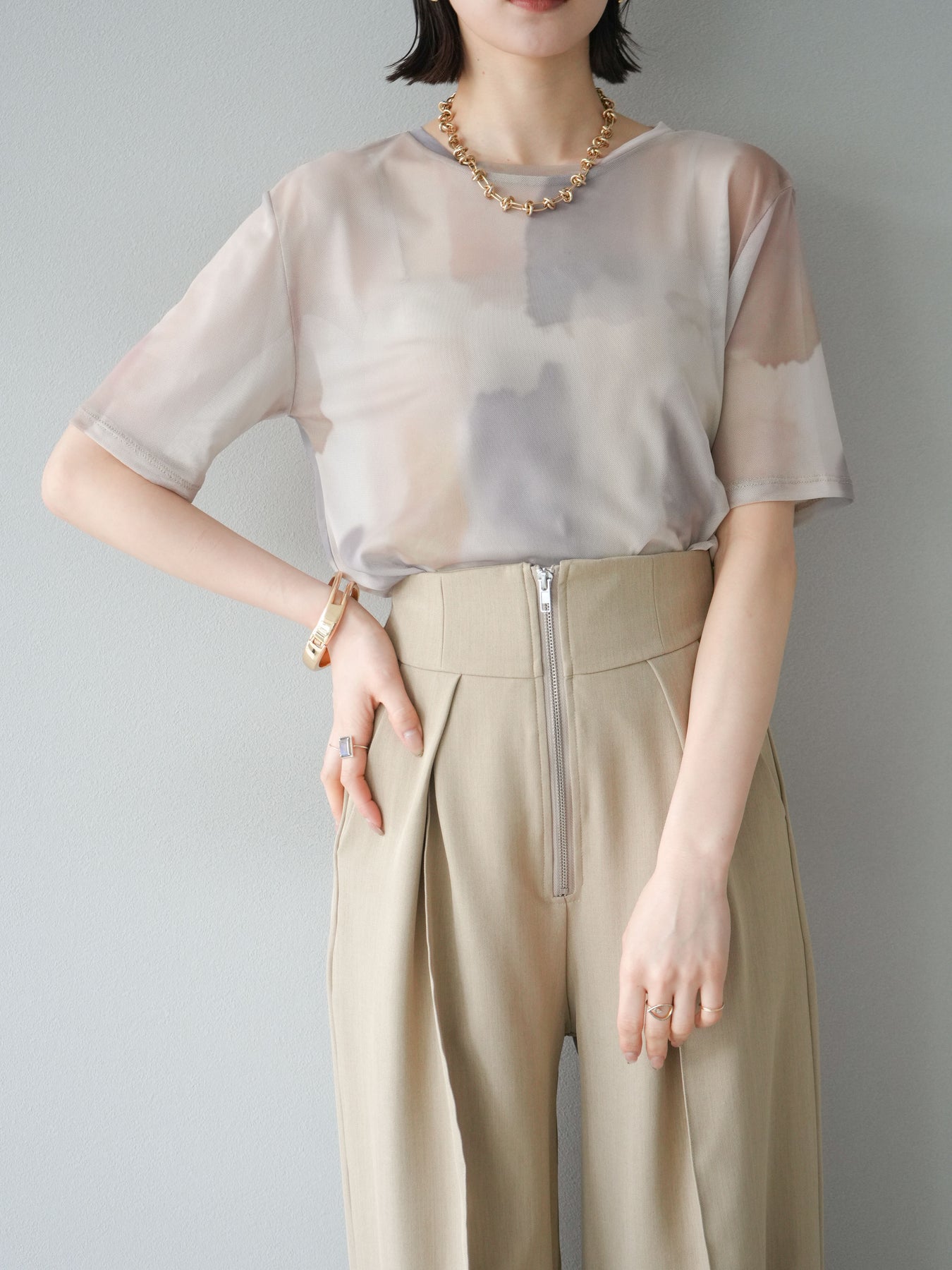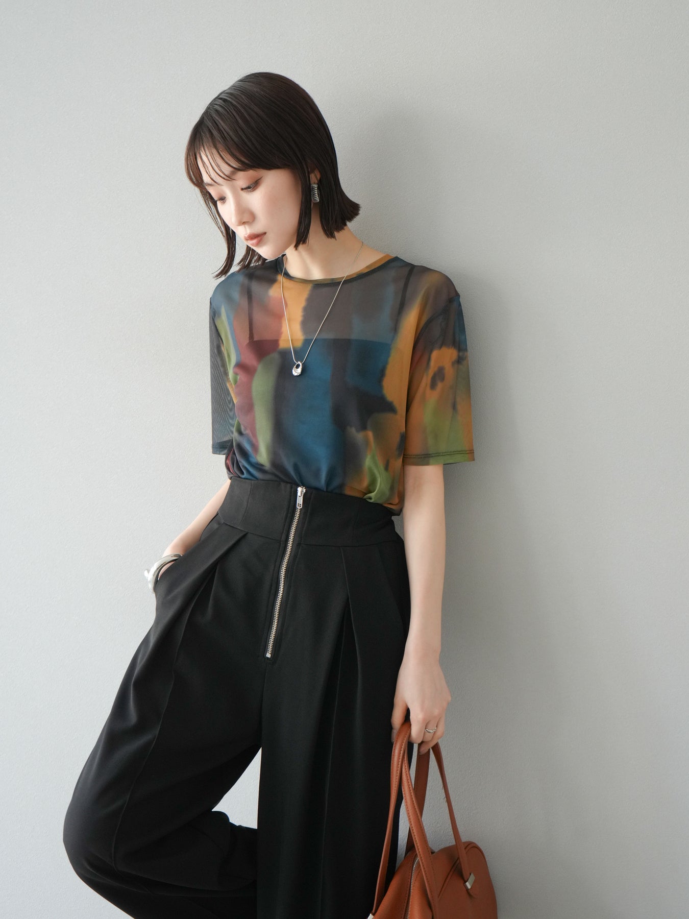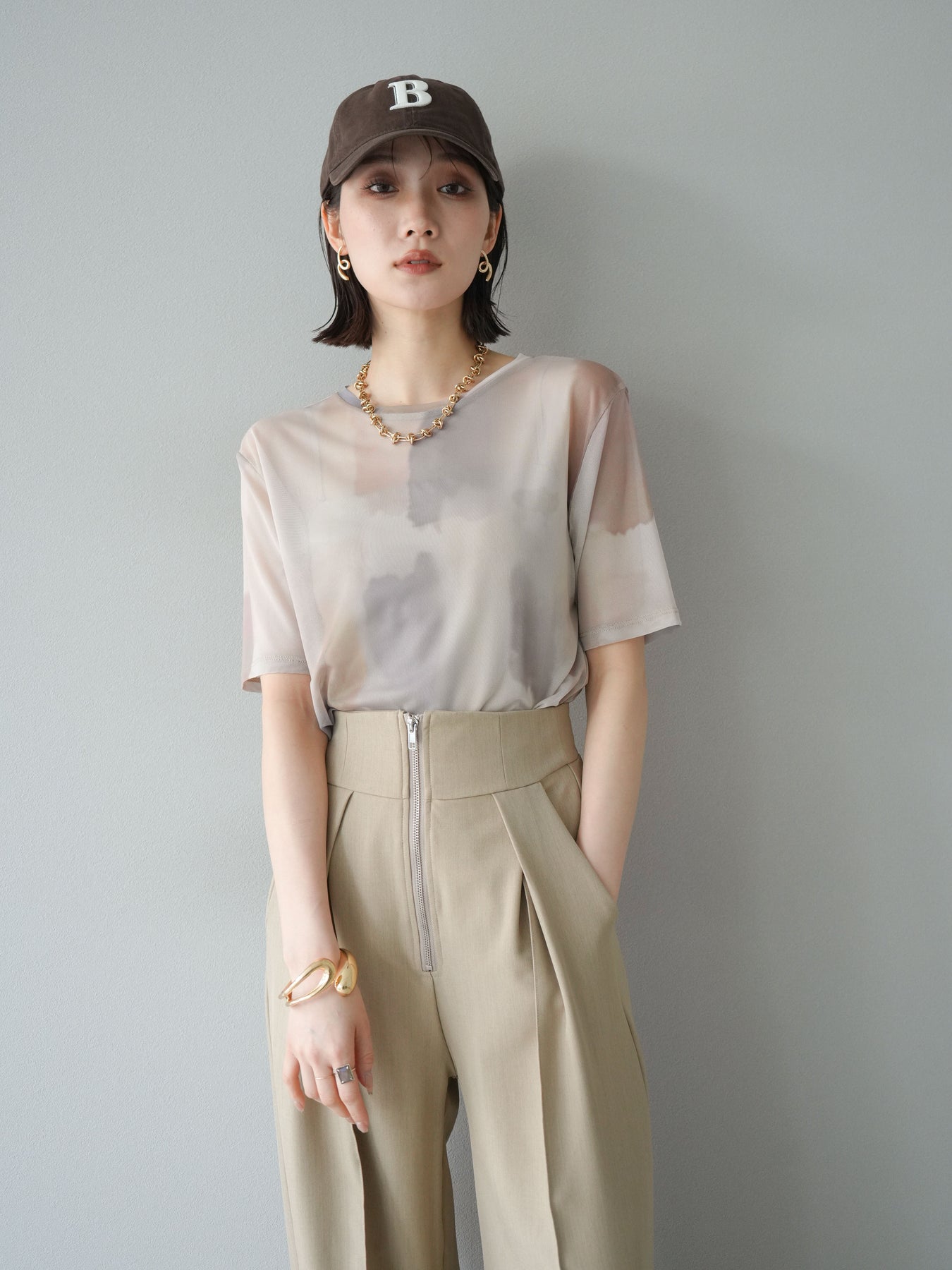 水彩画のような柔らかなタッチで描かれたアートプリントが目を惹く、水彩アートシアーTシャツ。軽やかな透け感のあるシアー素材が、トレンド感と抜け感を演出し、1枚でスタイリングに華やかさをプラスしてくれます。程よくフィットするシルエットで、インナーとのレイヤードも楽しめるアイテム。カジュアルなボトムと合わせても、どこか洗練された印象に仕上がる大人のためのデザインTシャツです。 ※ボトムス、キャミソール(インナー)以外の商品は一律でインナーは付属していません。