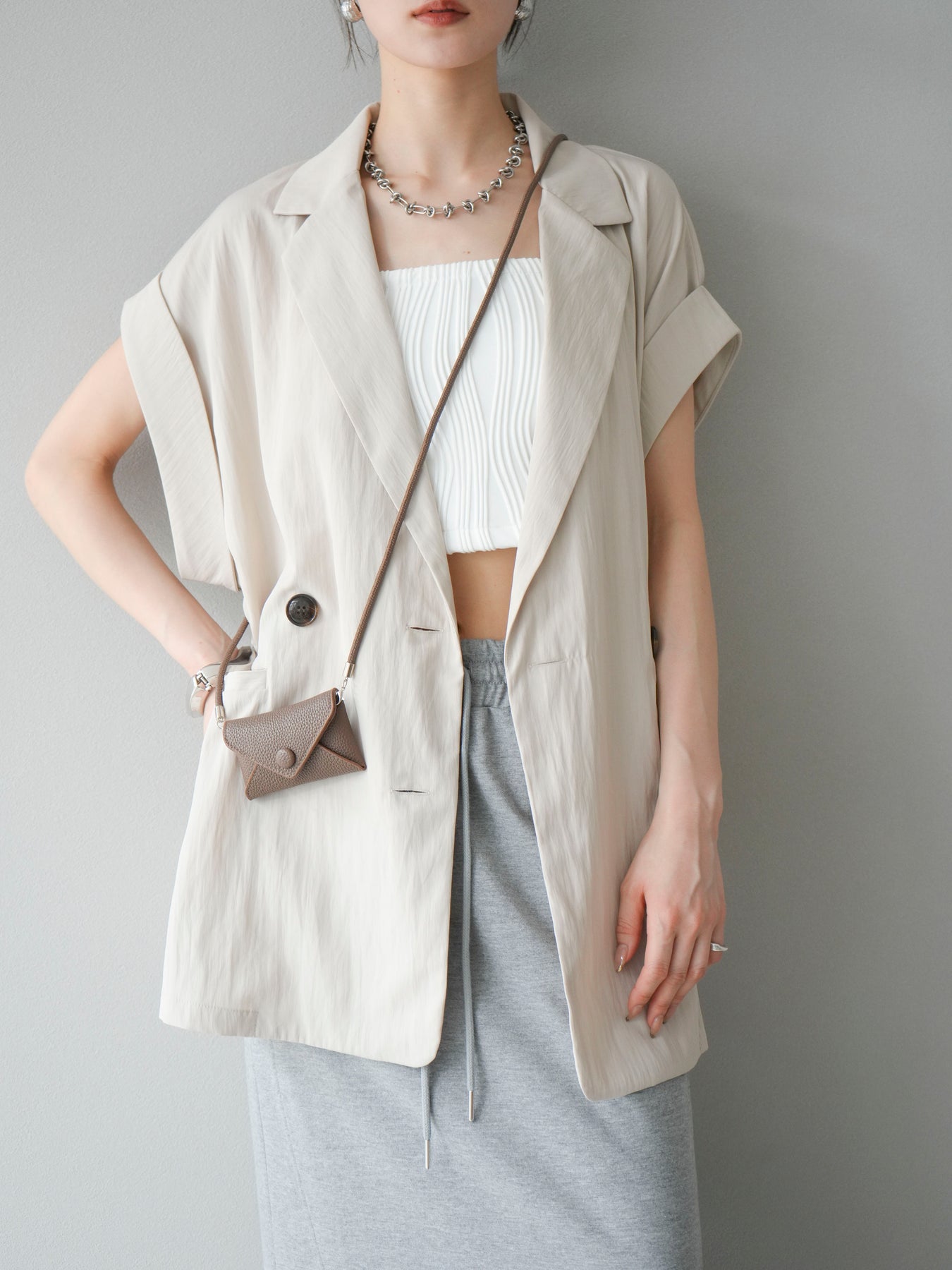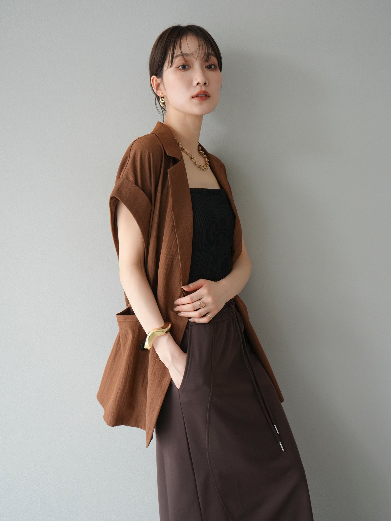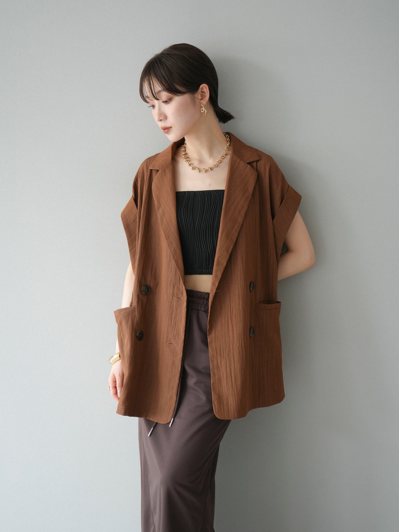ナチュラルな風合いが魅力のリネンライク素材を使用した、ダブルボタン仕様のノースリーブジレ。肩に程よくかかるフレンチスリーブと、計算されたゆとりのあるシルエットが、抜け感とこなれた印象を演出します。 ヒップが隠れるロング丈で、体型カバーと縦ラインのスタイルアップ効果も抜群。Tシャツやノースリーブトップスの上にさっと羽織るだけで、洗練されたレイヤードスタイルが完成します。セットアップ風の着こなしもおすすめです。 ※ボトムス、キャミソール(インナー)以外の商品は一律でインナーは付属していません。