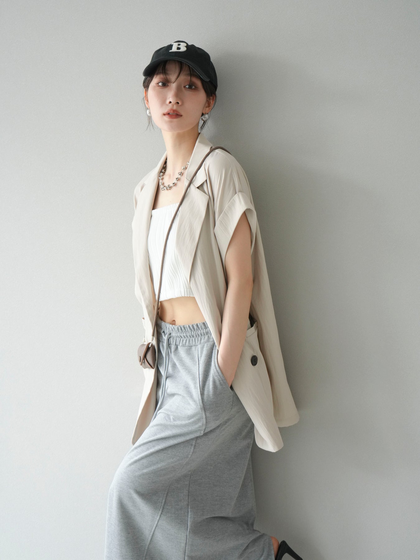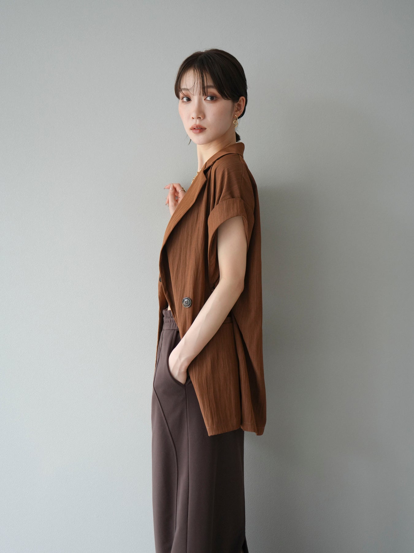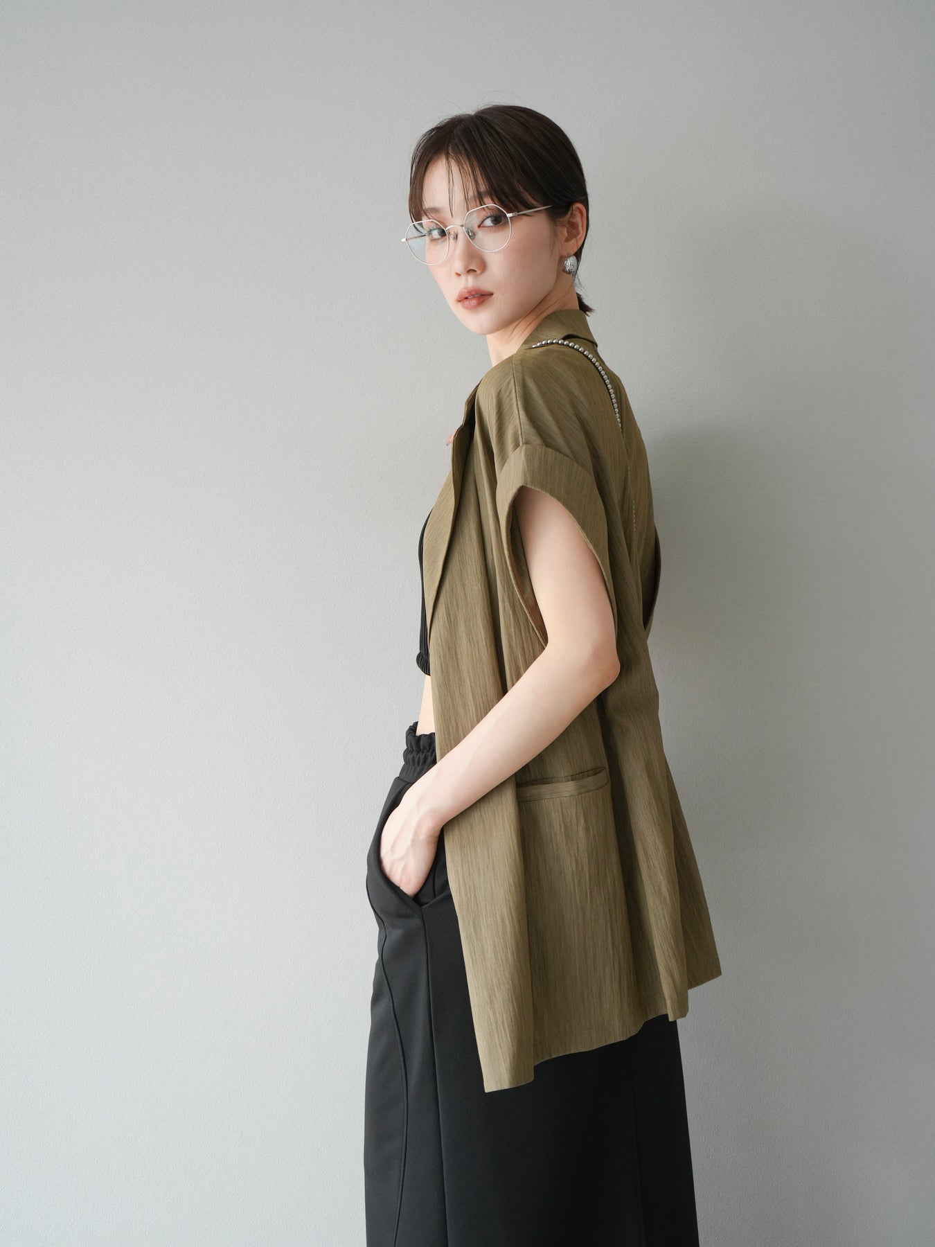 ナチュラルな風合いが魅力のリネンライク素材を使用した、ダブルボタン仕様のノースリーブジレ。肩に程よくかかるフレンチスリーブと、計算されたゆとりのあるシルエットが、抜け感とこなれた印象を演出します。 ヒップが隠れるロング丈で、体型カバーと縦ラインのスタイルアップ効果も抜群。Tシャツやノースリーブトップスの上にさっと羽織るだけで、洗練されたレイヤードスタイルが完成します。セットアップ風の着こなしもおすすめです。 ※ボトムス、キャミソール(インナー)以外の商品は一律でインナーは付属していません。