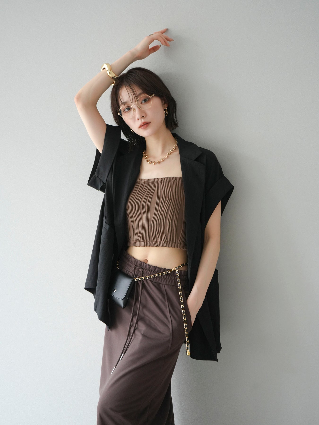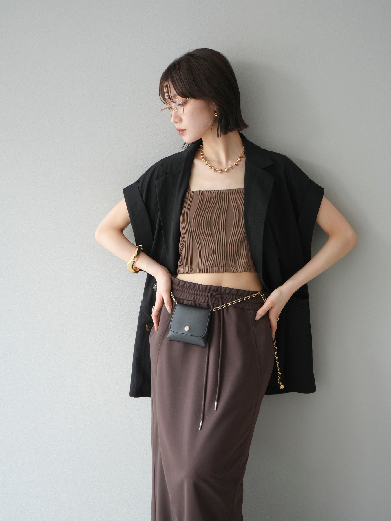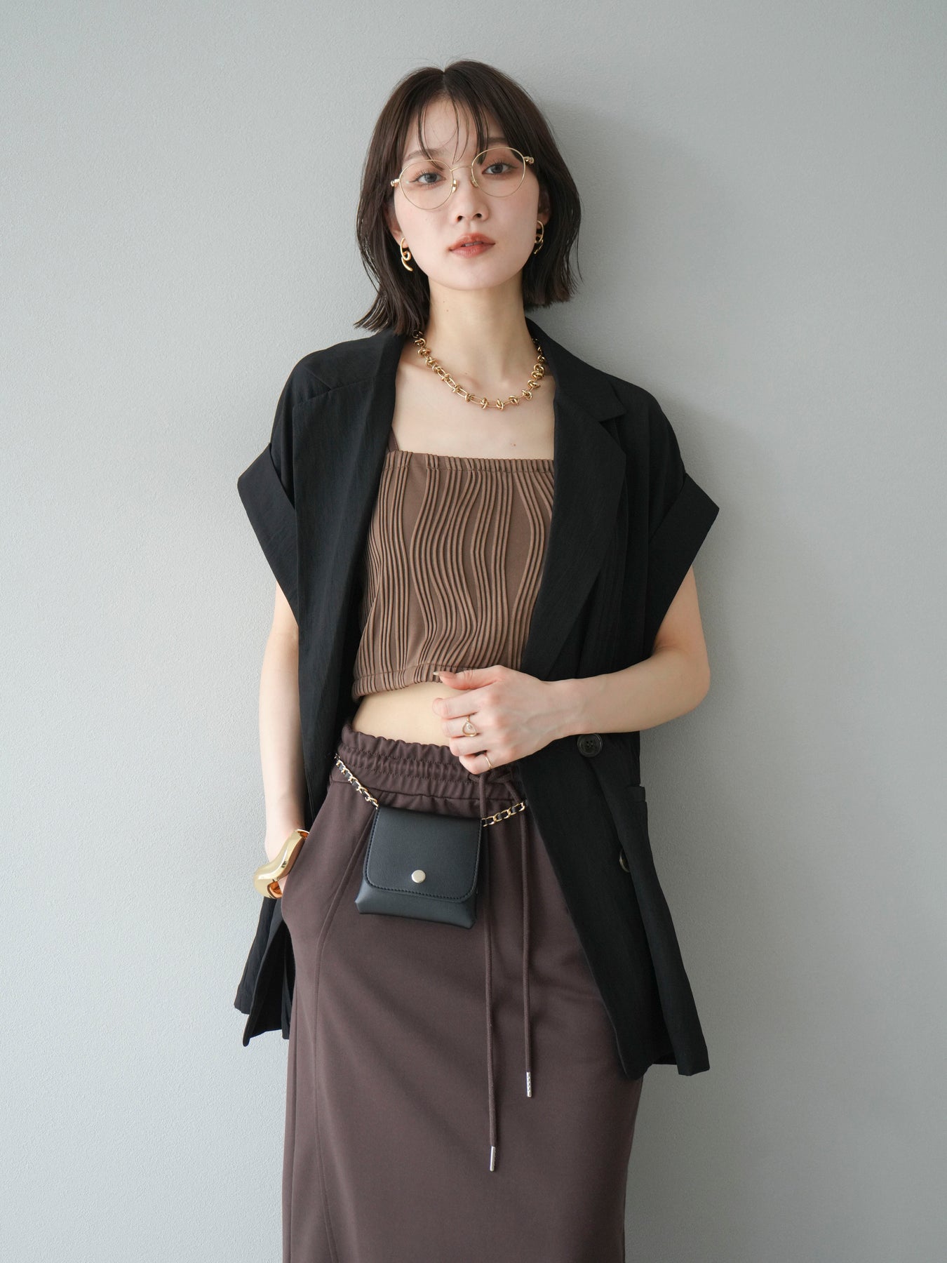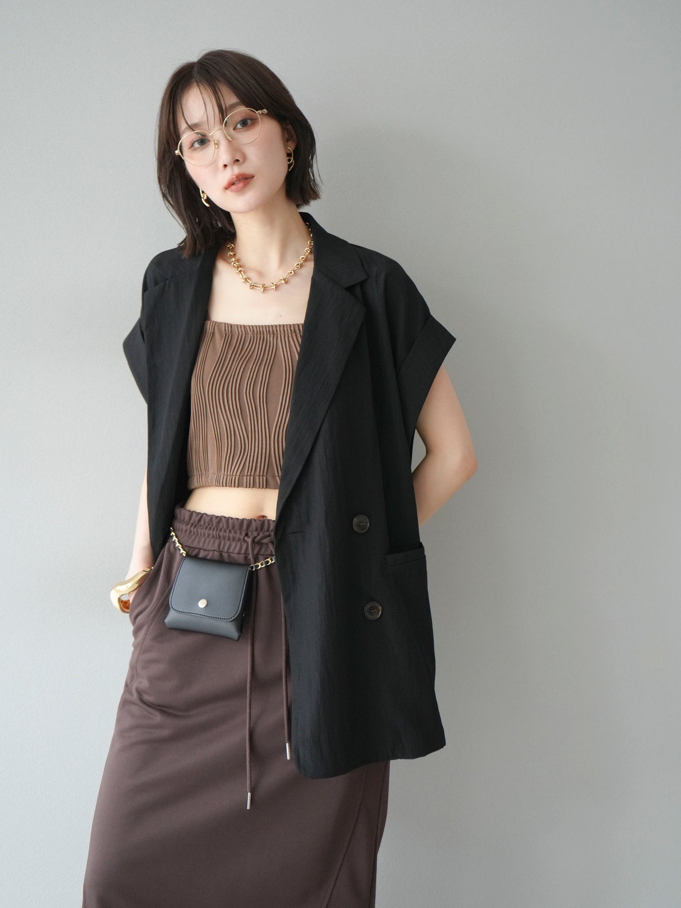 [SET]リネンライクノースリーブダブルジレ+ウェーブパイピングカップ付ベアキャミソール(2set)