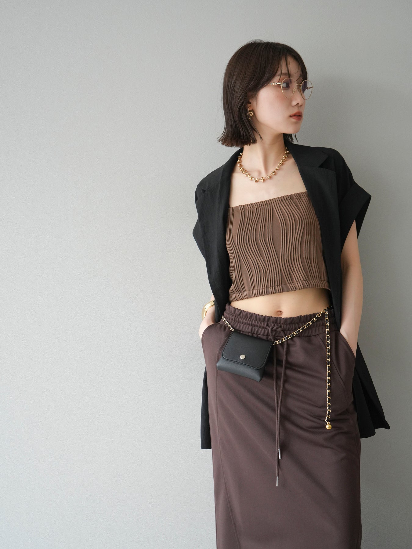 立体的なウェーブ状のパイピングデザインが目を引く、ウェーブパイピングカップ付ベアキャミソール。モード感漂う凹凸素材が身体に程よくフィットし、単品でもインナーとしても着映える仕上がりです。カップ付きで1枚での着用も可能、背中側はゴム仕様で快適なフィット感がありつつもずれにくいのが嬉しいポイント。華奢なストラップが女性らしく、キャミワンピやシアートップスとのレイヤードにもおすすめです。アクセ感覚で取り入れられる、夏のスタイリングのアクセントになる一枚。 ※ボトムス、キャミソール(インナー)以外の商品は一律でインナーは付属していません。