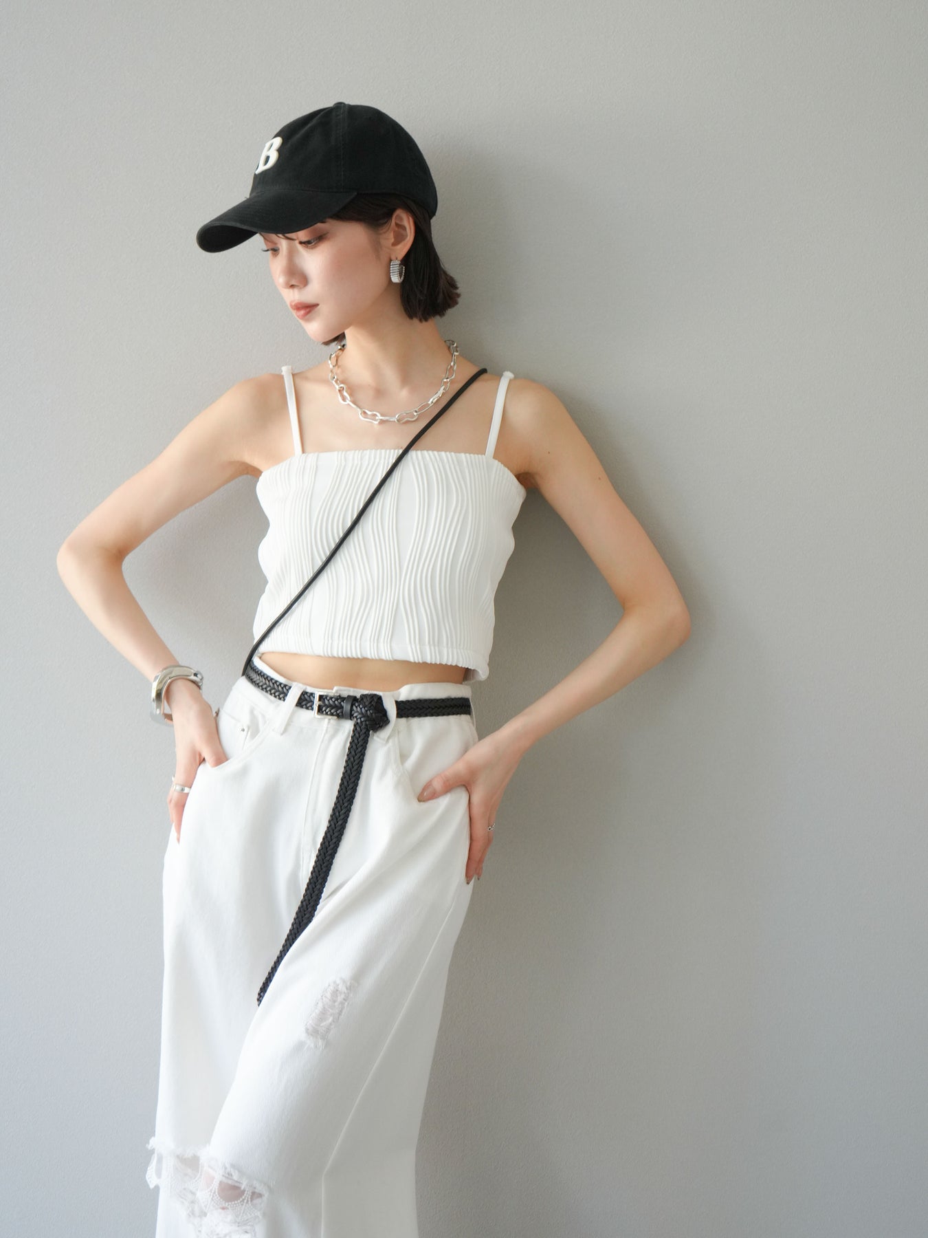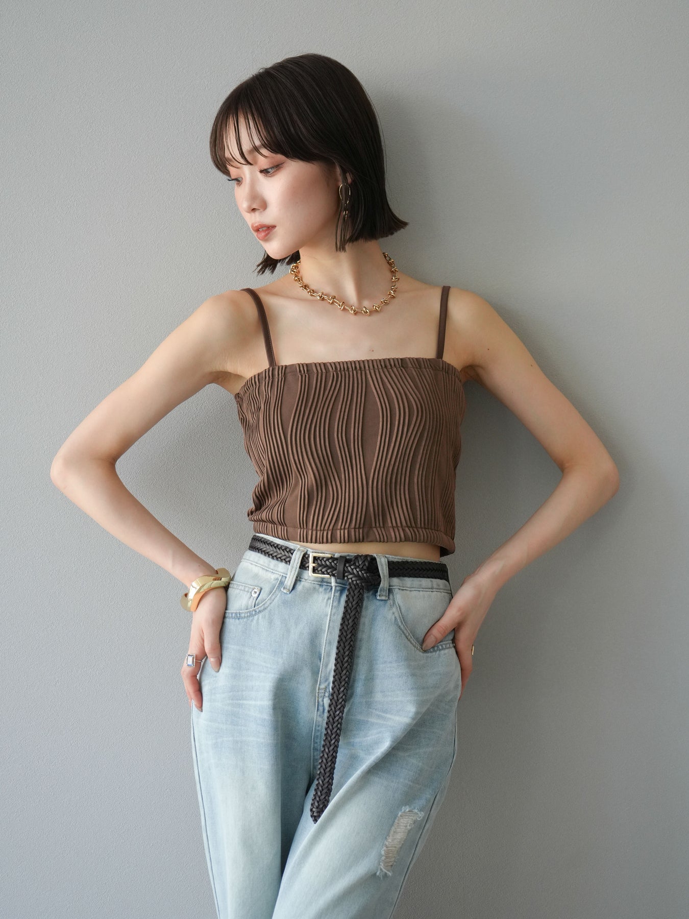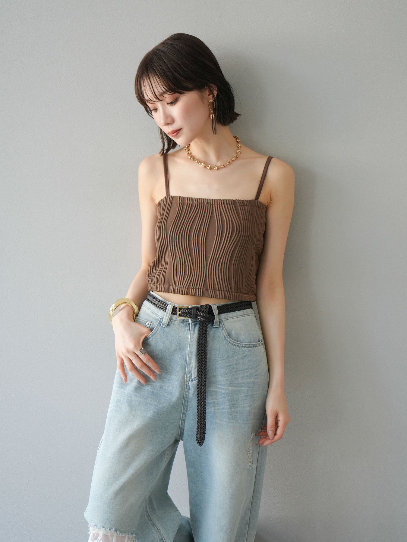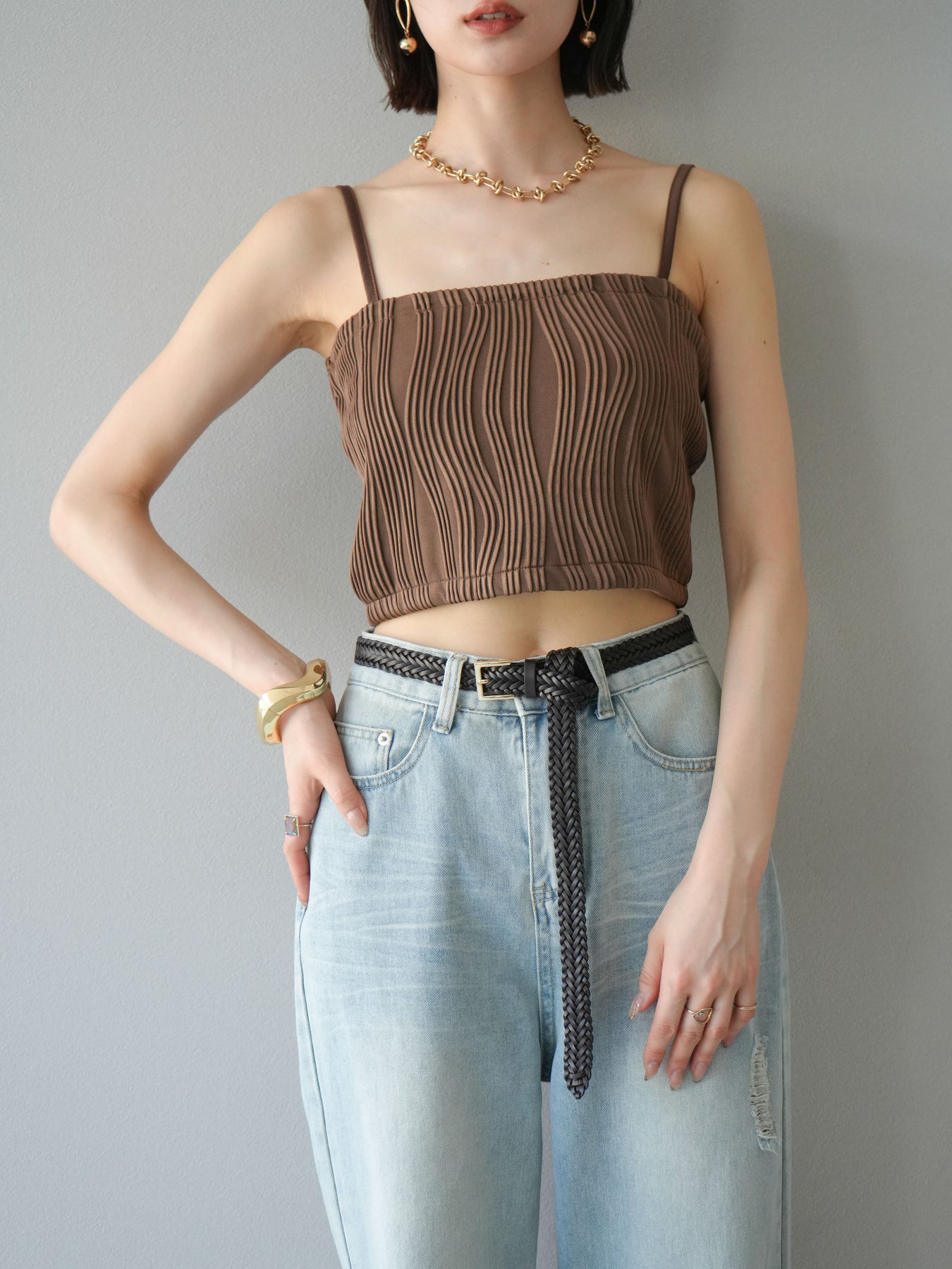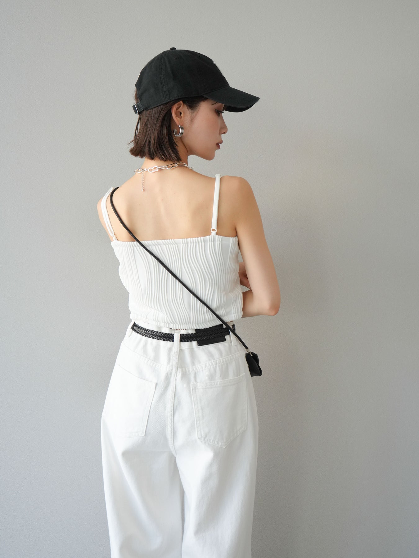 立体的なウェーブ状のパイピングデザインが目を引く、ウェーブパイピングカップ付ベアキャミソール。モード感漂う凹凸素材が身体に程よくフィットし、単品でもインナーとしても着映える仕上がりです。カップ付きで1枚での着用も可能、背中側はゴム仕様で快適なフィット感がありつつもずれにくいのが嬉しいポイント。華奢なストラップが女性らしく、キャミワンピやシアートップスとのレイヤードにもおすすめです。アクセ感覚で取り入れられる、夏のスタイリングのアクセントになる一枚。 ※ボトムス、キャミソール(インナー)以外の商品は一律でインナーは付属していません。