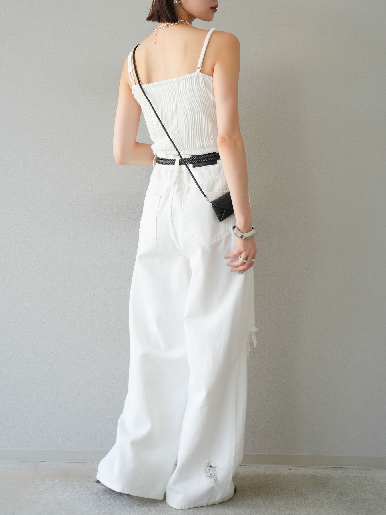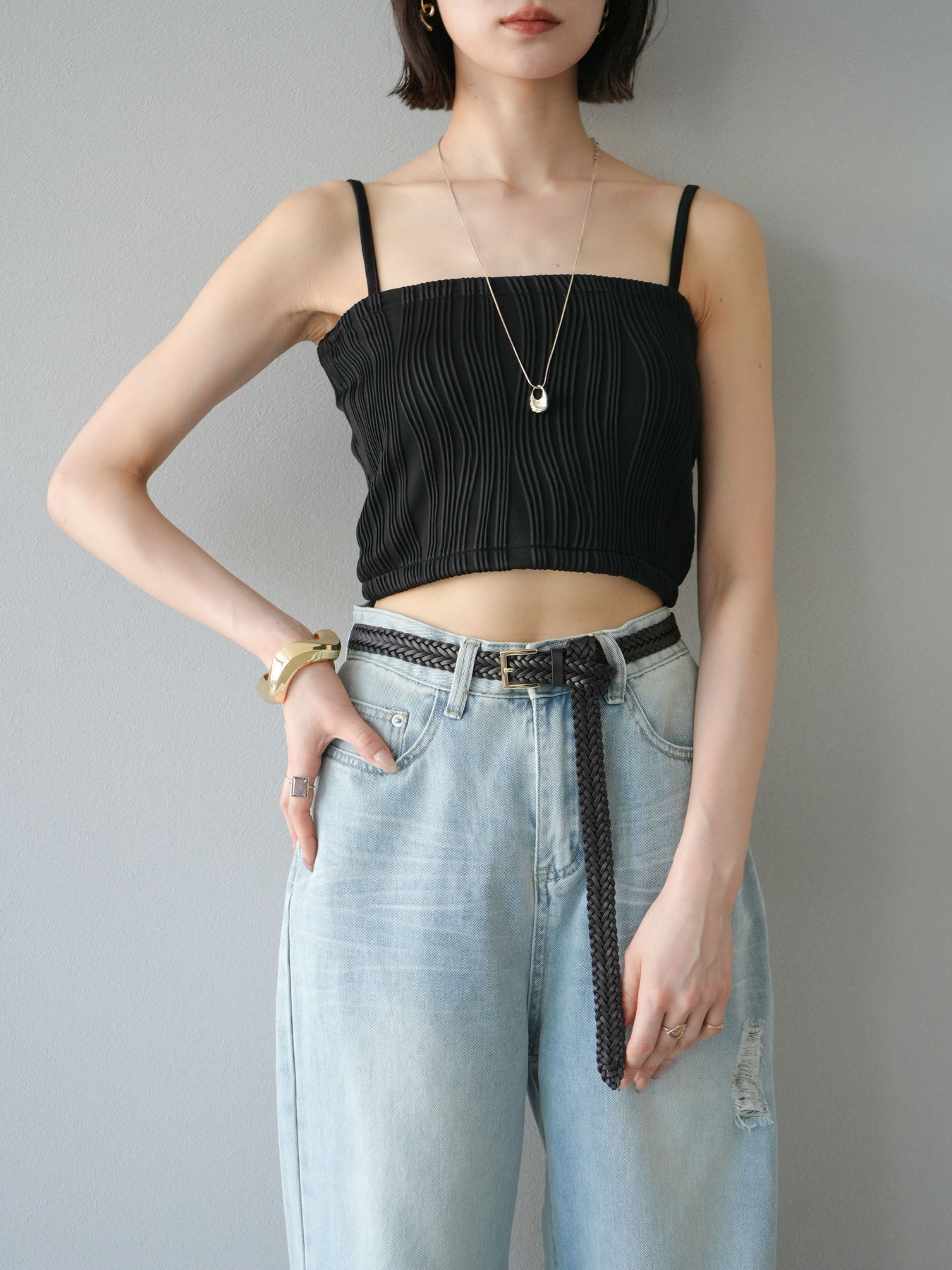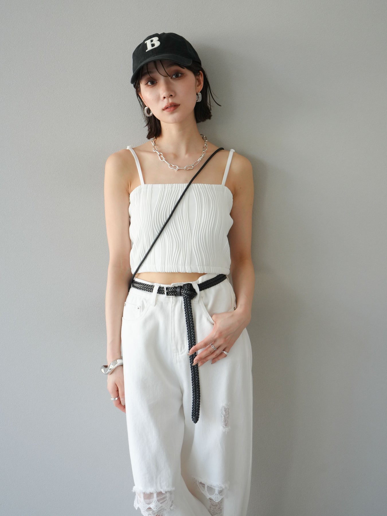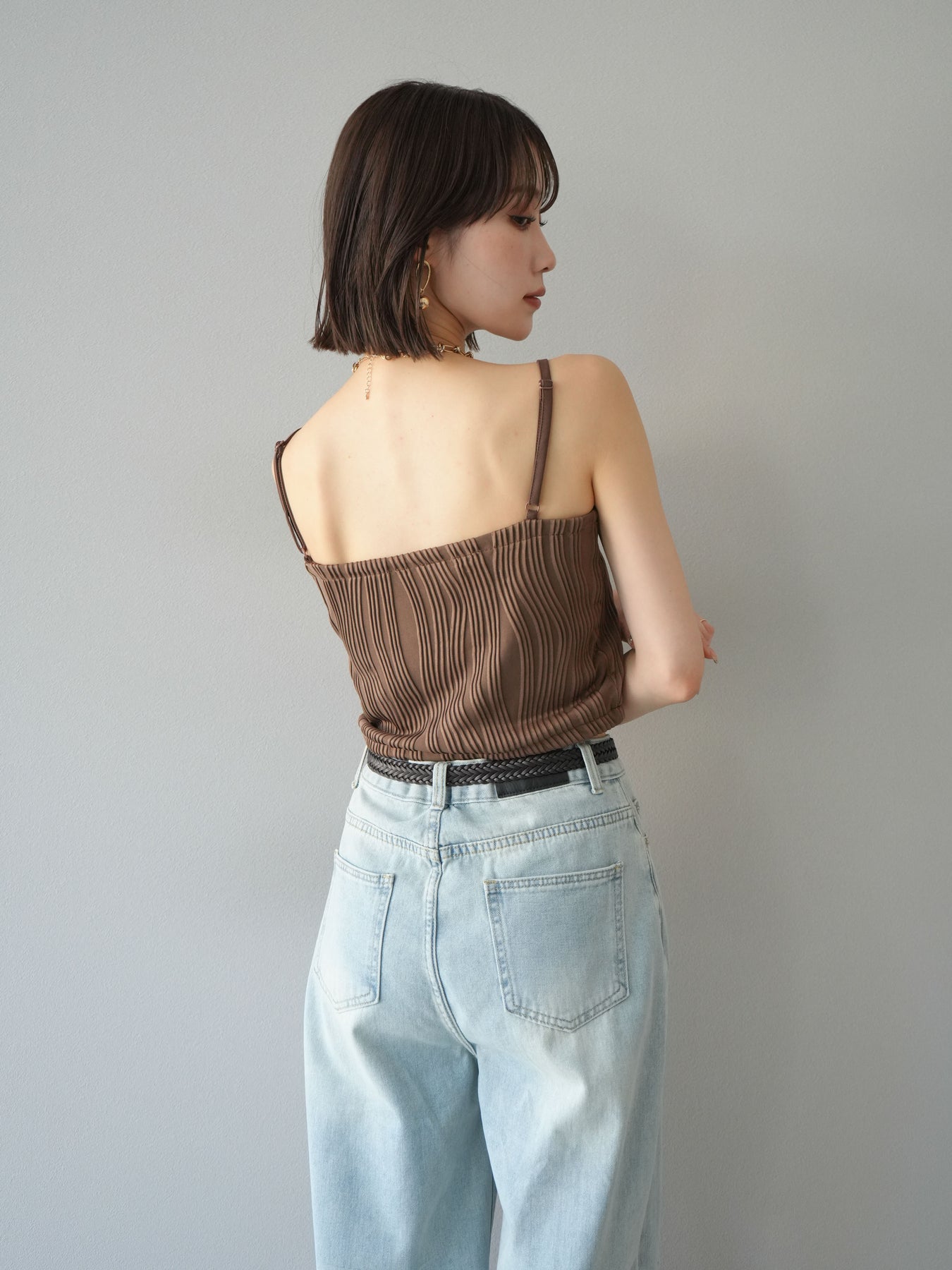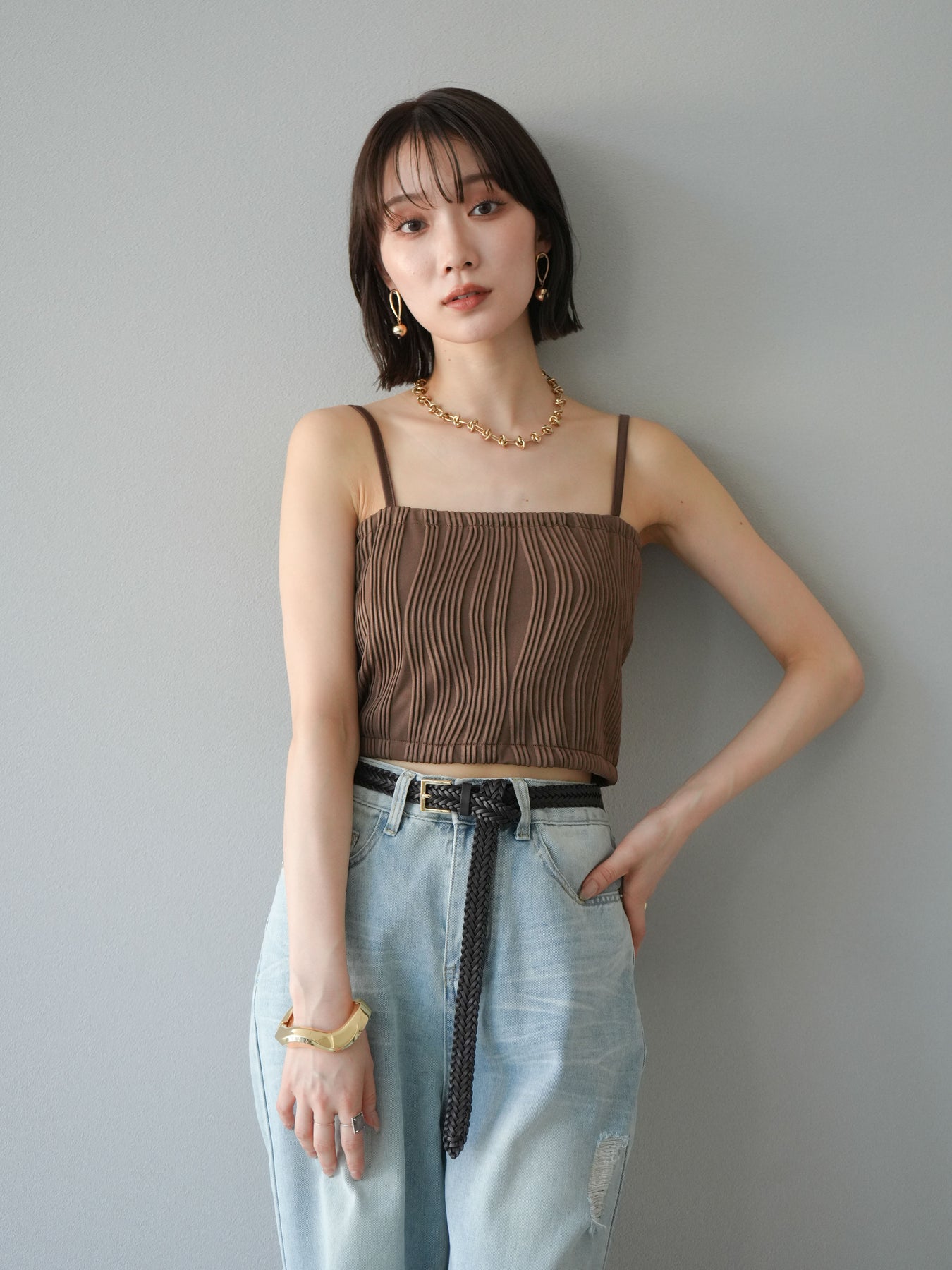 立体的なウェーブ状のパイピングデザインが目を引く、ウェーブパイピングカップ付ベアキャミソール。モード感漂う凹凸素材が身体に程よくフィットし、単品でもインナーとしても着映える仕上がりです。カップ付きで1枚での着用も可能、背中側はゴム仕様で快適なフィット感がありつつもずれにくいのが嬉しいポイント。華奢なストラップが女性らしく、キャミワンピやシアートップスとのレイヤードにもおすすめです。アクセ感覚で取り入れられる、夏のスタイリングのアクセントになる一枚。 ※ボトムス、キャミソール(インナー)以外の商品は一律でインナーは付属していません。