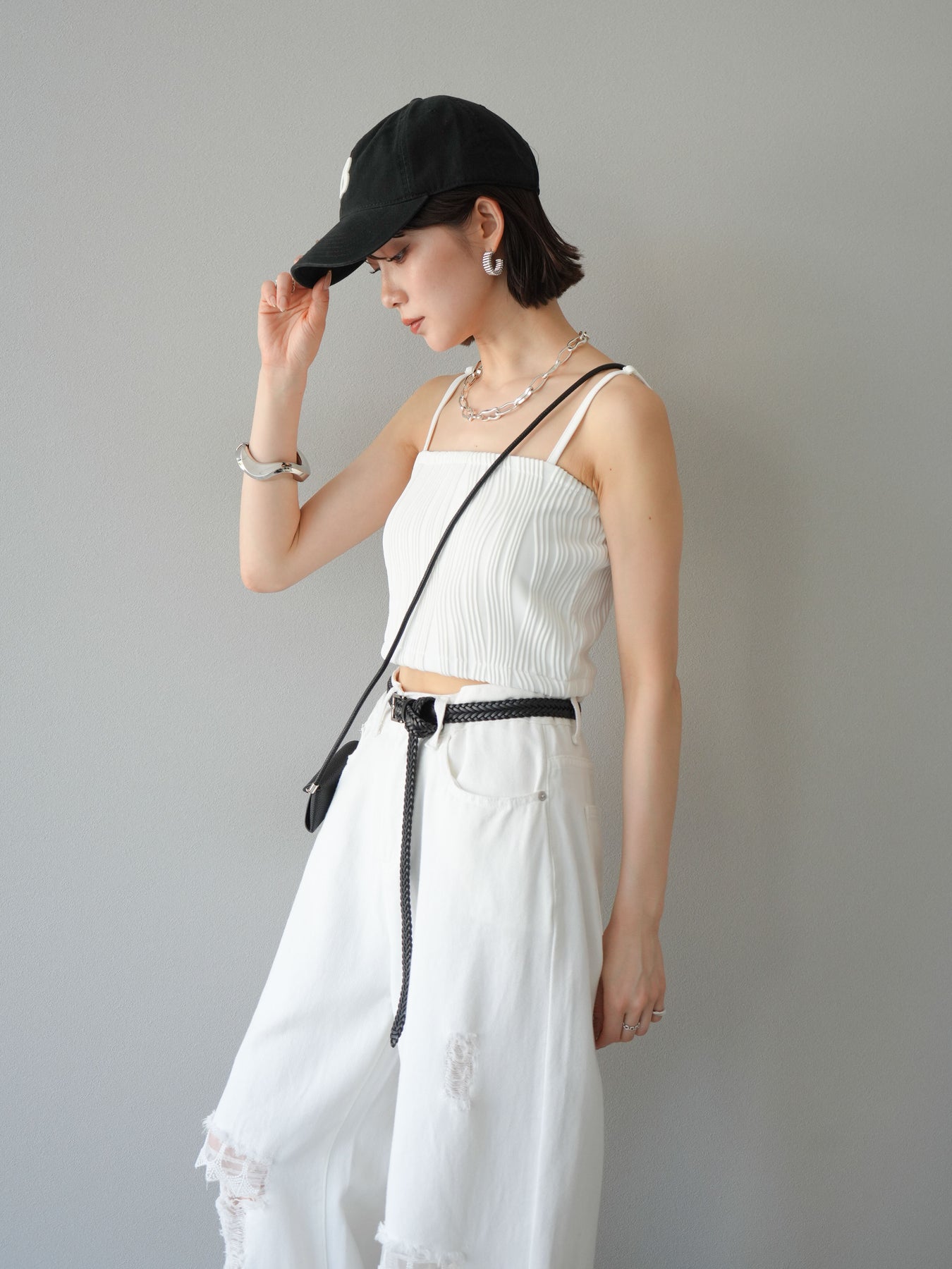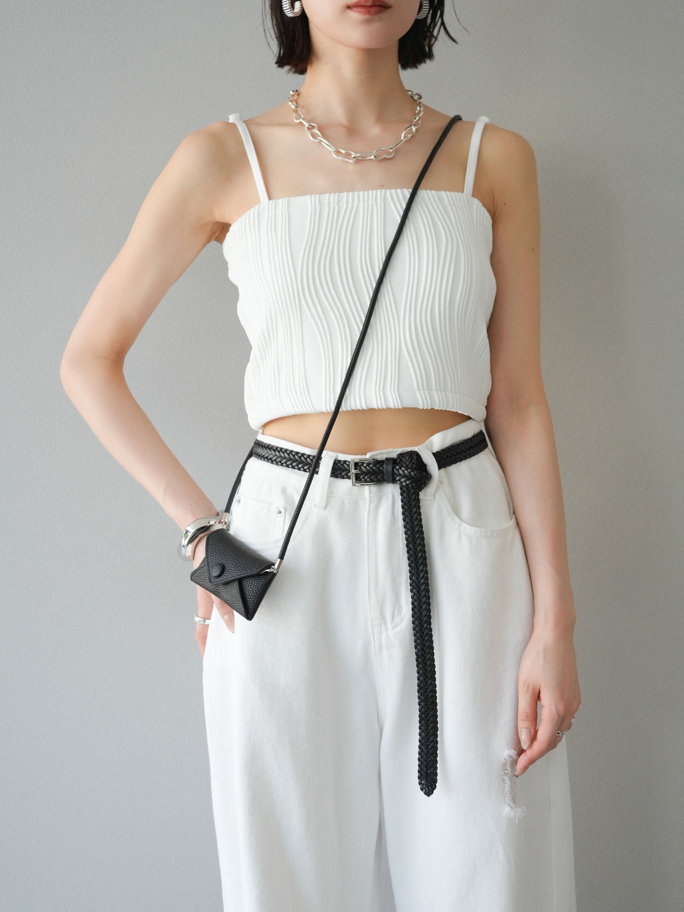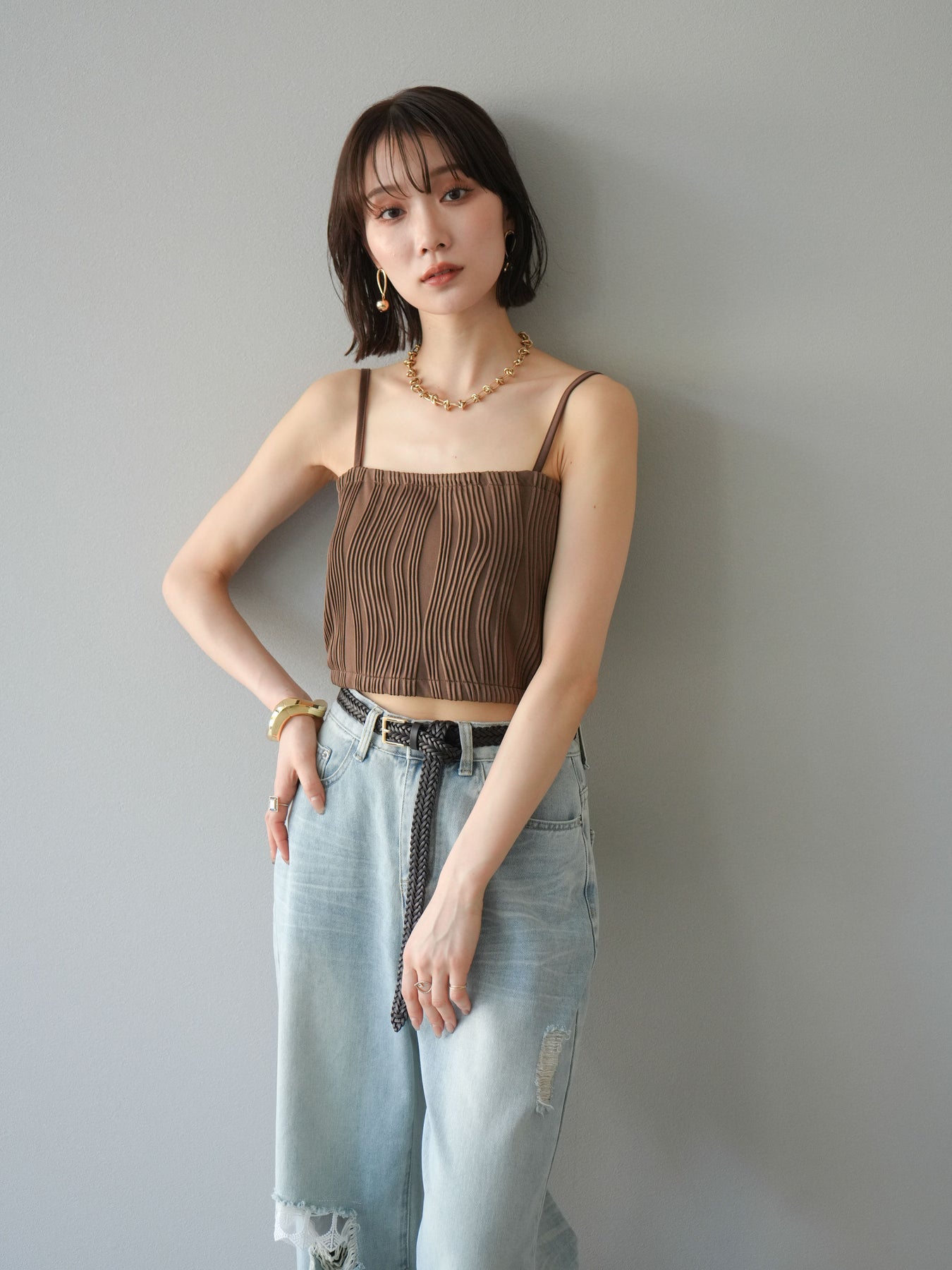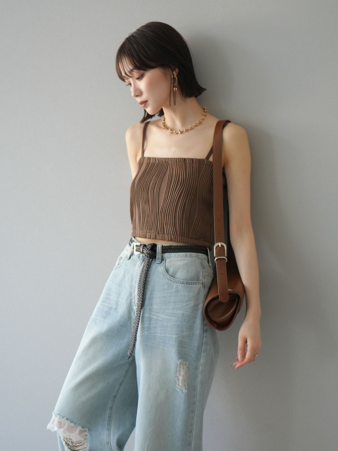 立体的なウェーブ状のパイピングデザインが目を引く、ウェーブパイピングカップ付ベアキャミソール。モード感漂う凹凸素材が身体に程よくフィットし、単品でもインナーとしても着映える仕上がりです。カップ付きで1枚での着用も可能、背中側はゴム仕様で快適なフィット感がありつつもずれにくいのが嬉しいポイント。華奢なストラップが女性らしく、キャミワンピやシアートップスとのレイヤードにもおすすめです。アクセ感覚で取り入れられる、夏のスタイリングのアクセントになる一枚。 ※ボトムス、キャミソール(インナー)以外の商品は一律でインナーは付属していません。