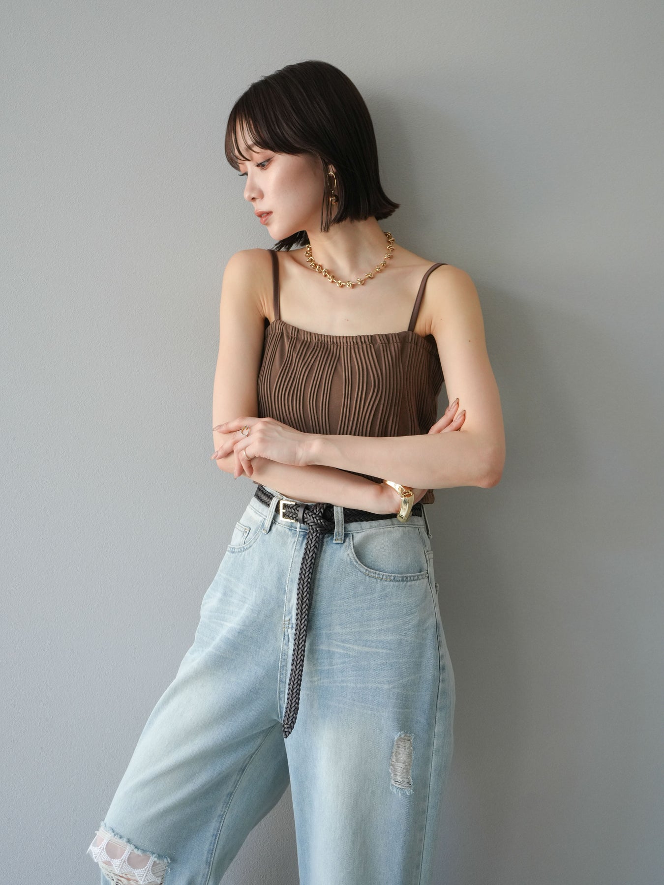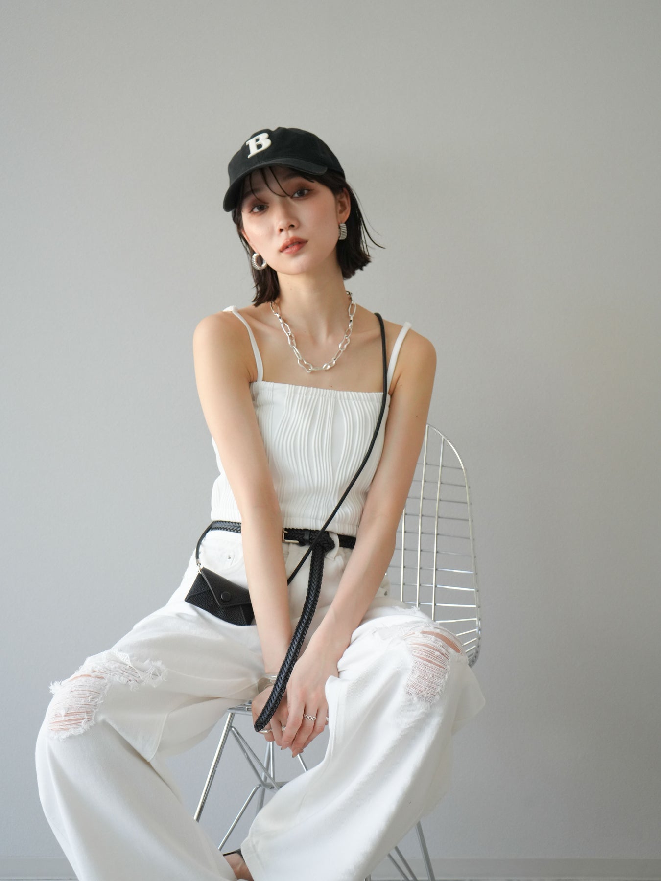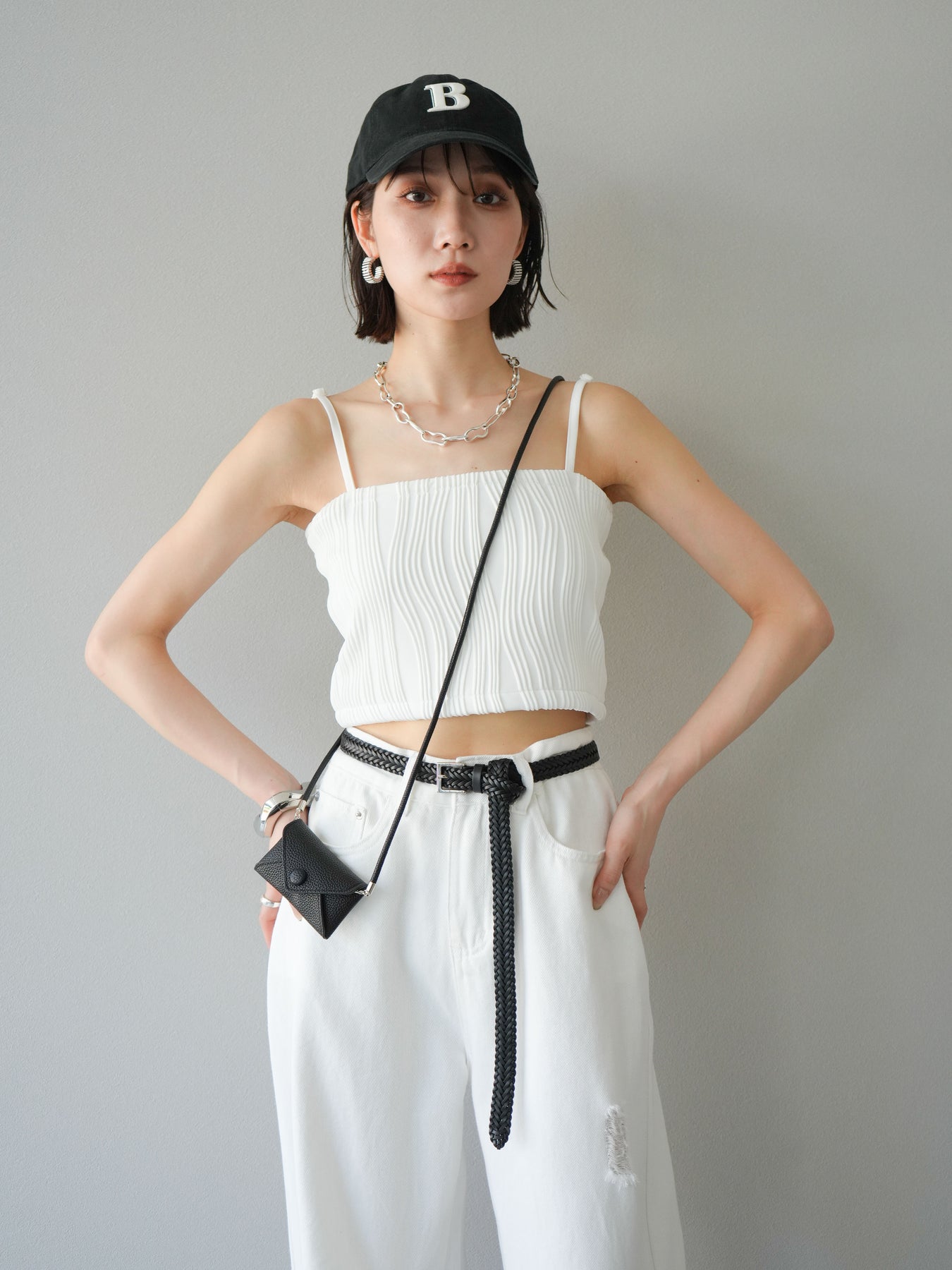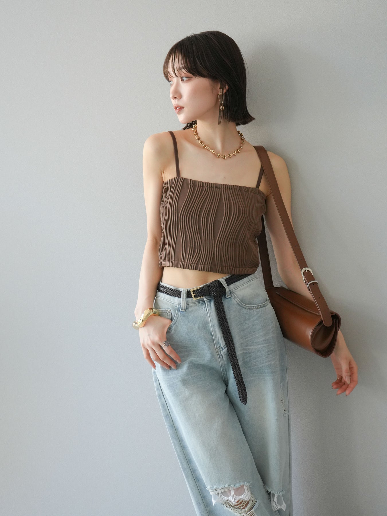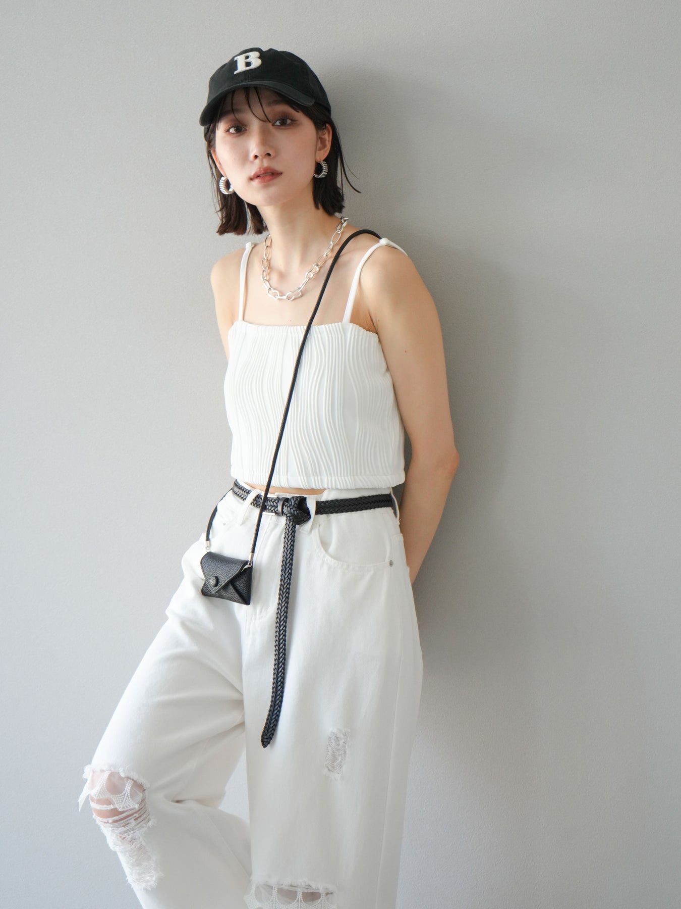 立体的なウェーブ状のパイピングデザインが目を引く、ウェーブパイピングカップ付ベアキャミソール。モード感漂う凹凸素材が身体に程よくフィットし、単品でもインナーとしても着映える仕上がりです。カップ付きで1枚での着用も可能、背中側はゴム仕様で快適なフィット感がありつつもずれにくいのが嬉しいポイント。華奢なストラップが女性らしく、キャミワンピやシアートップスとのレイヤードにもおすすめです。アクセ感覚で取り入れられる、夏のスタイリングのアクセントになる一枚。 ※ボトムス、キャミソール(インナー)以外の商品は一律でインナーは付属していません。