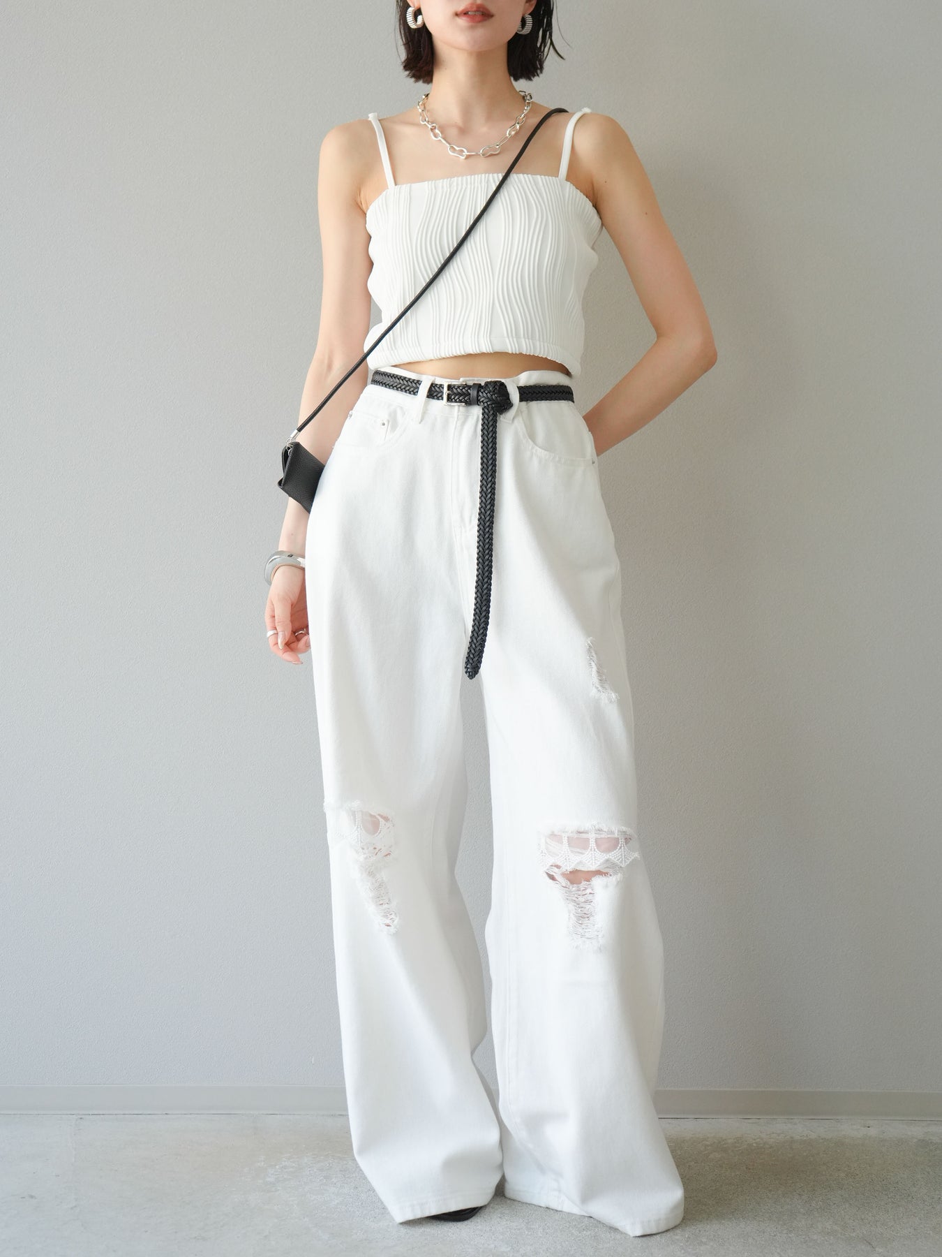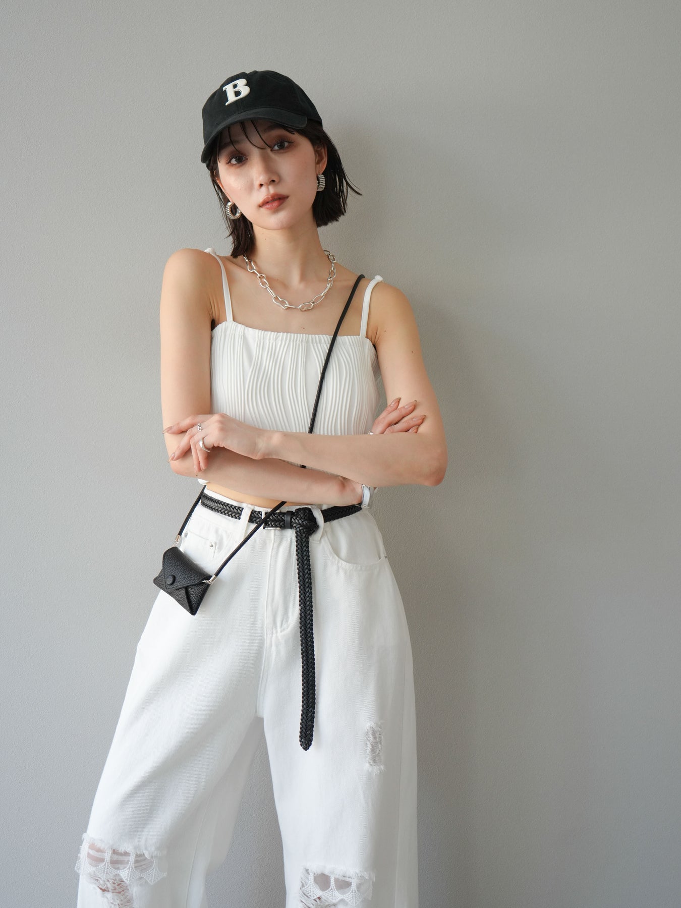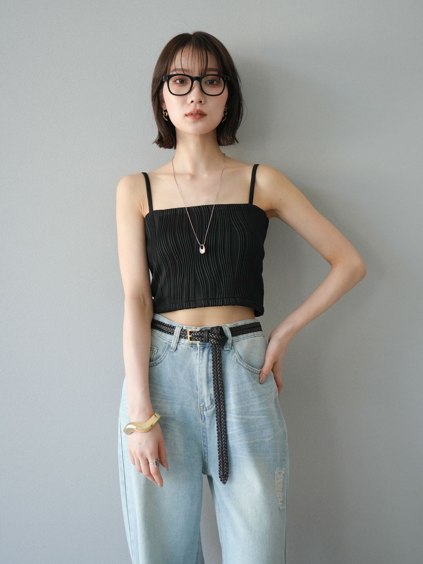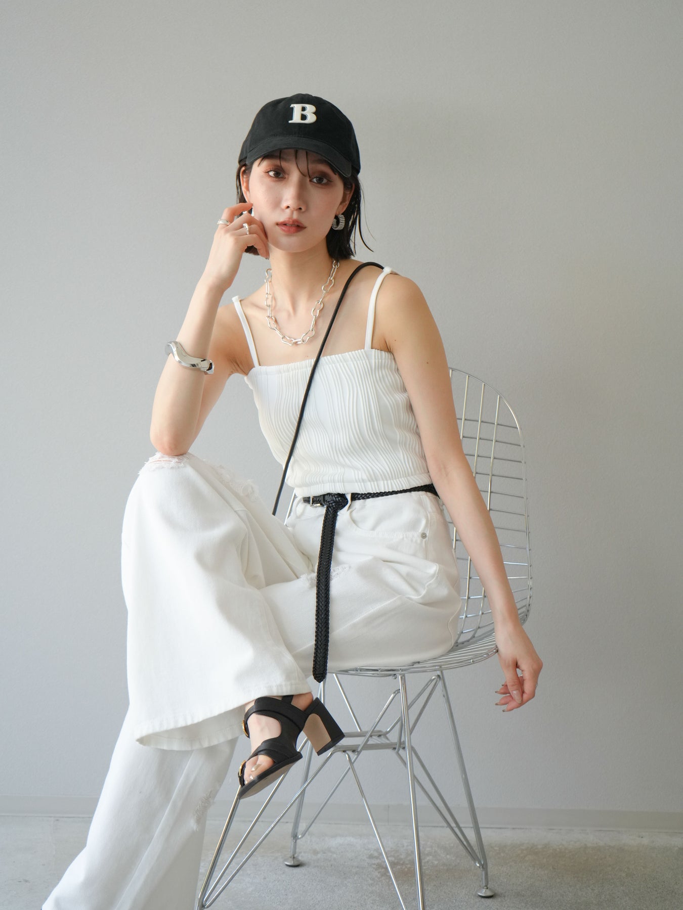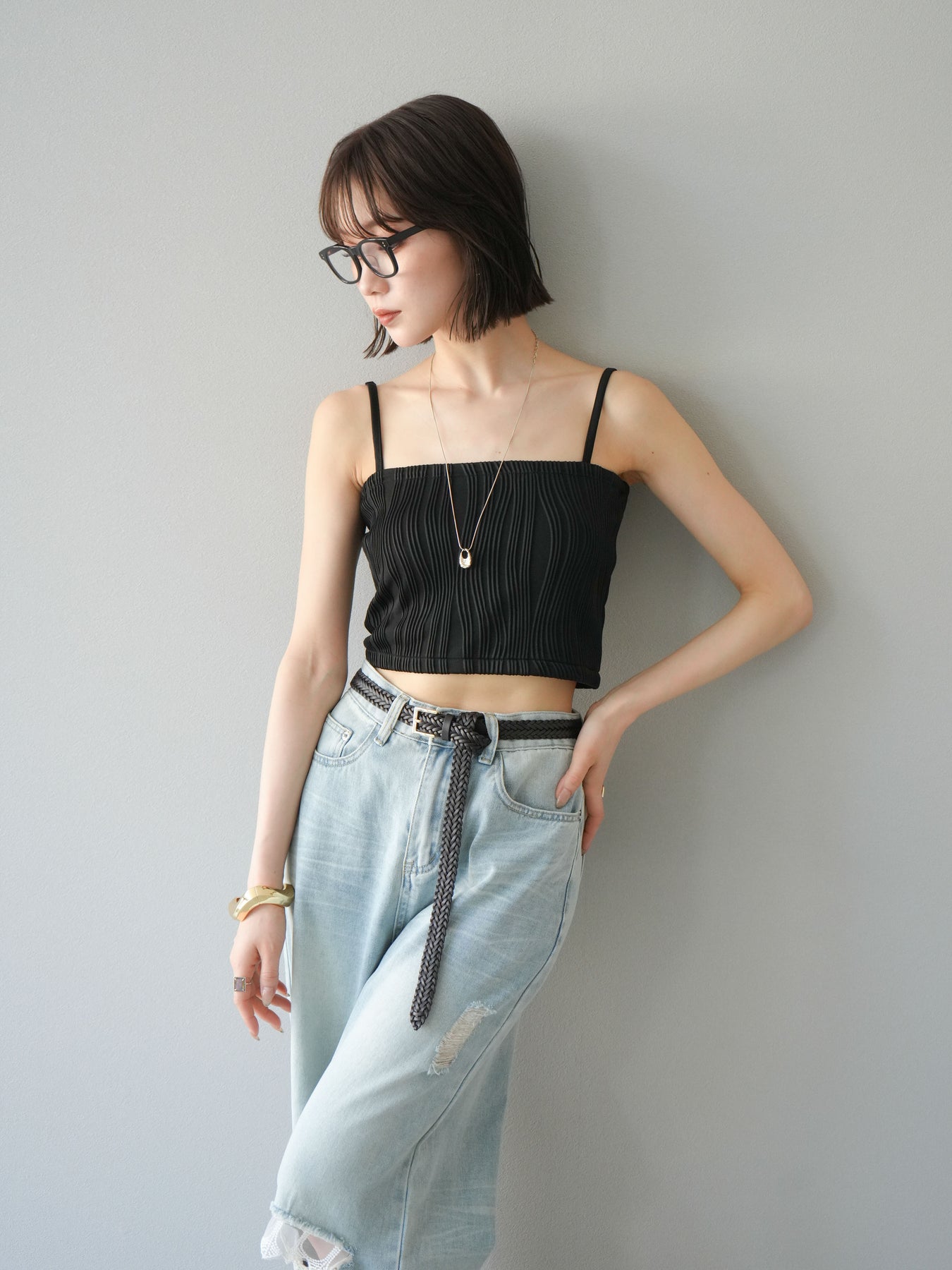 立体的なウェーブ状のパイピングデザインが目を引く、ウェーブパイピングカップ付ベアキャミソール。モード感漂う凹凸素材が身体に程よくフィットし、単品でもインナーとしても着映える仕上がりです。カップ付きで1枚での着用も可能、背中側はゴム仕様で快適なフィット感がありつつもずれにくいのが嬉しいポイント。華奢なストラップが女性らしく、キャミワンピやシアートップスとのレイヤードにもおすすめです。アクセ感覚で取り入れられる、夏のスタイリングのアクセントになる一枚。 ※ボトムス、キャミソール(インナー)以外の商品は一律でインナーは付属していません。