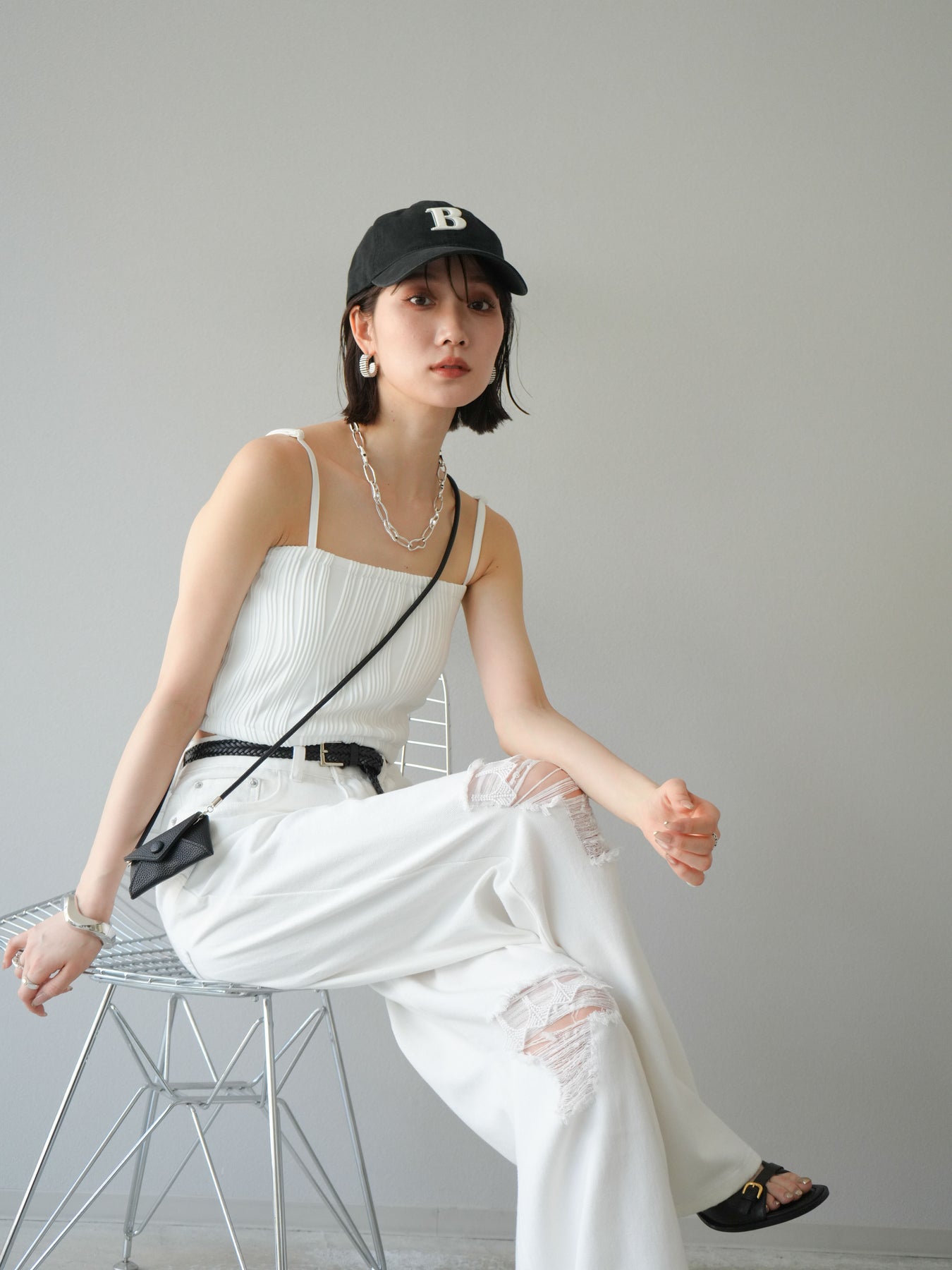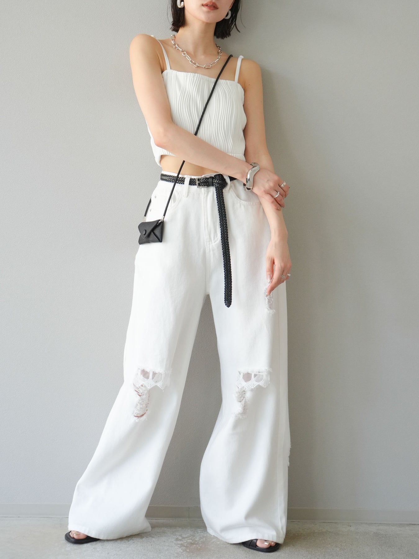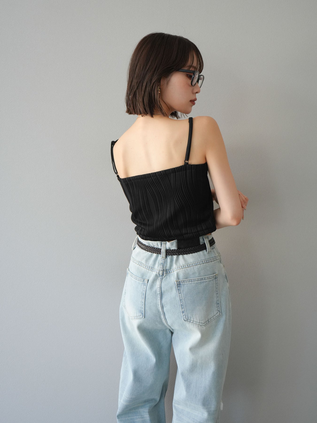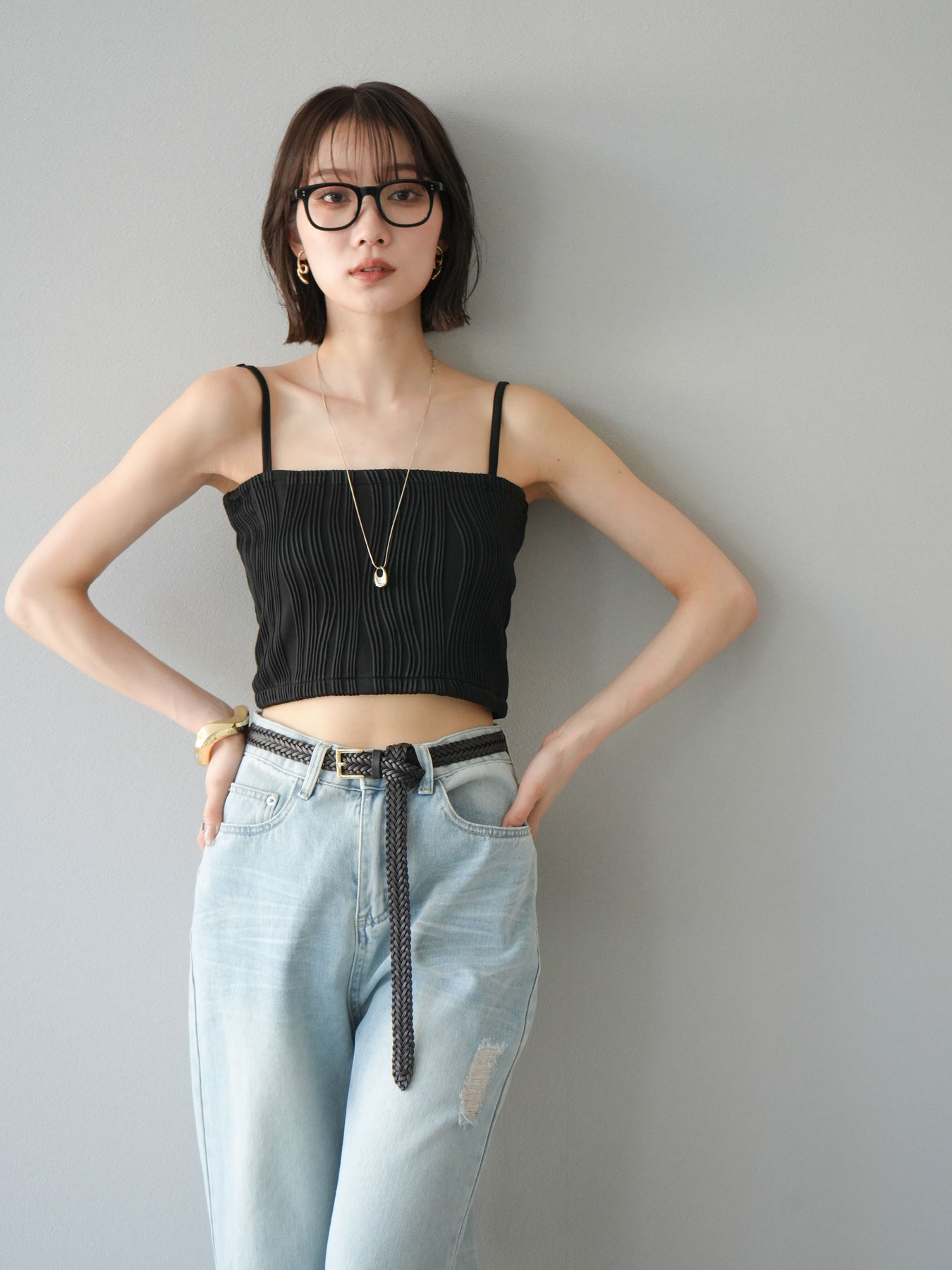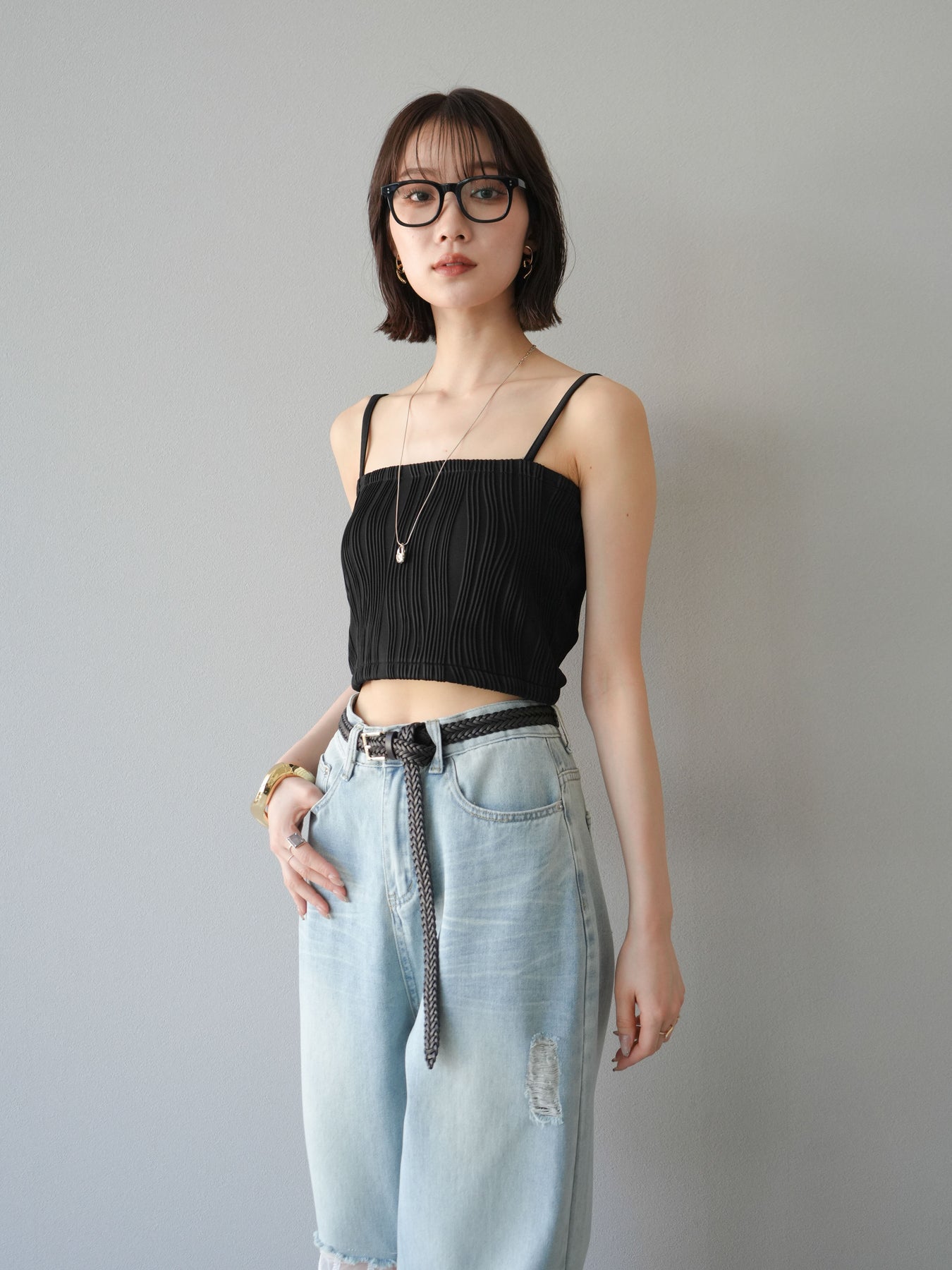 立体的なウェーブ状のパイピングデザインが目を引く、ウェーブパイピングカップ付ベアキャミソール。モード感漂う凹凸素材が身体に程よくフィットし、単品でもインナーとしても着映える仕上がりです。カップ付きで1枚での着用も可能、背中側はゴム仕様で快適なフィット感がありつつもずれにくいのが嬉しいポイント。華奢なストラップが女性らしく、キャミワンピやシアートップスとのレイヤードにもおすすめです。アクセ感覚で取り入れられる、夏のスタイリングのアクセントになる一枚。 ※ボトムス、キャミソール(インナー)以外の商品は一律でインナーは付属していません。