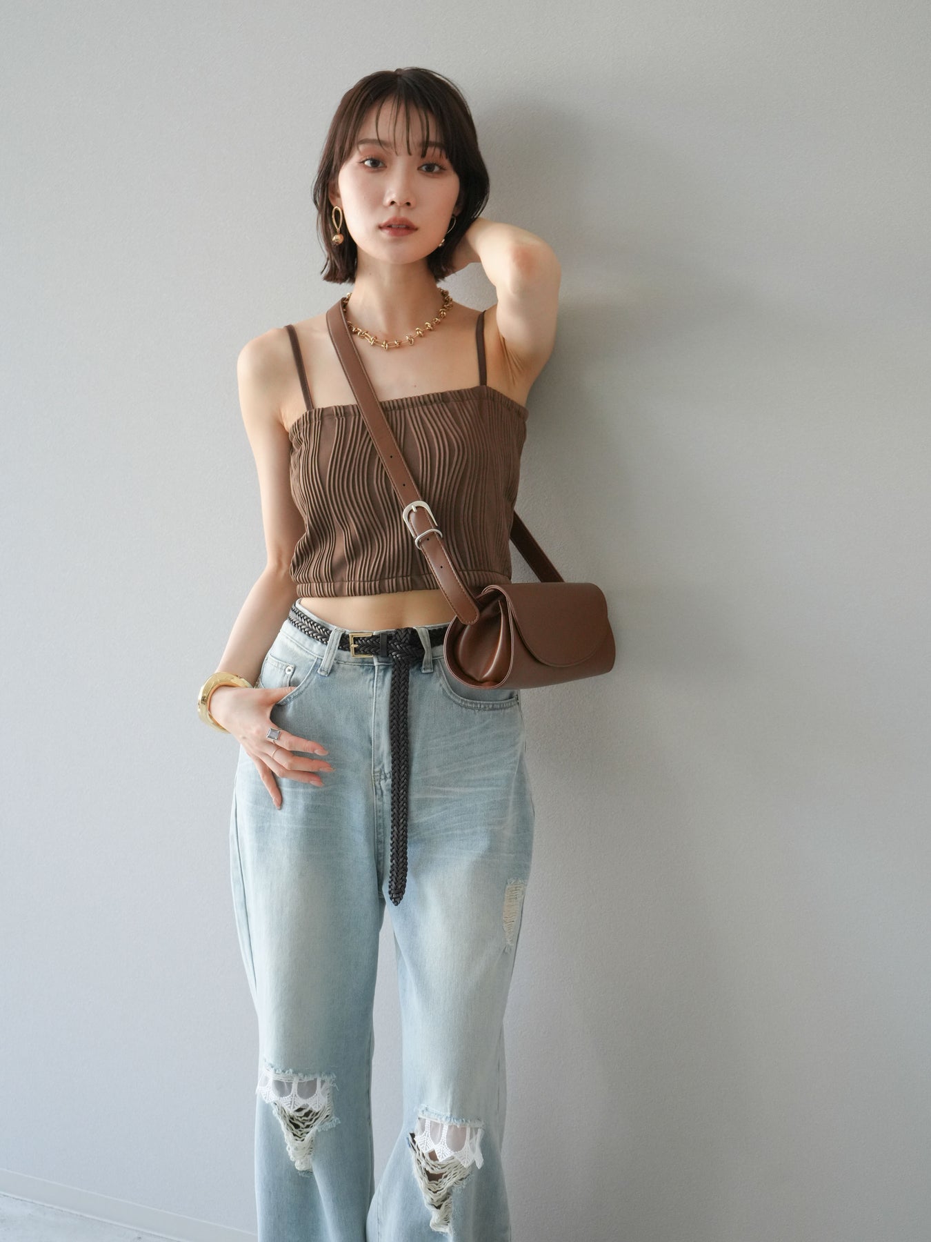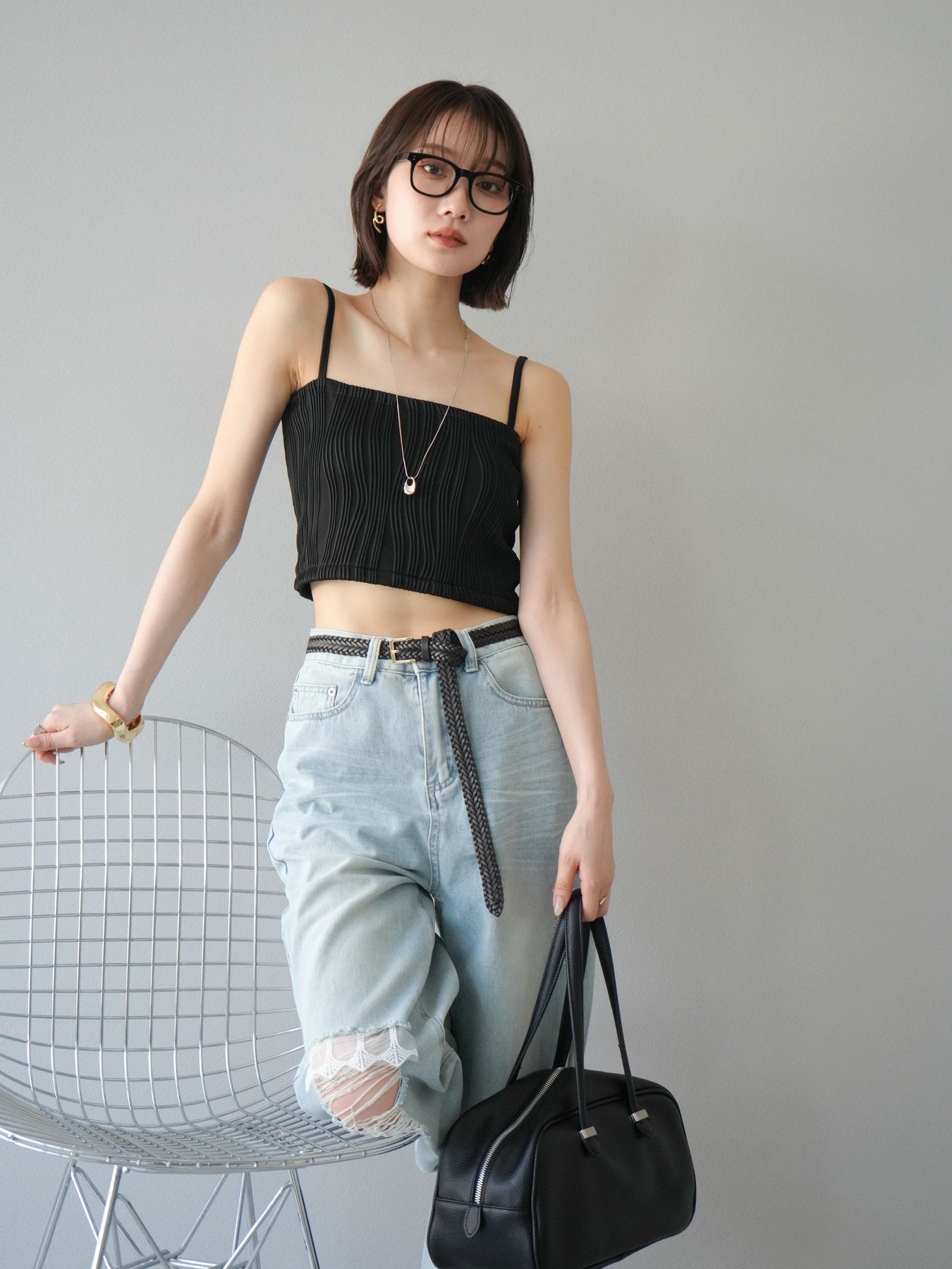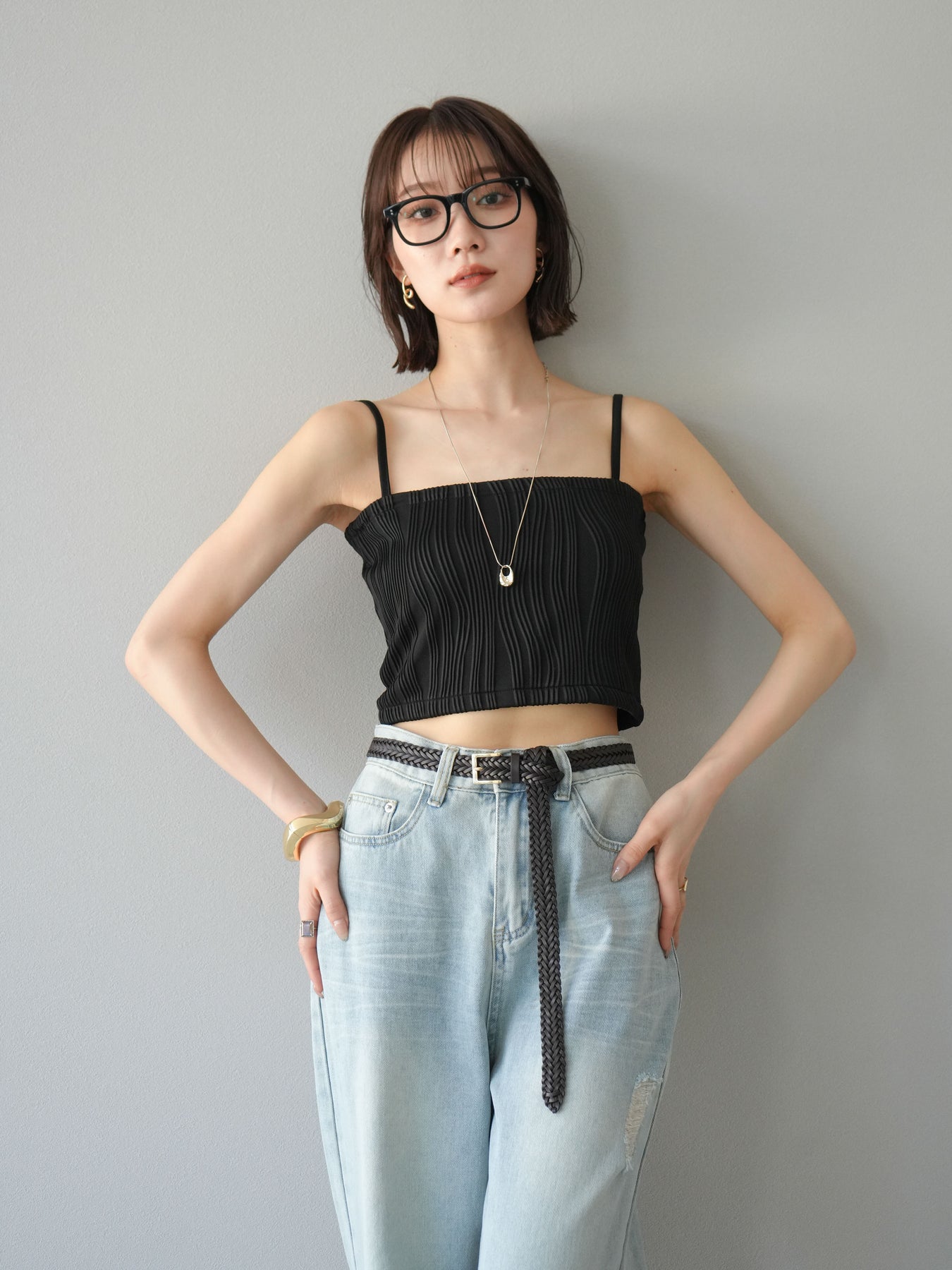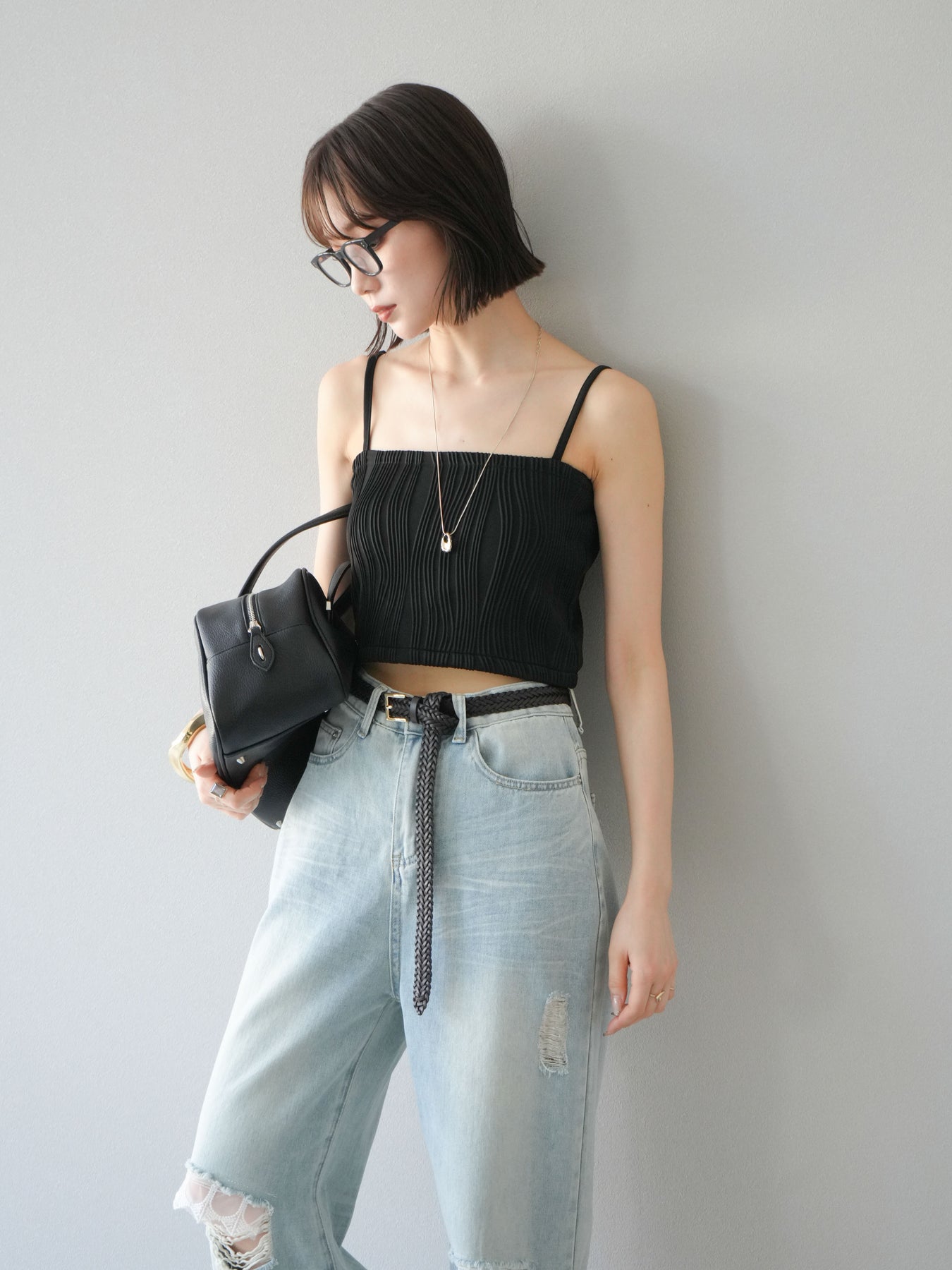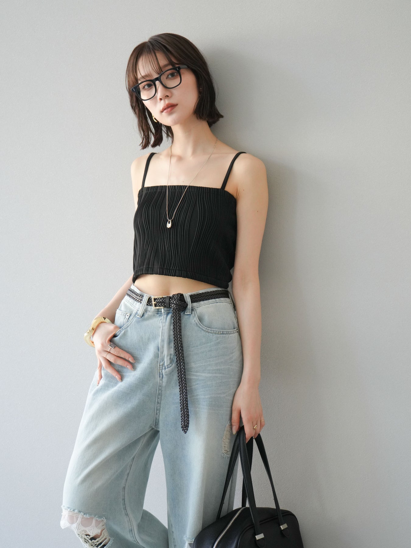 立体的なウェーブ状のパイピングデザインが目を引く、ウェーブパイピングカップ付ベアキャミソール。モード感漂う凹凸素材が身体に程よくフィットし、単品でもインナーとしても着映える仕上がりです。カップ付きで1枚での着用も可能、背中側はゴム仕様で快適なフィット感がありつつもずれにくいのが嬉しいポイント。華奢なストラップが女性らしく、キャミワンピやシアートップスとのレイヤードにもおすすめです。アクセ感覚で取り入れられる、夏のスタイリングのアクセントになる一枚。 ※ボトムス、キャミソール(インナー)以外の商品は一律でインナーは付属していません。