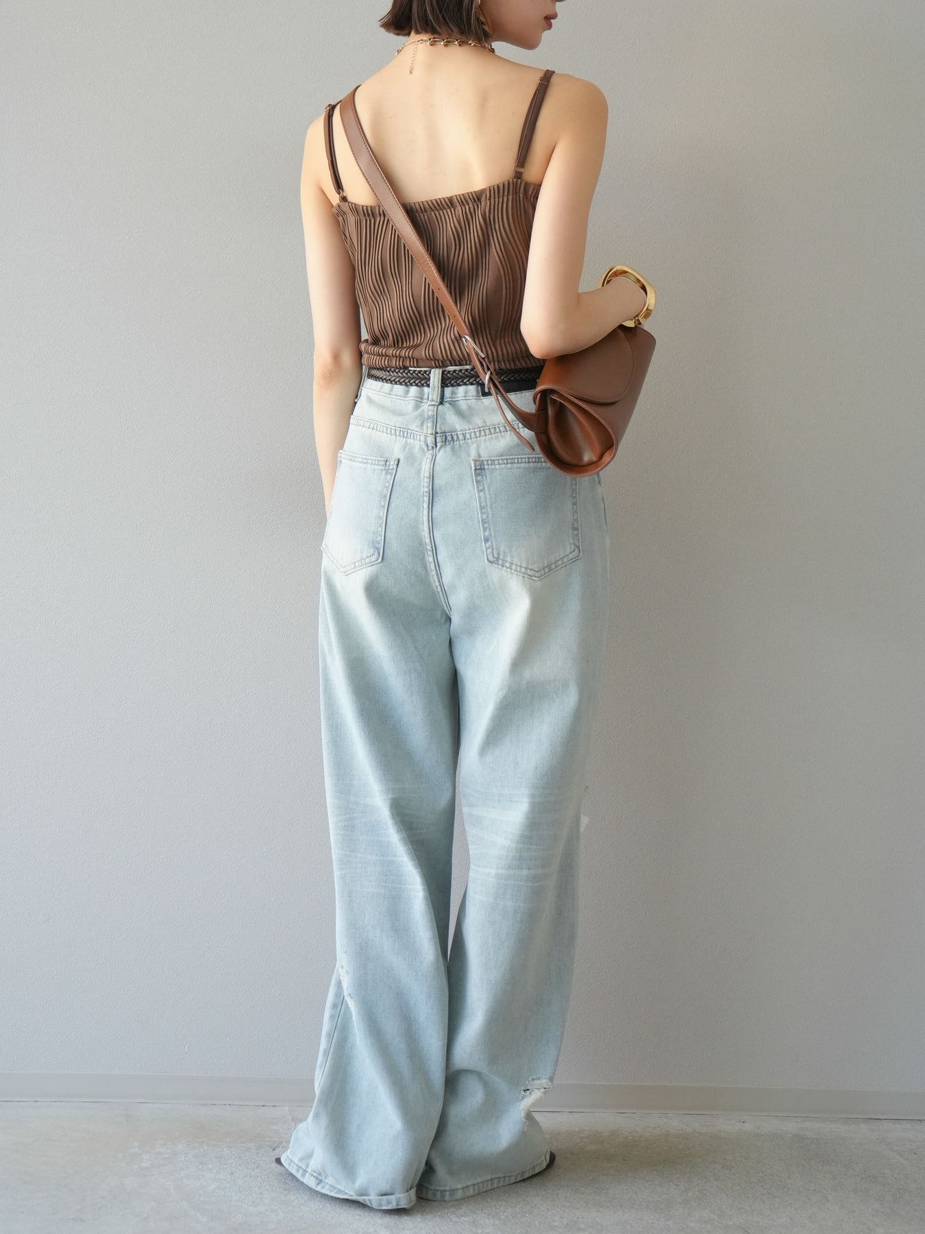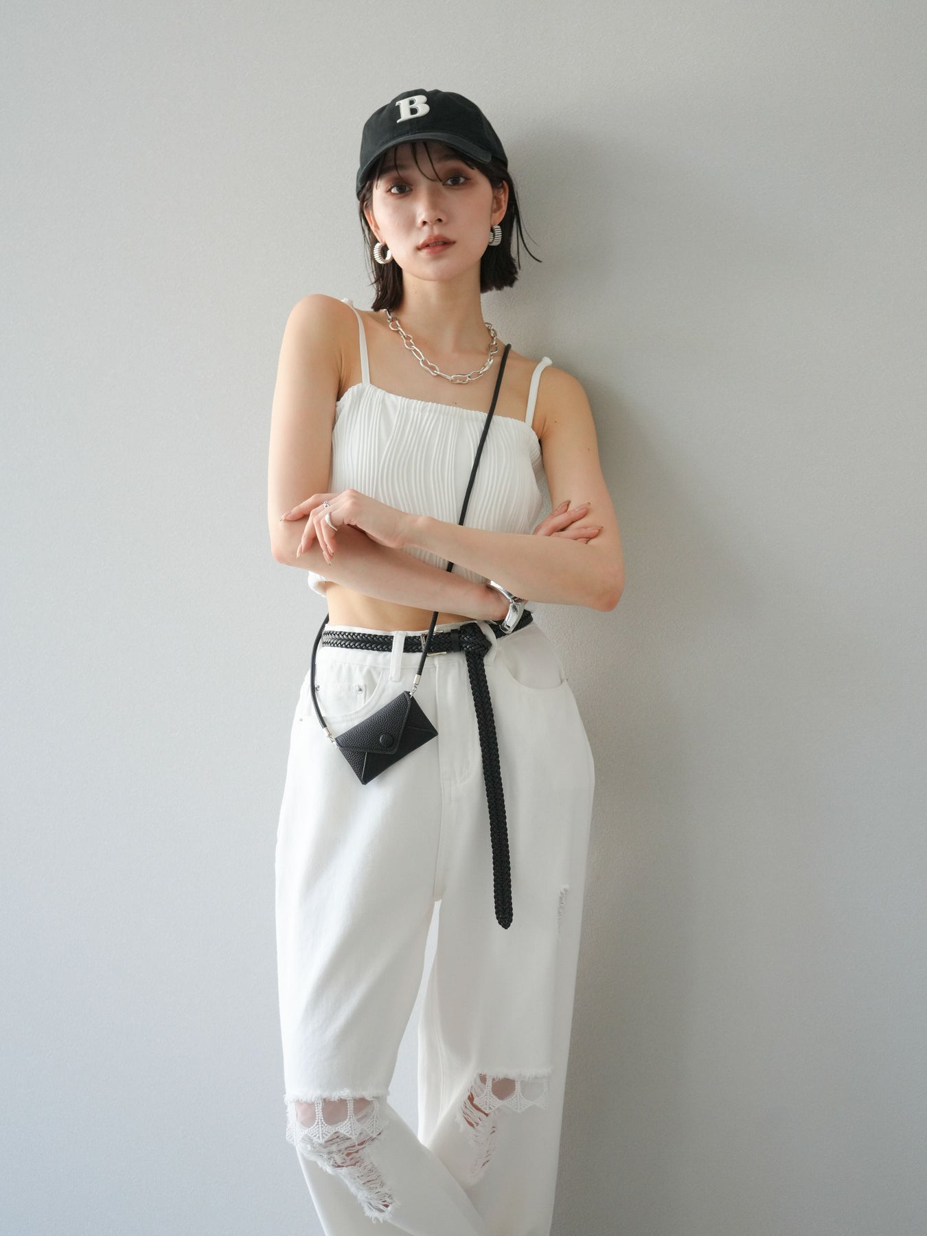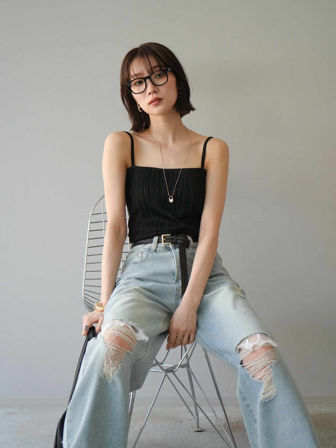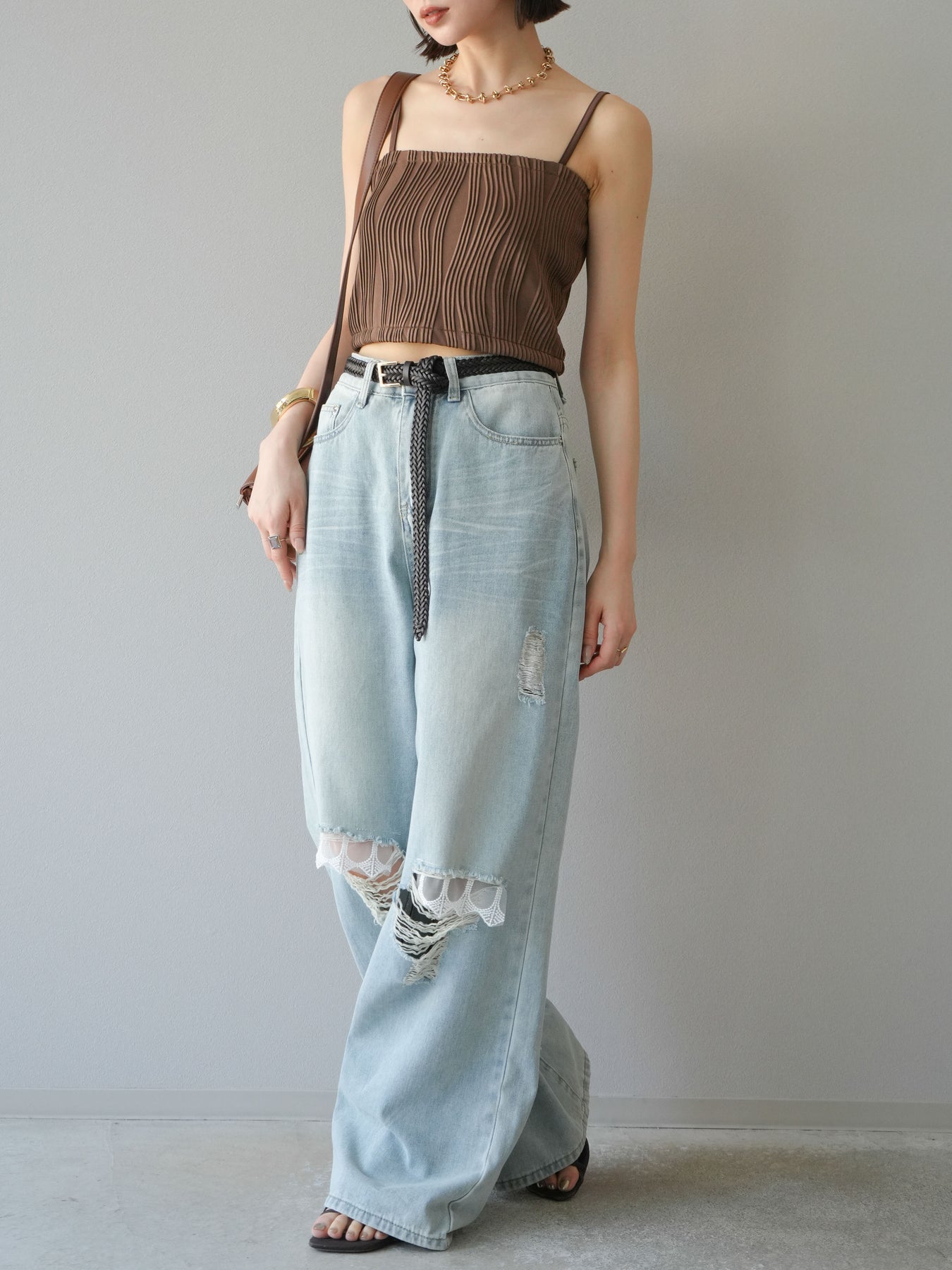 立体的なウェーブ状のパイピングデザインが目を引く、ウェーブパイピングカップ付ベアキャミソール。モード感漂う凹凸素材が身体に程よくフィットし、単品でもインナーとしても着映える仕上がりです。カップ付きで1枚での着用も可能、背中側はゴム仕様で快適なフィット感がありつつもずれにくいのが嬉しいポイント。華奢なストラップが女性らしく、キャミワンピやシアートップスとのレイヤードにもおすすめです。アクセ感覚で取り入れられる、夏のスタイリングのアクセントになる一枚。 ※ボトムス、キャミソール(インナー)以外の商品は一律でインナーは付属していません。