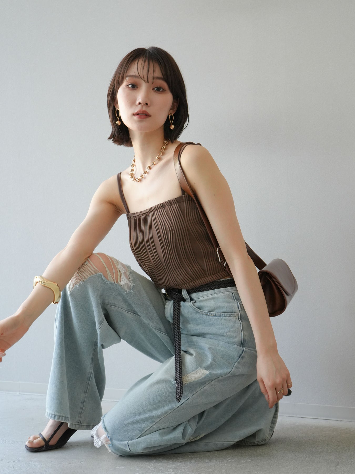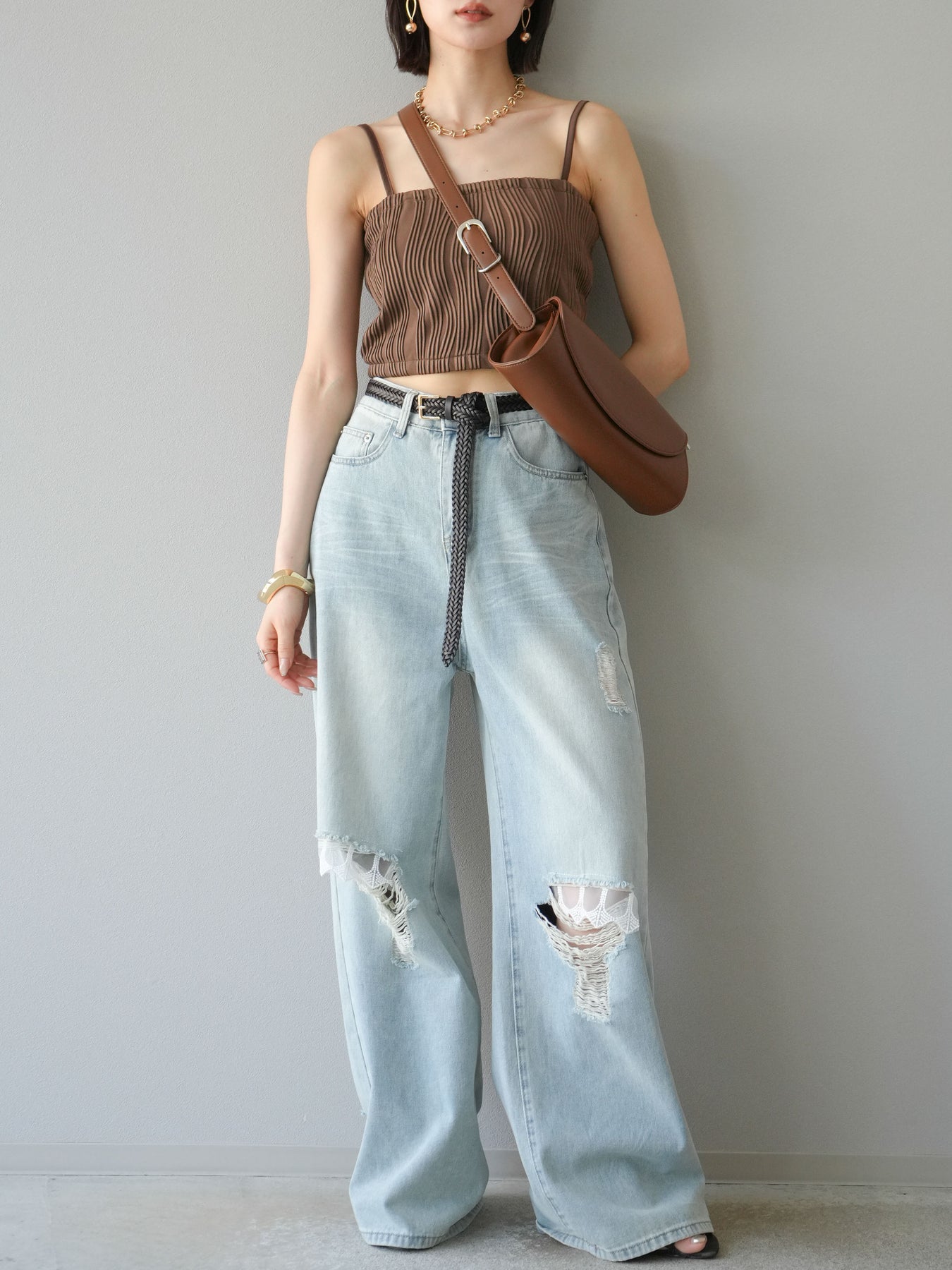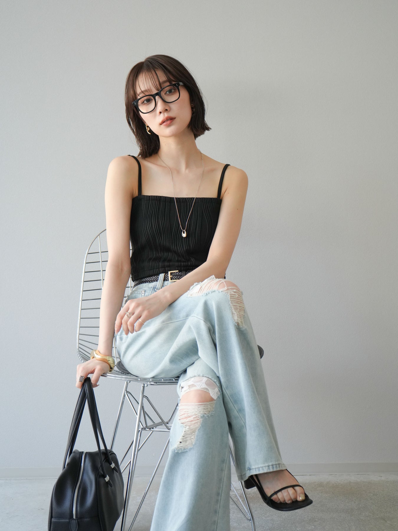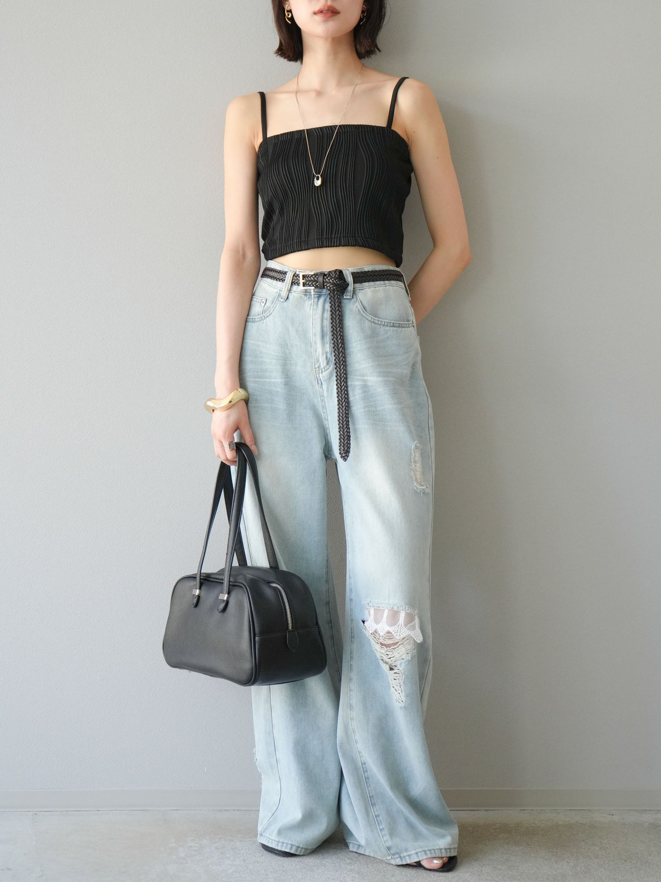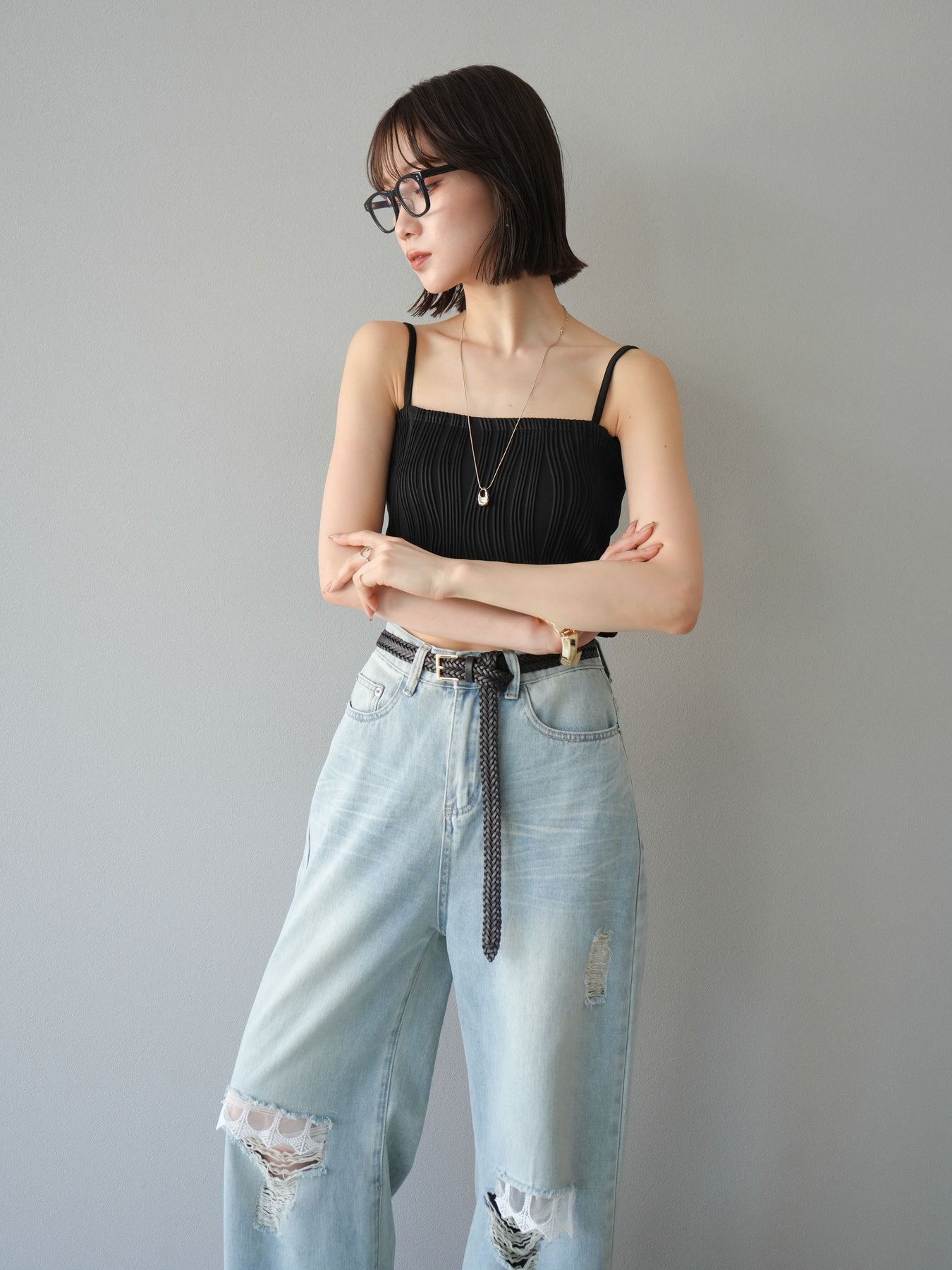 立体的なウェーブ状のパイピングデザインが目を引く、ウェーブパイピングカップ付ベアキャミソール。モード感漂う凹凸素材が身体に程よくフィットし、単品でもインナーとしても着映える仕上がりです。カップ付きで1枚での着用も可能、背中側はゴム仕様で快適なフィット感がありつつもずれにくいのが嬉しいポイント。華奢なストラップが女性らしく、キャミワンピやシアートップスとのレイヤードにもおすすめです。アクセ感覚で取り入れられる、夏のスタイリングのアクセントになる一枚。 ※ボトムス、キャミソール(インナー)以外の商品は一律でインナーは付属していません。