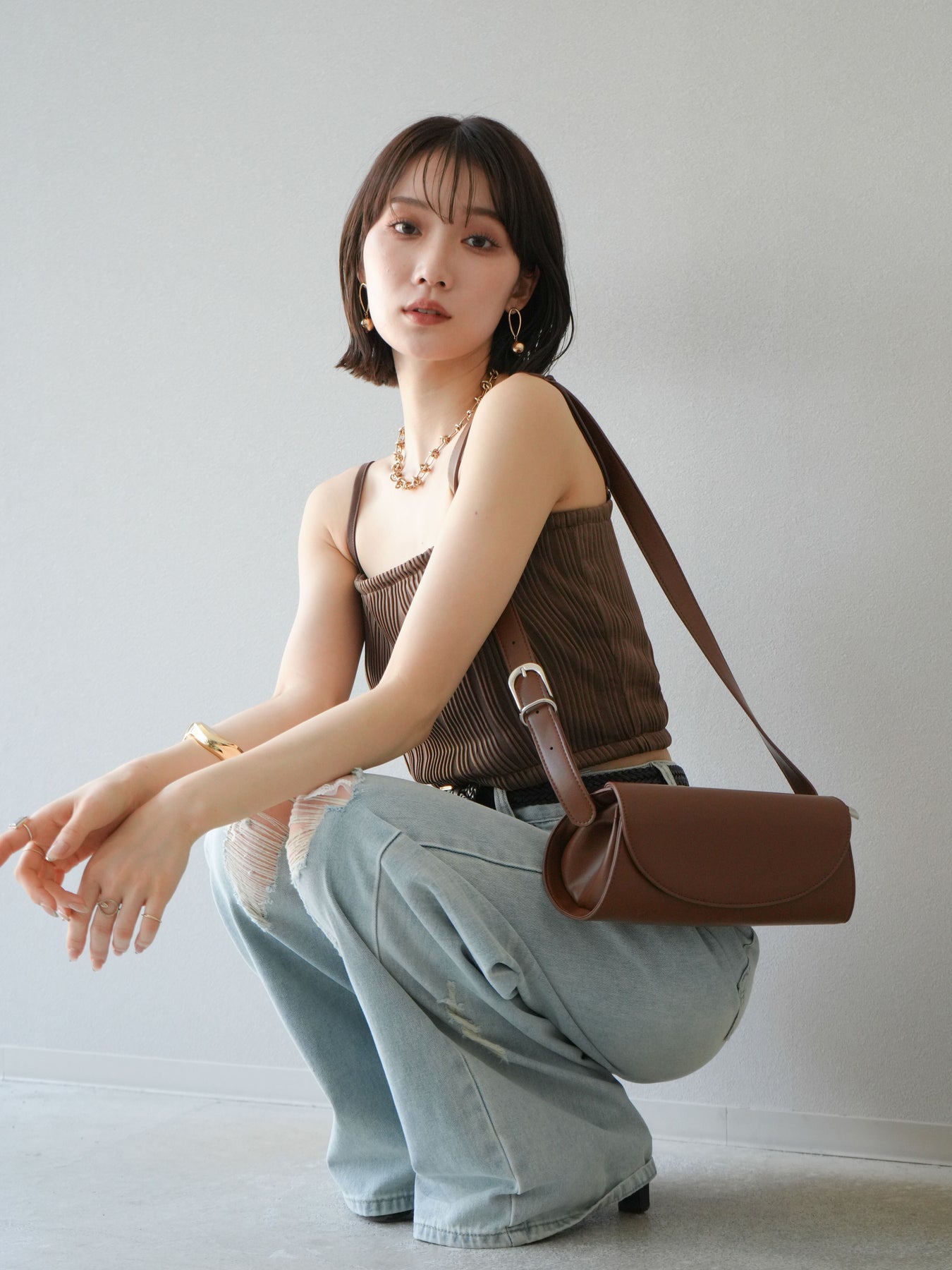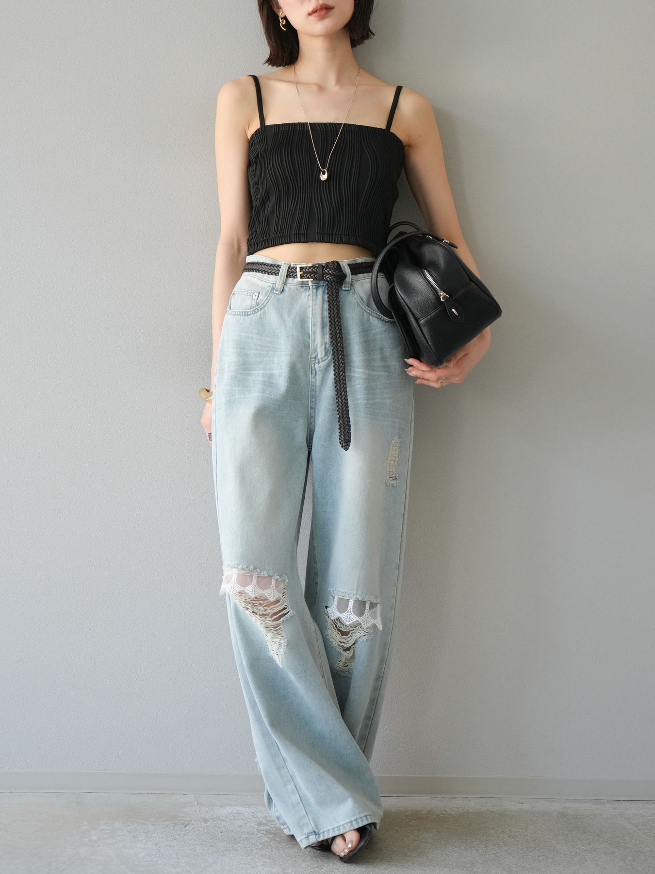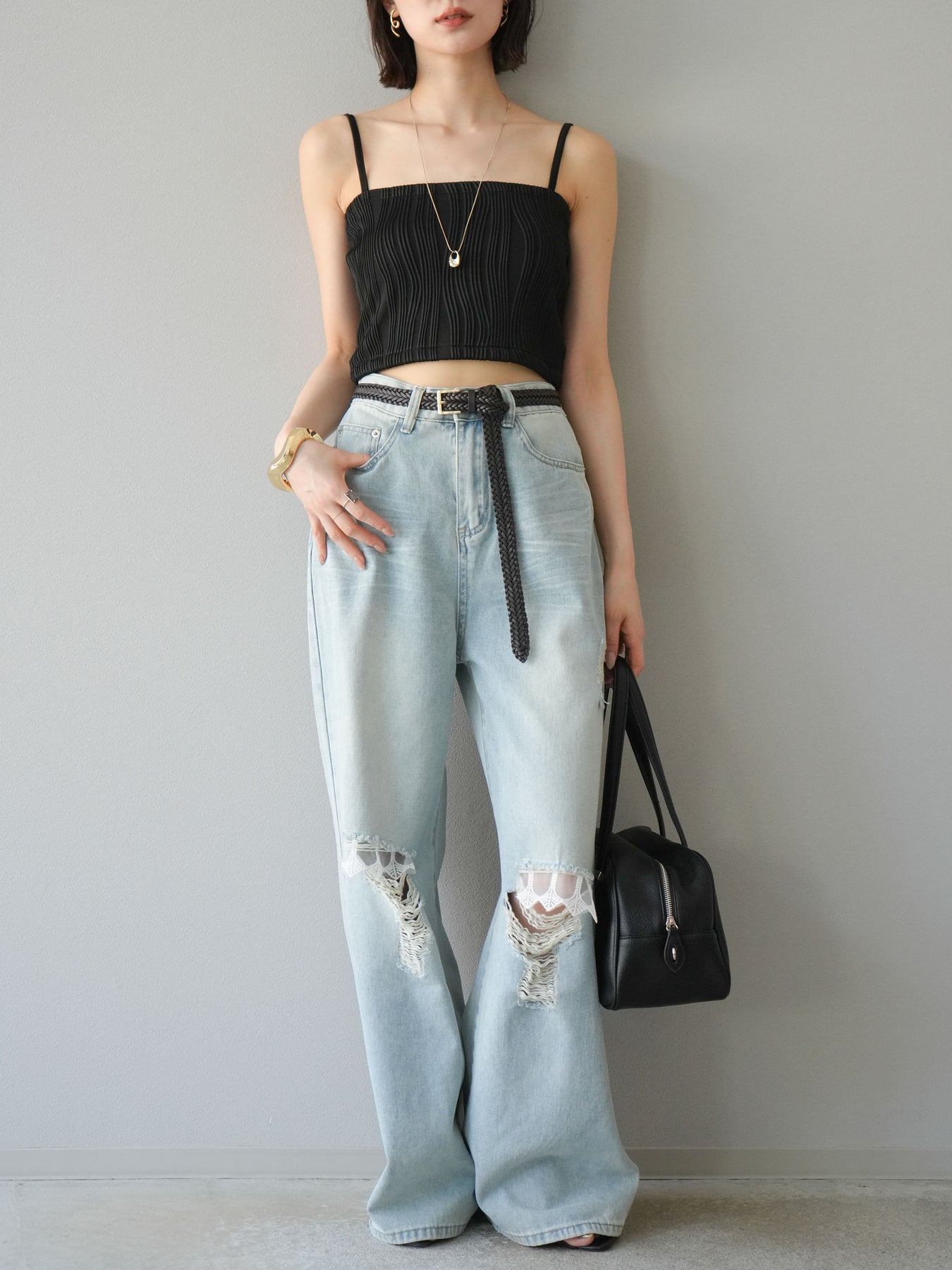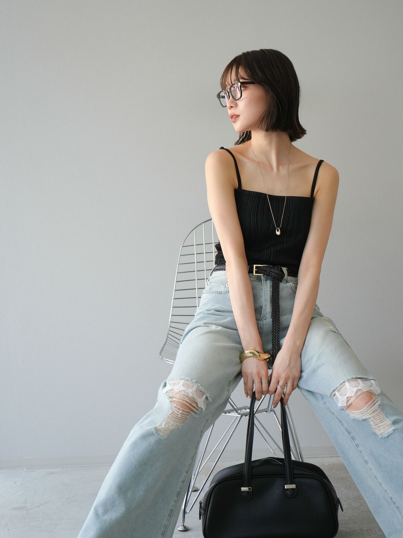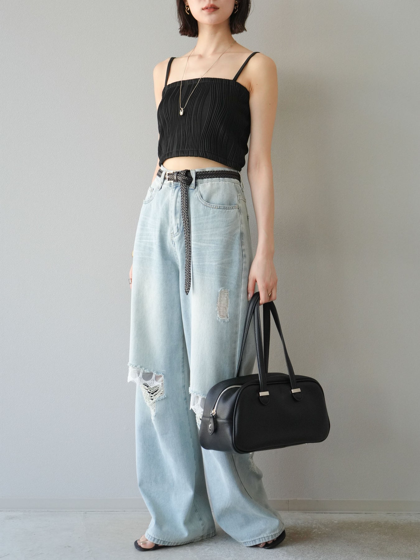 立体的なウェーブ状のパイピングデザインが目を引く、ウェーブパイピングカップ付ベアキャミソール。モード感漂う凹凸素材が身体に程よくフィットし、単品でもインナーとしても着映える仕上がりです。カップ付きで1枚での着用も可能、背中側はゴム仕様で快適なフィット感がありつつもずれにくいのが嬉しいポイント。華奢なストラップが女性らしく、キャミワンピやシアートップスとのレイヤードにもおすすめです。アクセ感覚で取り入れられる、夏のスタイリングのアクセントになる一枚。 ※ボトムス、キャミソール(インナー)以外の商品は一律でインナーは付属していません。