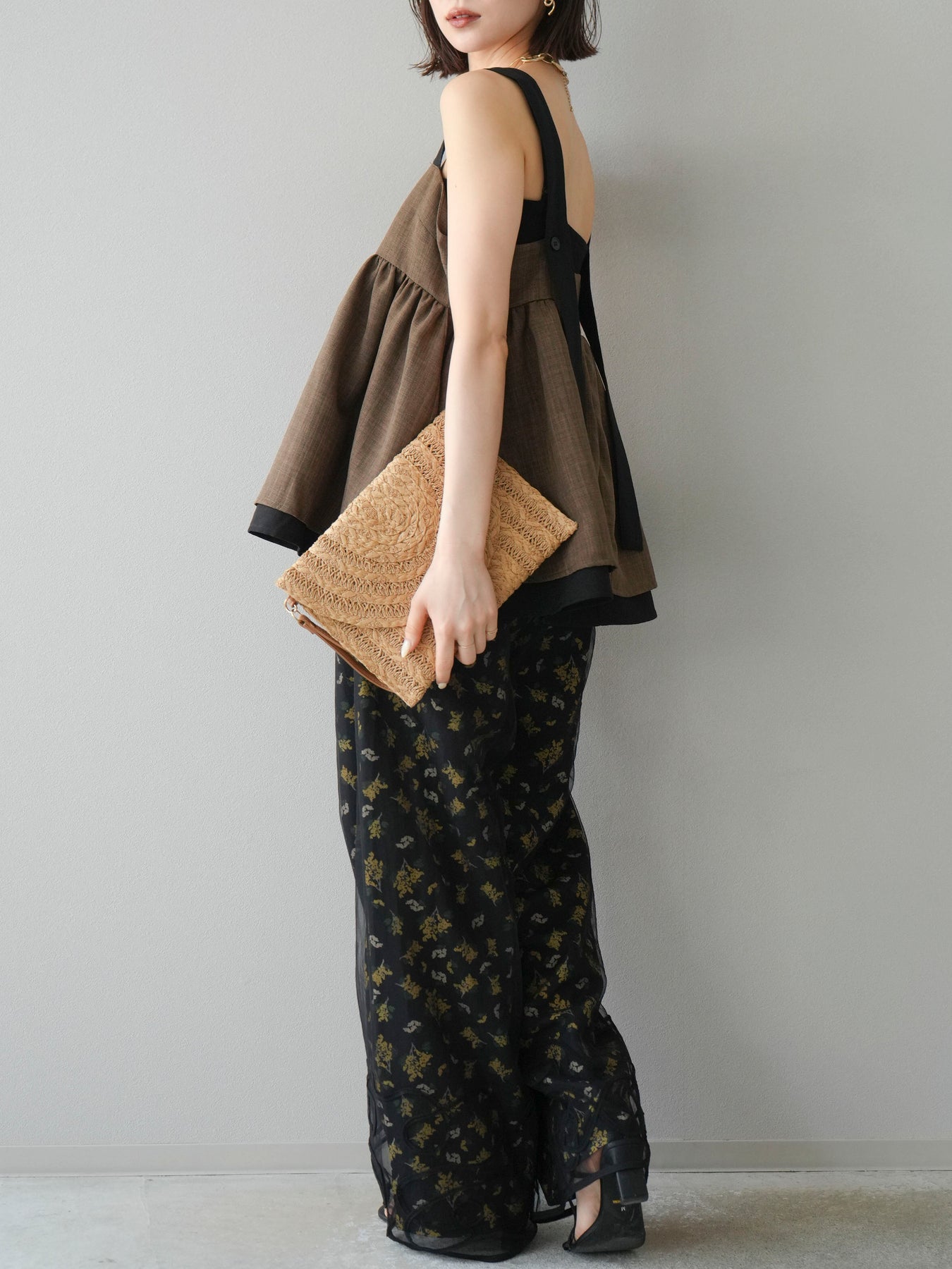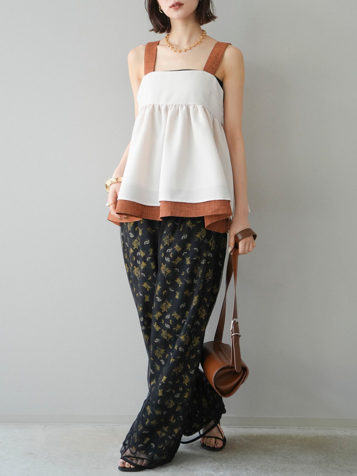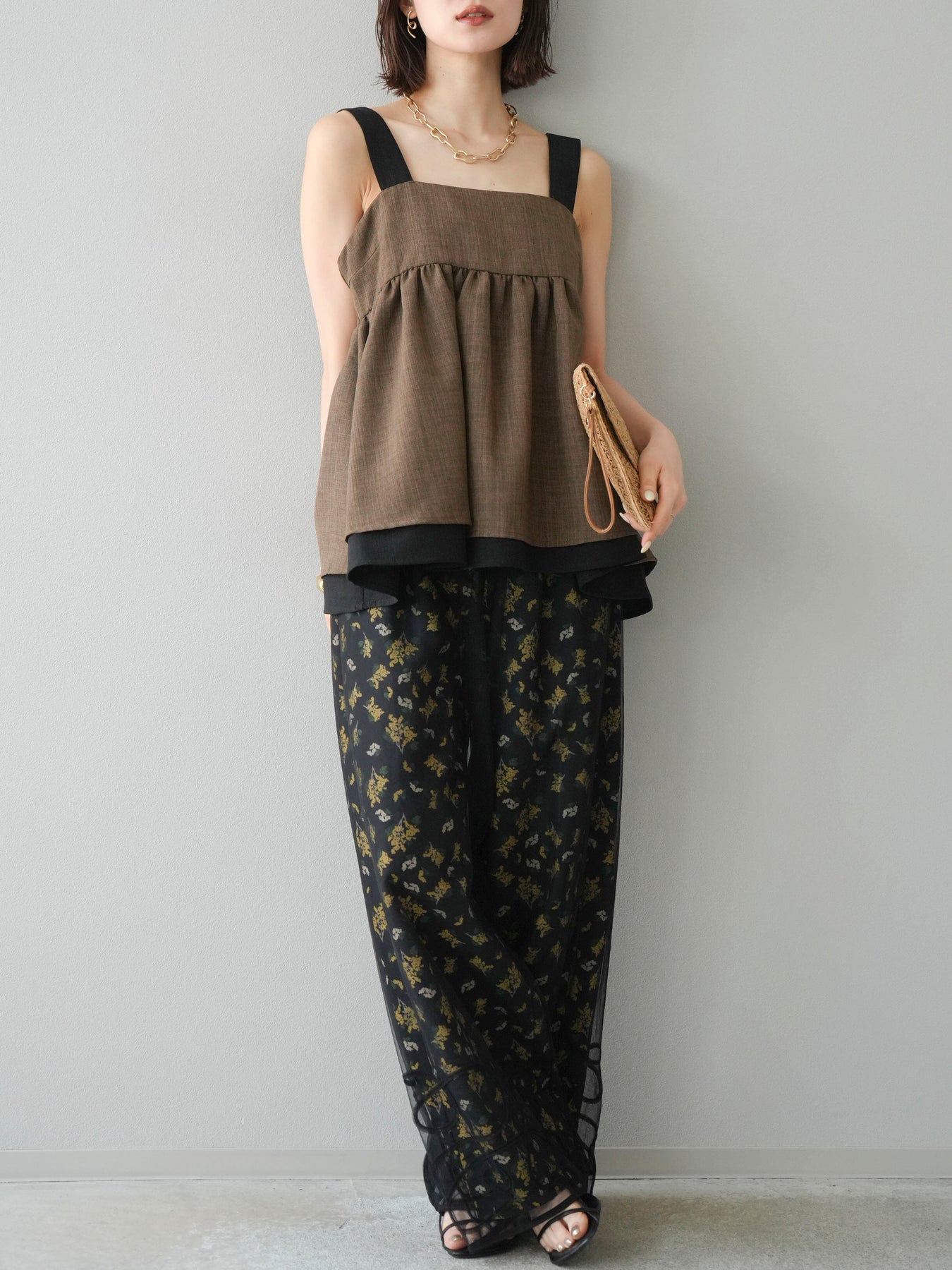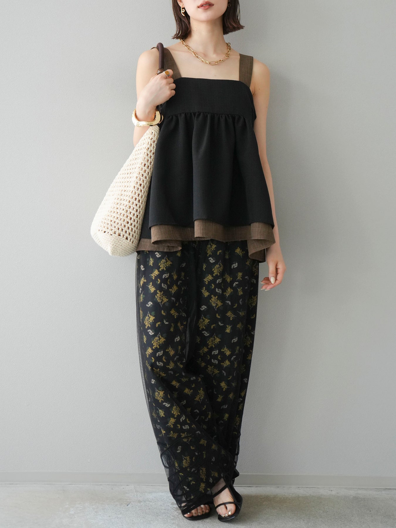 小花が散りばめられたブーケ柄が大人可愛い、主役級のキャミソールトップス。 細めのストラップとデコルテが綺麗に見えるネックラインで、女性らしさが際立つ一枚です。 切り替え位置を高めに設定したふんわりとしたシルエットが、体のラインをさりげなくカバーしつつ、軽やかで華やかな印象に。 さらりとした肌触りの素材感で、暑い季節も快適に着用できます。 一枚での着用はもちろん、インナーにTシャツやシアートップスをレイヤードするスタイルもおすすめ。 デニムやワイドパンツとの相性も抜群で、コーディネートに季節感をプラスしてくれるアイテムです。