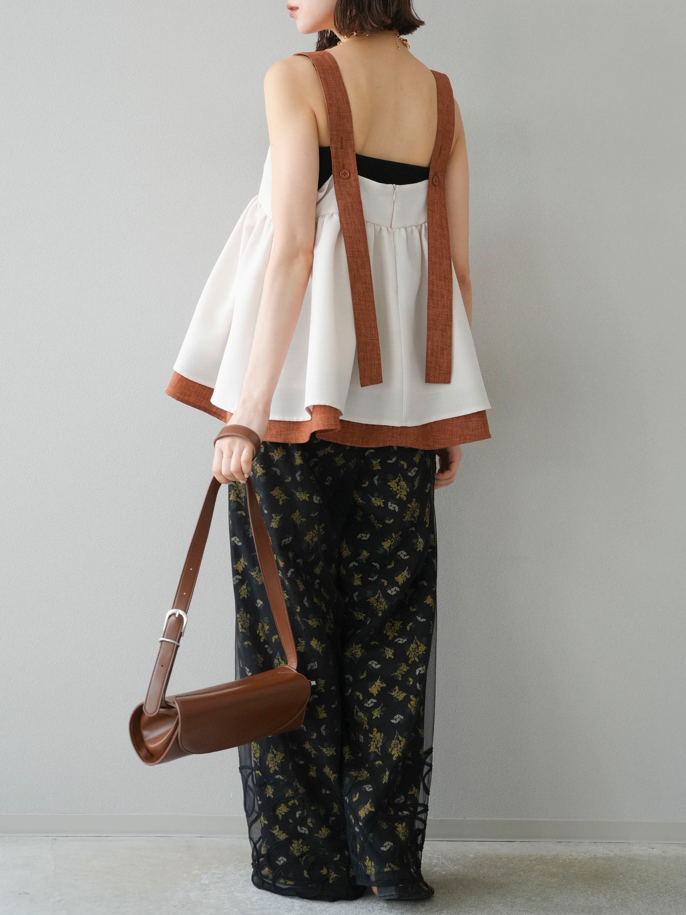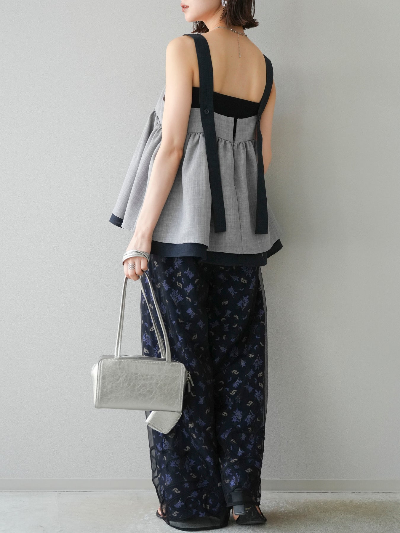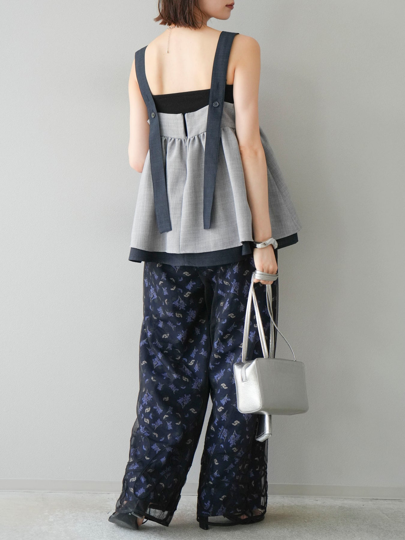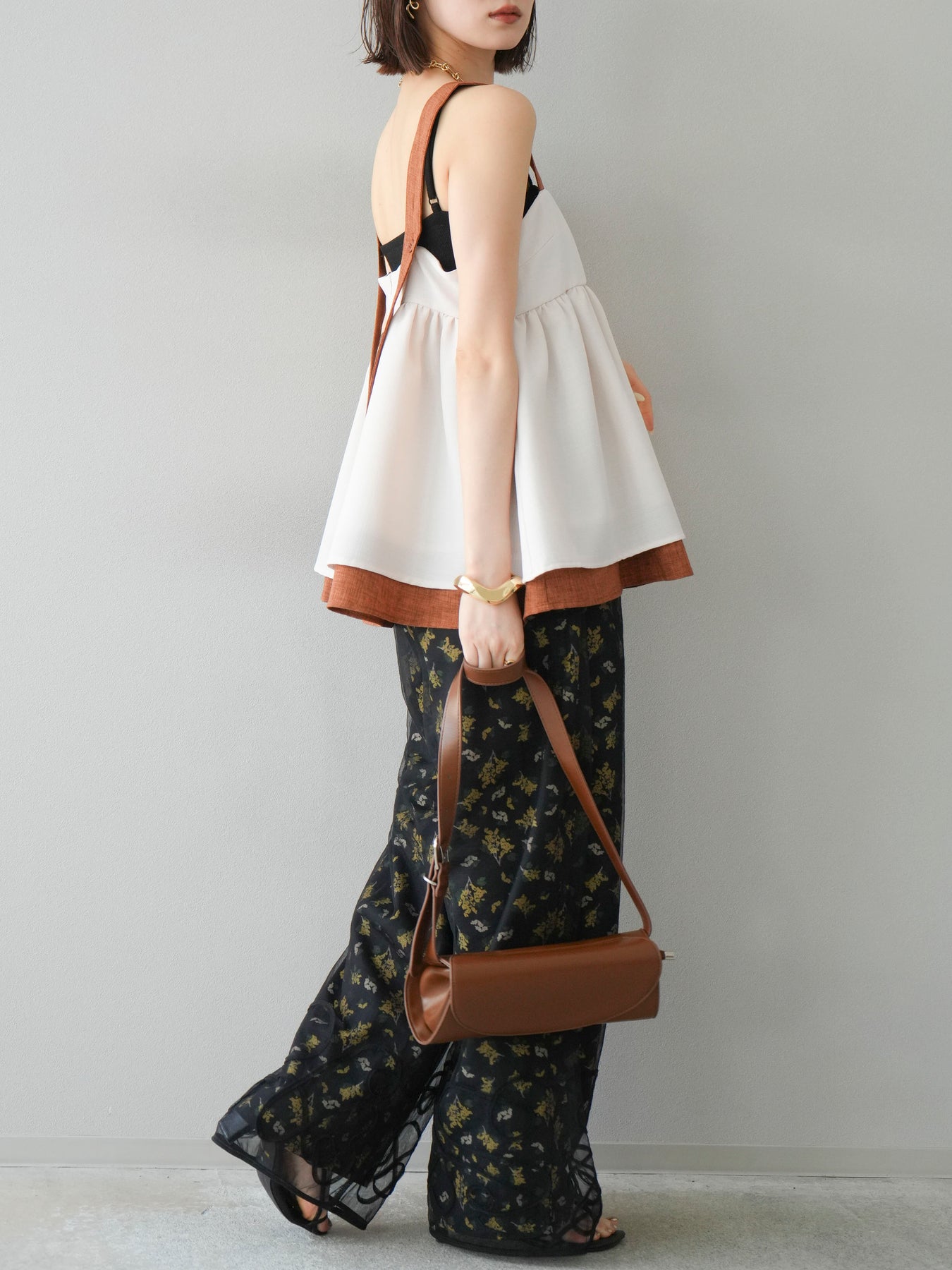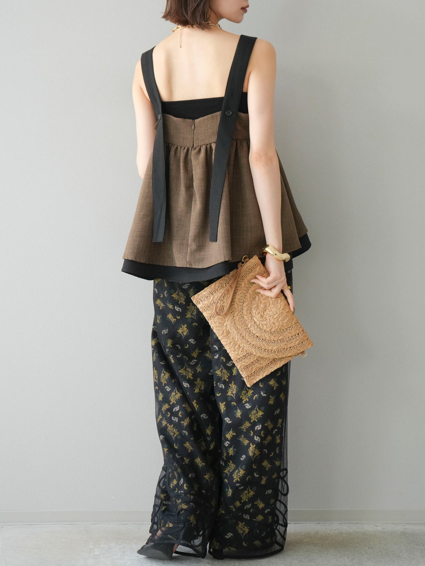 小花が散りばめられたブーケ柄が大人可愛い、主役級のキャミソールトップス。 細めのストラップとデコルテが綺麗に見えるネックラインで、女性らしさが際立つ一枚です。 切り替え位置を高めに設定したふんわりとしたシルエットが、体のラインをさりげなくカバーしつつ、軽やかで華やかな印象に。 さらりとした肌触りの素材感で、暑い季節も快適に着用できます。 一枚での着用はもちろん、インナーにTシャツやシアートップスをレイヤードするスタイルもおすすめ。 デニムやワイドパンツとの相性も抜群で、コーディネートに季節感をプラスしてくれるアイテムです。