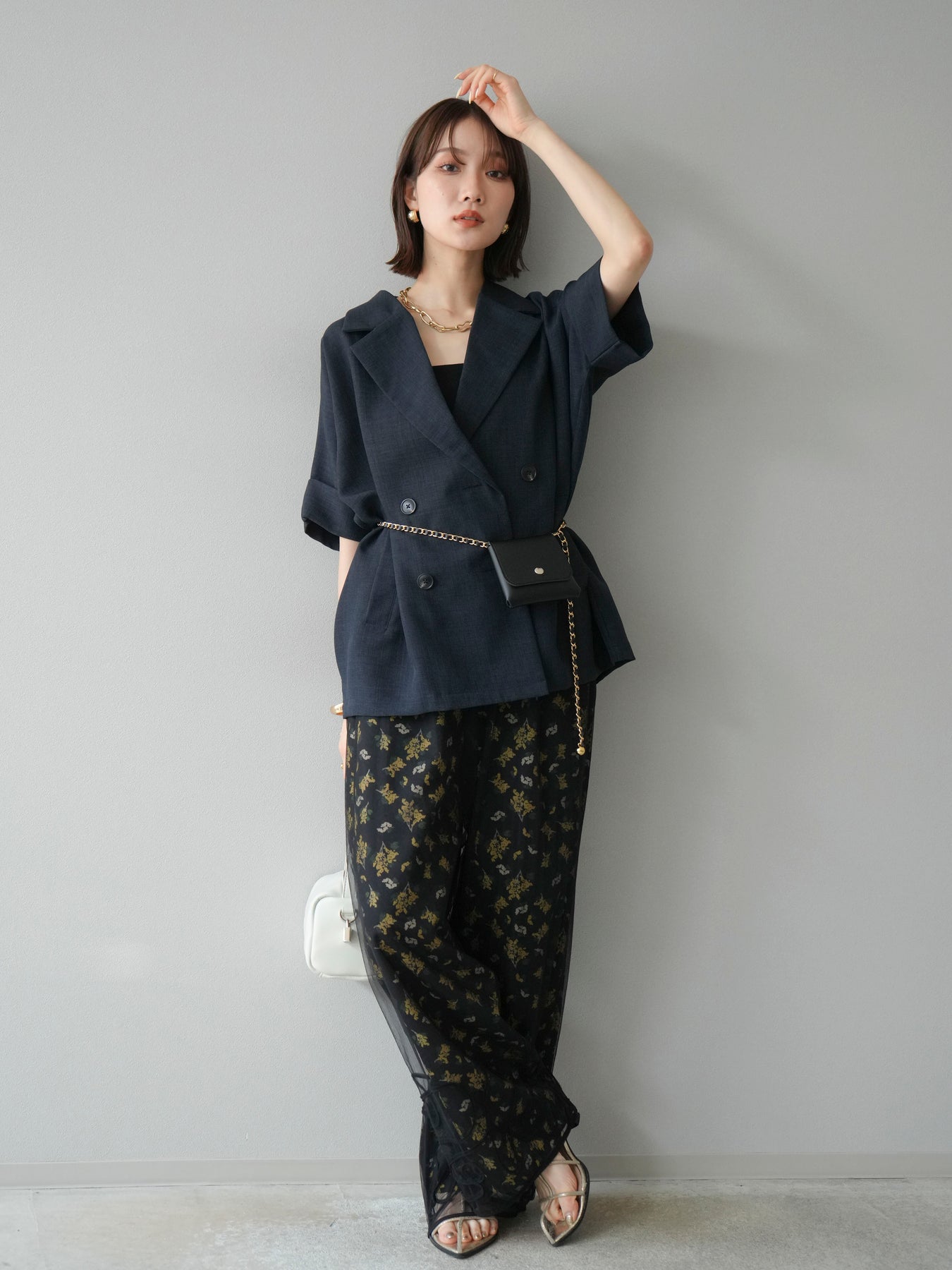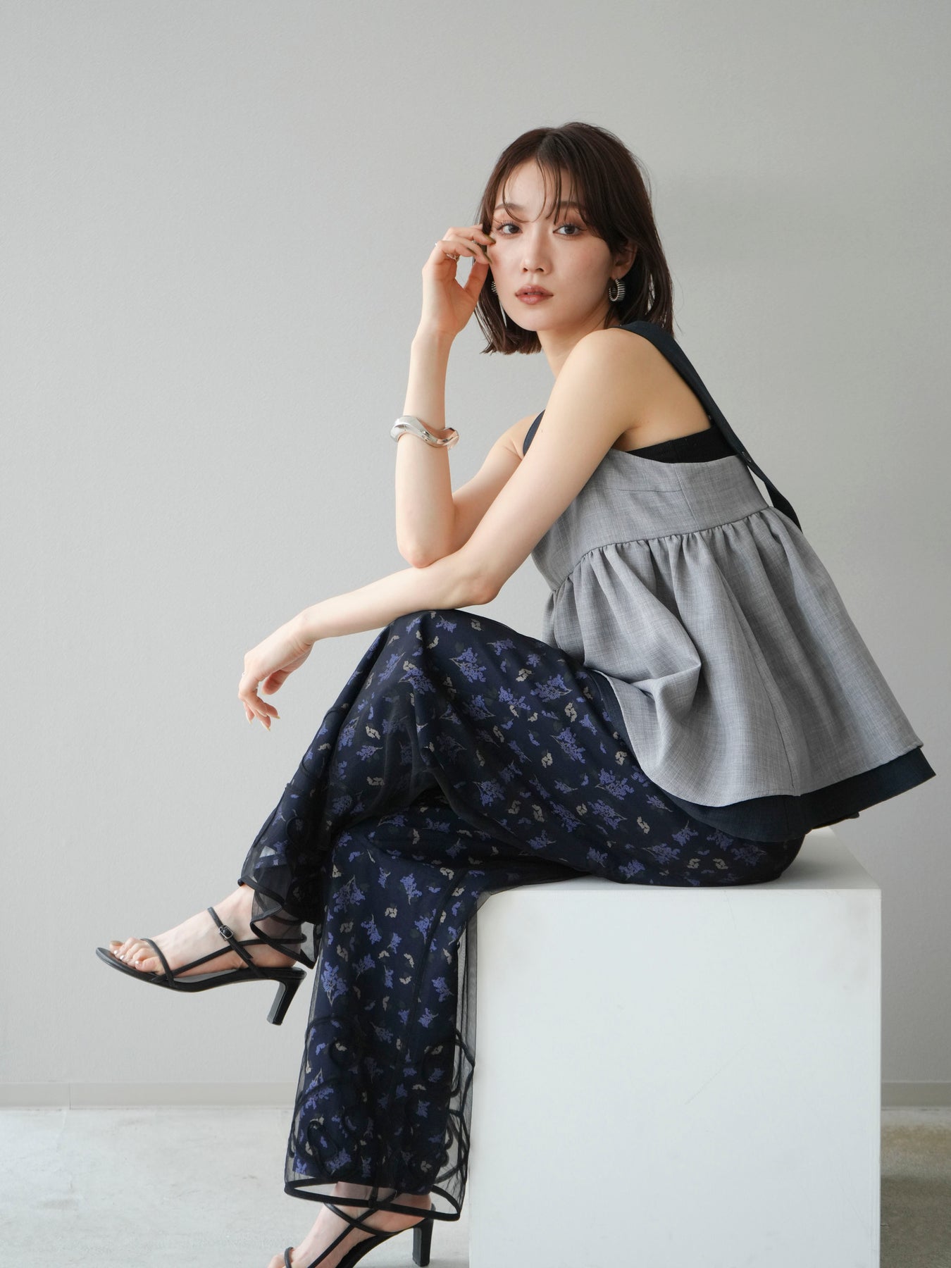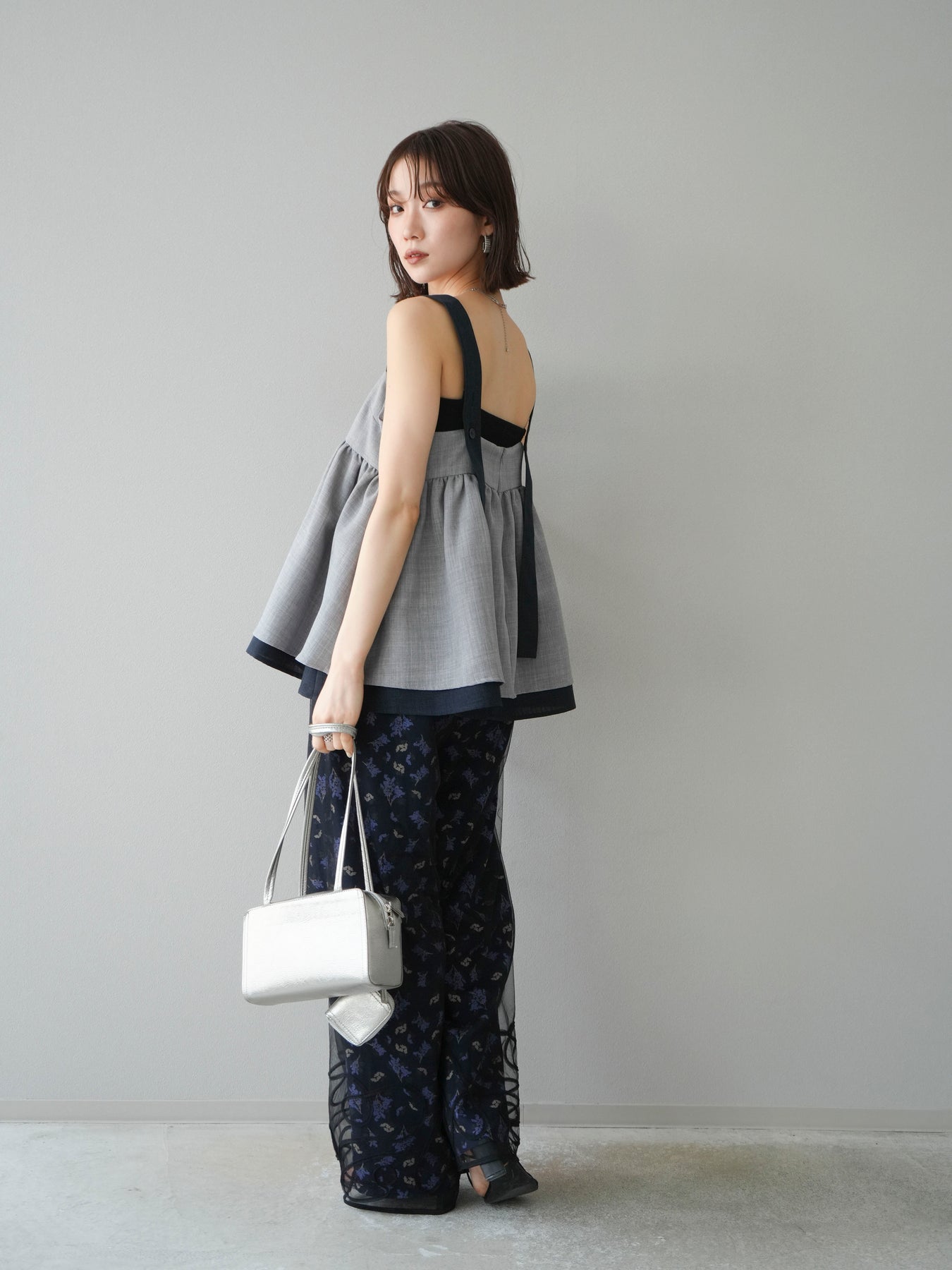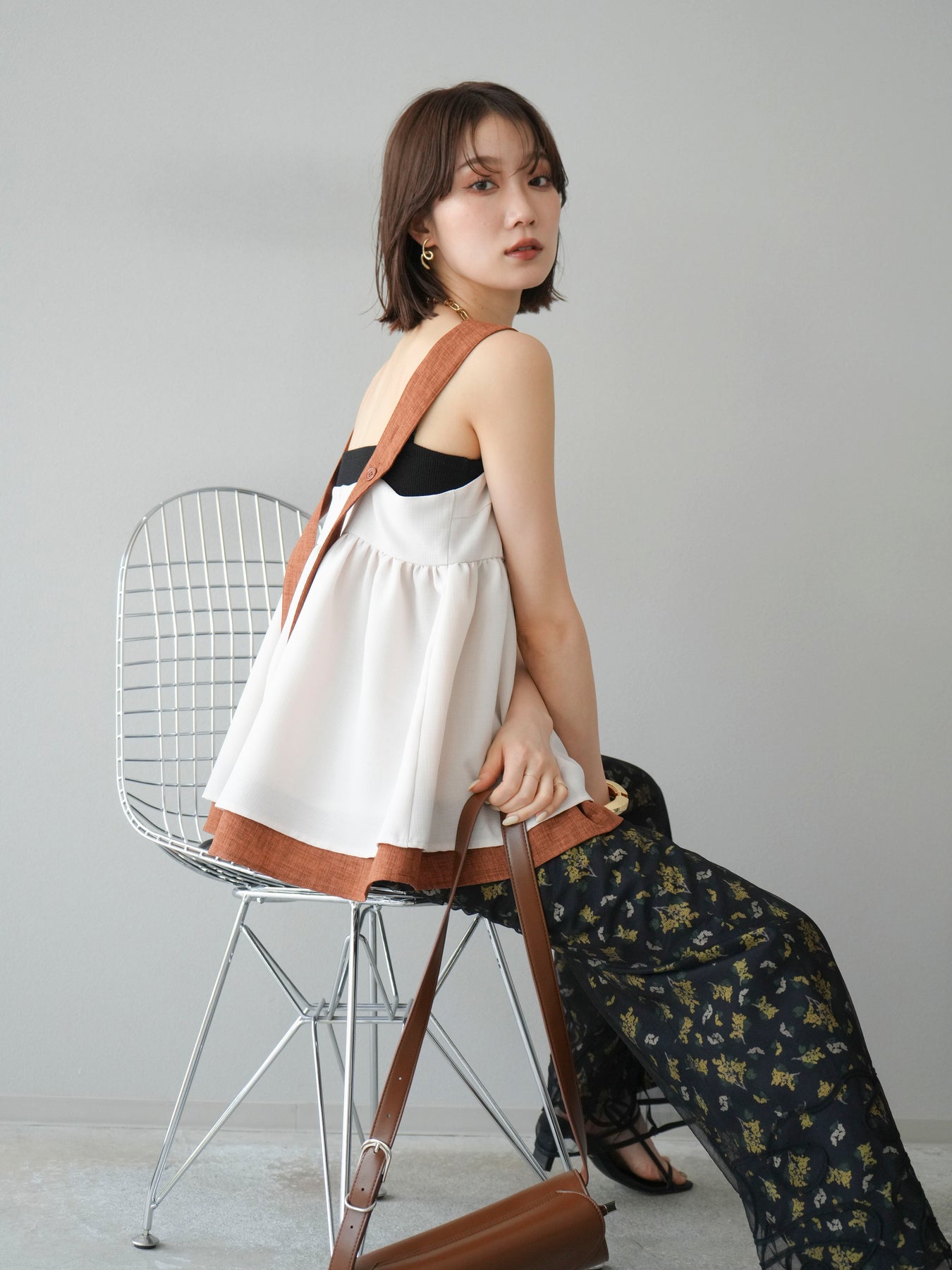 小花が散りばめられたブーケ柄が大人可愛い、主役級のキャミソールトップス。 細めのストラップとデコルテが綺麗に見えるネックラインで、女性らしさが際立つ一枚です。 切り替え位置を高めに設定したふんわりとしたシルエットが、体のラインをさりげなくカバーしつつ、軽やかで華やかな印象に。 さらりとした肌触りの素材感で、暑い季節も快適に着用できます。 一枚での着用はもちろん、インナーにTシャツやシアートップスをレイヤードするスタイルもおすすめ。 デニムやワイドパンツとの相性も抜群で、コーディネートに季節感をプラスしてくれるアイテムです。