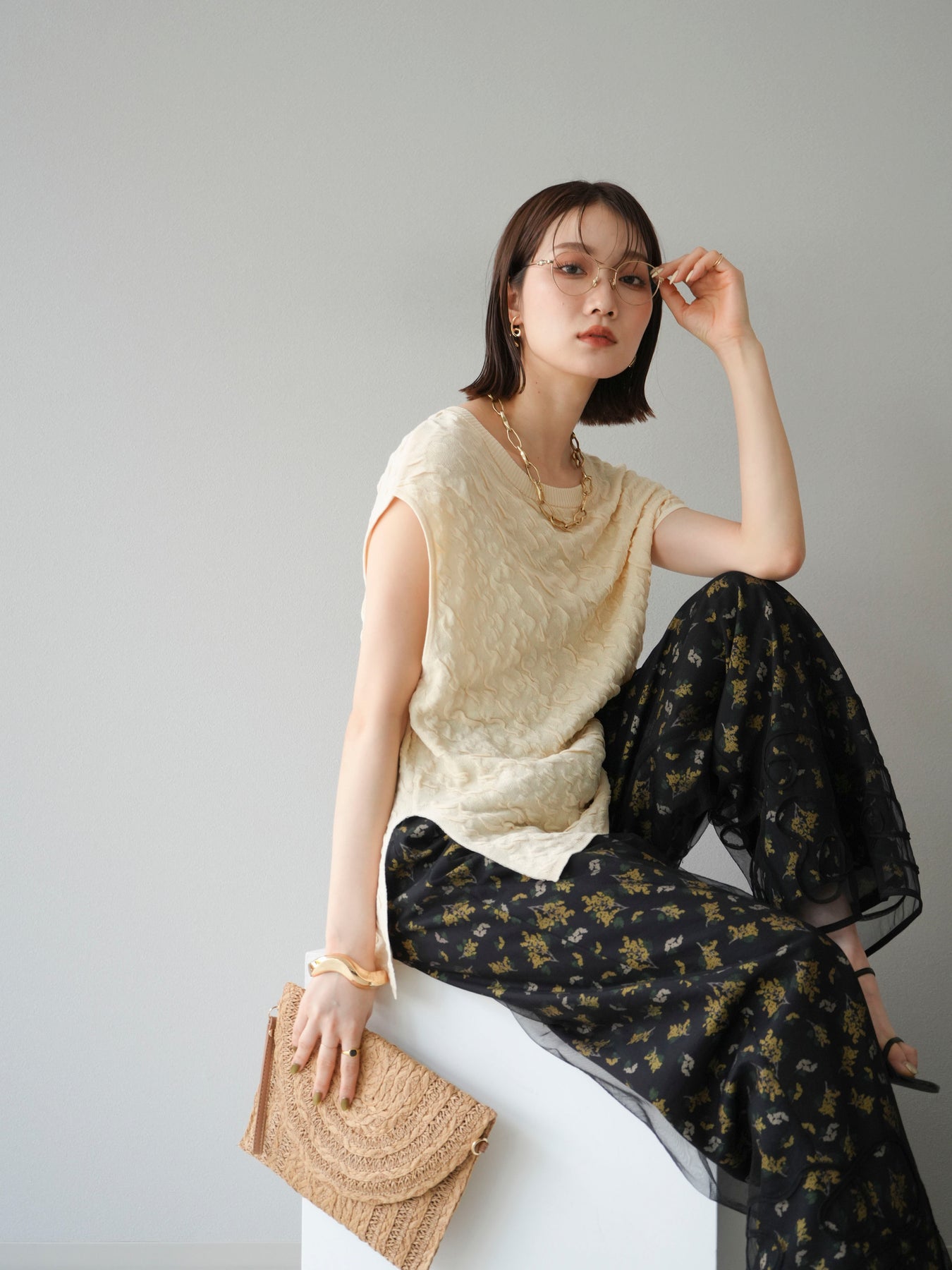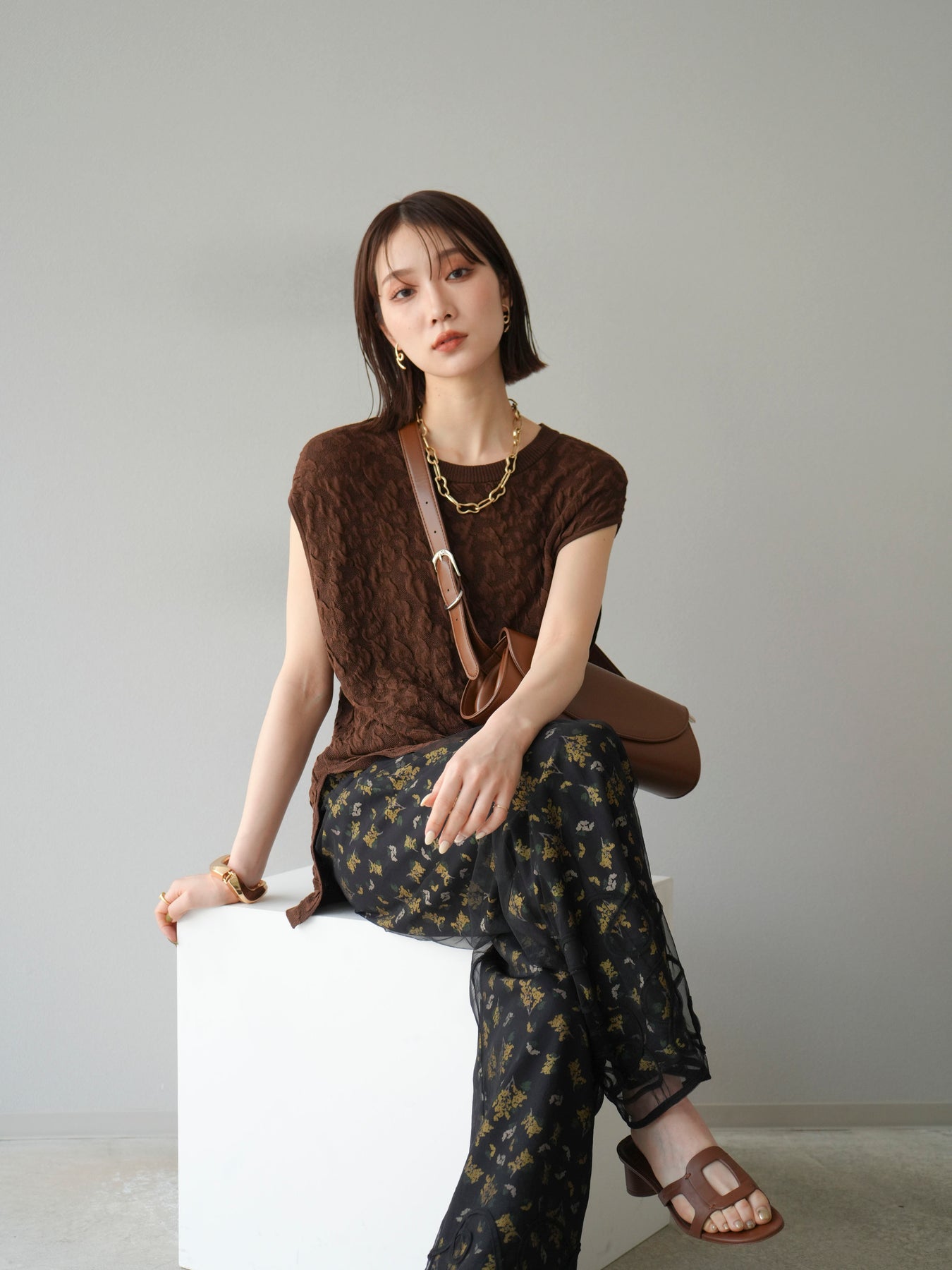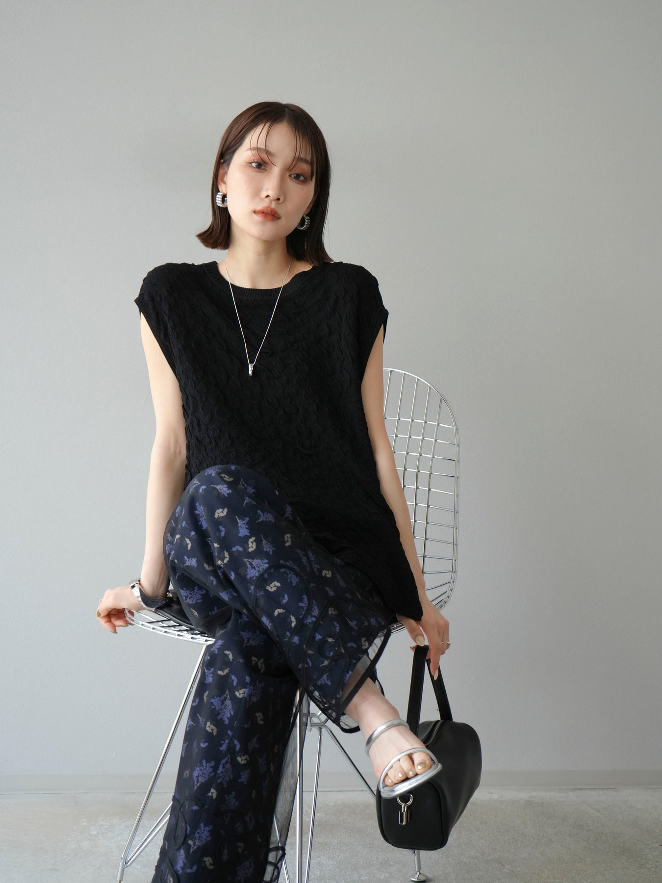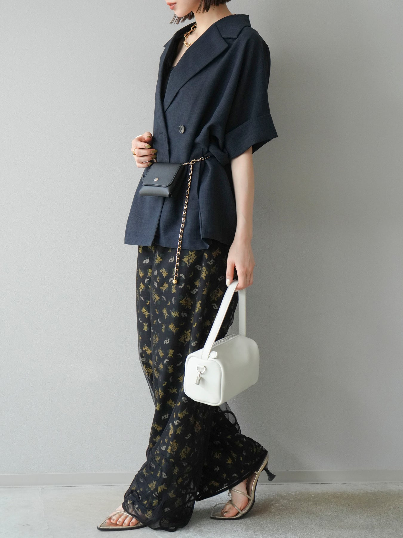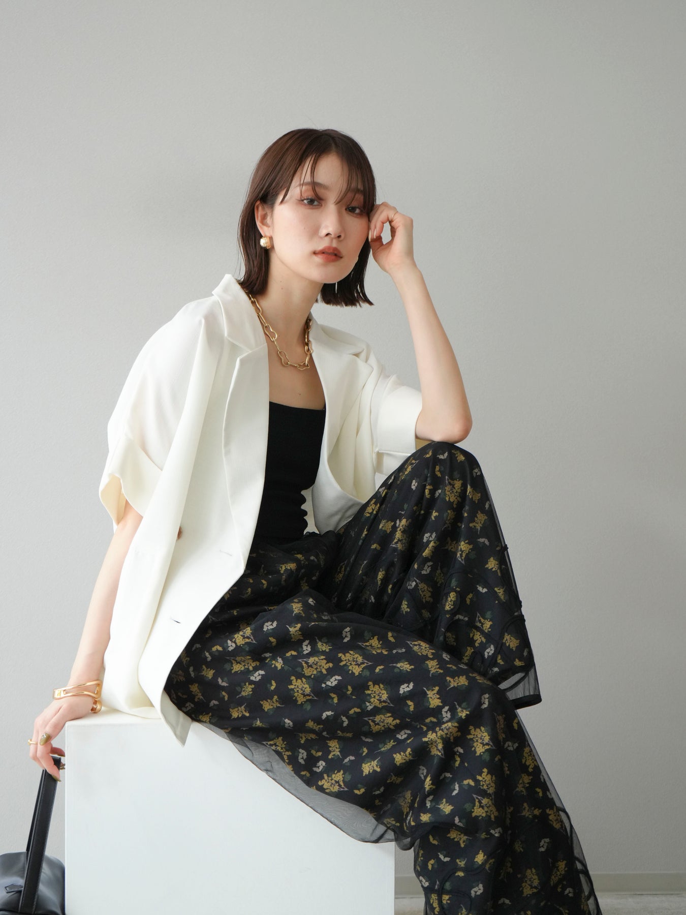小花が散りばめられたブーケ柄が大人可愛い、主役級のキャミソールトップス。 細めのストラップとデコルテが綺麗に見えるネックラインで、女性らしさが際立つ一枚です。 切り替え位置を高めに設定したふんわりとしたシルエットが、体のラインをさりげなくカバーしつつ、軽やかで華やかな印象に。 さらりとした肌触りの素材感で、暑い季節も快適に着用できます。 一枚での着用はもちろん、インナーにTシャツやシアートップスをレイヤードするスタイルもおすすめ。 デニムやワイドパンツとの相性も抜群で、コーディネートに季節感をプラスしてくれるアイテムです。