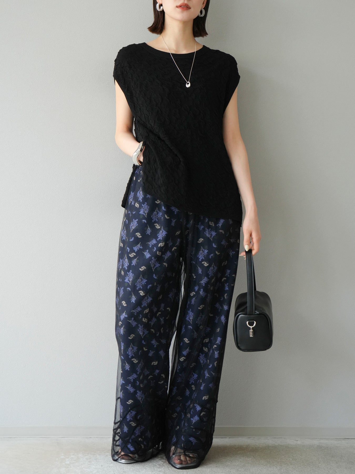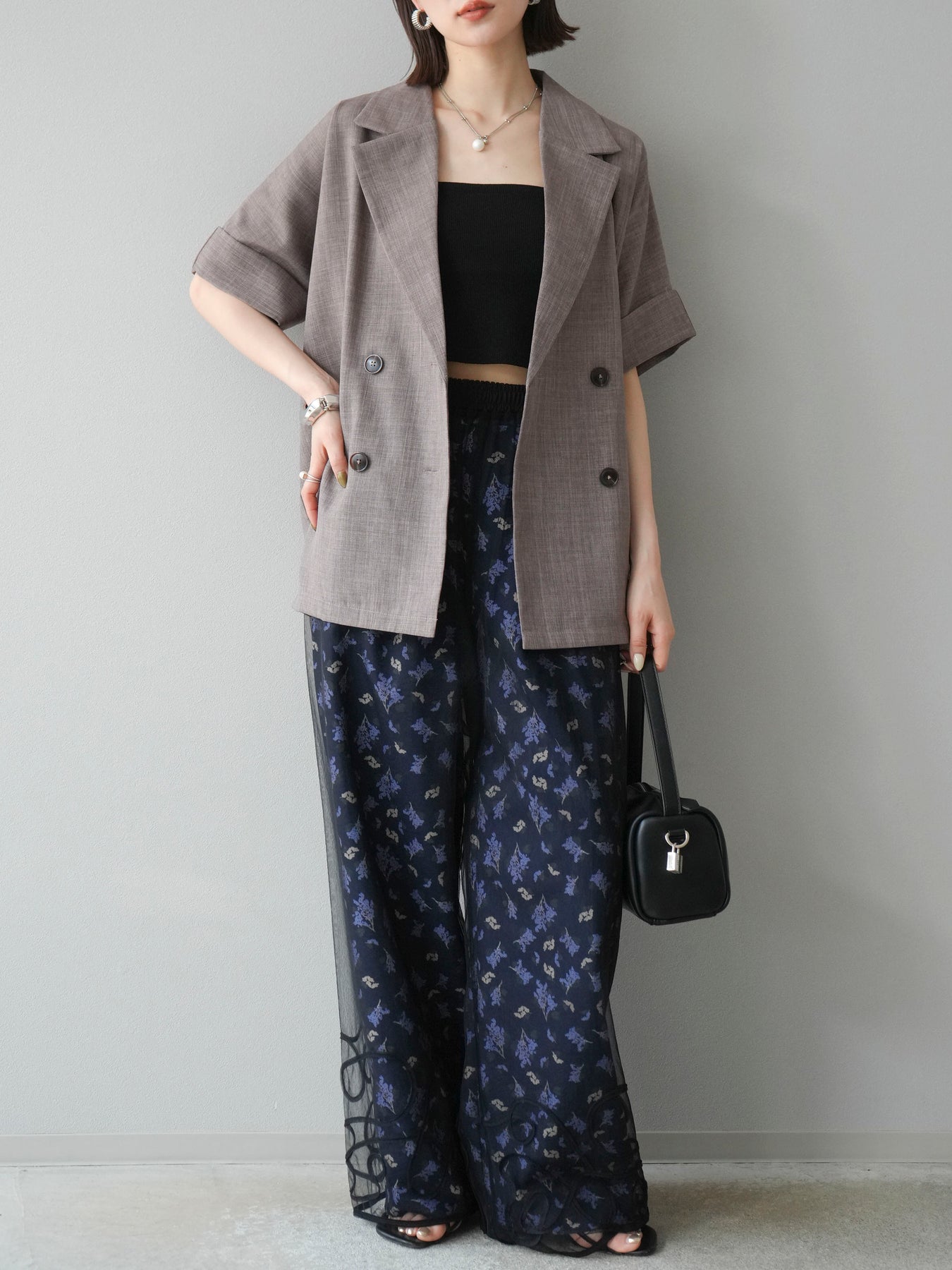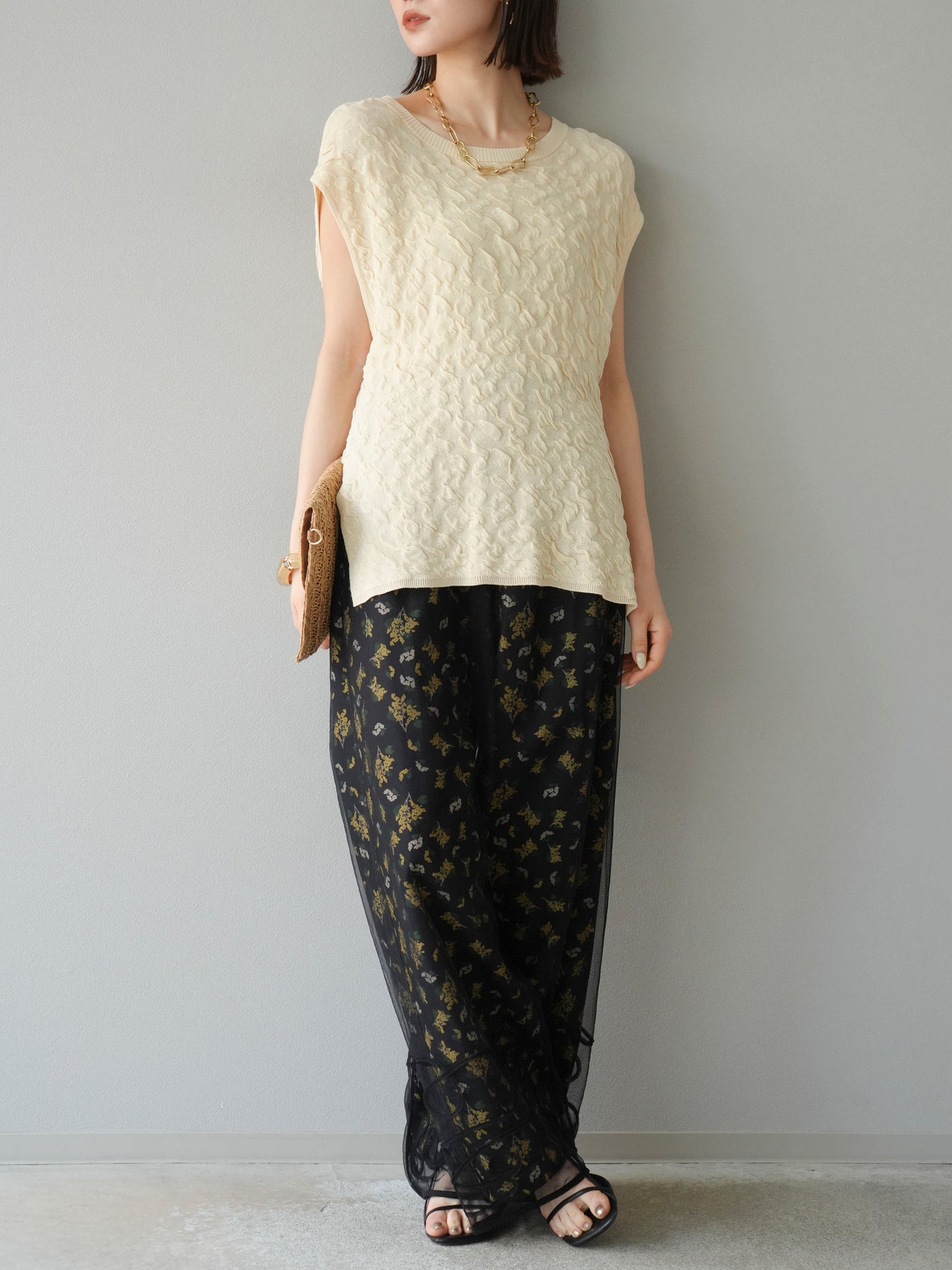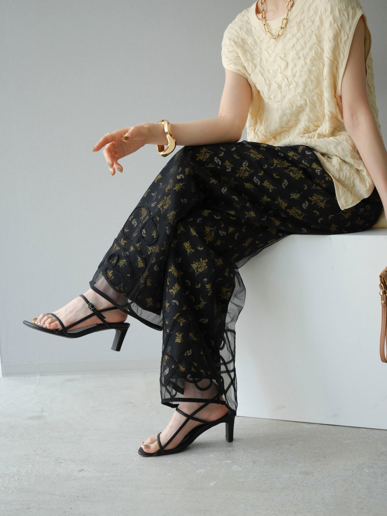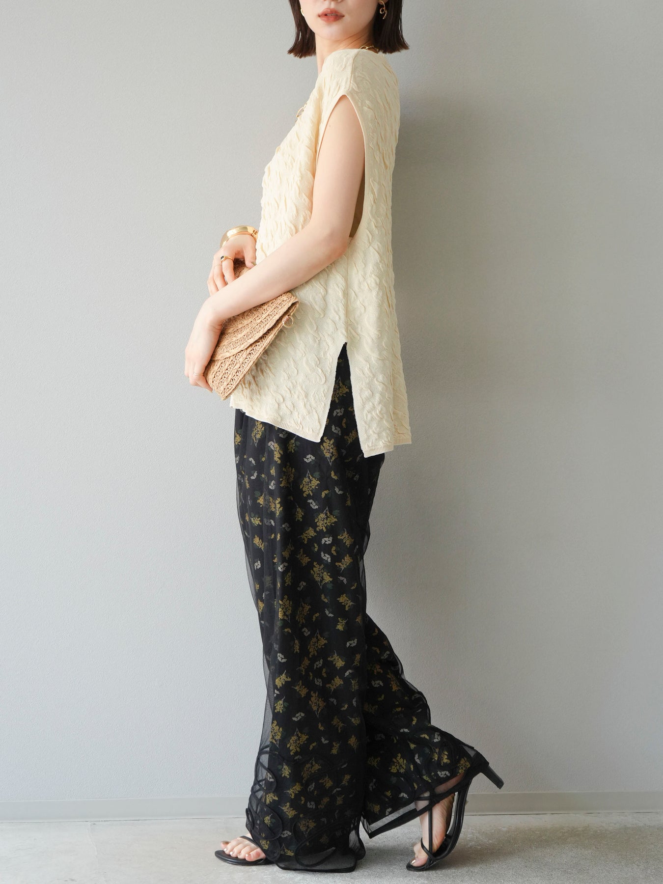 [SET]コード刺繍チュールレイヤードパンツ+ブーケプリントタックパンツ(2set)