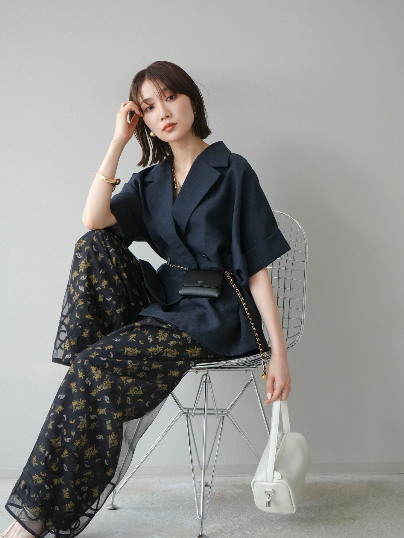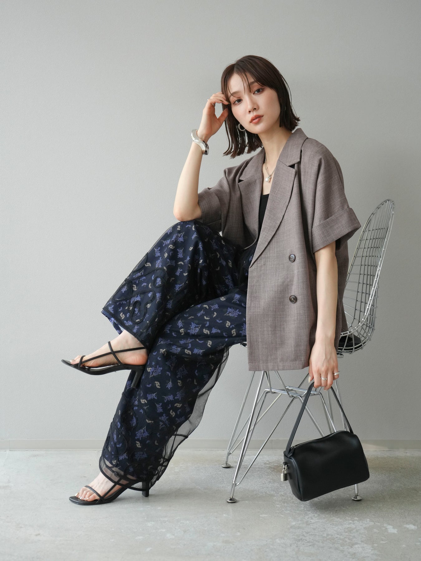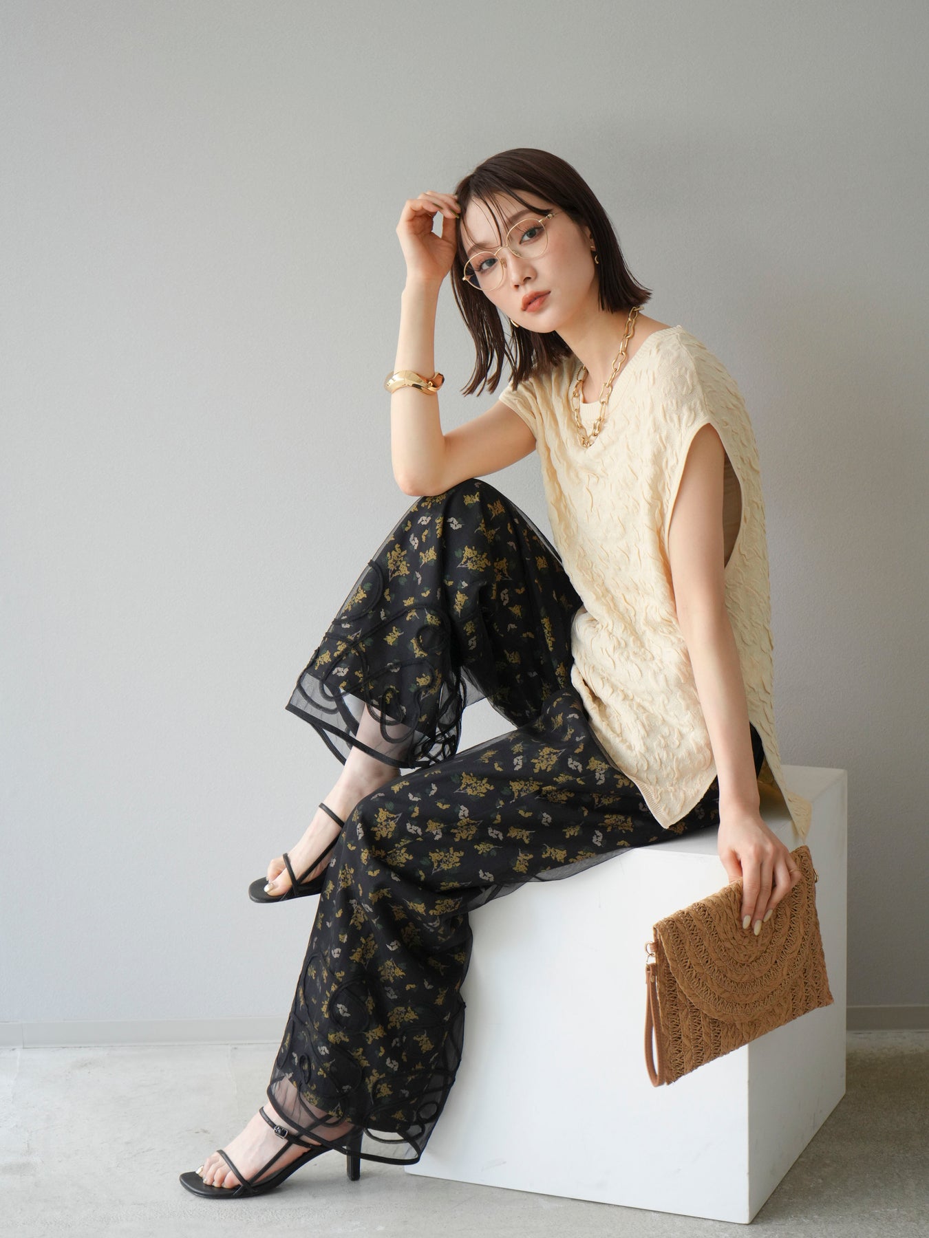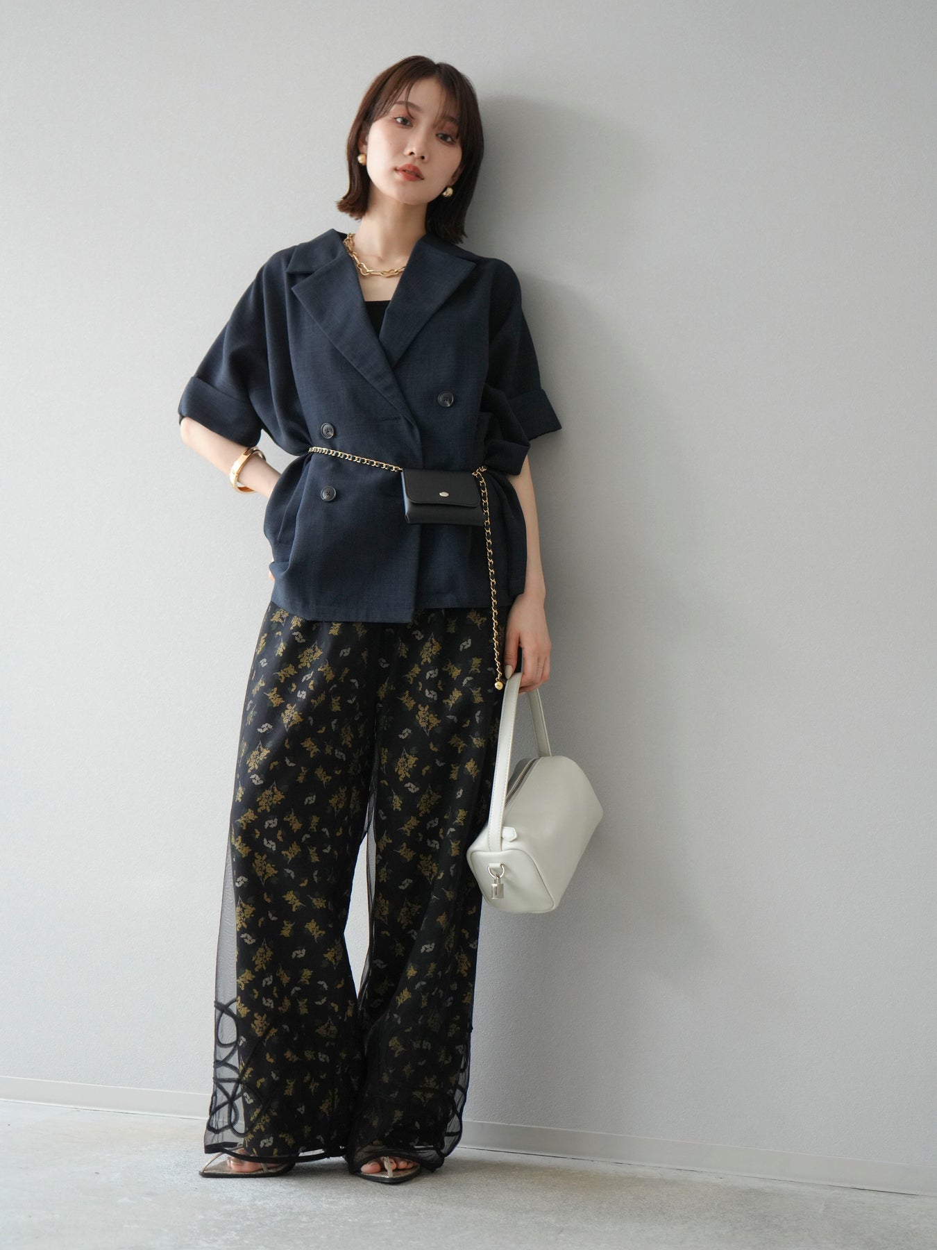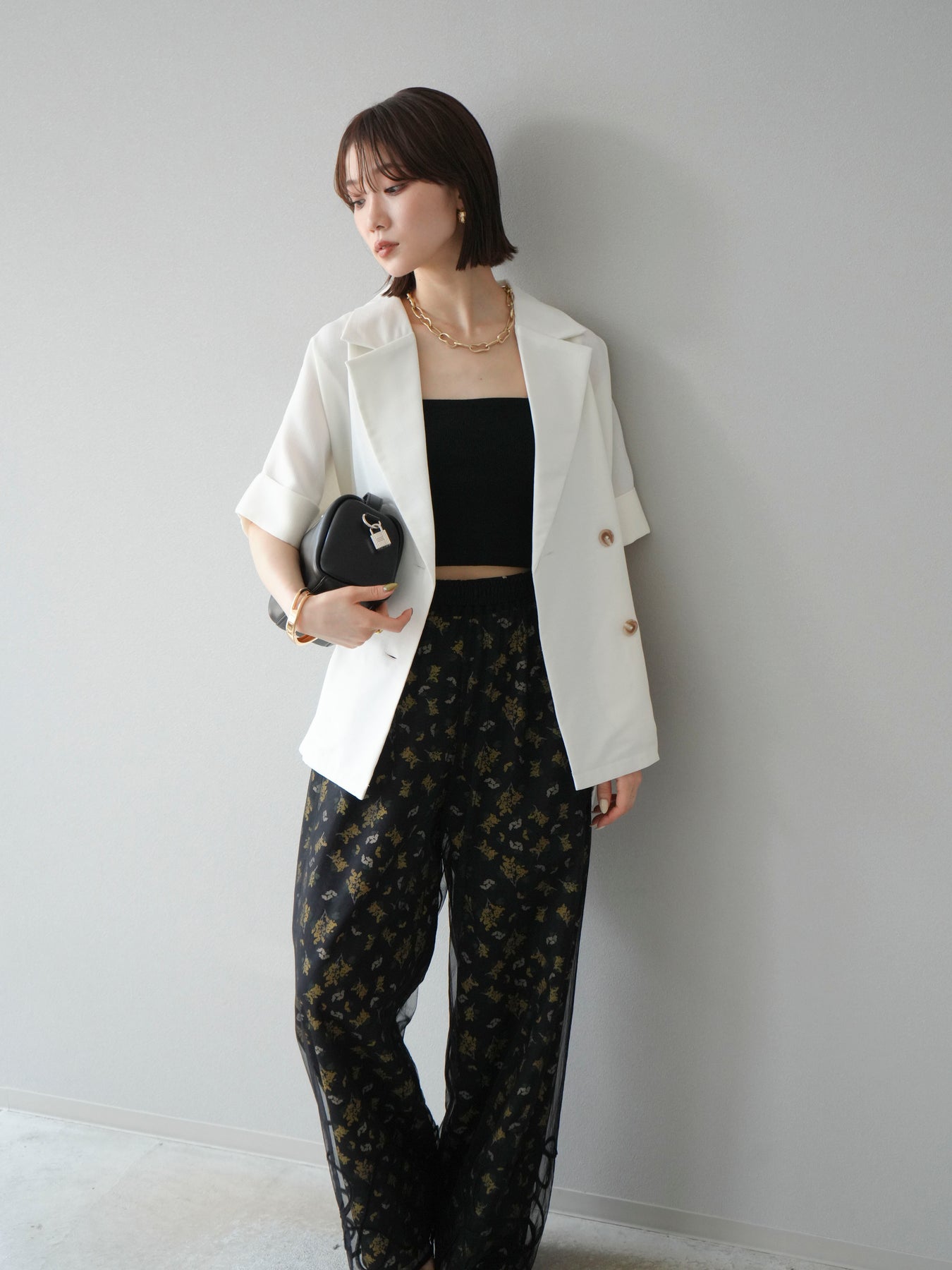 [SET]コード刺繍チュールレイヤードパンツ+ブーケプリントタックパンツ(2set)