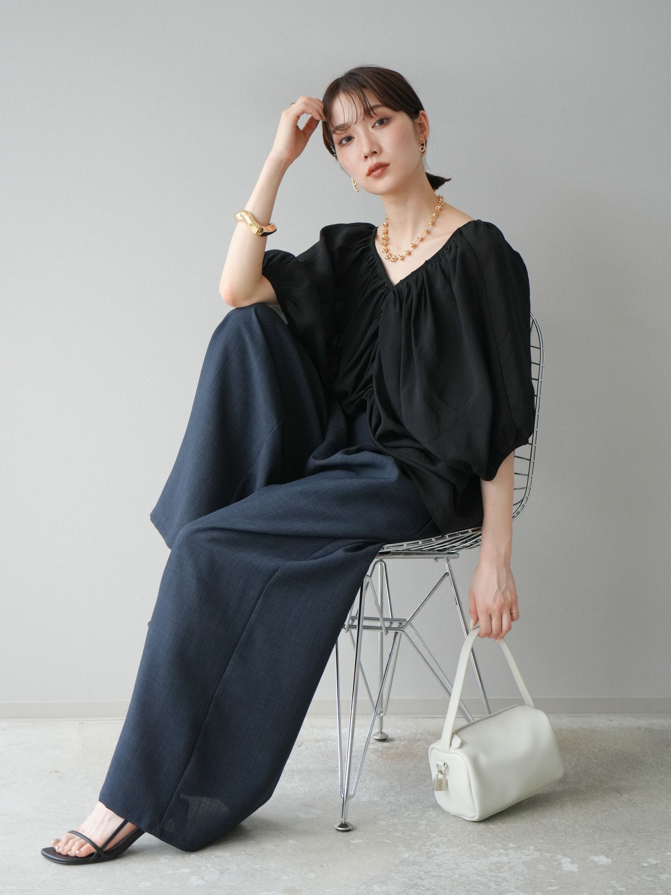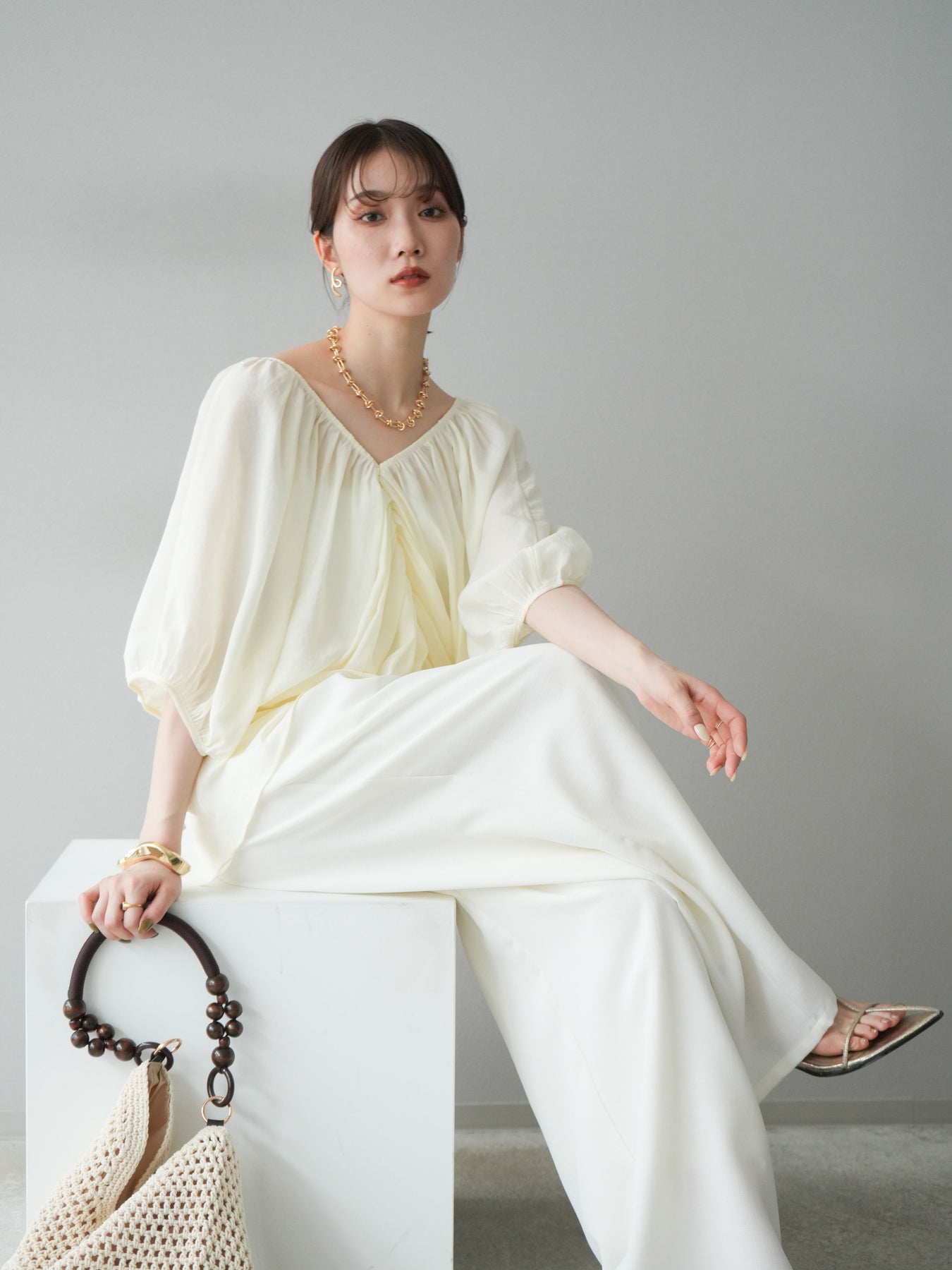 [SET]ボリュームスリーブシアータックブラウス+リネンライクイージーワイドパンツ(2set)