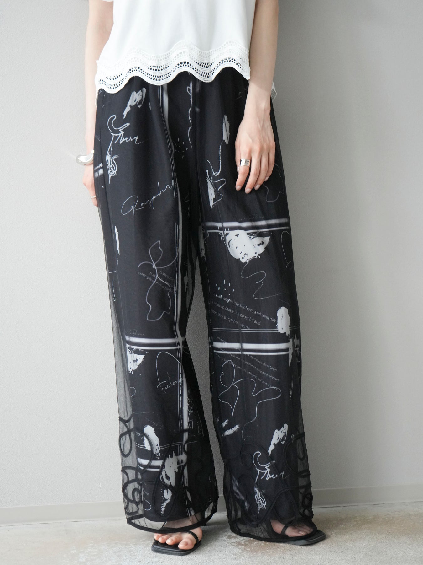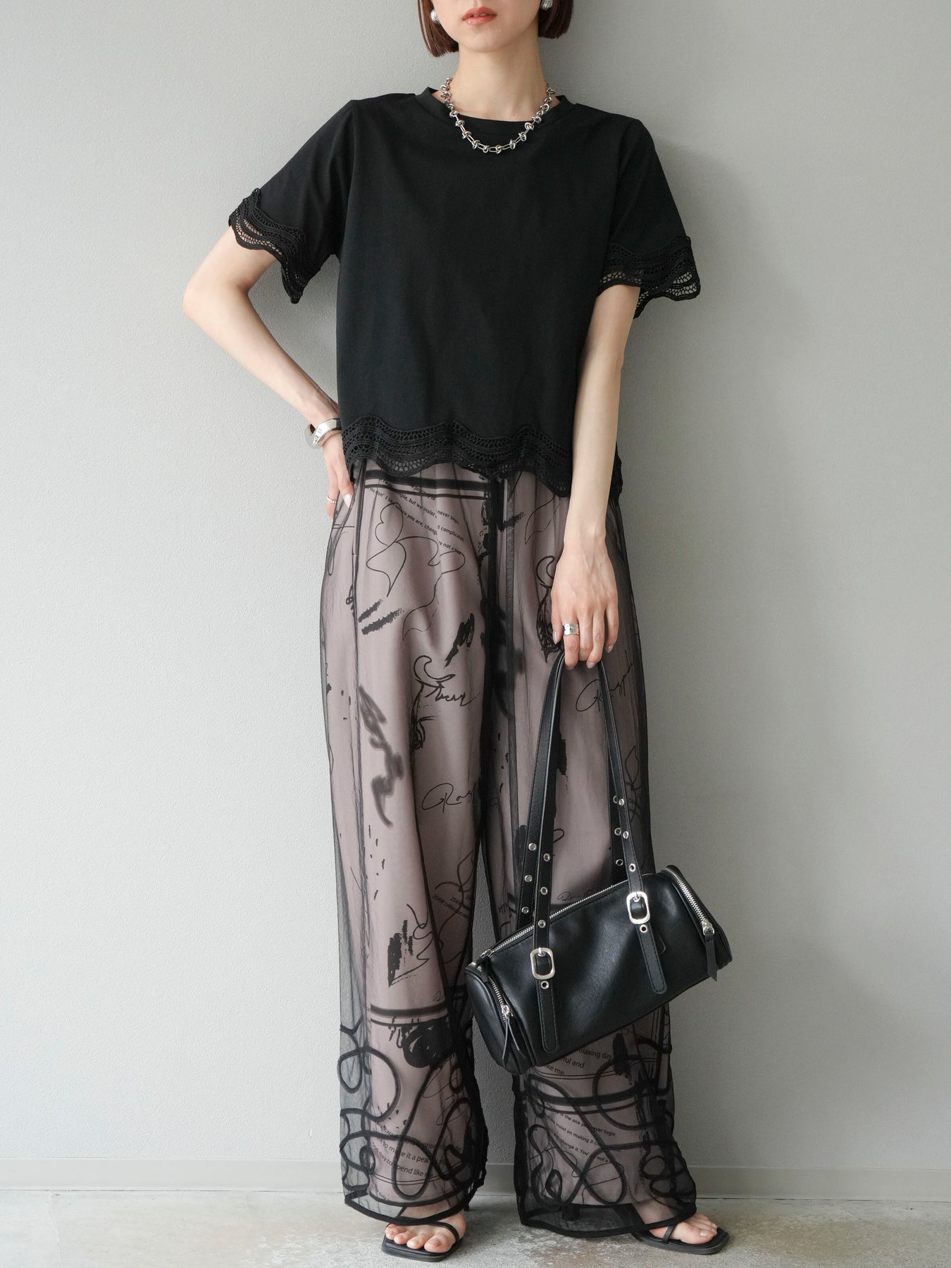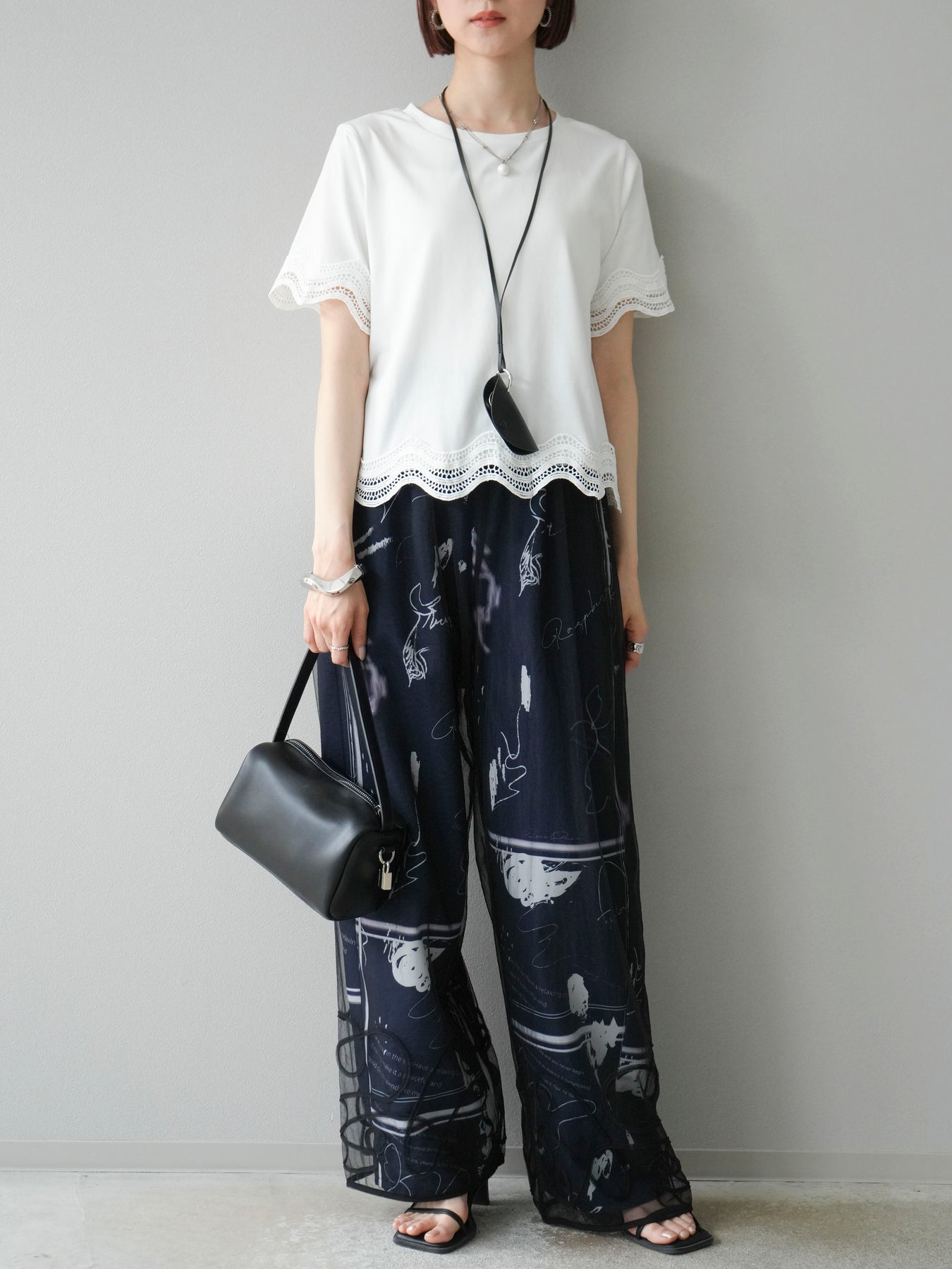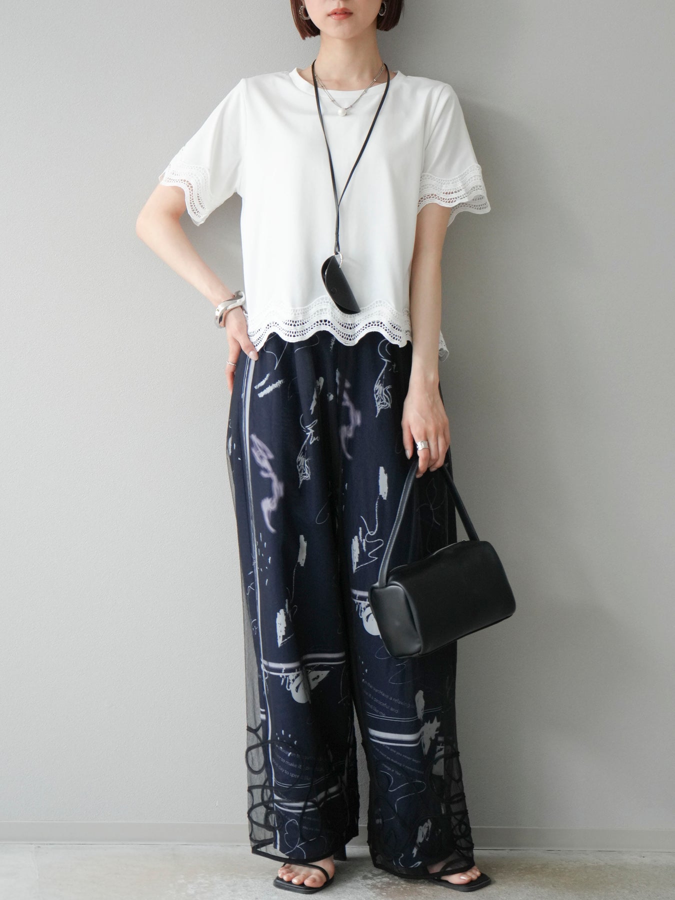 [SET]コード刺繍チュールレイヤードパンツ+ペイント柄タックパンツ(2set)