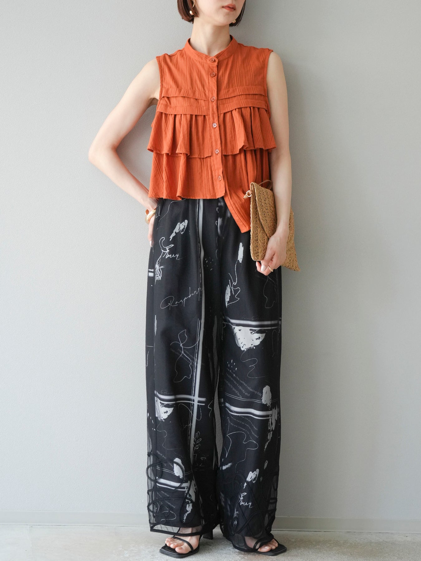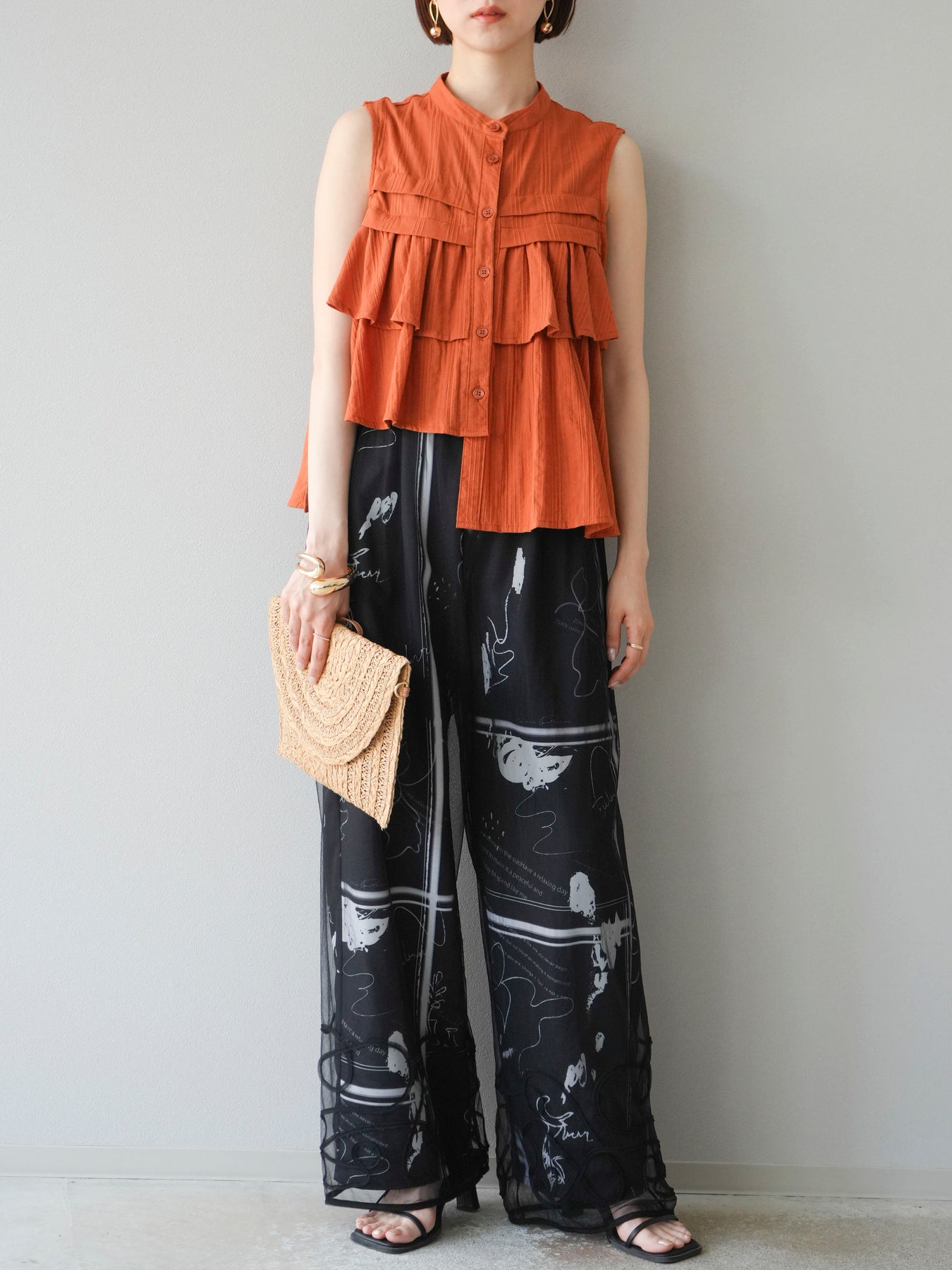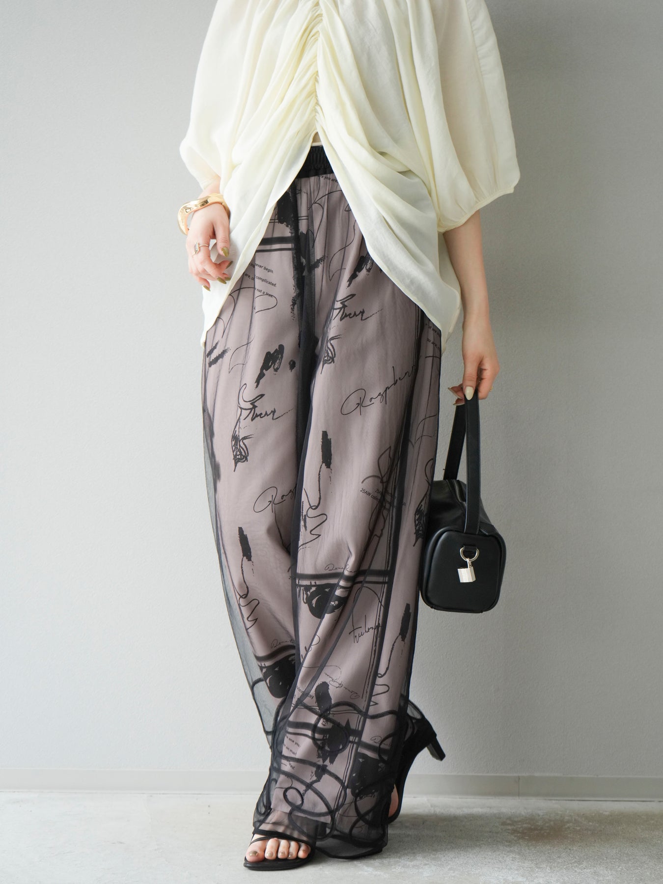 [SET]コード刺繍チュールレイヤードパンツ+ペイント柄タックパンツ(2set)