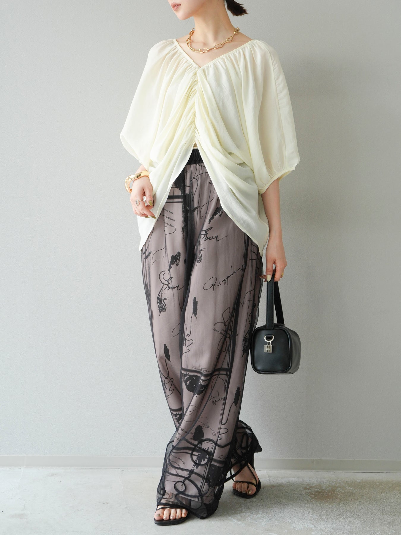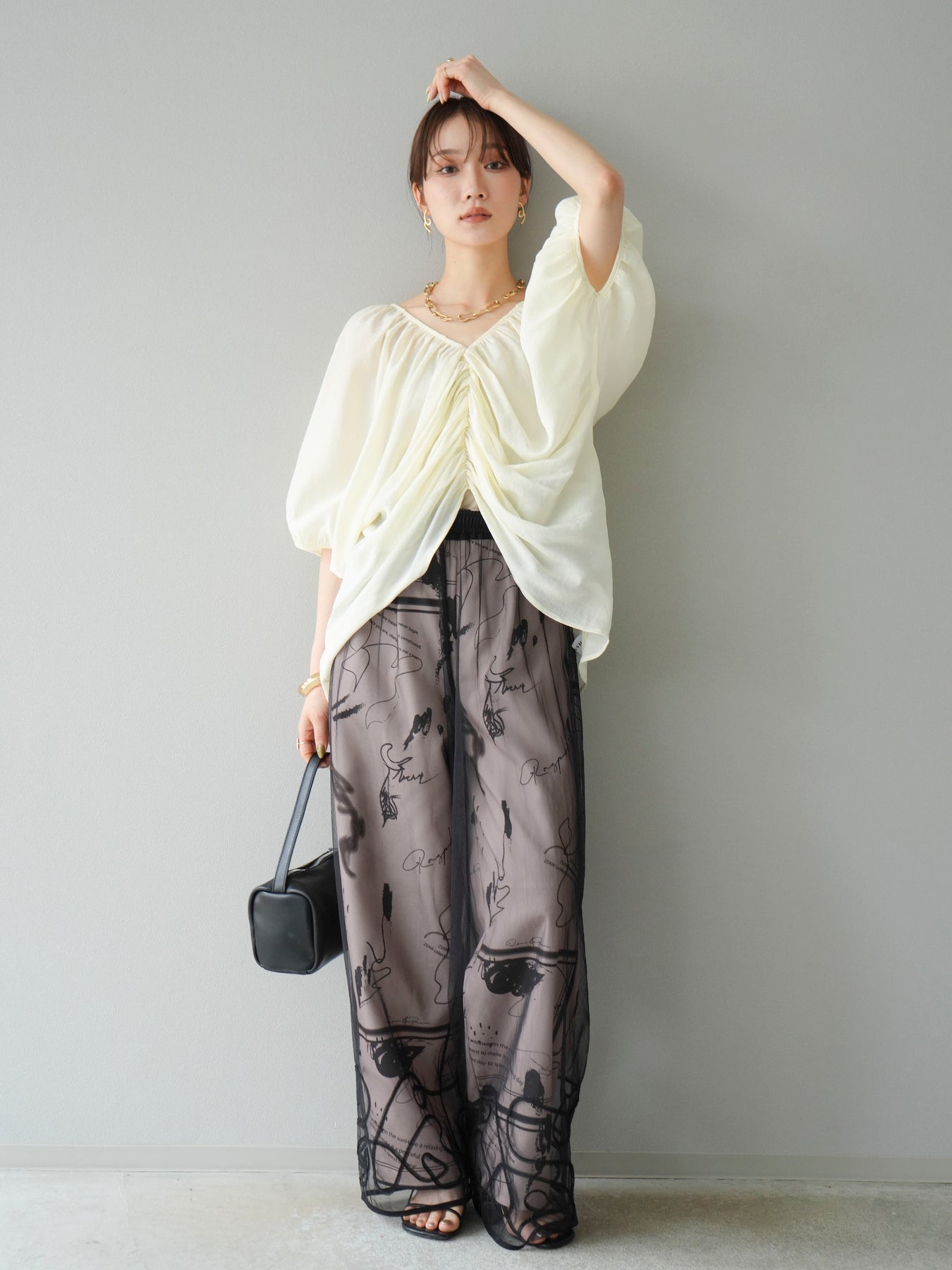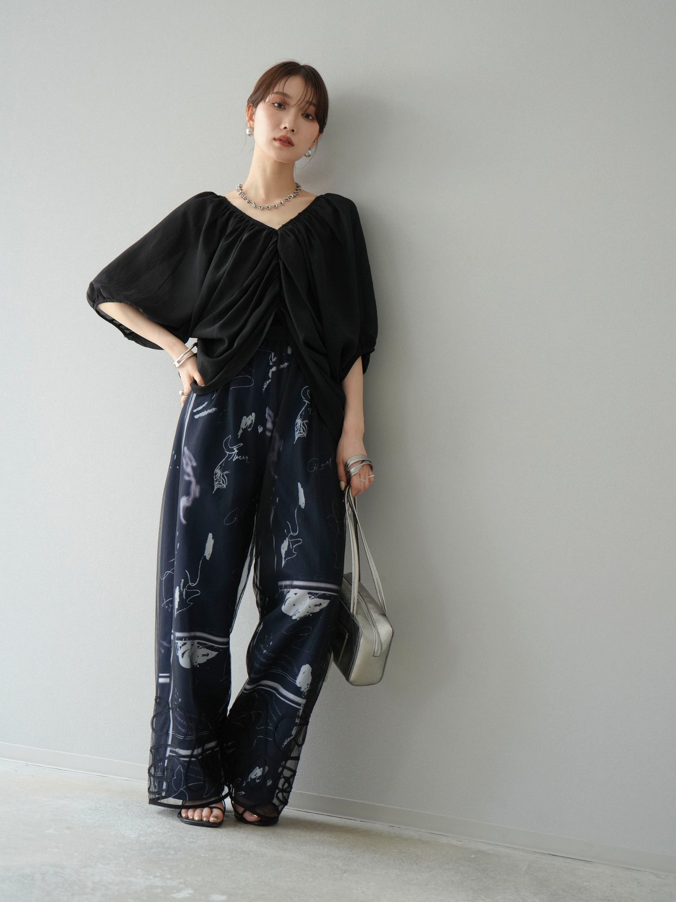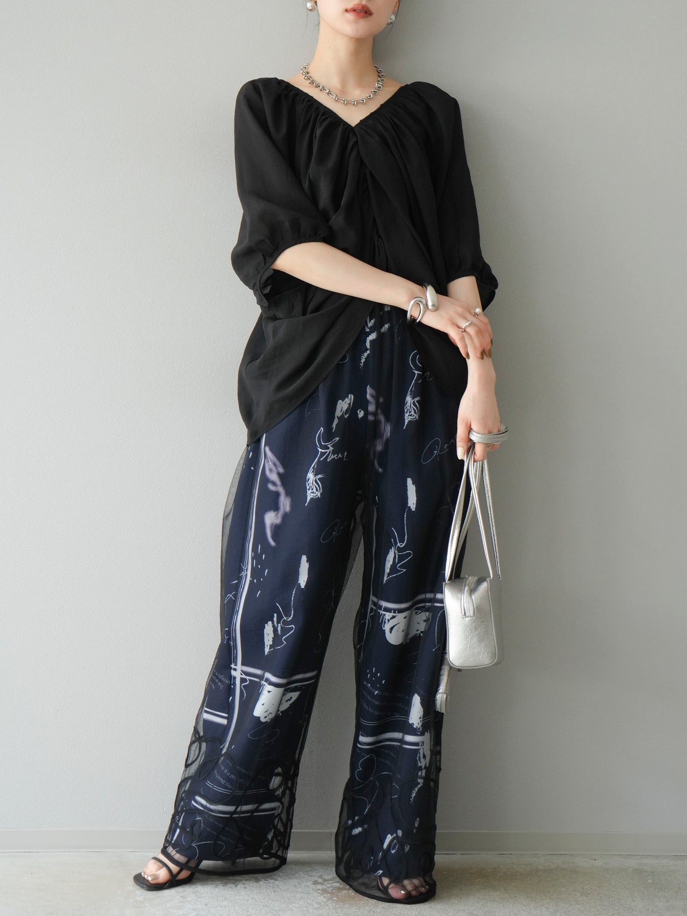 [SET]コード刺繍チュールレイヤードパンツ+ペイント柄タックパンツ(2set)