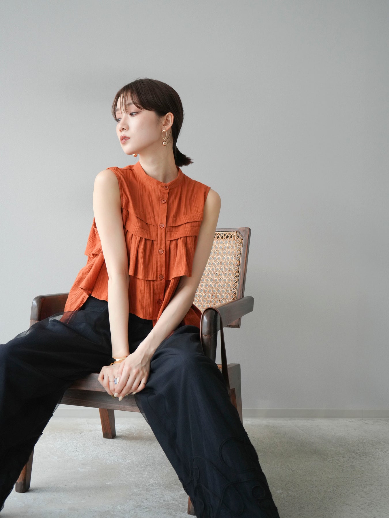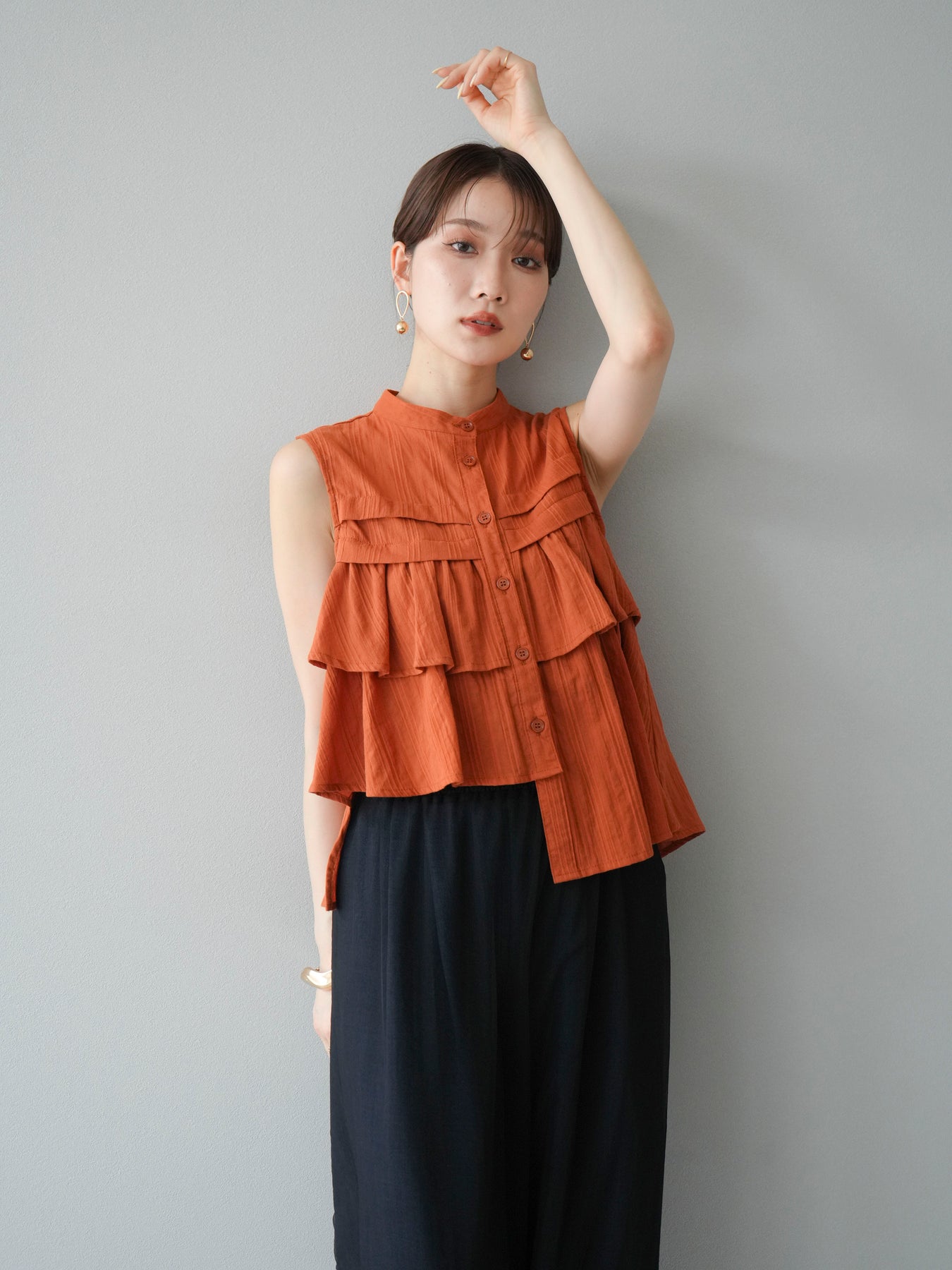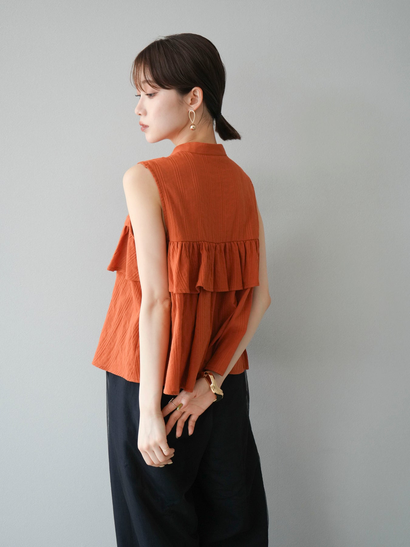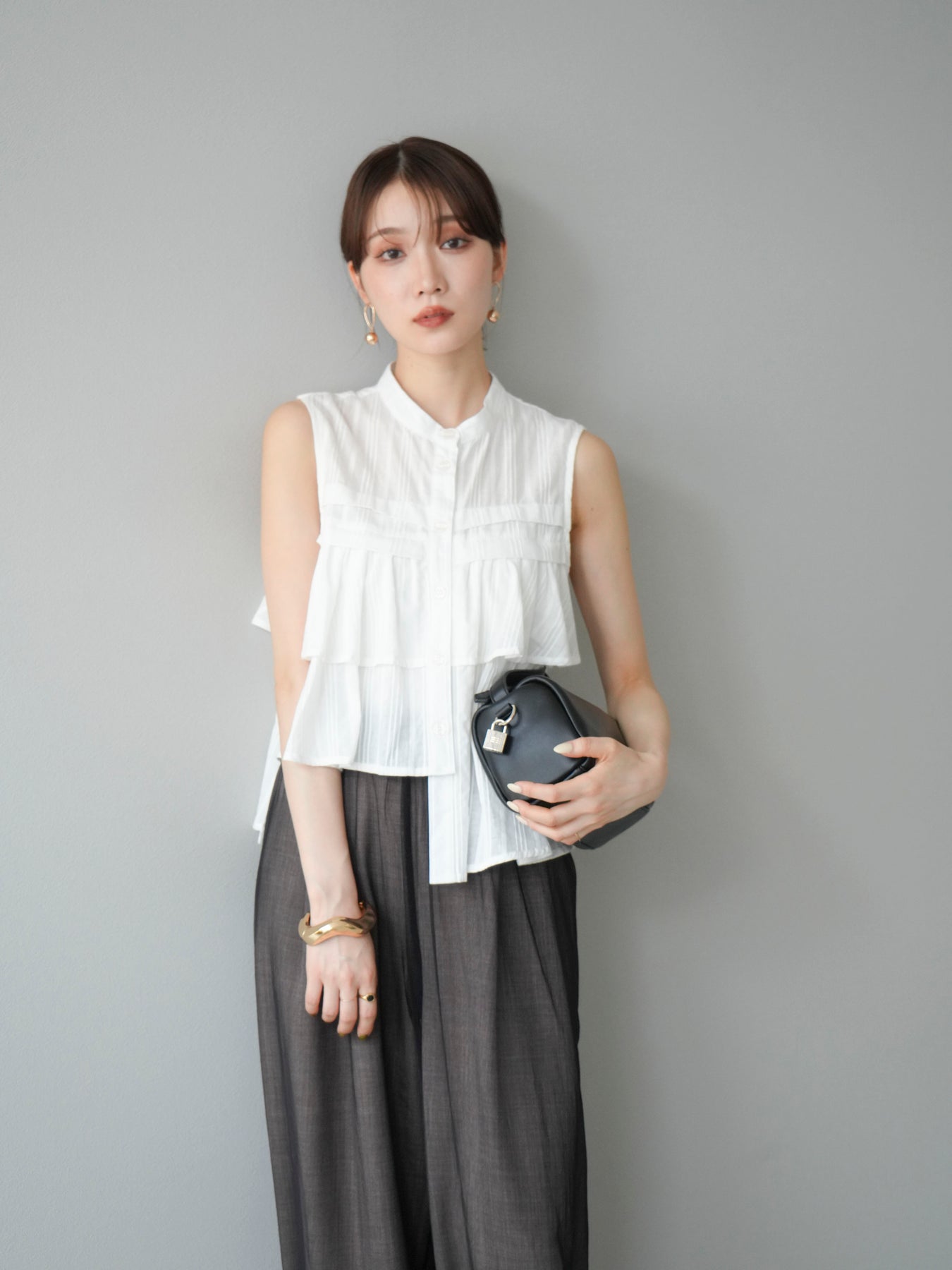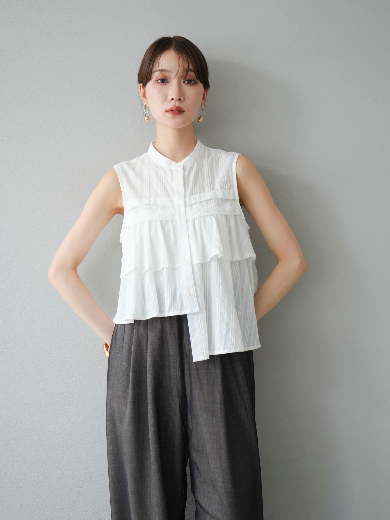 繊細なドビーストライプ生地を使用し、軽やかでフェミニンな印象に仕上げたノースリーブブラウス。 フロントに施されたアシンメトリーなフリルが目を惹き、シンプルながらも存在感のあるデザインです。 すっきりとしたバンドカラーが甘さを程よく引き締め、バランスの良い大人フェミニンなスタイルを演出。 肩まわりをカバーする程よいノースリーブラインで、ノースリーブ初心者の方にも取り入れやすい一枚です。 パンツにもスカートにも合わせやすく、デイリーからお出かけまで幅広く活躍。 ナチュラルな表情とこなれ感を同時に叶える、夏の主役ブラウスです。