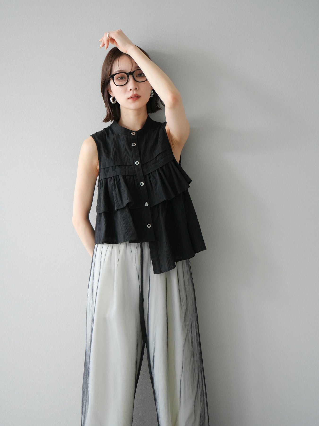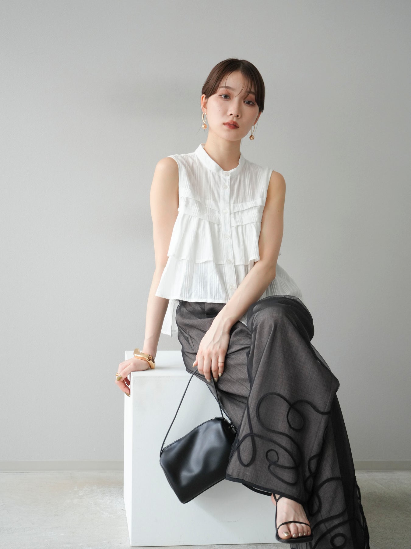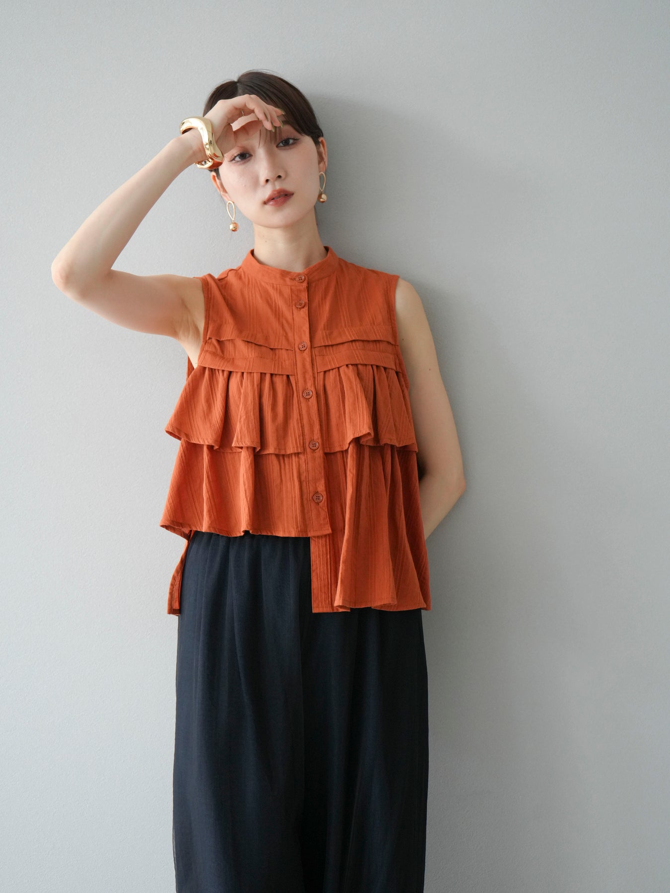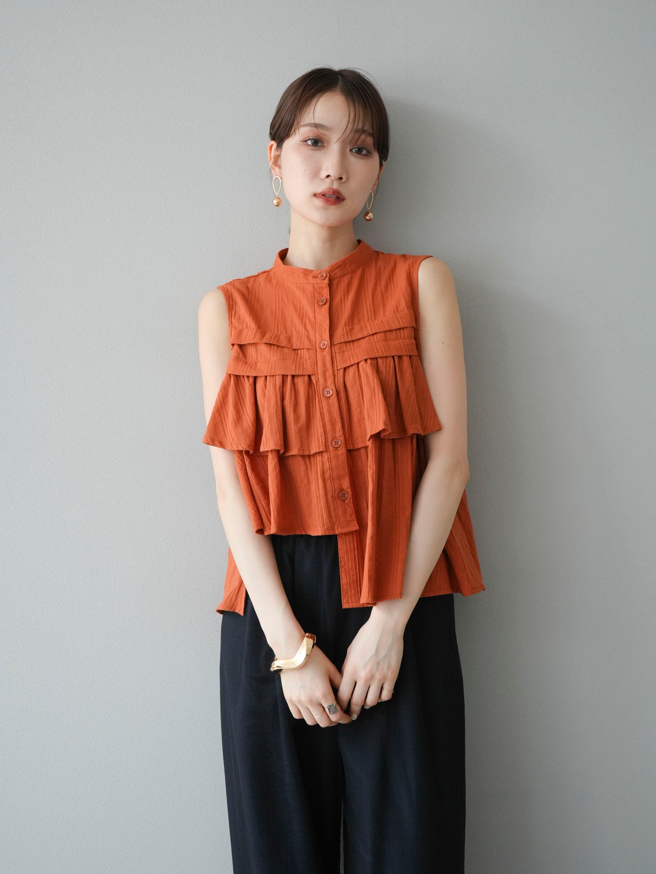 繊細なドビーストライプ生地を使用し、軽やかでフェミニンな印象に仕上げたノースリーブブラウス。 フロントに施されたアシンメトリーなフリルが目を惹き、シンプルながらも存在感のあるデザインです。 すっきりとしたバンドカラーが甘さを程よく引き締め、バランスの良い大人フェミニンなスタイルを演出。 肩まわりをカバーする程よいノースリーブラインで、ノースリーブ初心者の方にも取り入れやすい一枚です。 パンツにもスカートにも合わせやすく、デイリーからお出かけまで幅広く活躍。 ナチュラルな表情とこなれ感を同時に叶える、夏の主役ブラウスです。