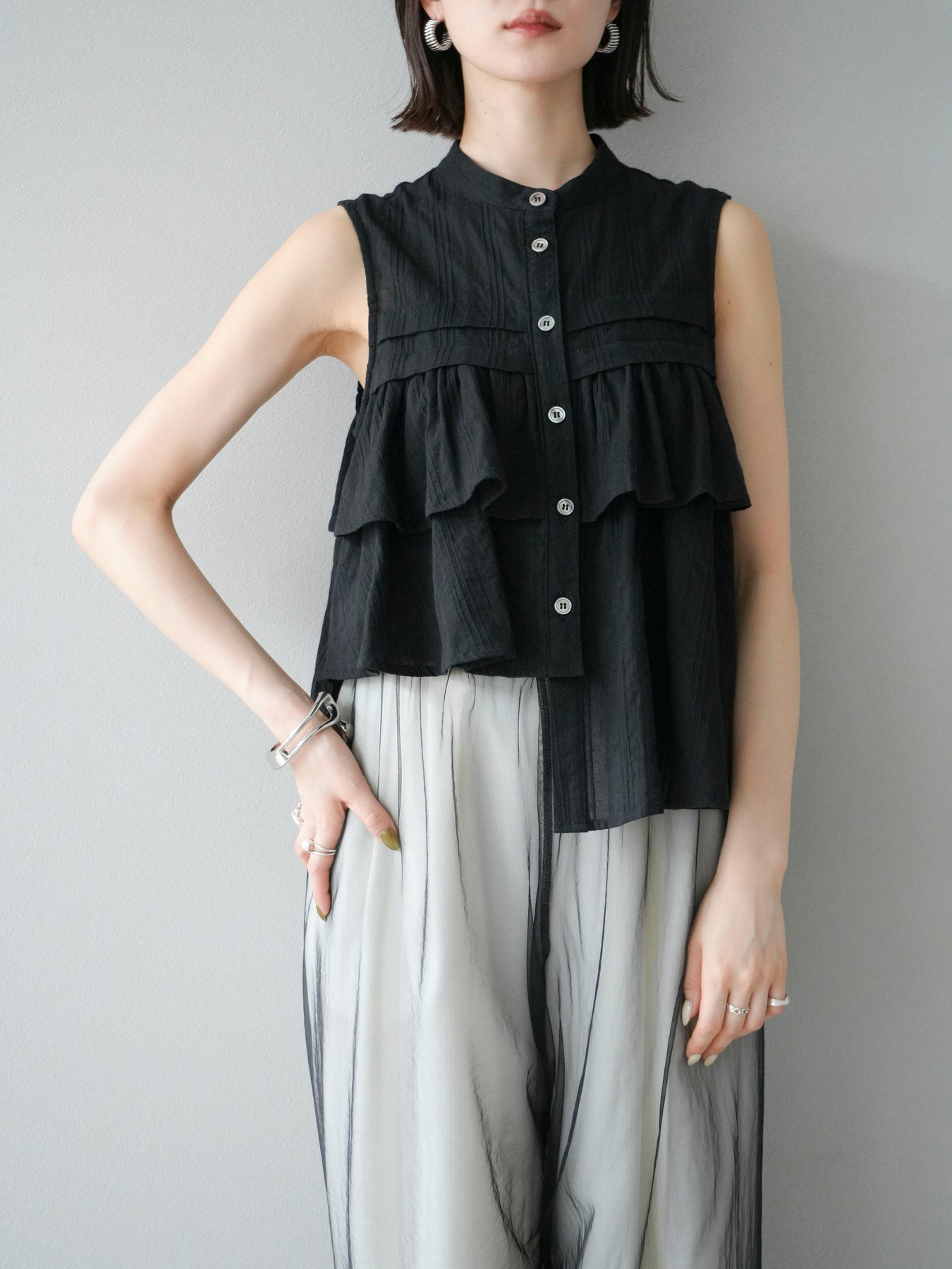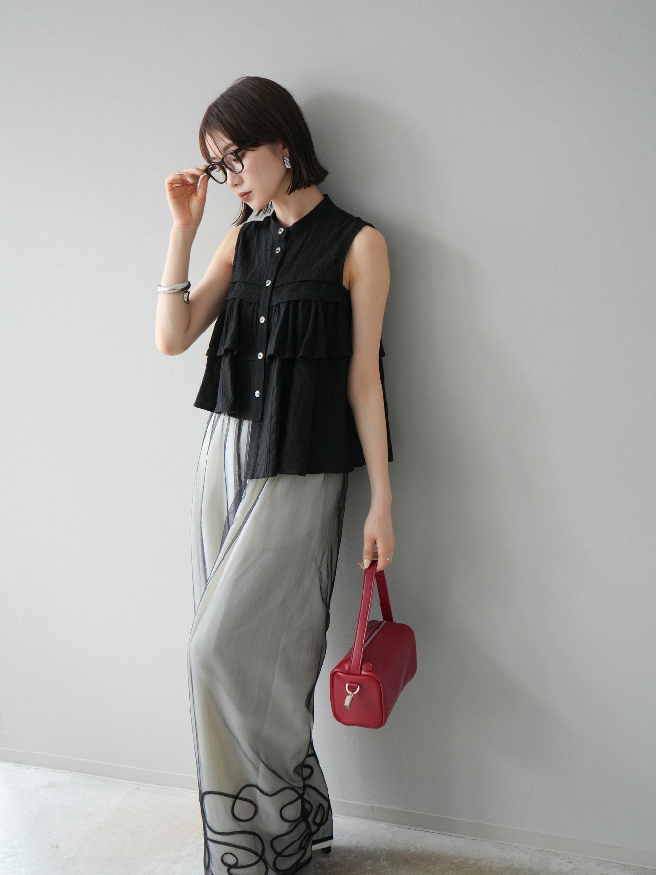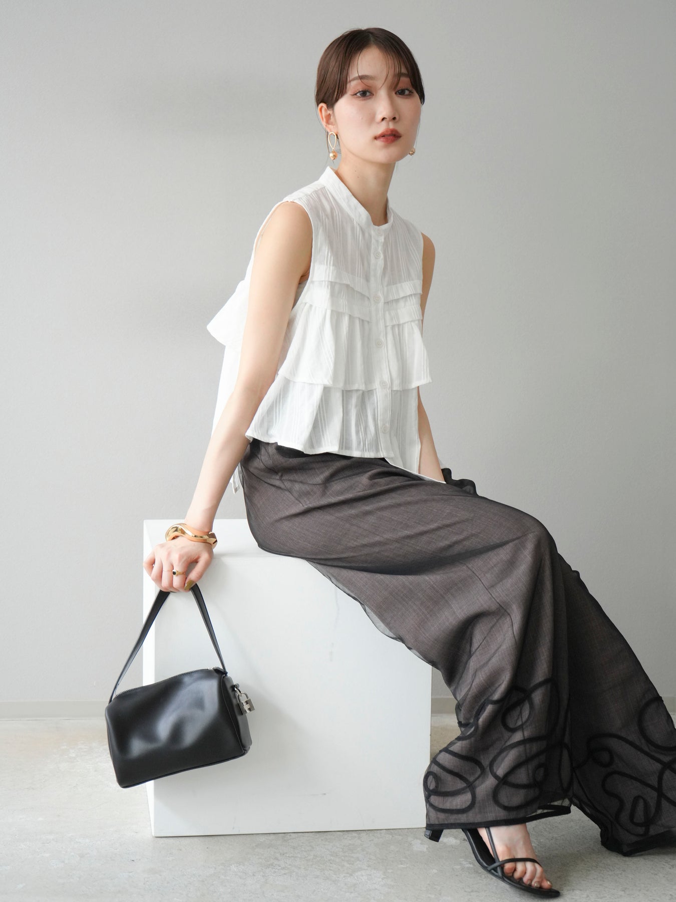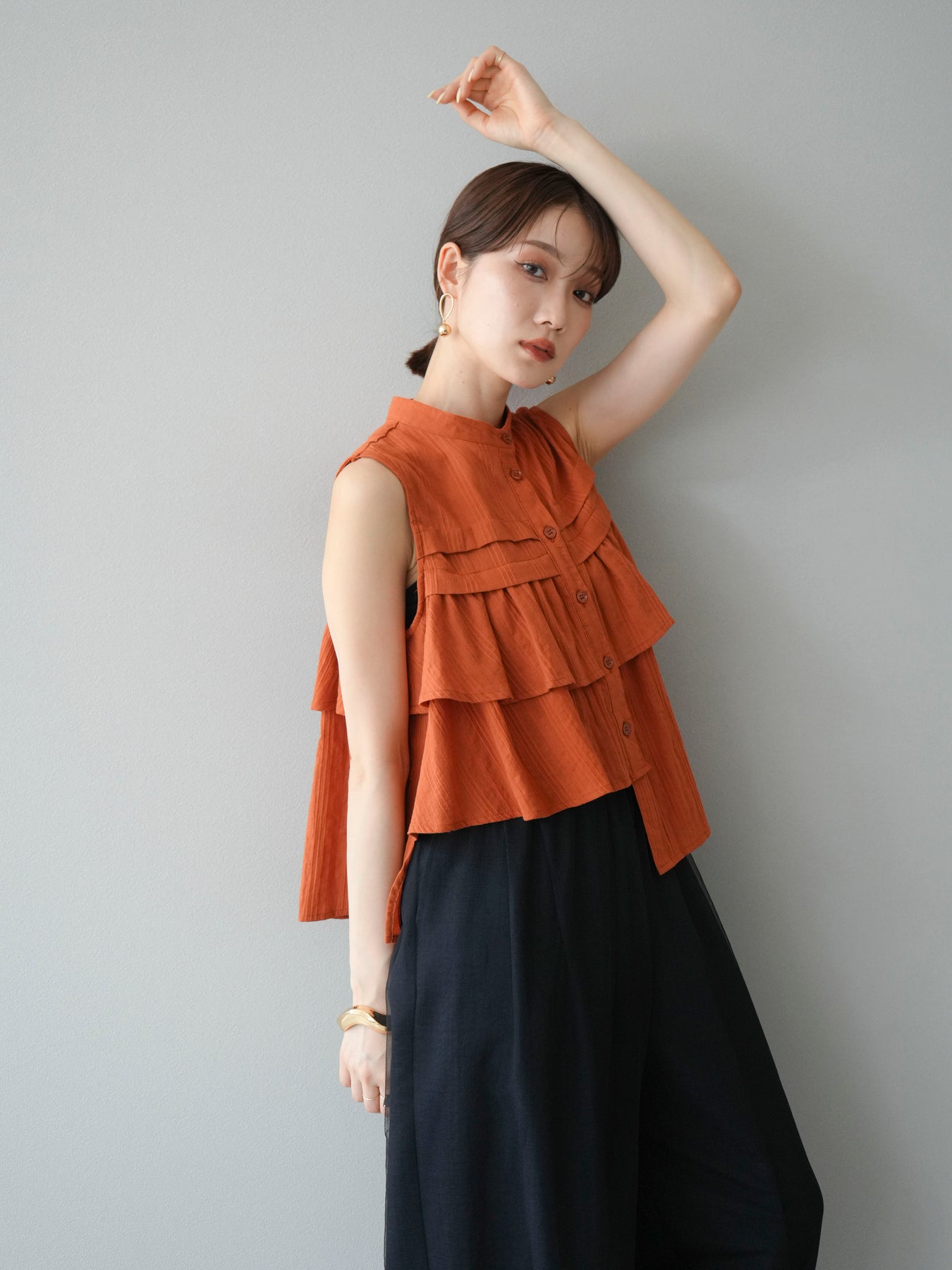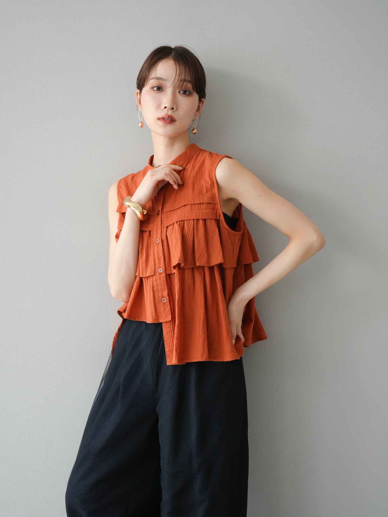 繊細なドビーストライプ生地を使用し、軽やかでフェミニンな印象に仕上げたノースリーブブラウス。 フロントに施されたアシンメトリーなフリルが目を惹き、シンプルながらも存在感のあるデザインです。 すっきりとしたバンドカラーが甘さを程よく引き締め、バランスの良い大人フェミニンなスタイルを演出。 肩まわりをカバーする程よいノースリーブラインで、ノースリーブ初心者の方にも取り入れやすい一枚です。 パンツにもスカートにも合わせやすく、デイリーからお出かけまで幅広く活躍。 ナチュラルな表情とこなれ感を同時に叶える、夏の主役ブラウスです。