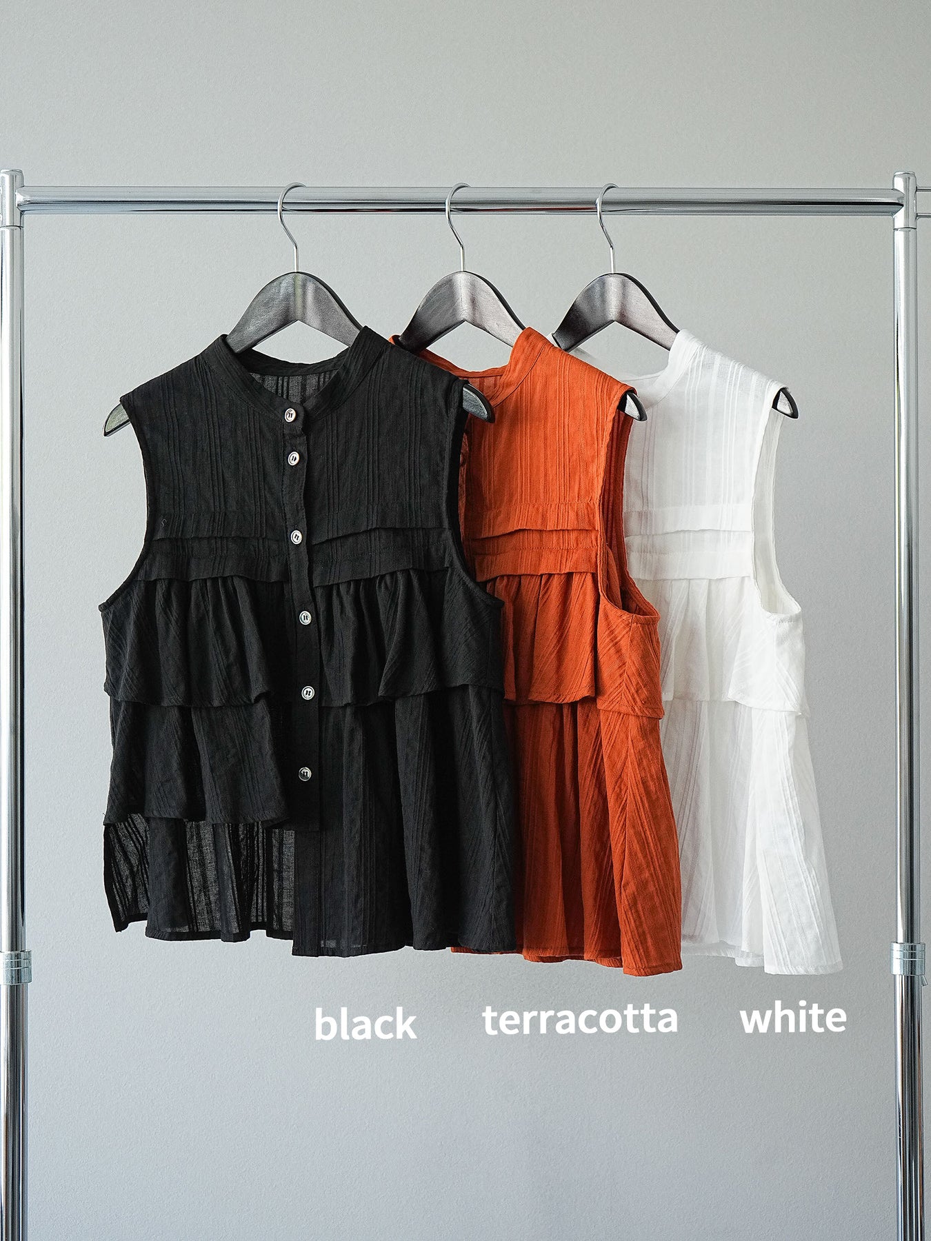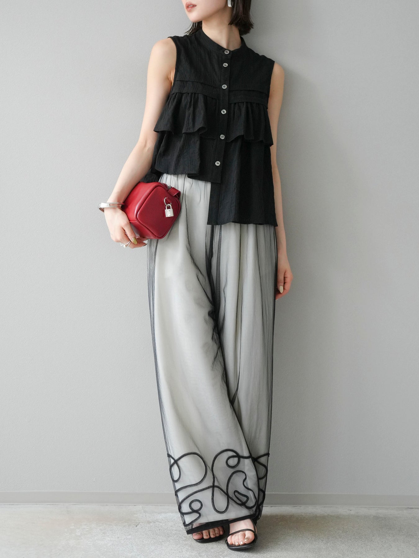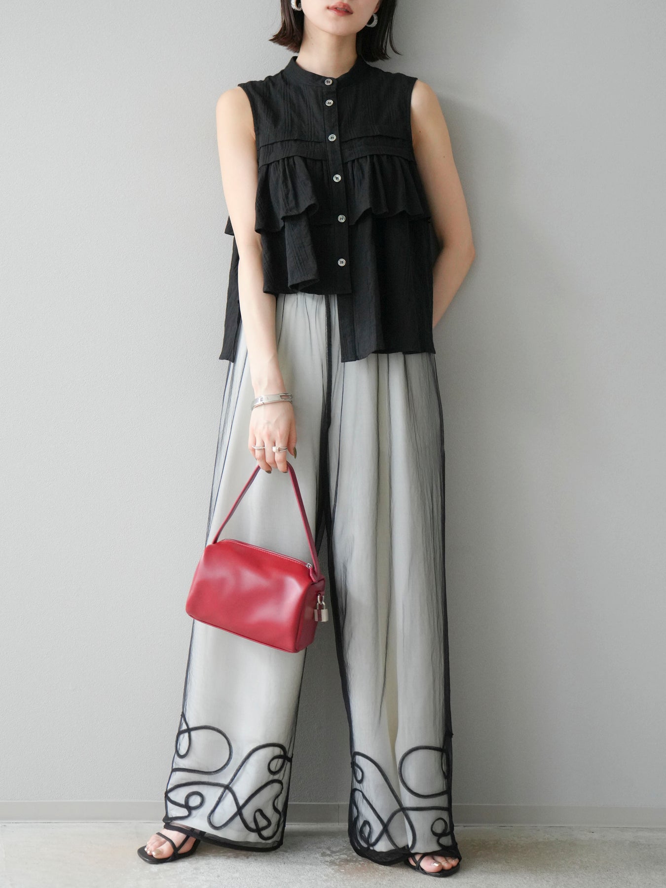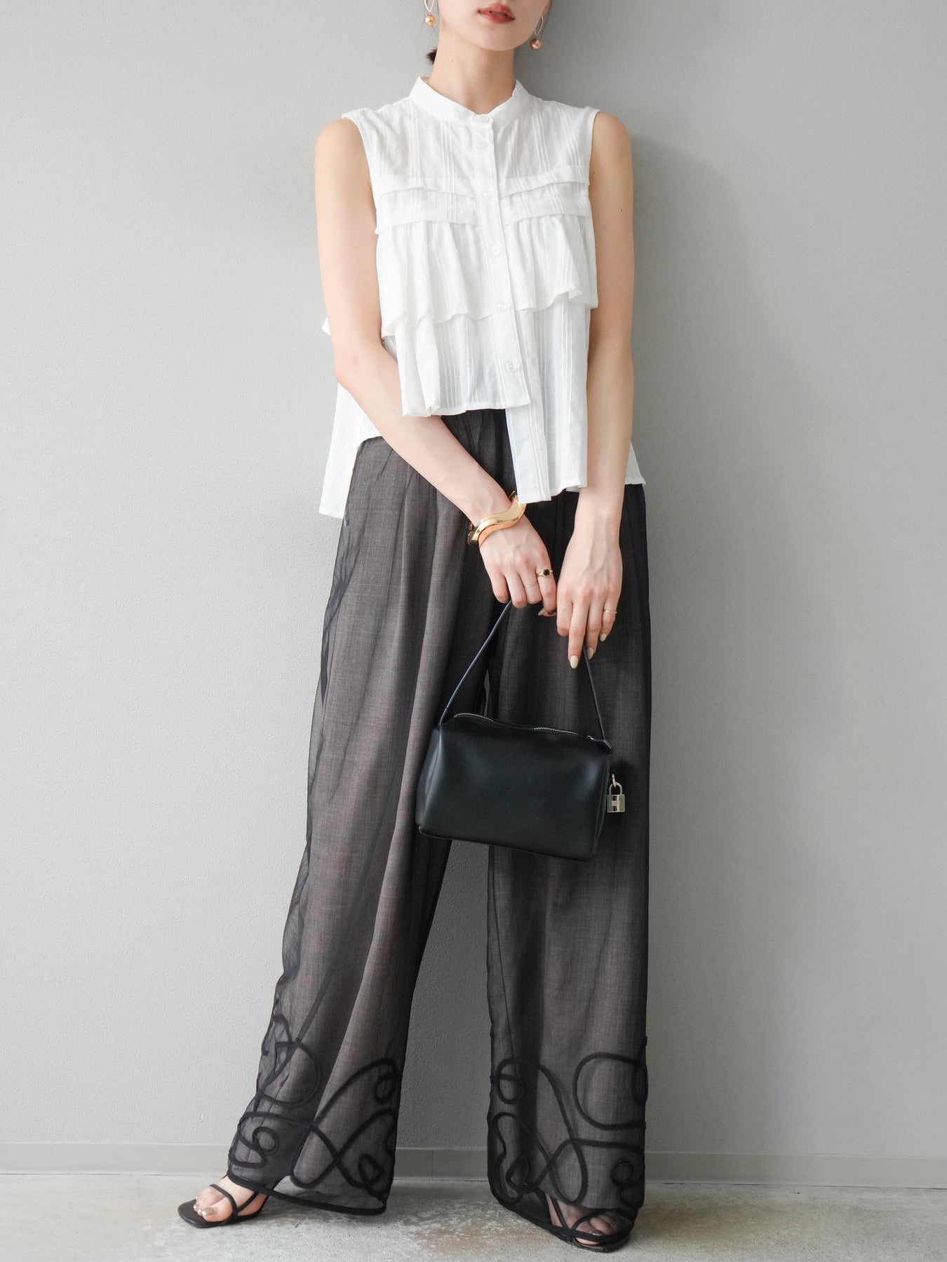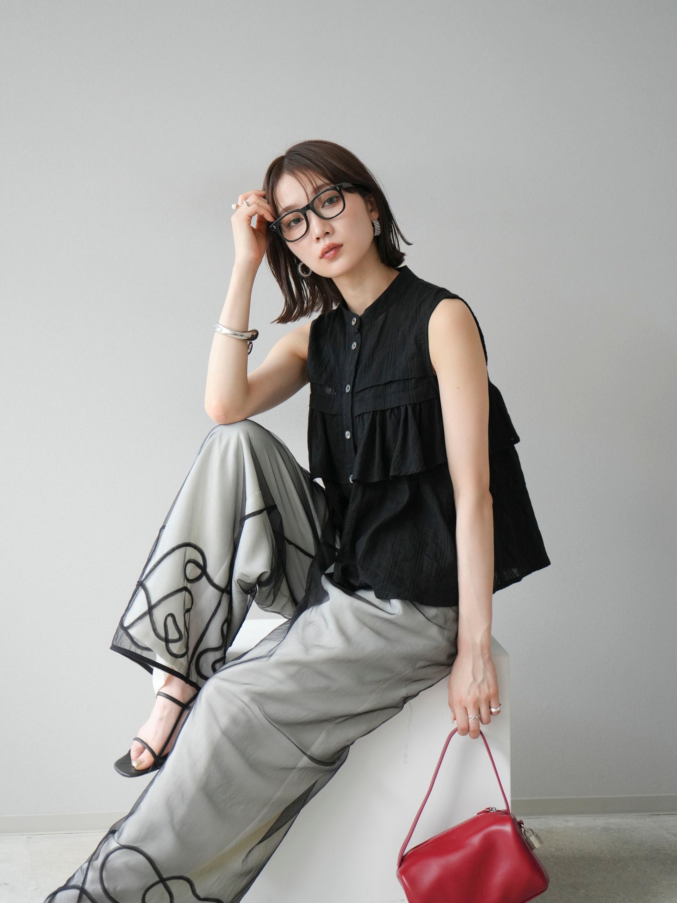 繊細なドビーストライプ生地を使用し、軽やかでフェミニンな印象に仕上げたノースリーブブラウス。 フロントに施されたアシンメトリーなフリルが目を惹き、シンプルながらも存在感のあるデザインです。 すっきりとしたバンドカラーが甘さを程よく引き締め、バランスの良い大人フェミニンなスタイルを演出。 肩まわりをカバーする程よいノースリーブラインで、ノースリーブ初心者の方にも取り入れやすい一枚です。 パンツにもスカートにも合わせやすく、デイリーからお出かけまで幅広く活躍。 ナチュラルな表情とこなれ感を同時に叶える、夏の主役ブラウスです。