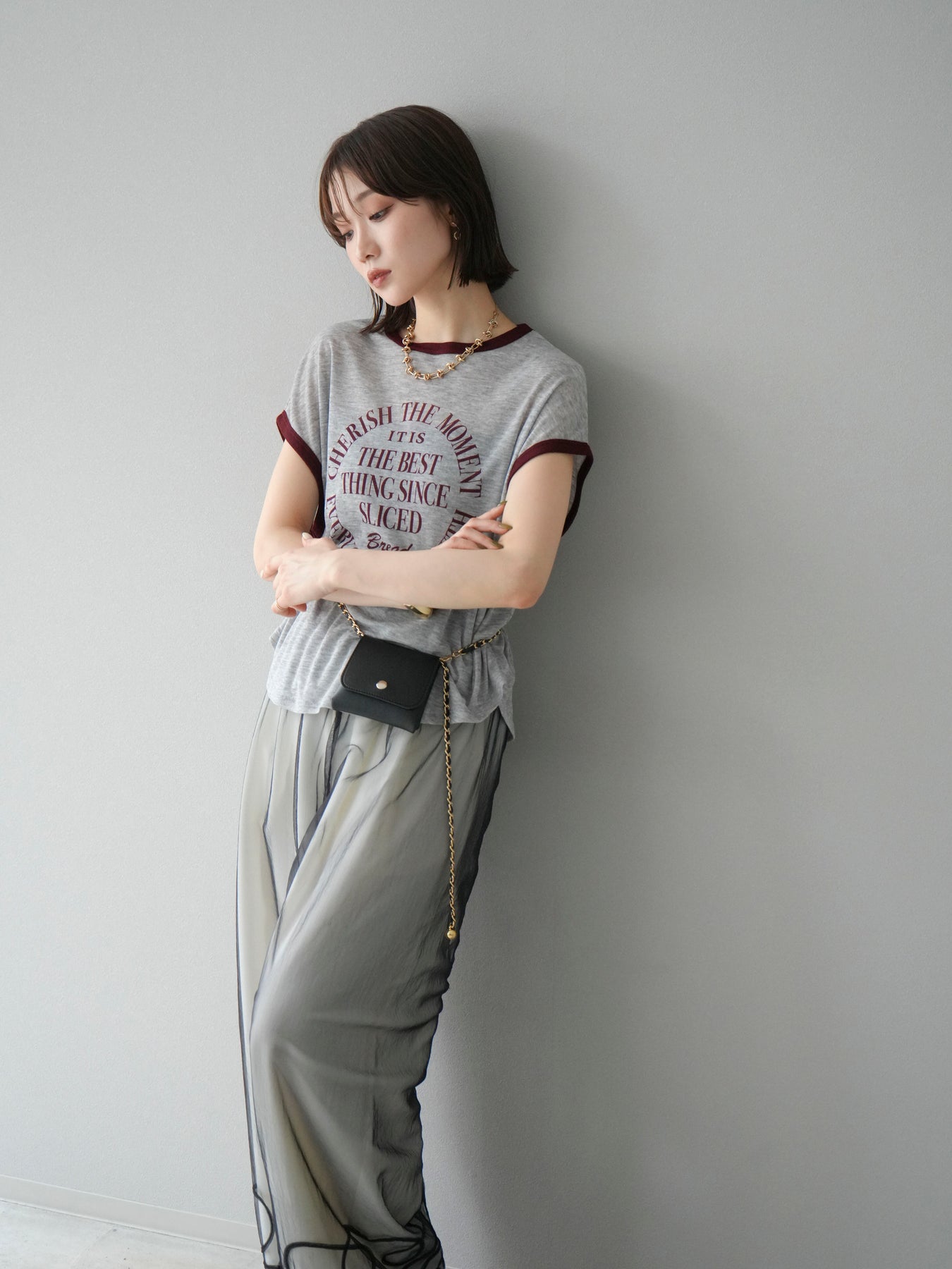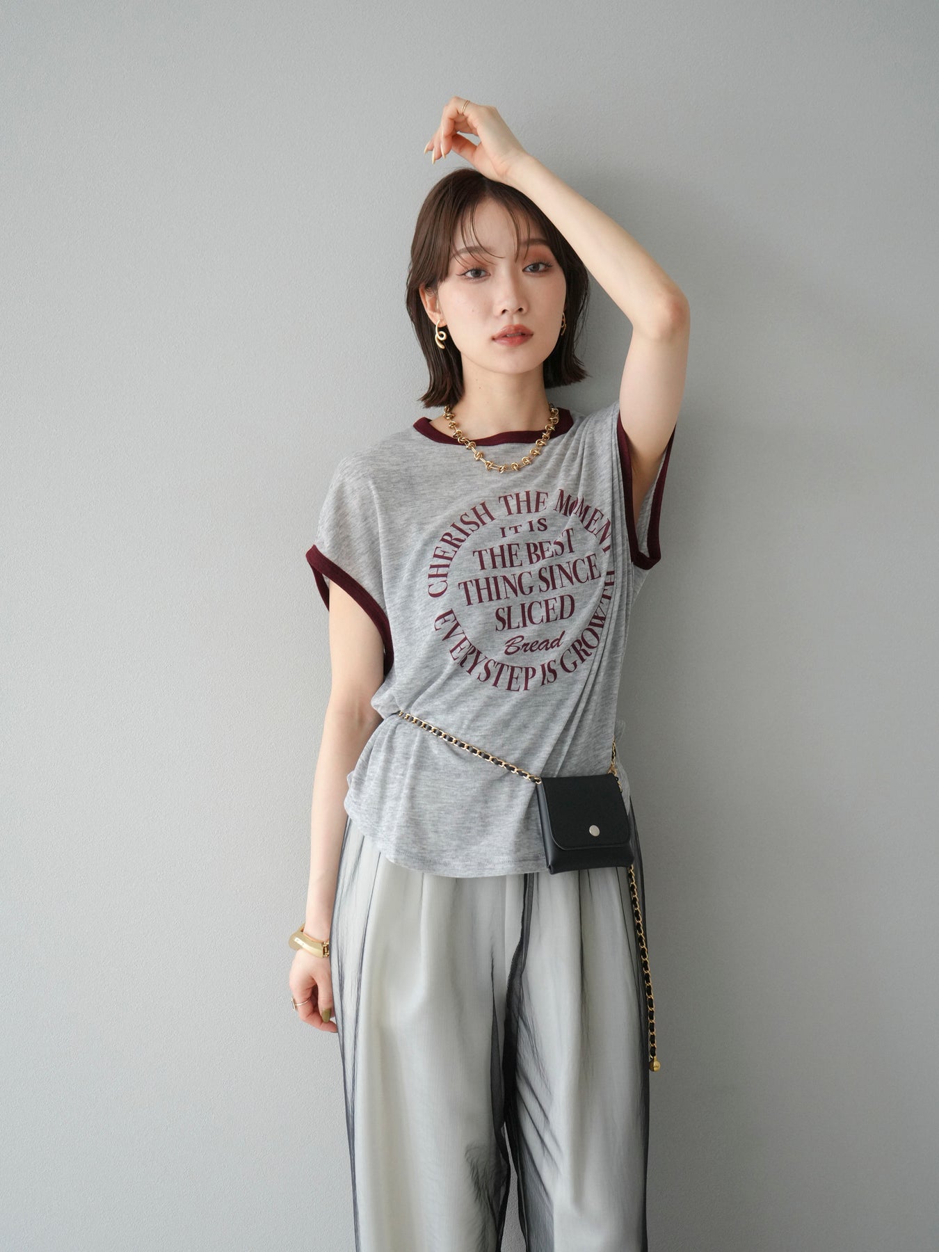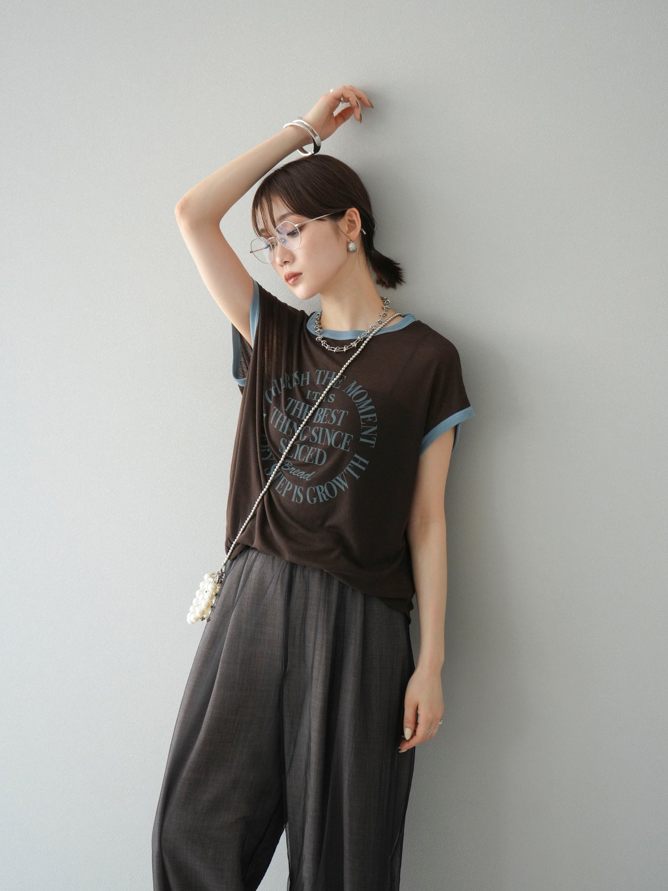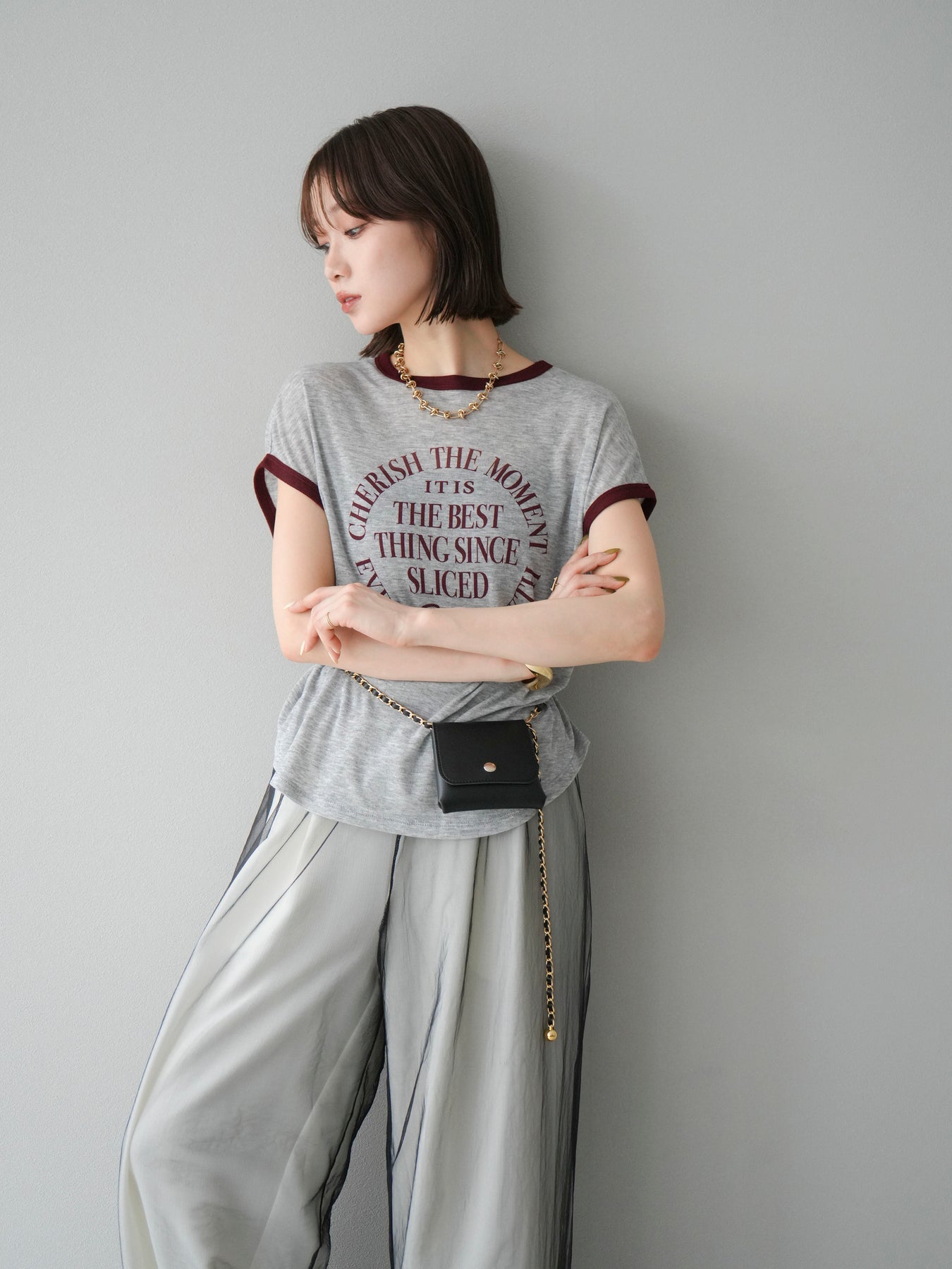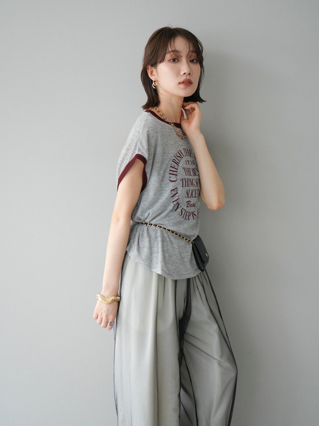 ほどよい透け感と軽やかさが魅力の、シアーフライス素材を使用したロゴプリントTシャツ。 ゆるやかなフレンチスリーブとラウンドした裾のラインが、抜け感のある女性らしいシルエットを演出します。 フロントにはヴィンテージライクなロゴプリントを施し、カジュアルながらも洒落感漂うデザインに。 襟元と袖口に配色リブをあしらい、さりげなくメリハリを効かせたアクセントに仕上げています。 ボリュームスカートやデニムとの相性はもちろん、ジャンスカやサロペットのインナーとしてもおすすめ。 着心地の良さとデザイン性を兼ね備えた、大人のための抜け感Tシャツです。