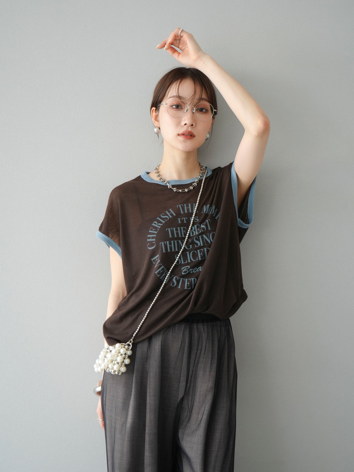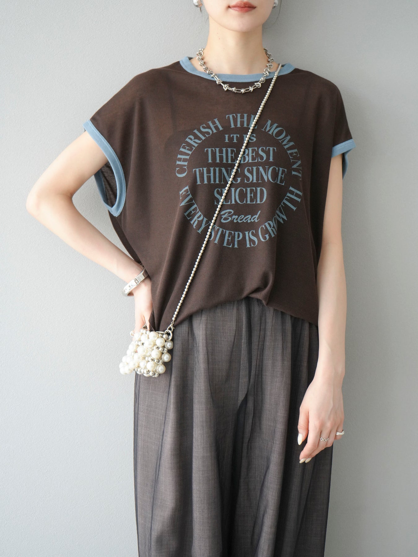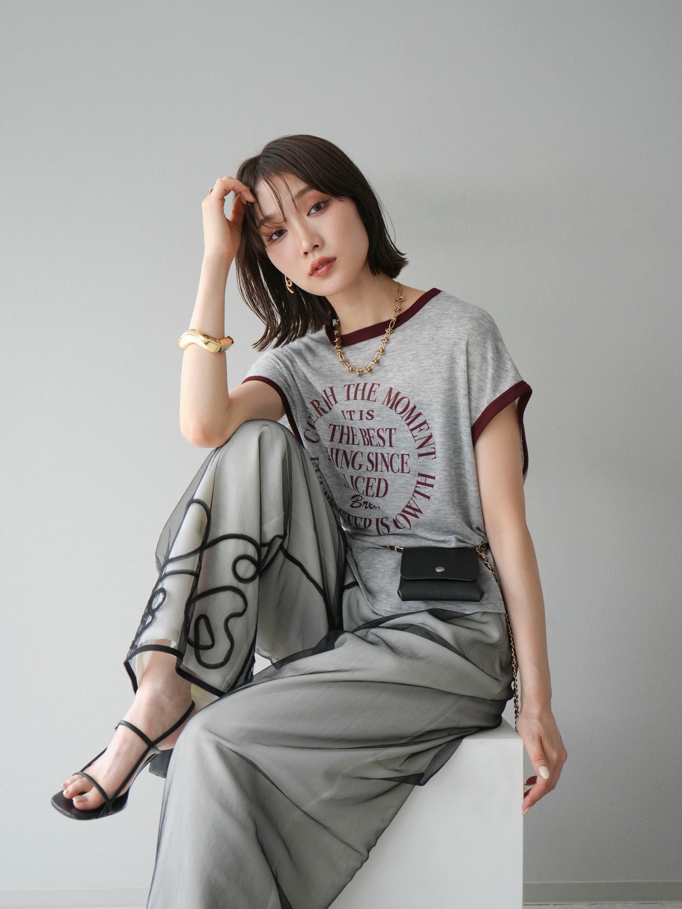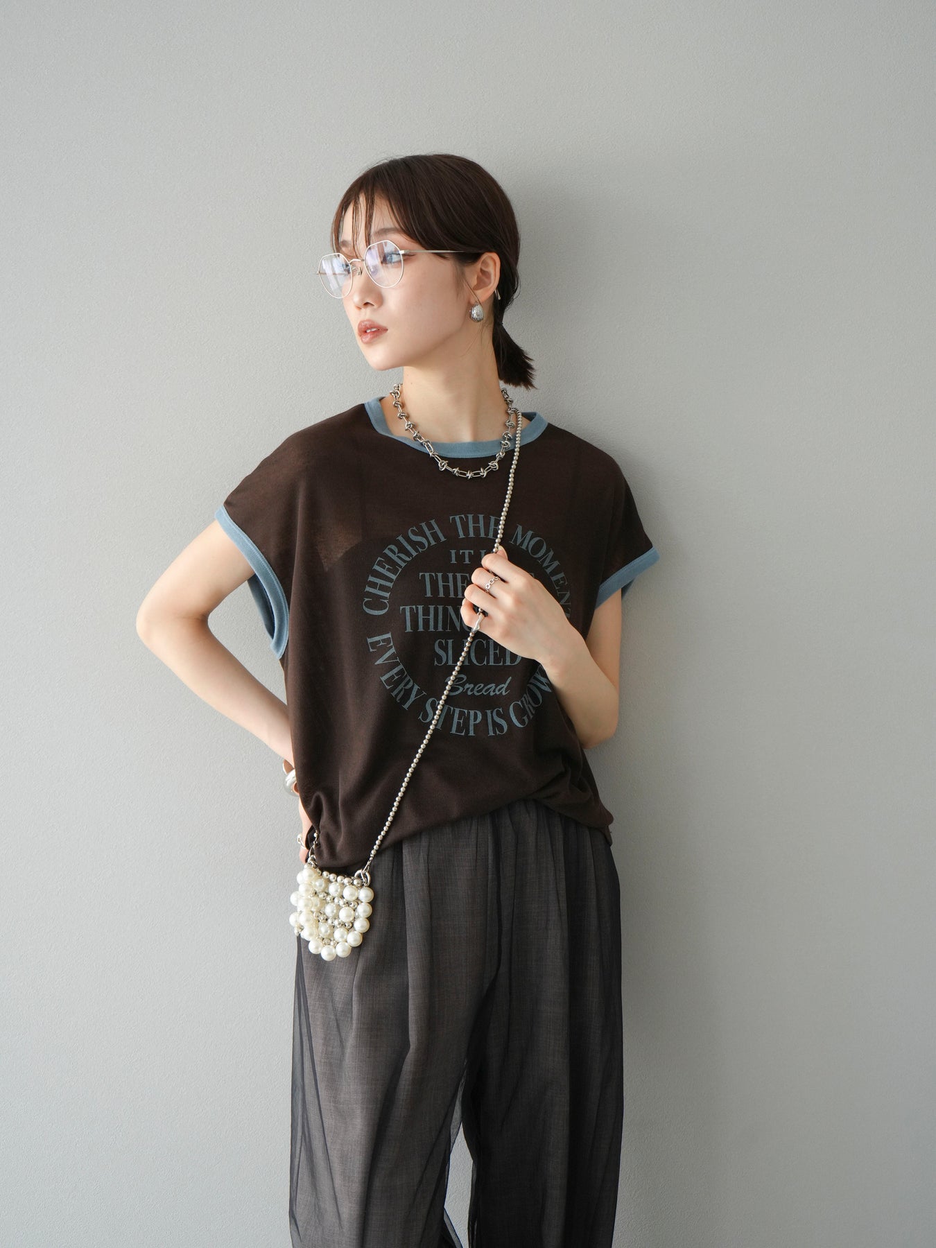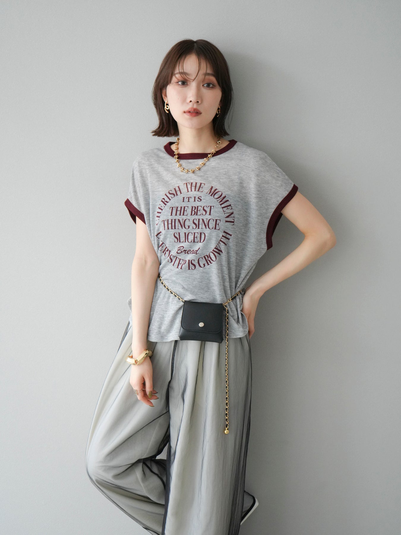ほどよい透け感と軽やかさが魅力の、シアーフライス素材を使用したロゴプリントTシャツ。 ゆるやかなフレンチスリーブとラウンドした裾のラインが、抜け感のある女性らしいシルエットを演出します。 フロントにはヴィンテージライクなロゴプリントを施し、カジュアルながらも洒落感漂うデザインに。 襟元と袖口に配色リブをあしらい、さりげなくメリハリを効かせたアクセントに仕上げています。 ボリュームスカートやデニムとの相性はもちろん、ジャンスカやサロペットのインナーとしてもおすすめ。 着心地の良さとデザイン性を兼ね備えた、大人のための抜け感Tシャツです。