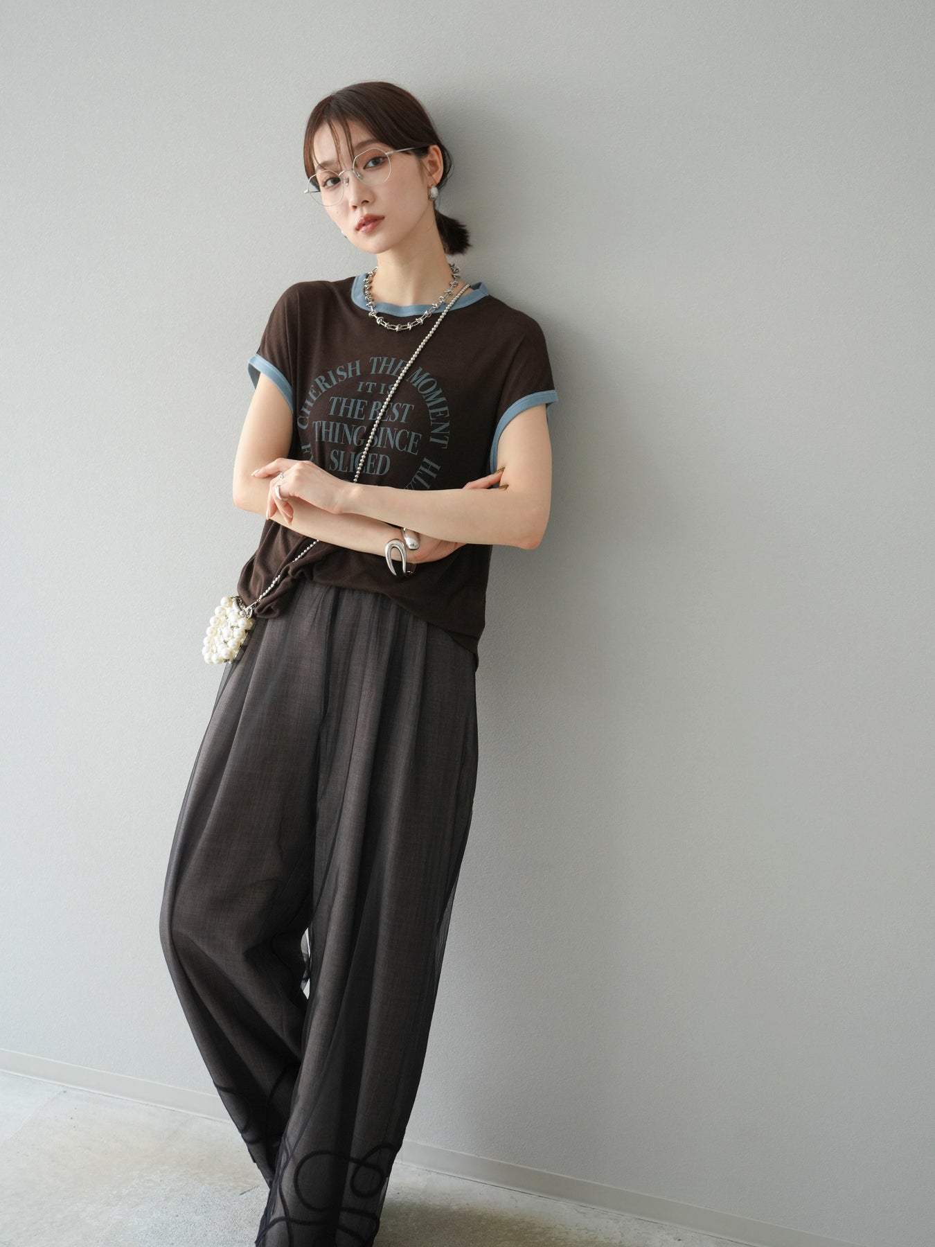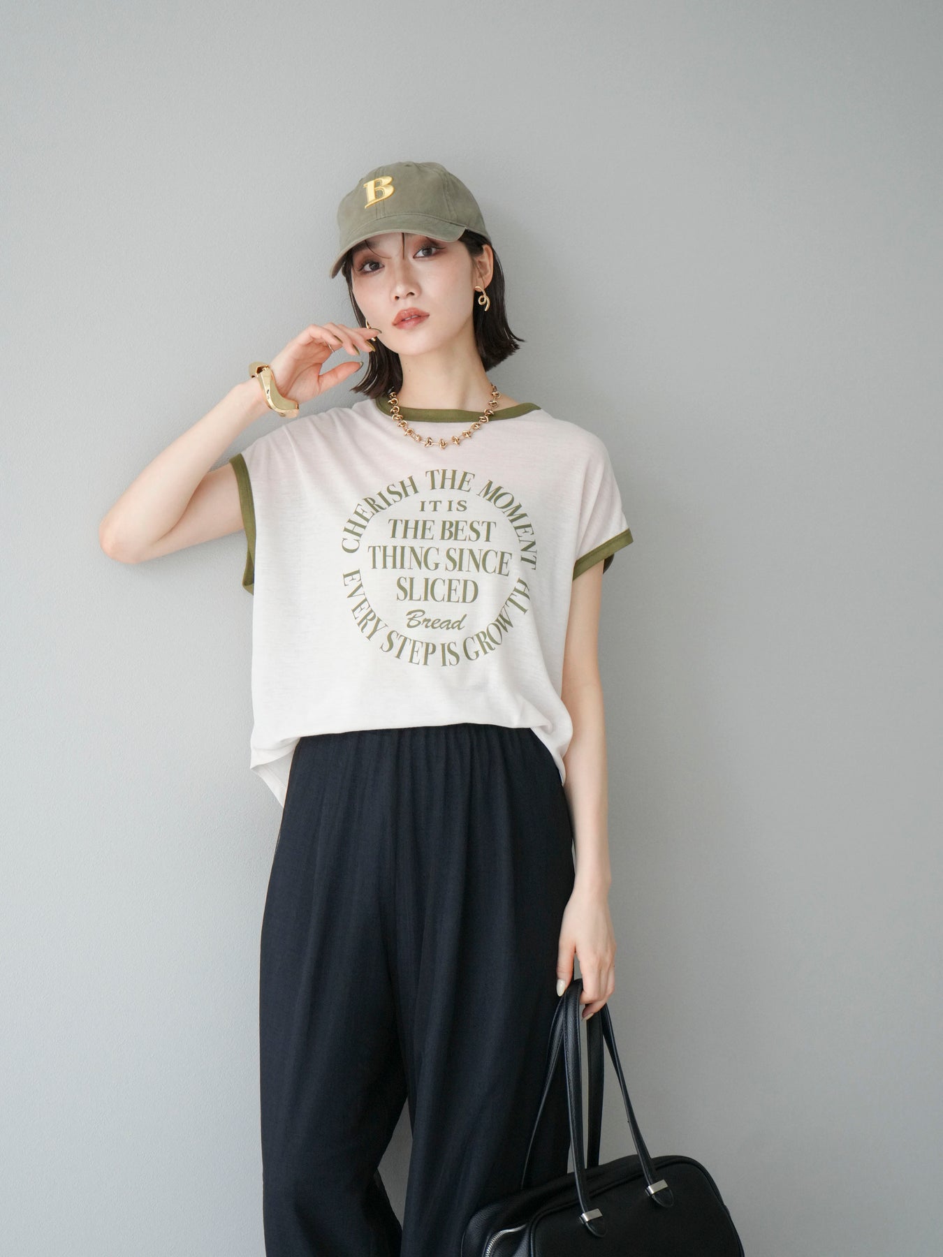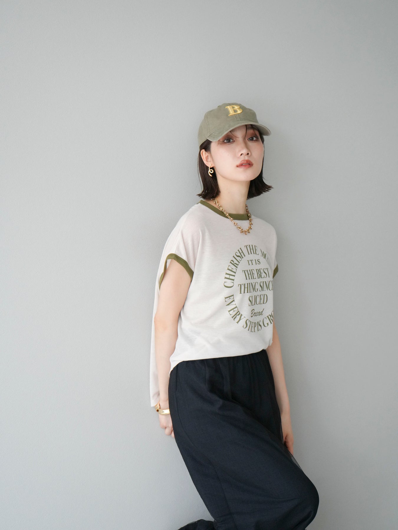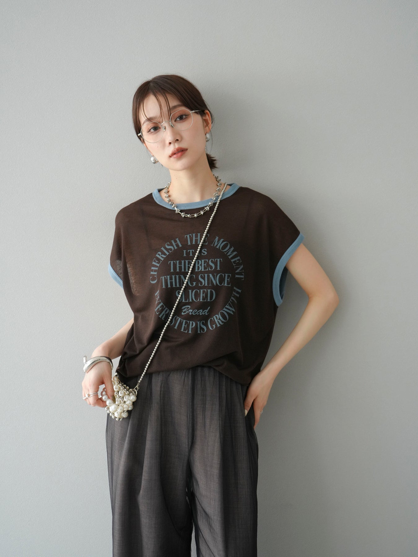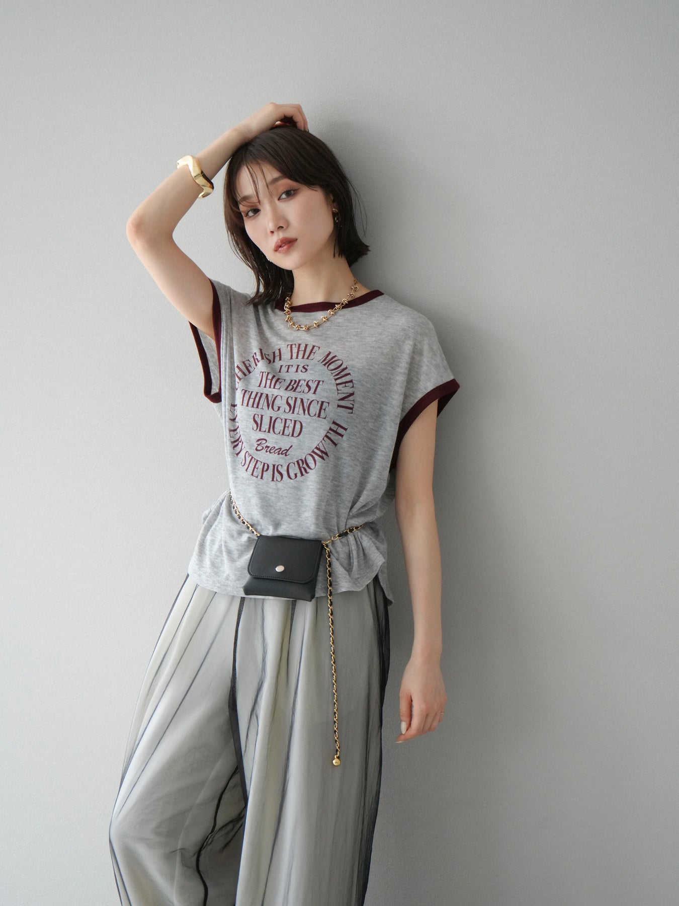 ほどよい透け感と軽やかさが魅力の、シアーフライス素材を使用したロゴプリントTシャツ。 ゆるやかなフレンチスリーブとラウンドした裾のラインが、抜け感のある女性らしいシルエットを演出します。 フロントにはヴィンテージライクなロゴプリントを施し、カジュアルながらも洒落感漂うデザインに。 襟元と袖口に配色リブをあしらい、さりげなくメリハリを効かせたアクセントに仕上げています。 ボリュームスカートやデニムとの相性はもちろん、ジャンスカやサロペットのインナーとしてもおすすめ。 着心地の良さとデザイン性を兼ね備えた、大人のための抜け感Tシャツです。