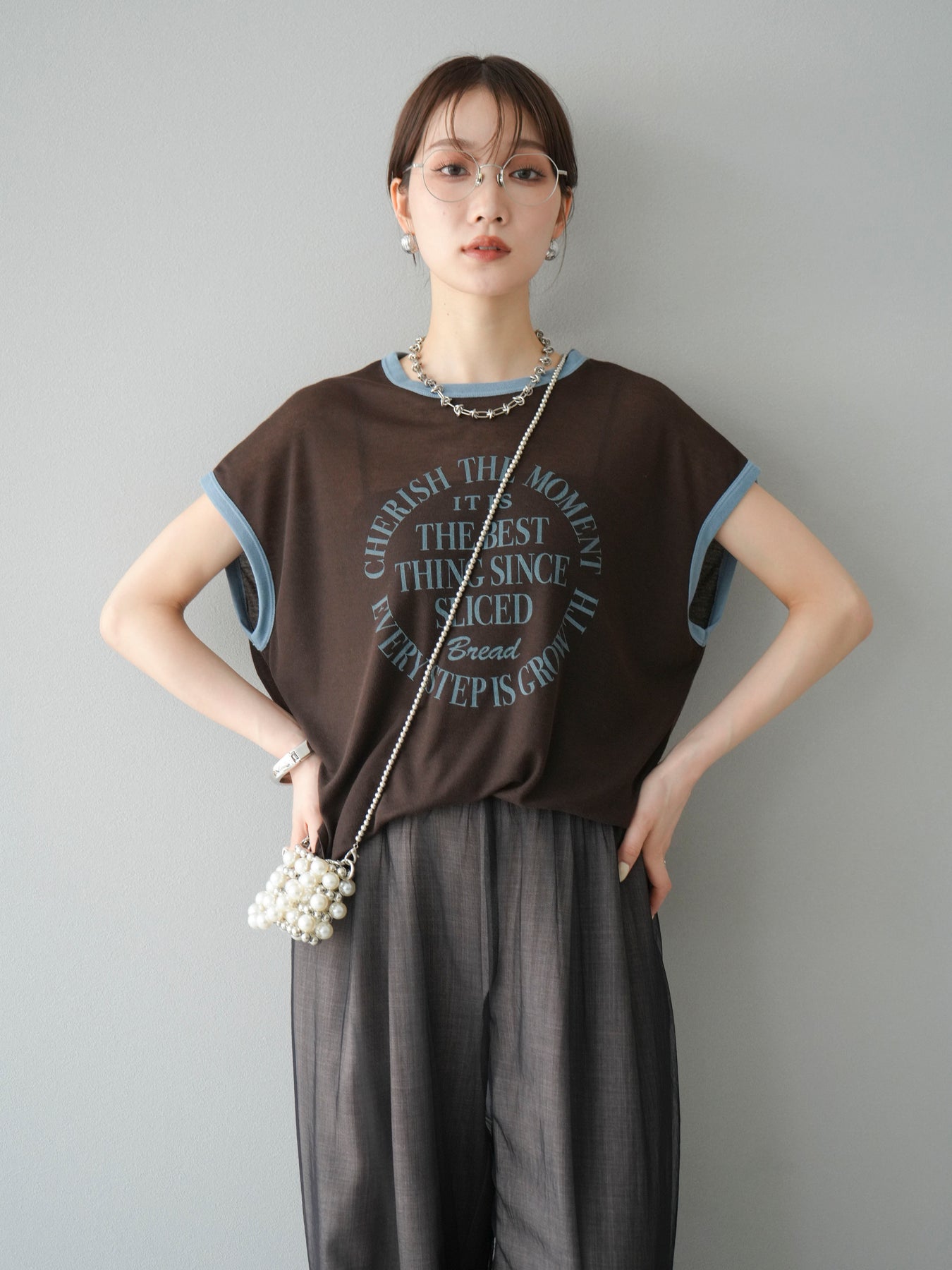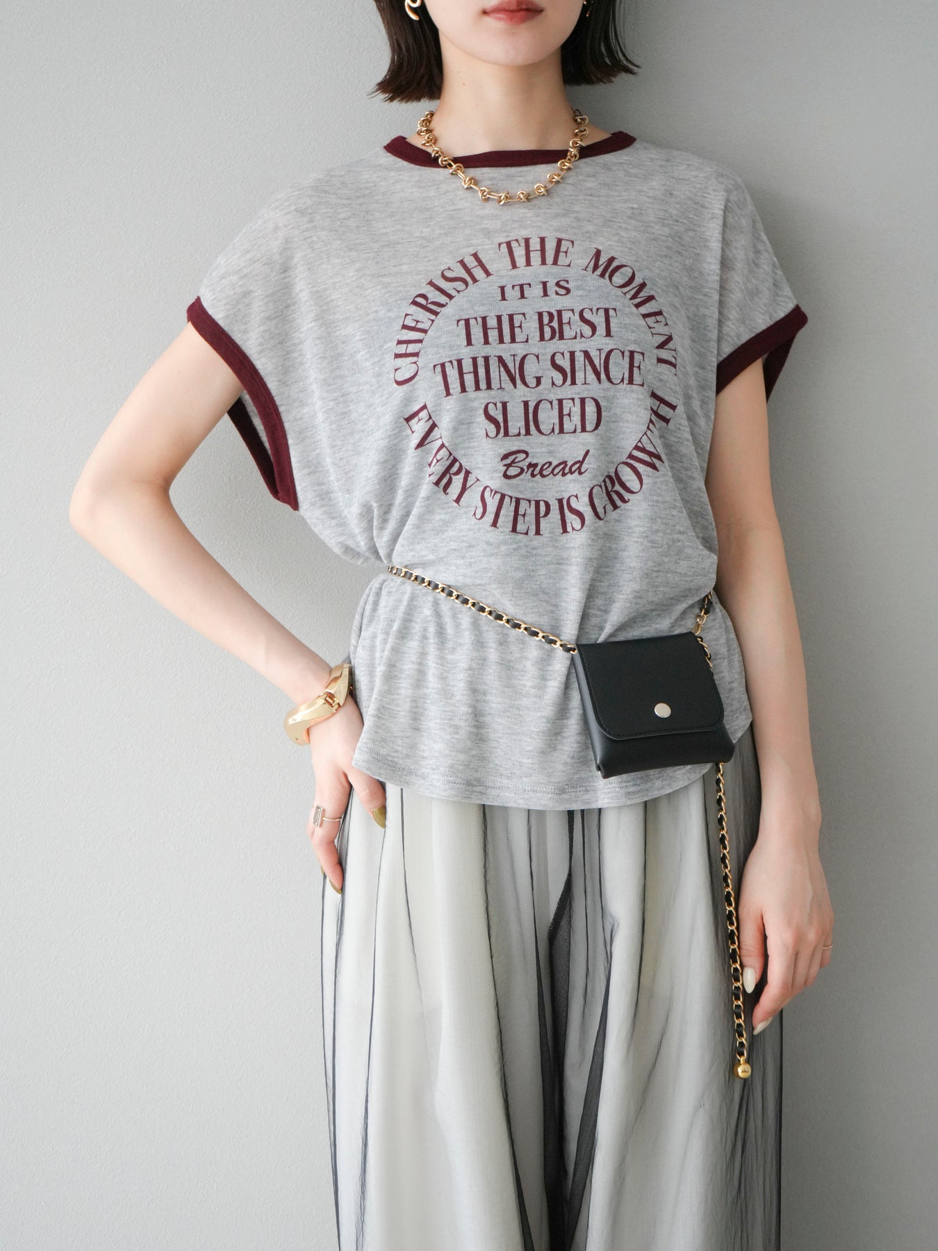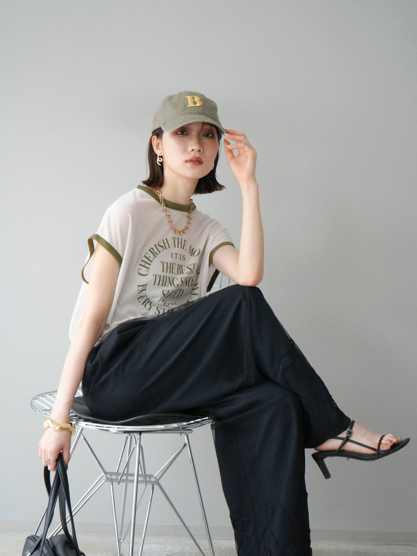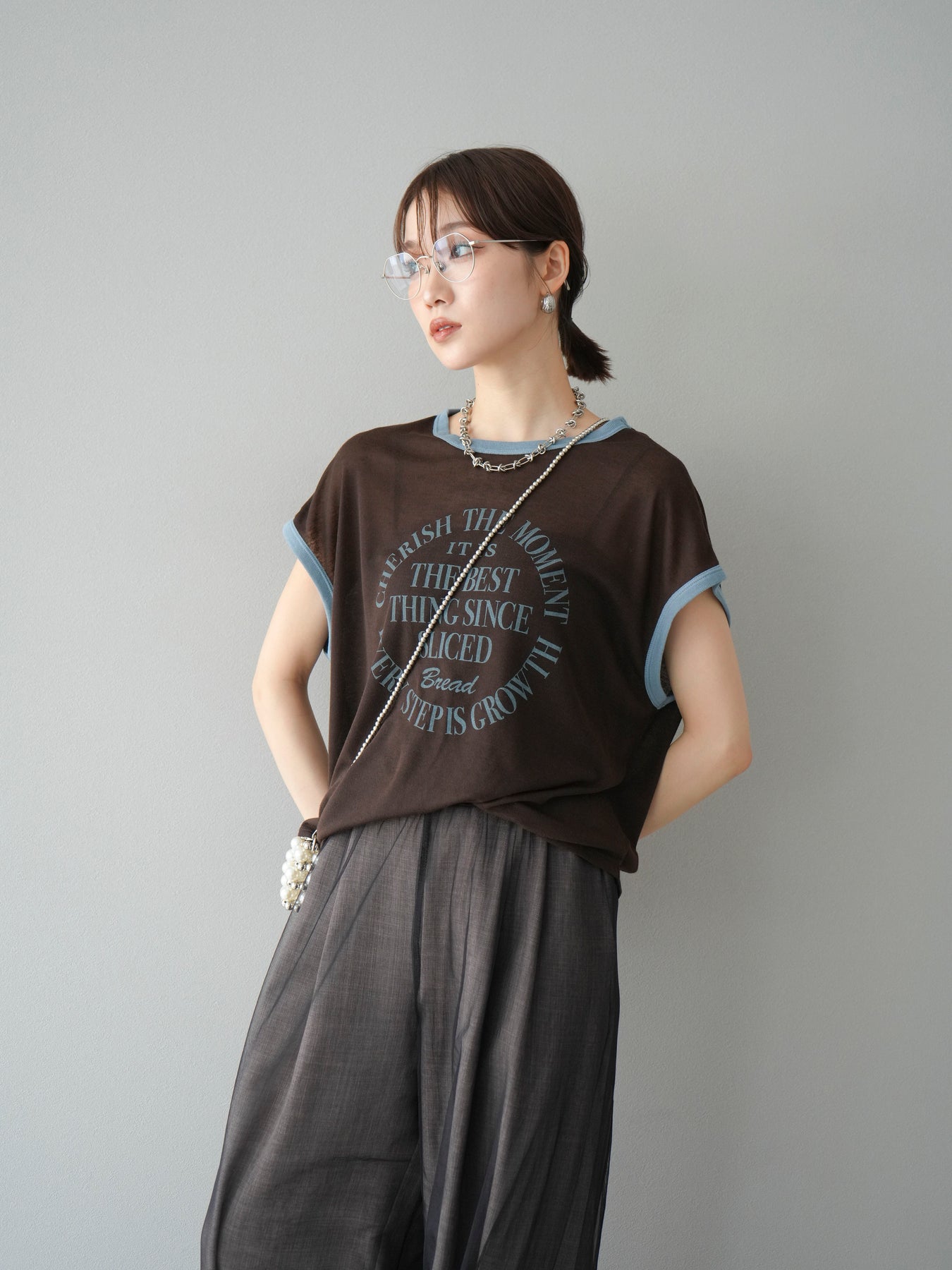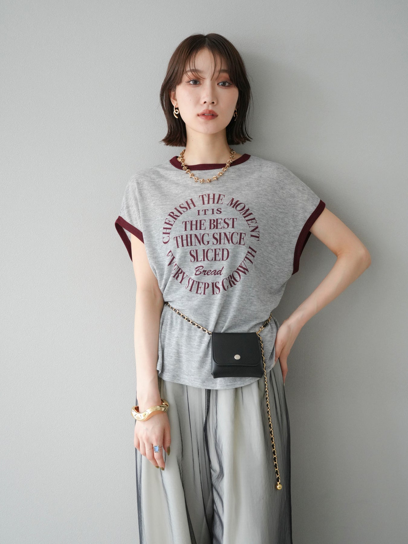 ほどよい透け感と軽やかさが魅力の、シアーフライス素材を使用したロゴプリントTシャツ。 ゆるやかなフレンチスリーブとラウンドした裾のラインが、抜け感のある女性らしいシルエットを演出します。 フロントにはヴィンテージライクなロゴプリントを施し、カジュアルながらも洒落感漂うデザインに。 襟元と袖口に配色リブをあしらい、さりげなくメリハリを効かせたアクセントに仕上げています。 ボリュームスカートやデニムとの相性はもちろん、ジャンスカやサロペットのインナーとしてもおすすめ。 着心地の良さとデザイン性を兼ね備えた、大人のための抜け感Tシャツです。
