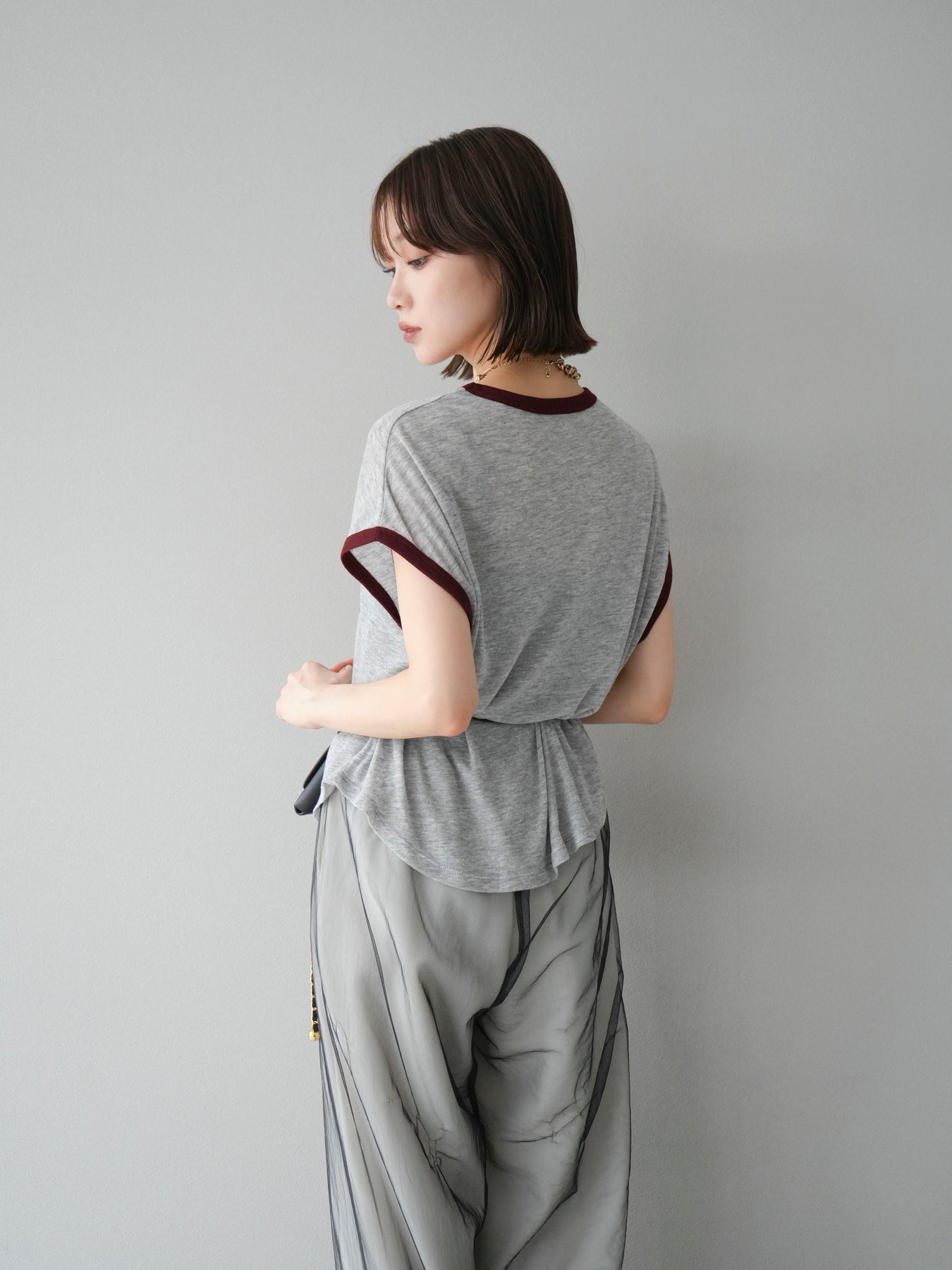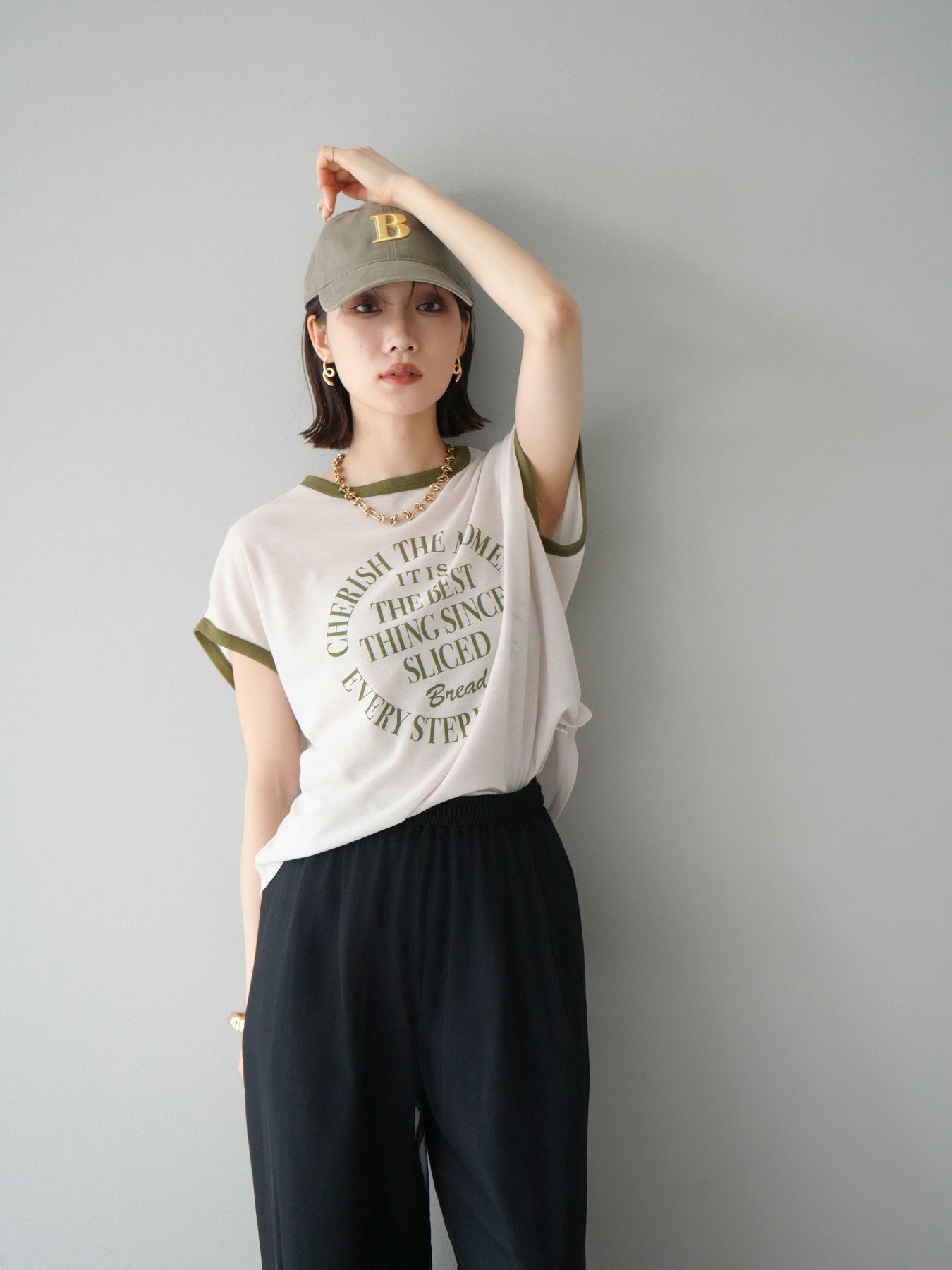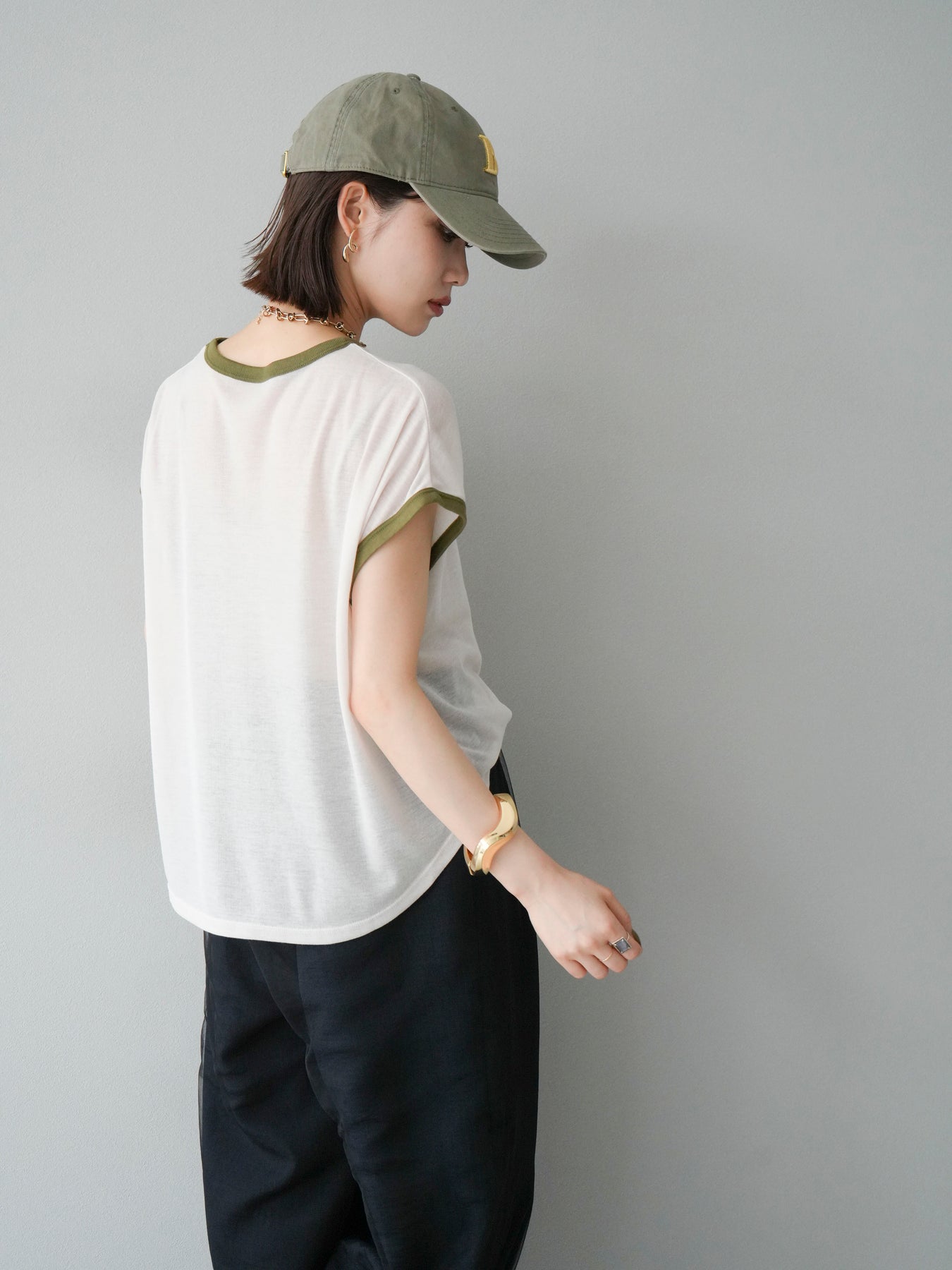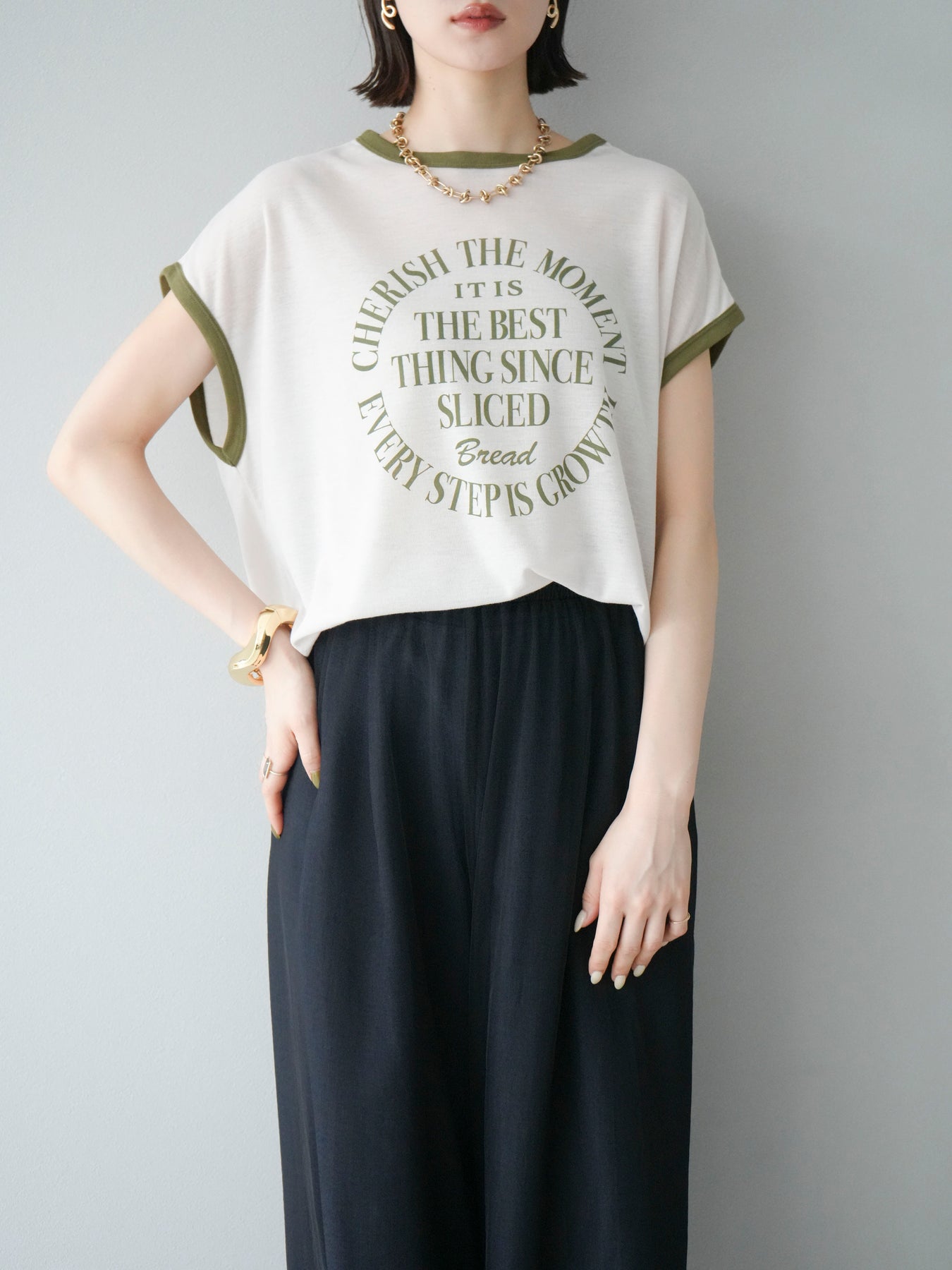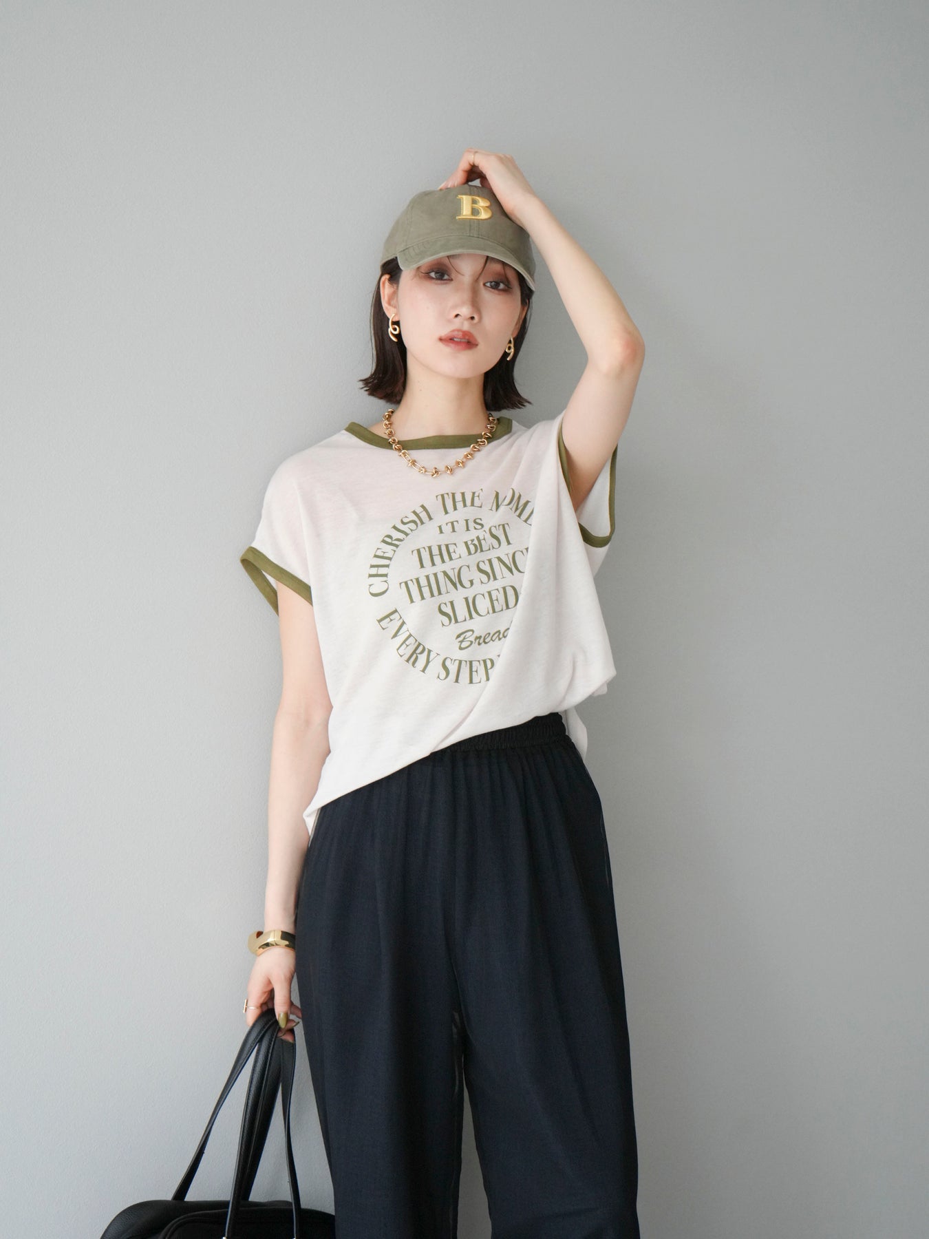 ほどよい透け感と軽やかさが魅力の、シアーフライス素材を使用したロゴプリントTシャツ。 ゆるやかなフレンチスリーブとラウンドした裾のラインが、抜け感のある女性らしいシルエットを演出します。 フロントにはヴィンテージライクなロゴプリントを施し、カジュアルながらも洒落感漂うデザインに。 襟元と袖口に配色リブをあしらい、さりげなくメリハリを効かせたアクセントに仕上げています。 ボリュームスカートやデニムとの相性はもちろん、ジャンスカやサロペットのインナーとしてもおすすめ。 着心地の良さとデザイン性を兼ね備えた、大人のための抜け感Tシャツです。